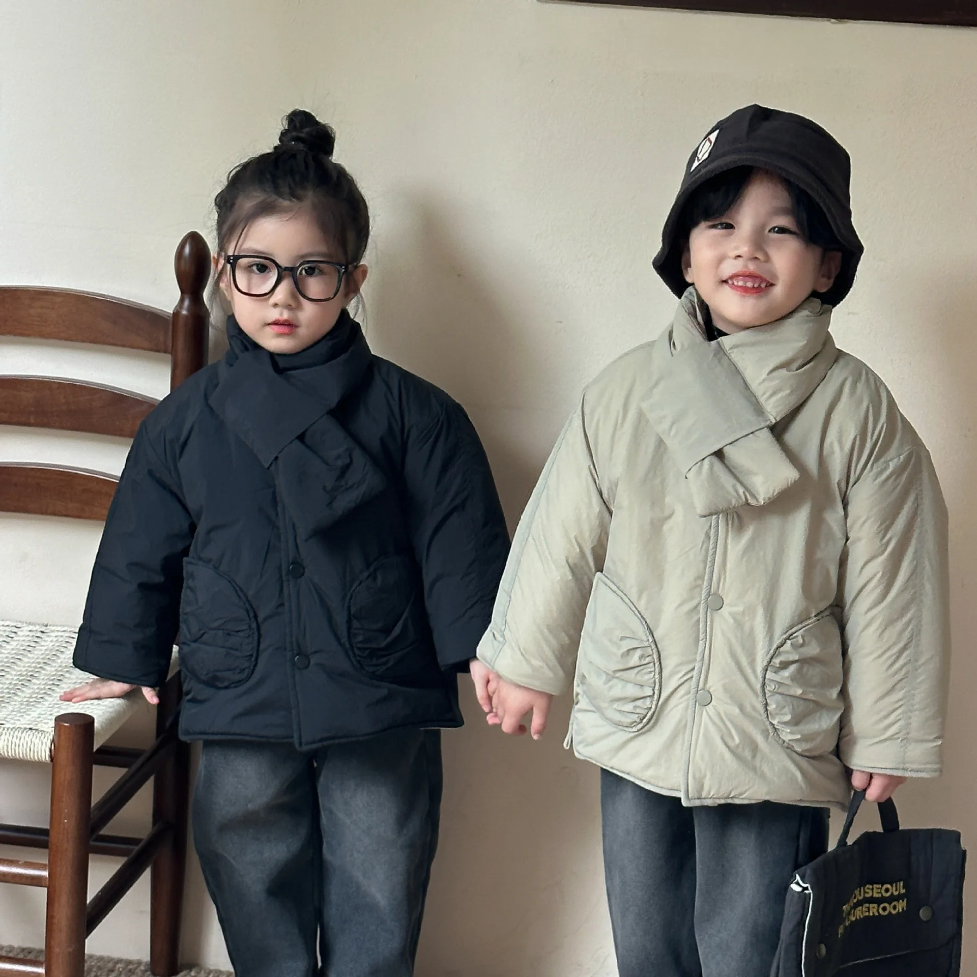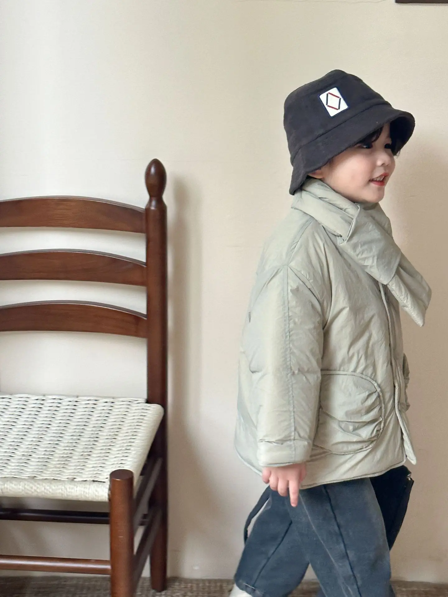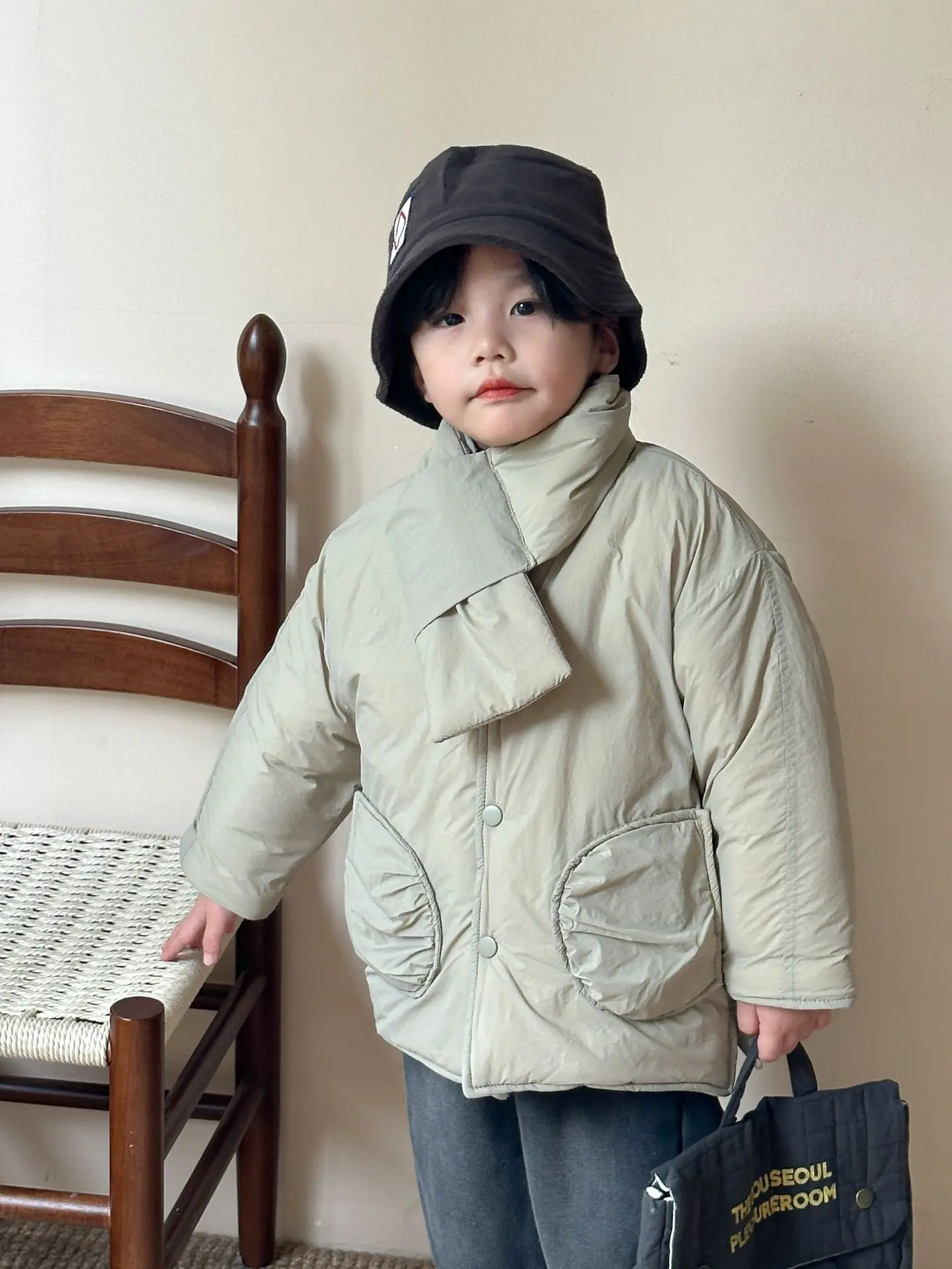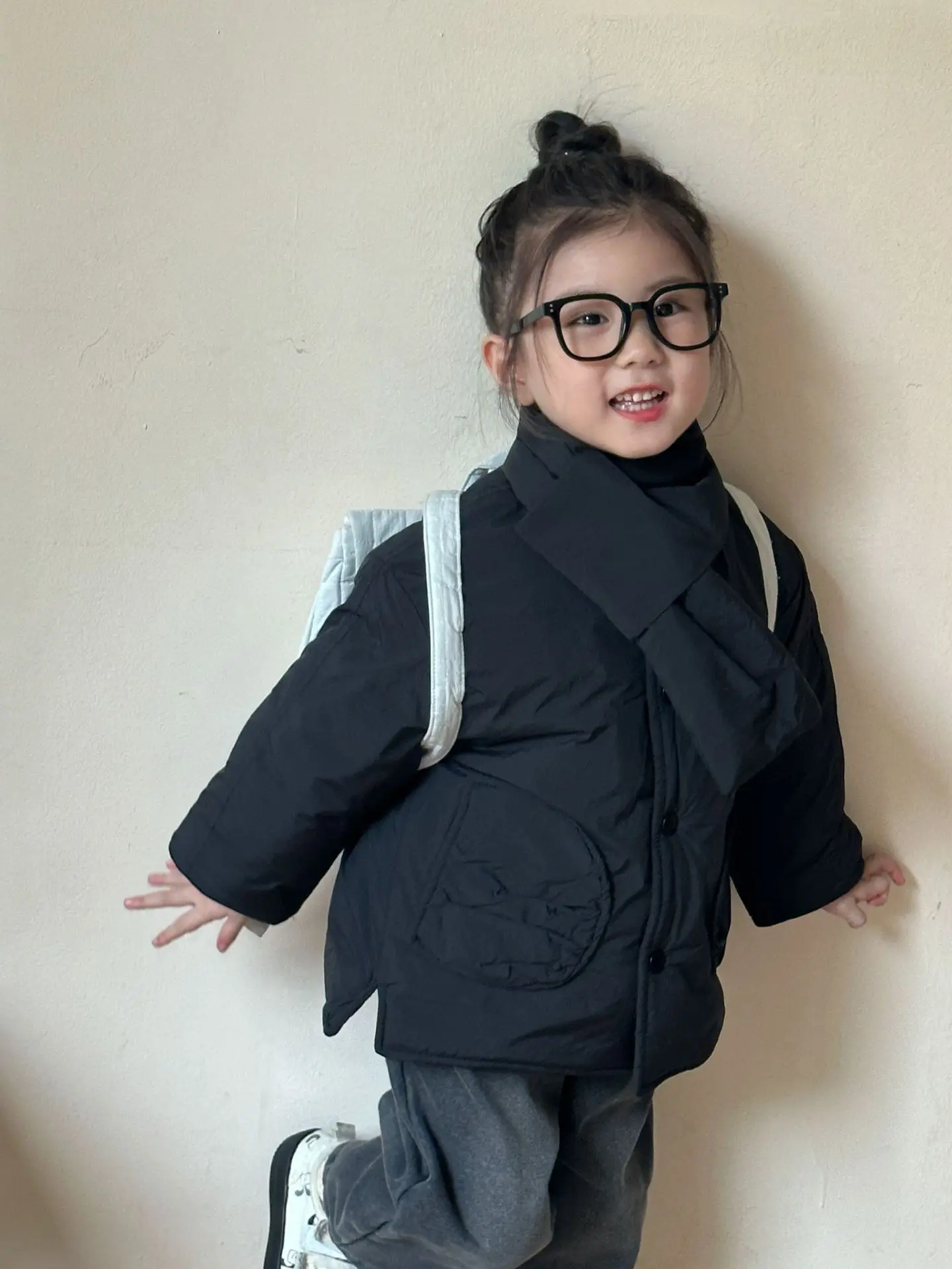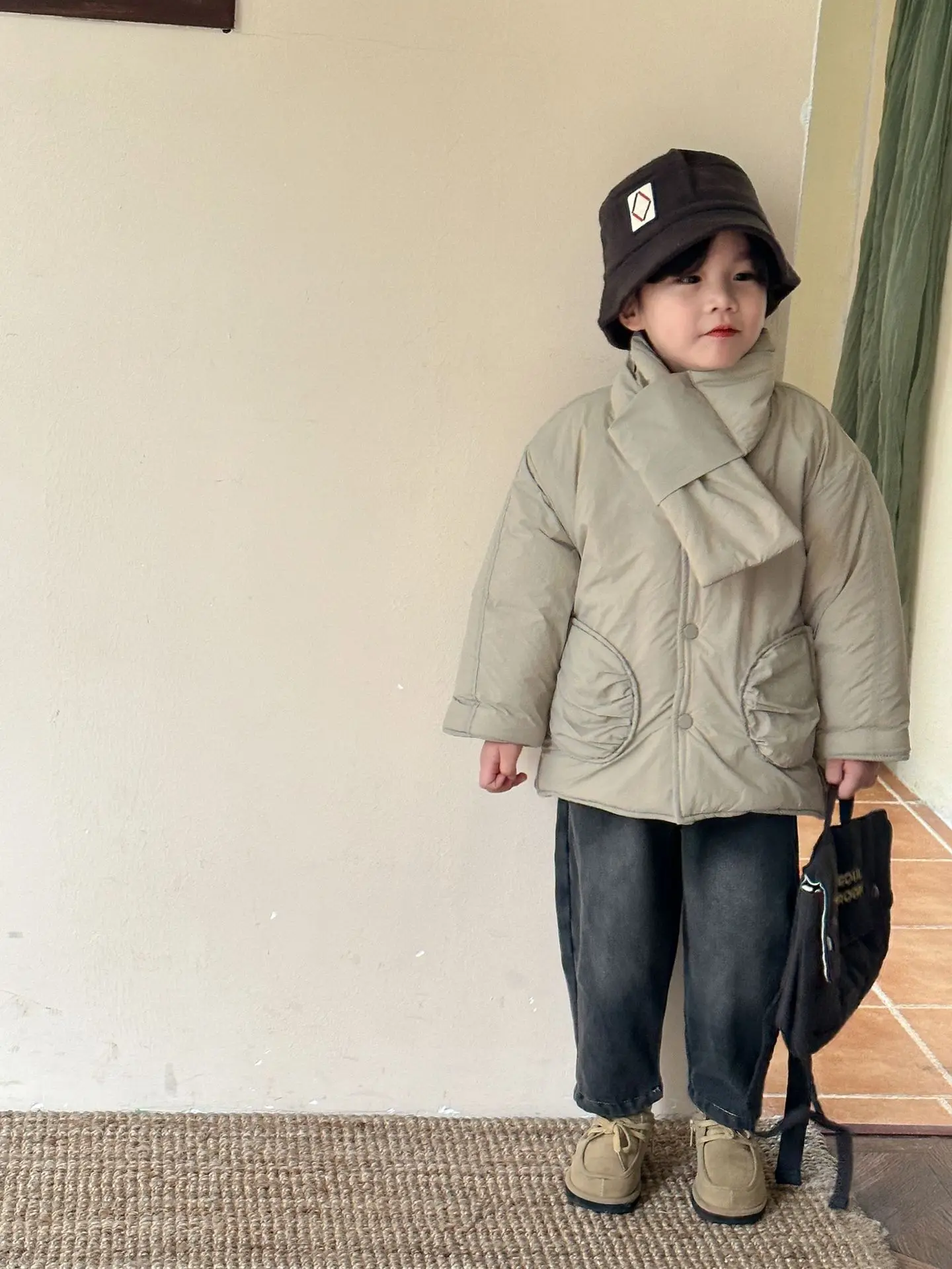 マフラードッキングデザインの裏フリースパデッドジャケットコートは、暖かさと便利さを兼ね備えた冬用キッズアウターです。内側には柔らかなフリース素材を使用し、全身を暖かく保ちます。また、ドッキングされたマフラーが付属しているため、別途マフラーを用意する手間がなく、首元までしっかり防寒できます。シンプルなデザインで男女問わず似合い、普段使いからお出かけまでさまざまなシーンに対応する一着です。