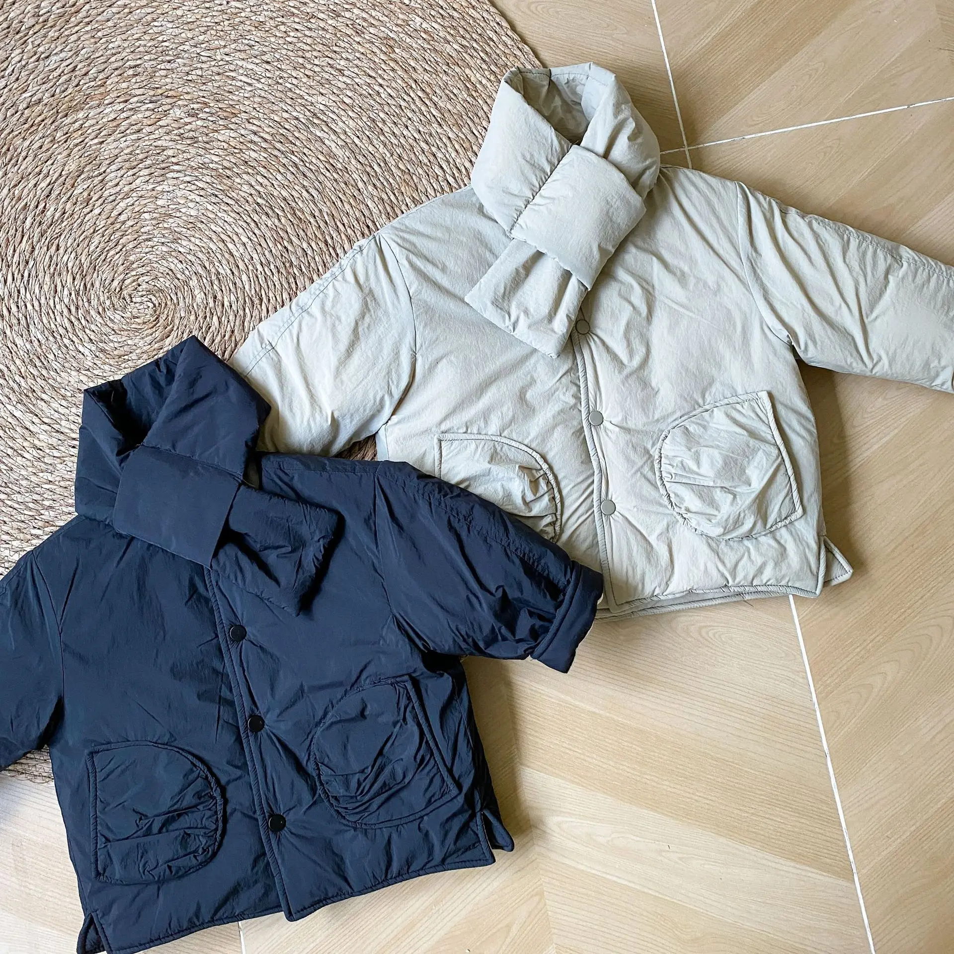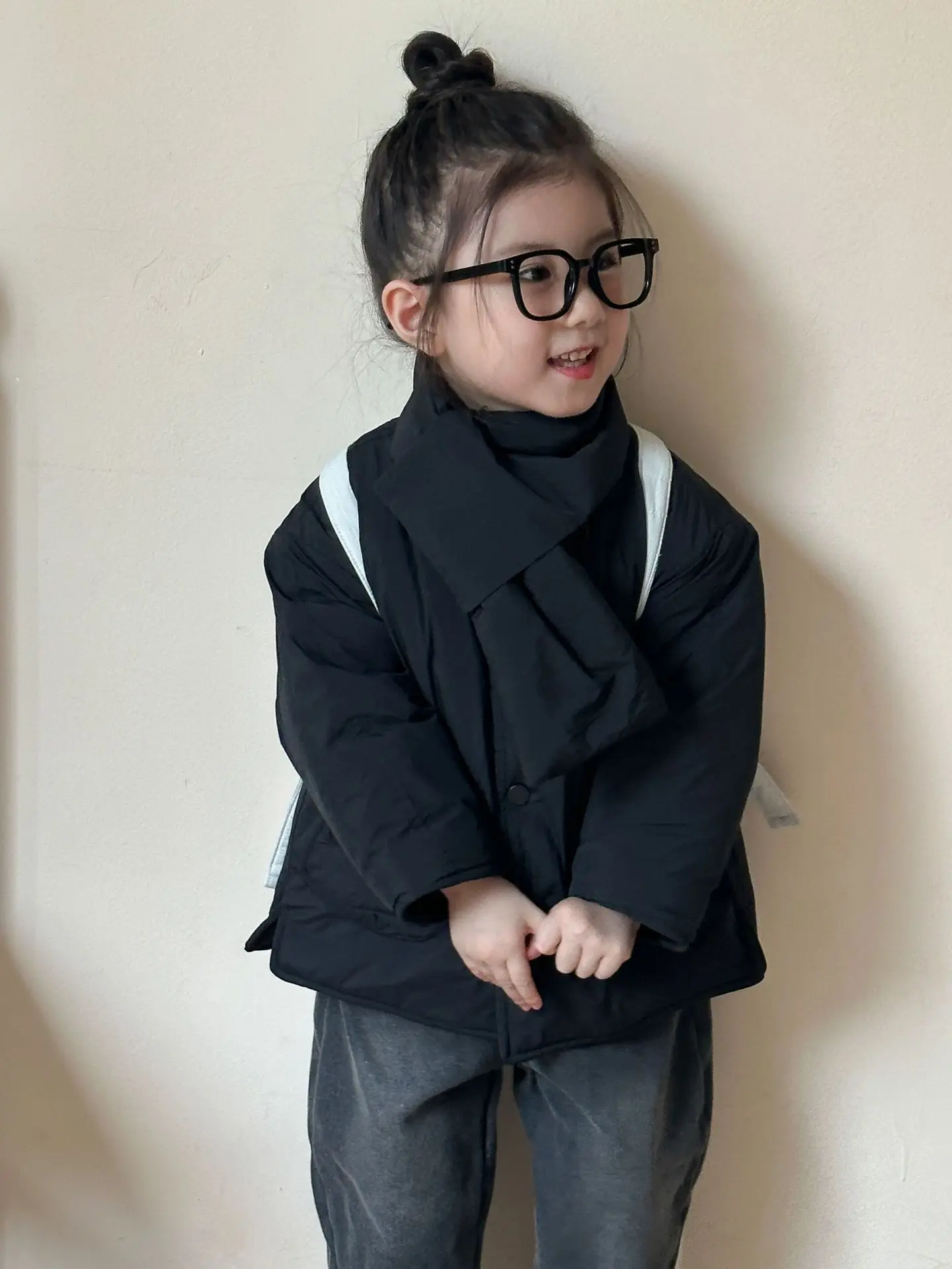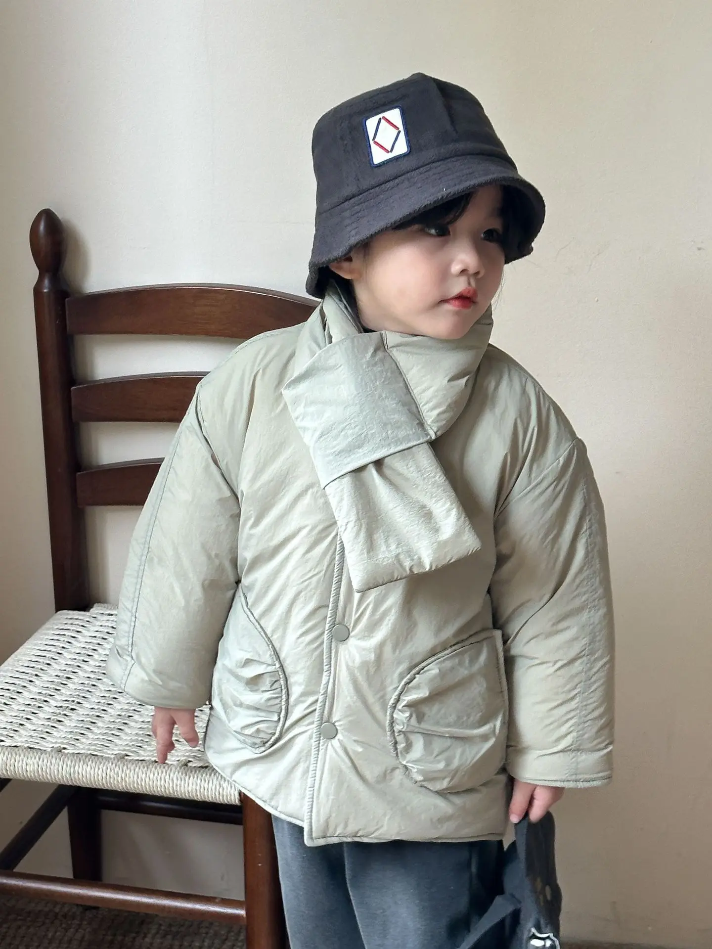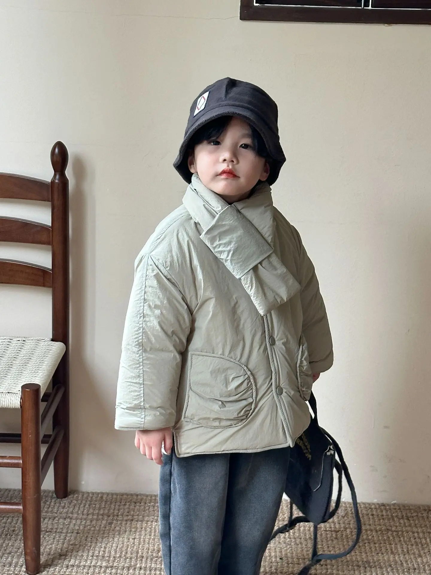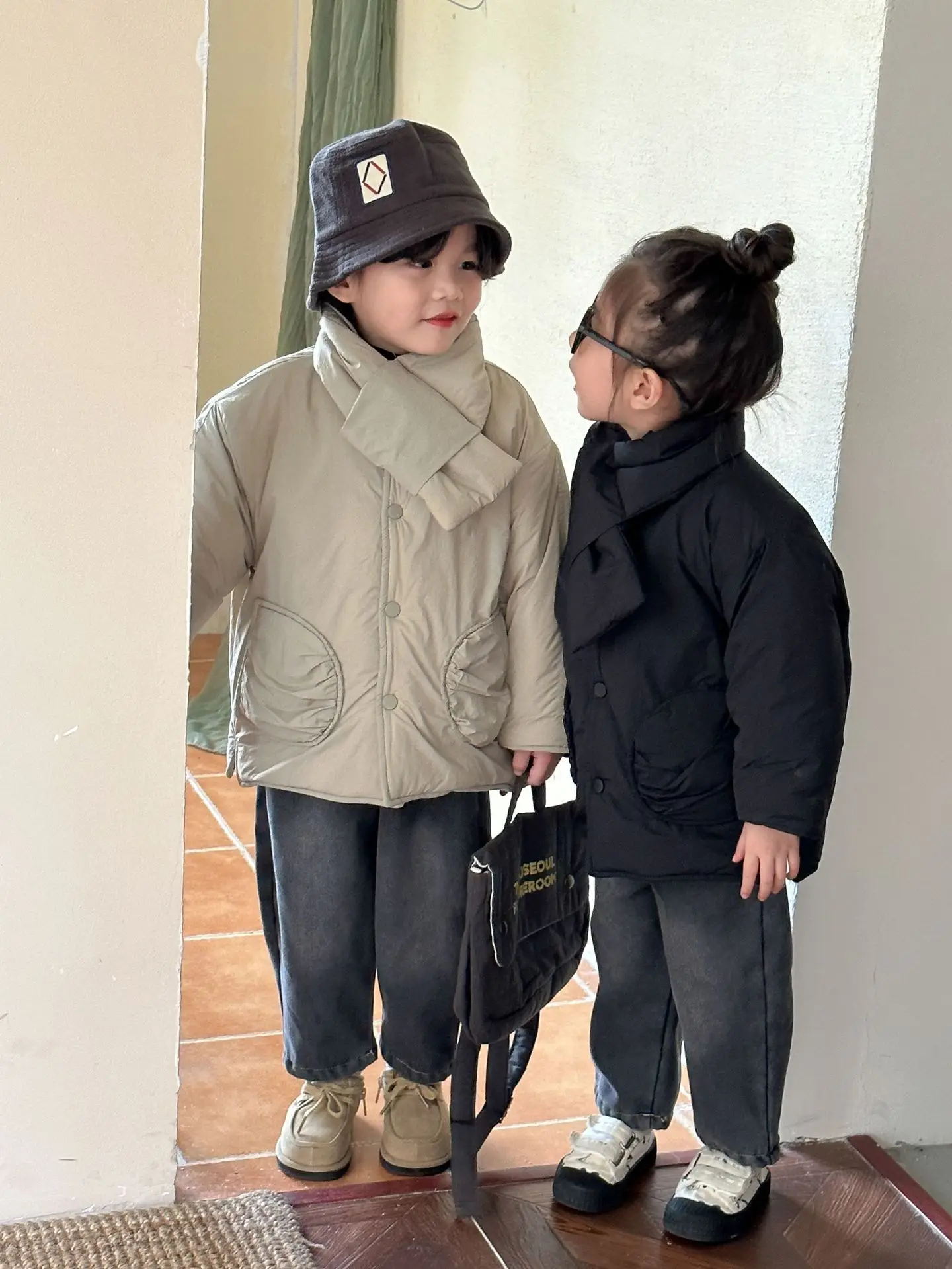 マフラードッキングデザインの裏フリースパデッドジャケットコートは、暖かさと便利さを兼ね備えた冬用キッズアウターです。内側には柔らかなフリース素材を使用し、全身を暖かく保ちます。また、ドッキングされたマフラーが付属しているため、別途マフラーを用意する手間がなく、首元までしっかり防寒できます。シンプルなデザインで男女問わず似合い、普段使いからお出かけまでさまざまなシーンに対応する一着です。