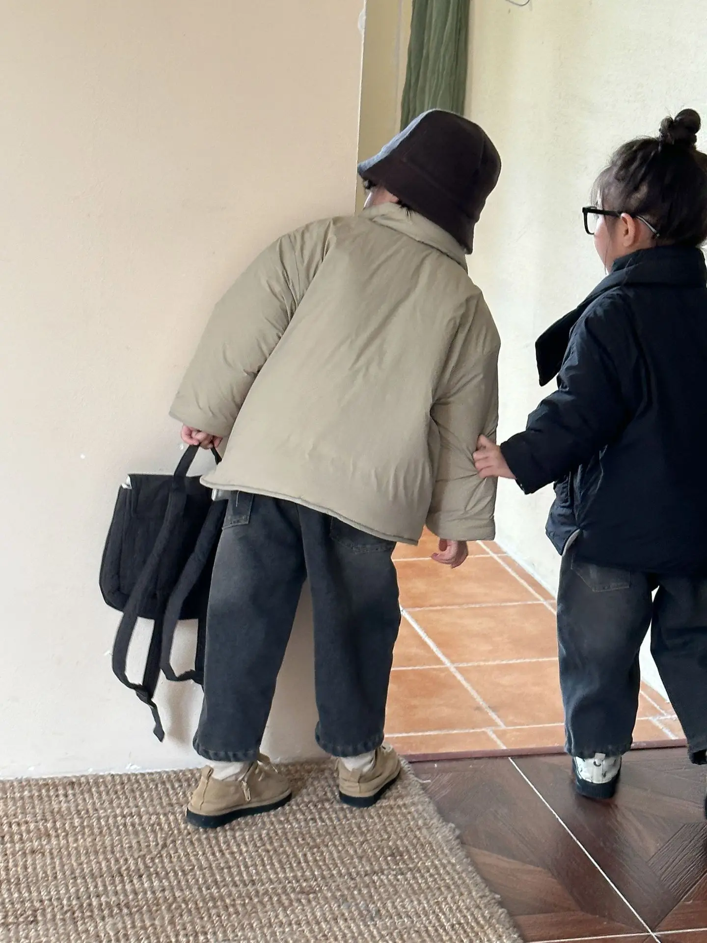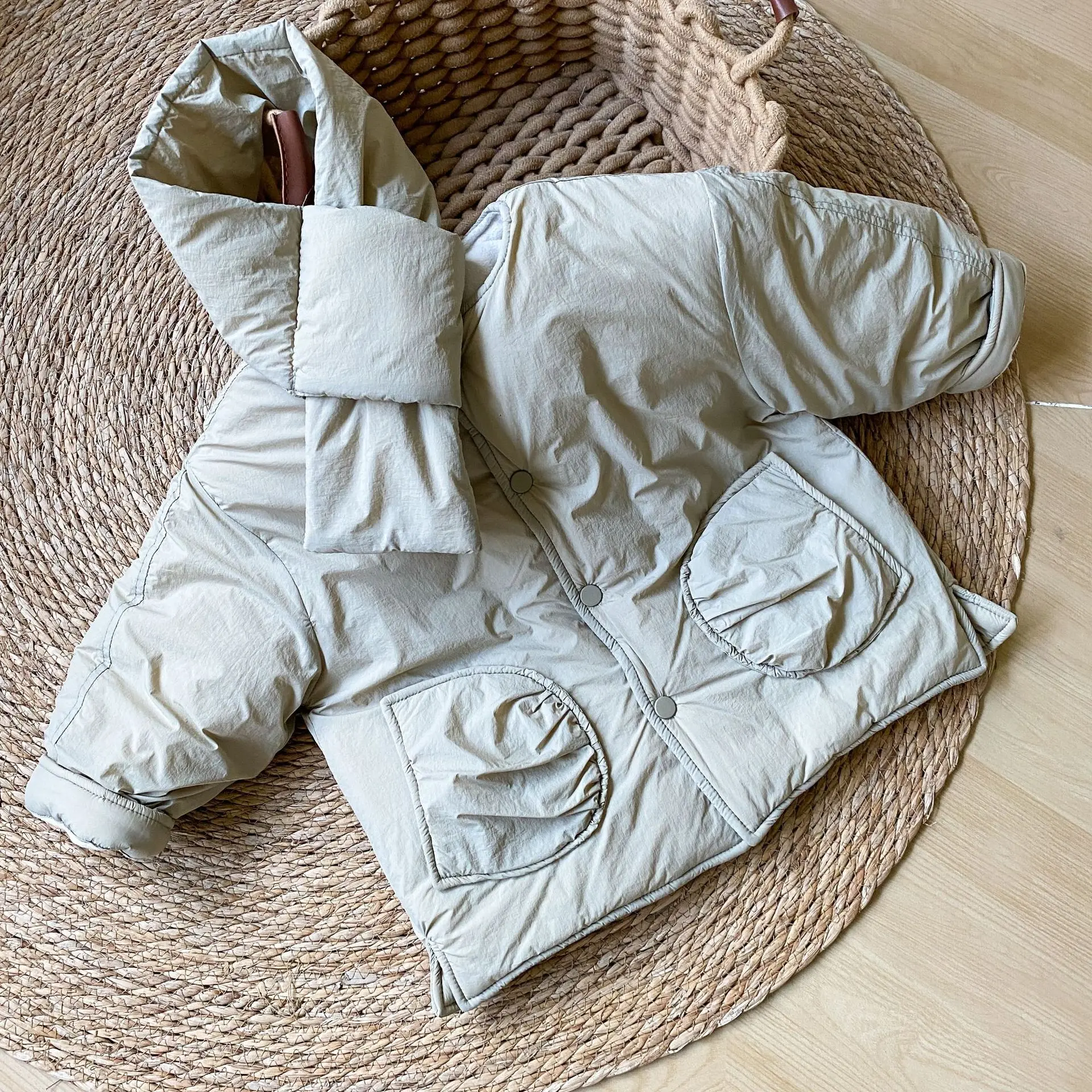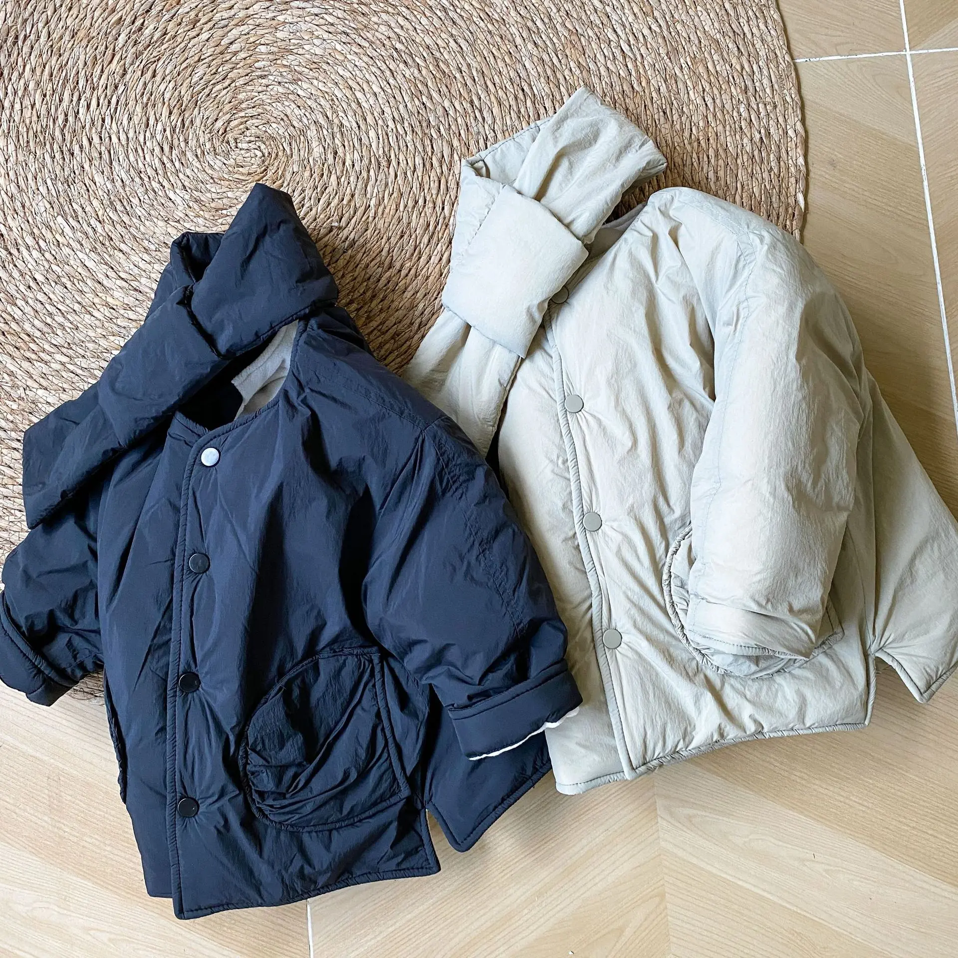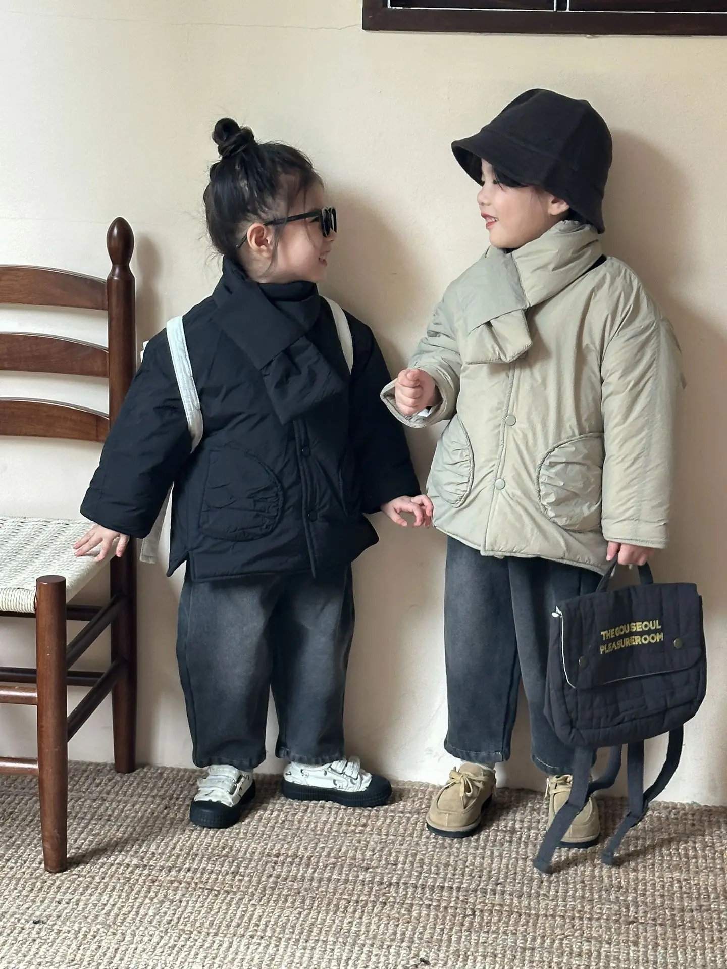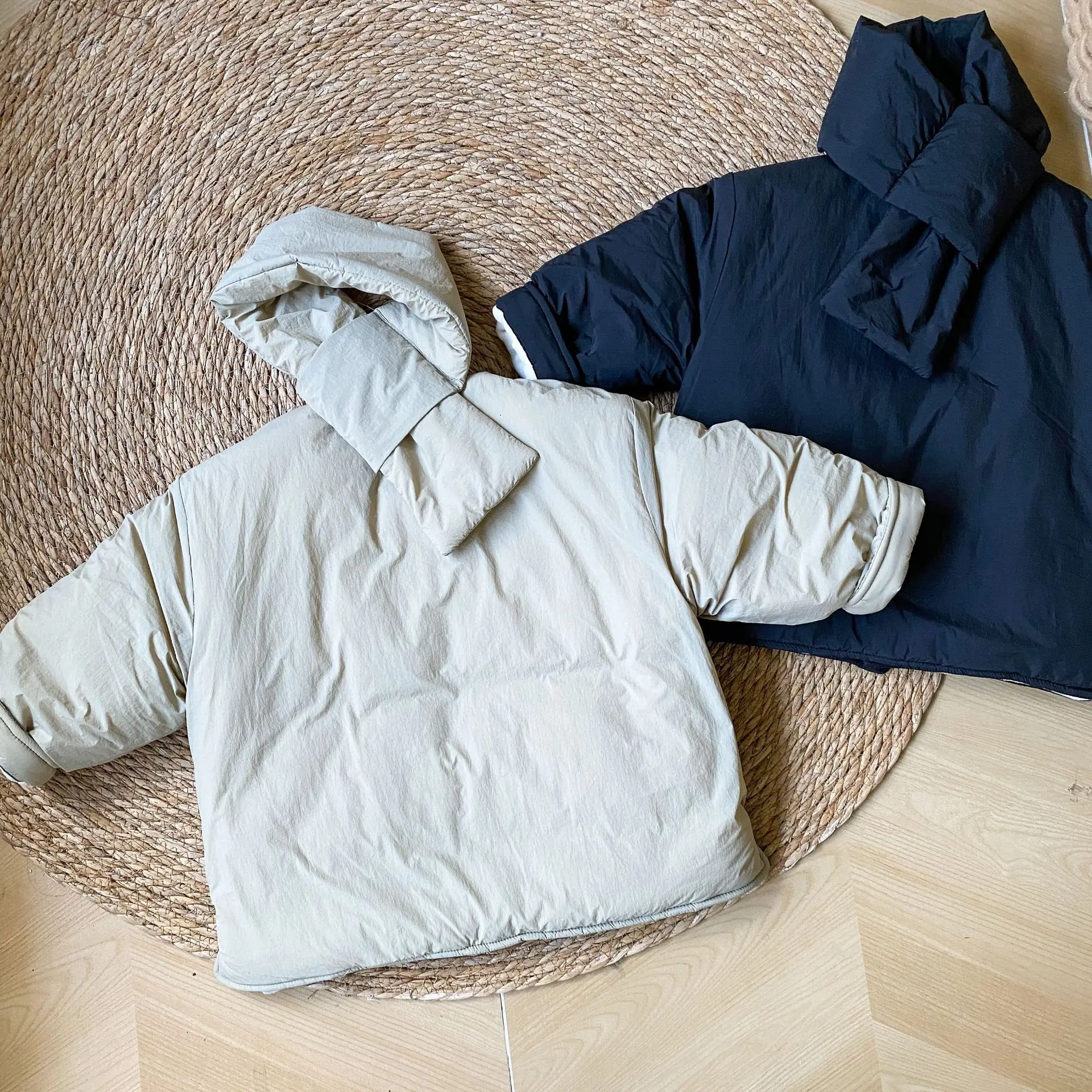 マフラードッキングデザインの裏フリースパデッドジャケットコートは、暖かさと便利さを兼ね備えた冬用キッズアウターです。内側には柔らかなフリース素材を使用し、全身を暖かく保ちます。また、ドッキングされたマフラーが付属しているため、別途マフラーを用意する手間がなく、首元までしっかり防寒できます。シンプルなデザインで男女問わず似合い、普段使いからお出かけまでさまざまなシーンに対応する一着です。