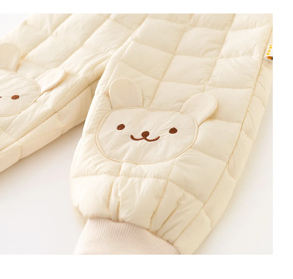 キルティング生地にくまの膝パッチが可愛らしいハイウエスト防寒ロングパンツは、冬の寒さから赤ちゃんを守るベビー用パンツです。厚手のフリース裏地が全体を暖かく包み込み、快適な着心地を提供します。ハイウエストデザインが腹部も暖かく保ち、ずれにくく安心。くまの膝パッチがさりげないアクセントになり、可愛らしさをプラスします。男の子にも女の子にも似合うユニセックスなデザインで、普段使いにぴったりのアイテムです。
