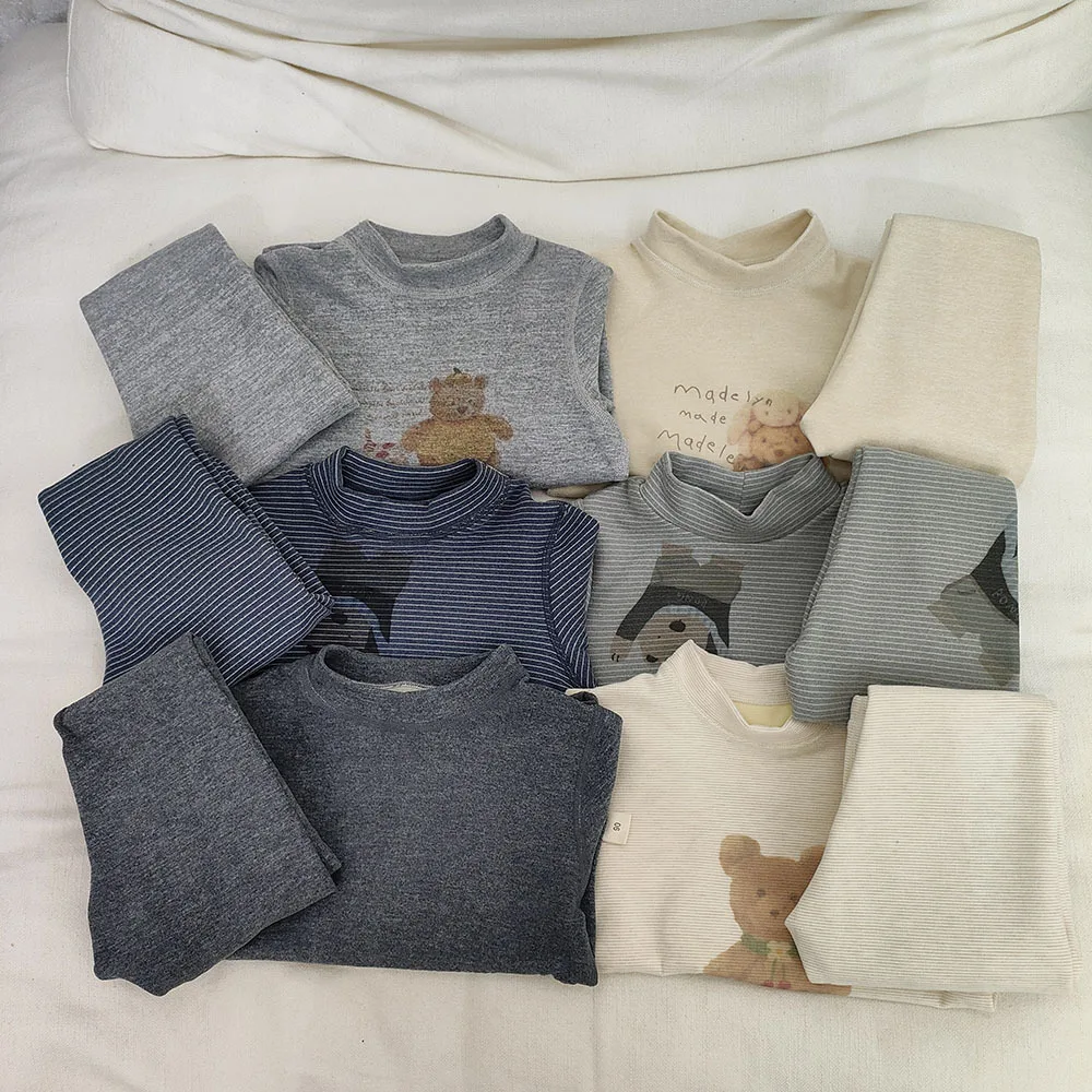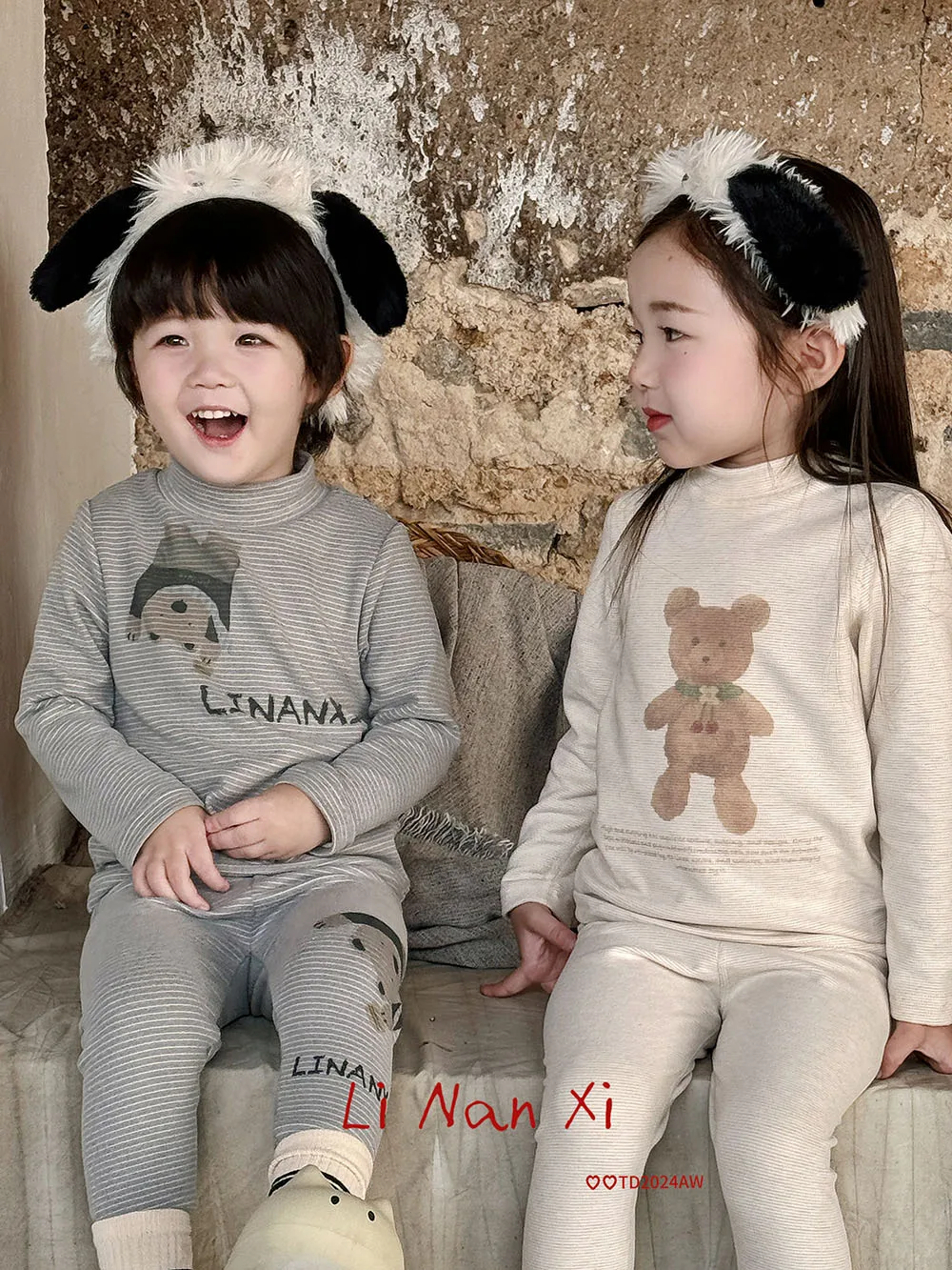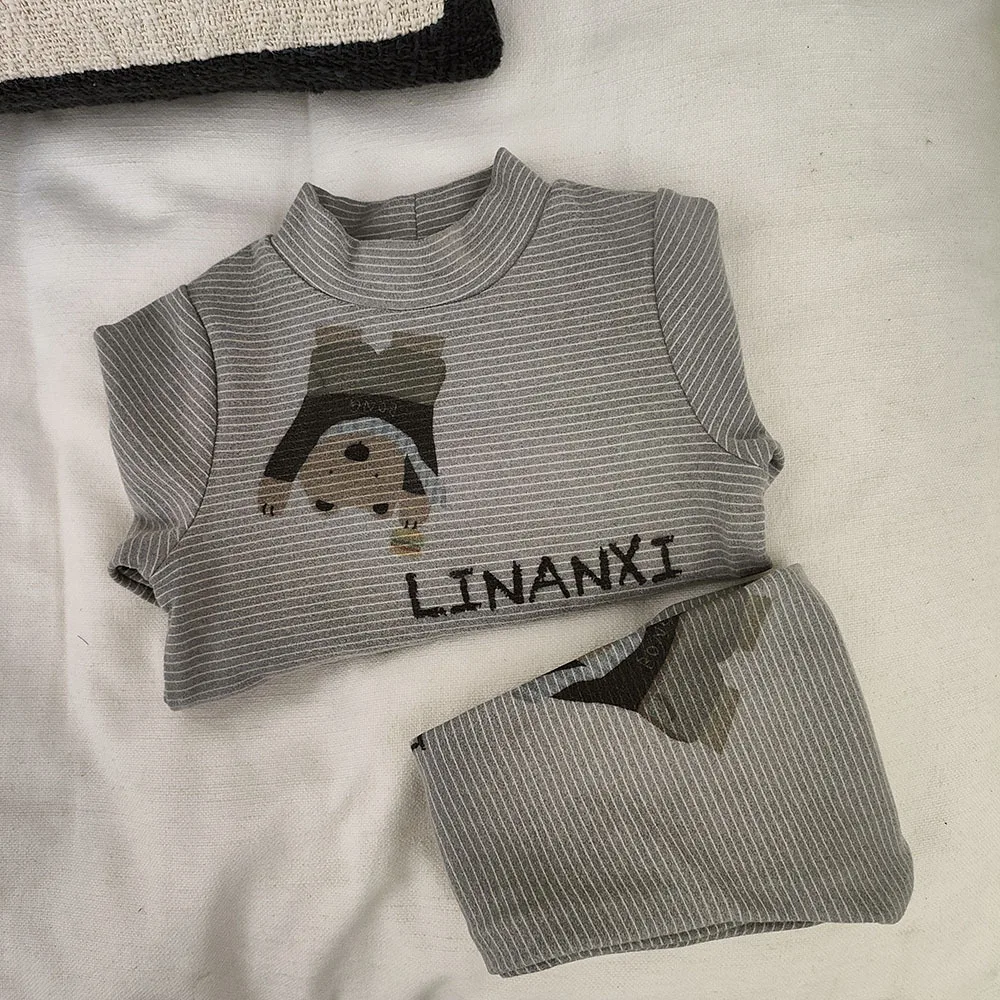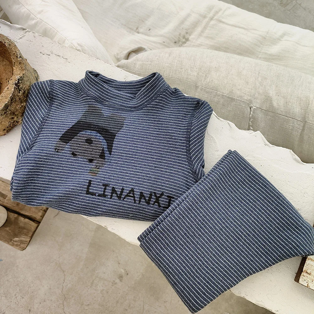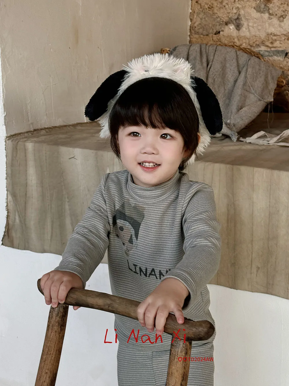 キッズセットアップ 2点セット アニマルプリントボーダー/無地長袖パジャマセット ハイネック長袖Tシャツ+ロングパンツ【mh0007851】