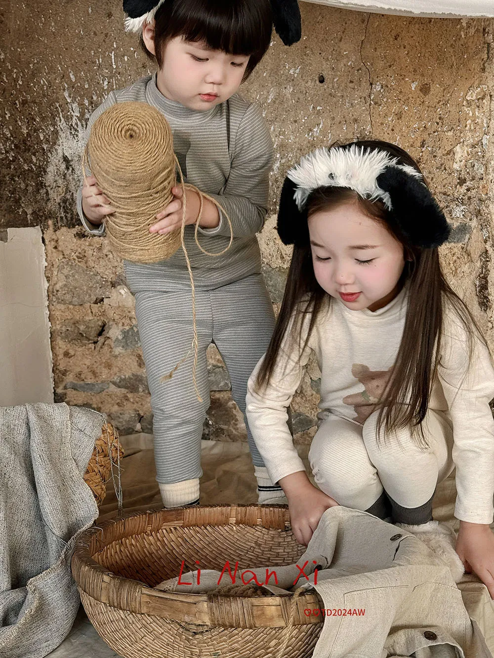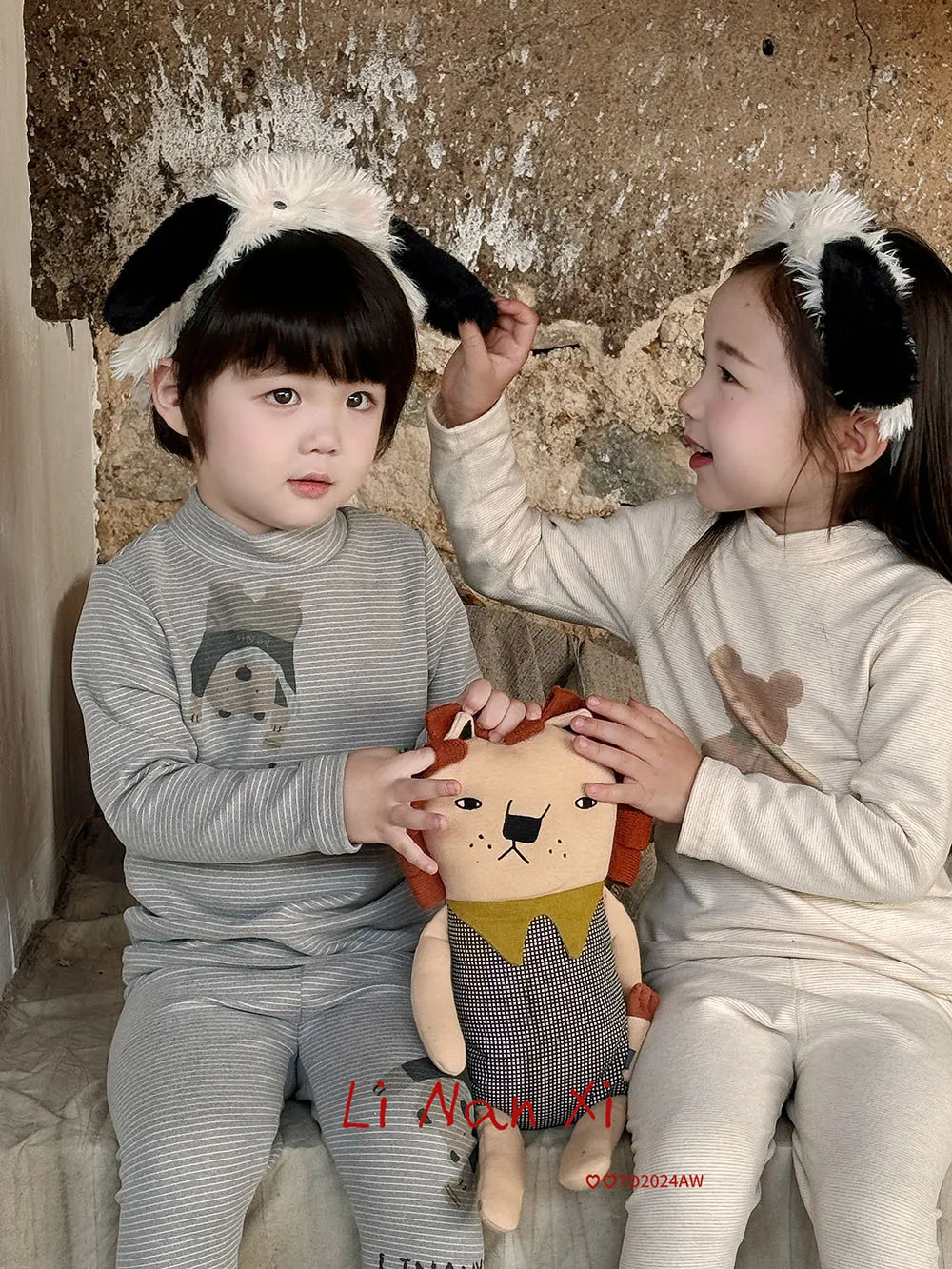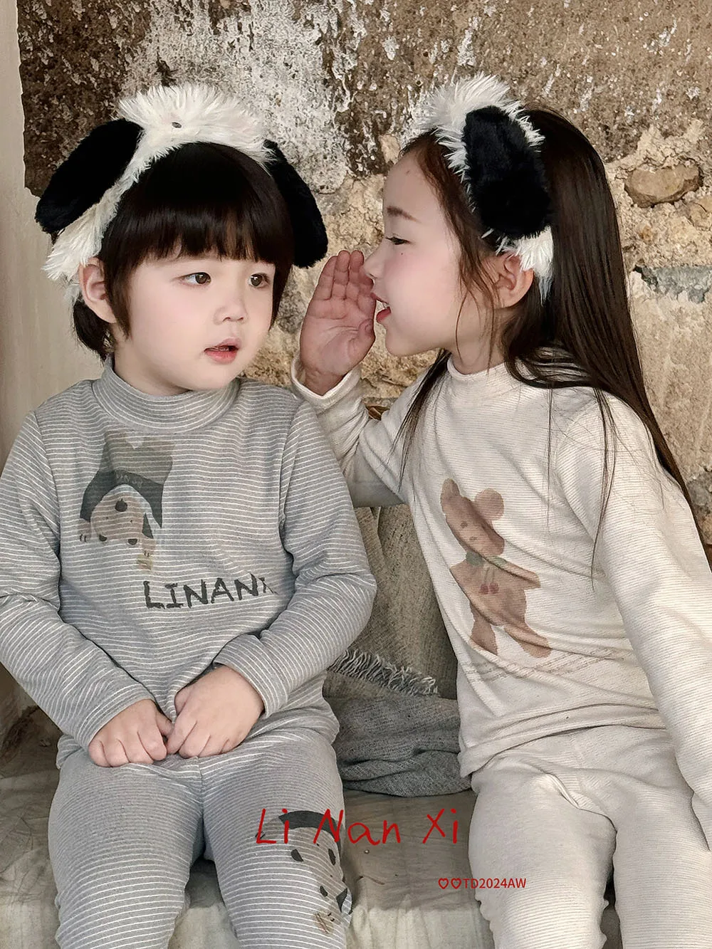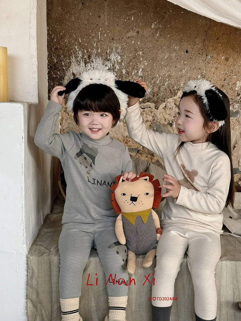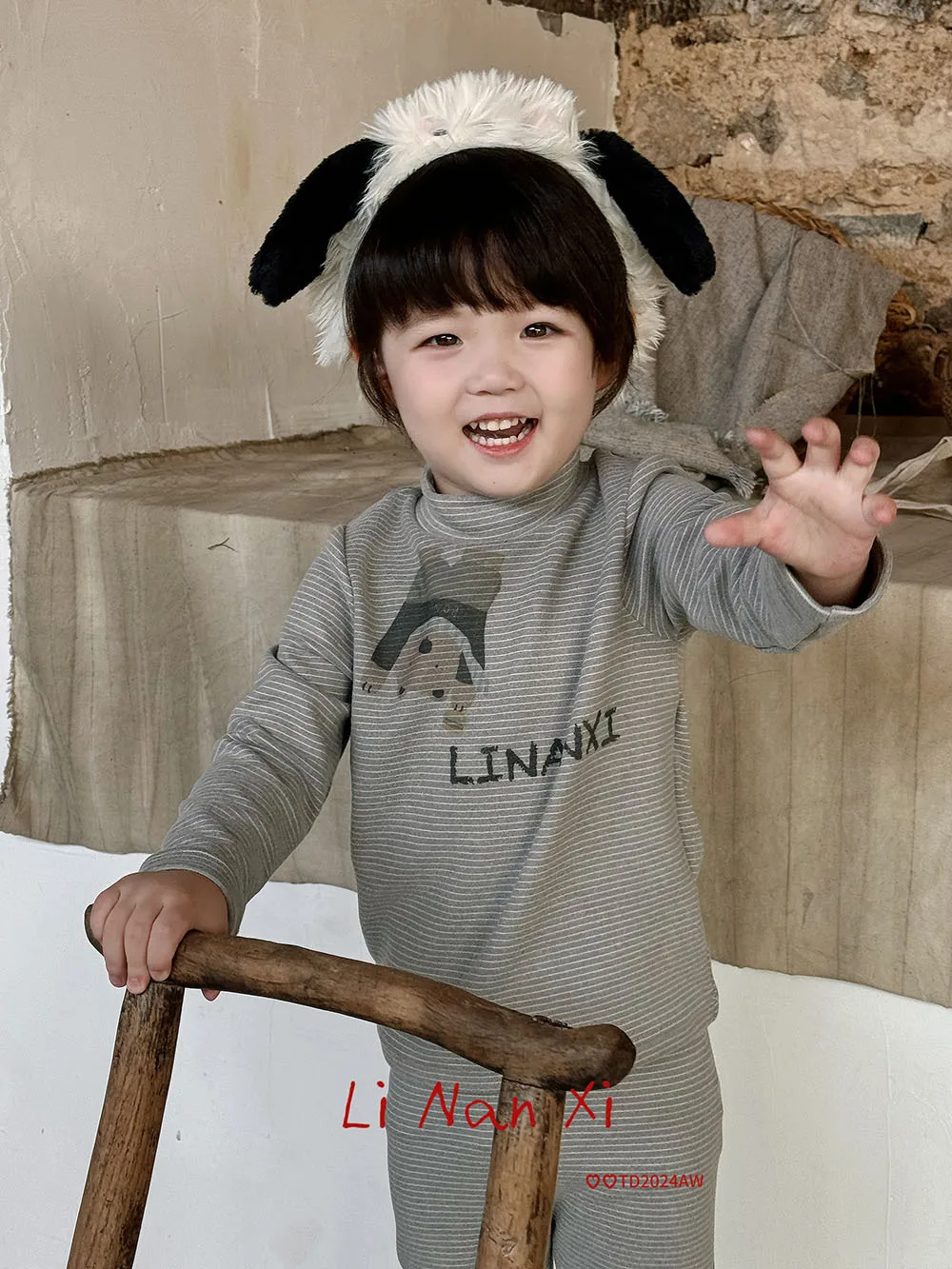 キッズセットアップ 2点セット アニマルプリントボーダー/無地長袖パジャマセット ハイネック長袖Tシャツ+ロングパンツ【mh0007851】