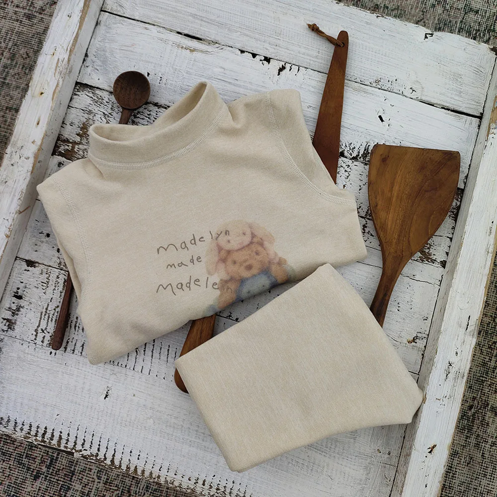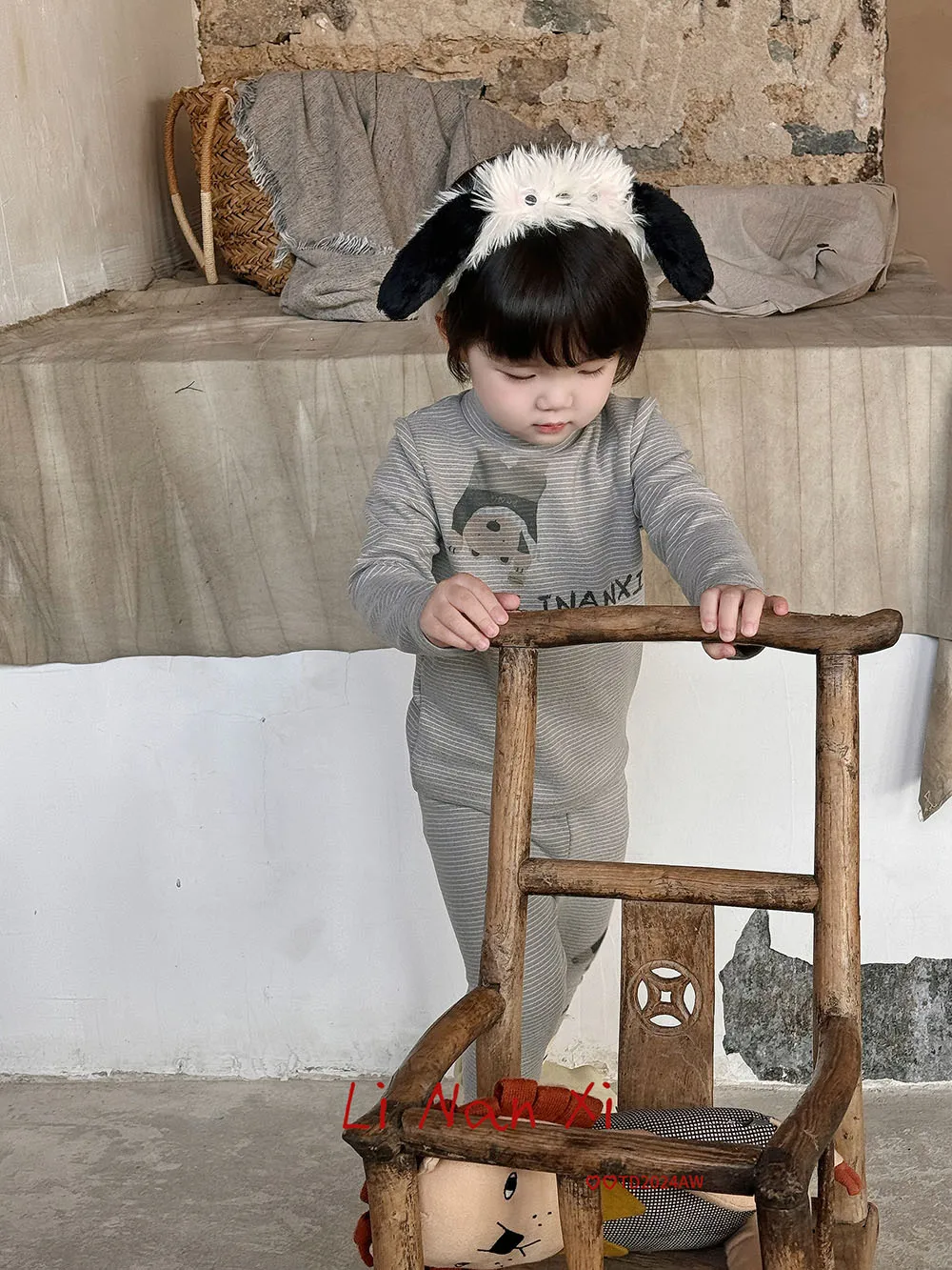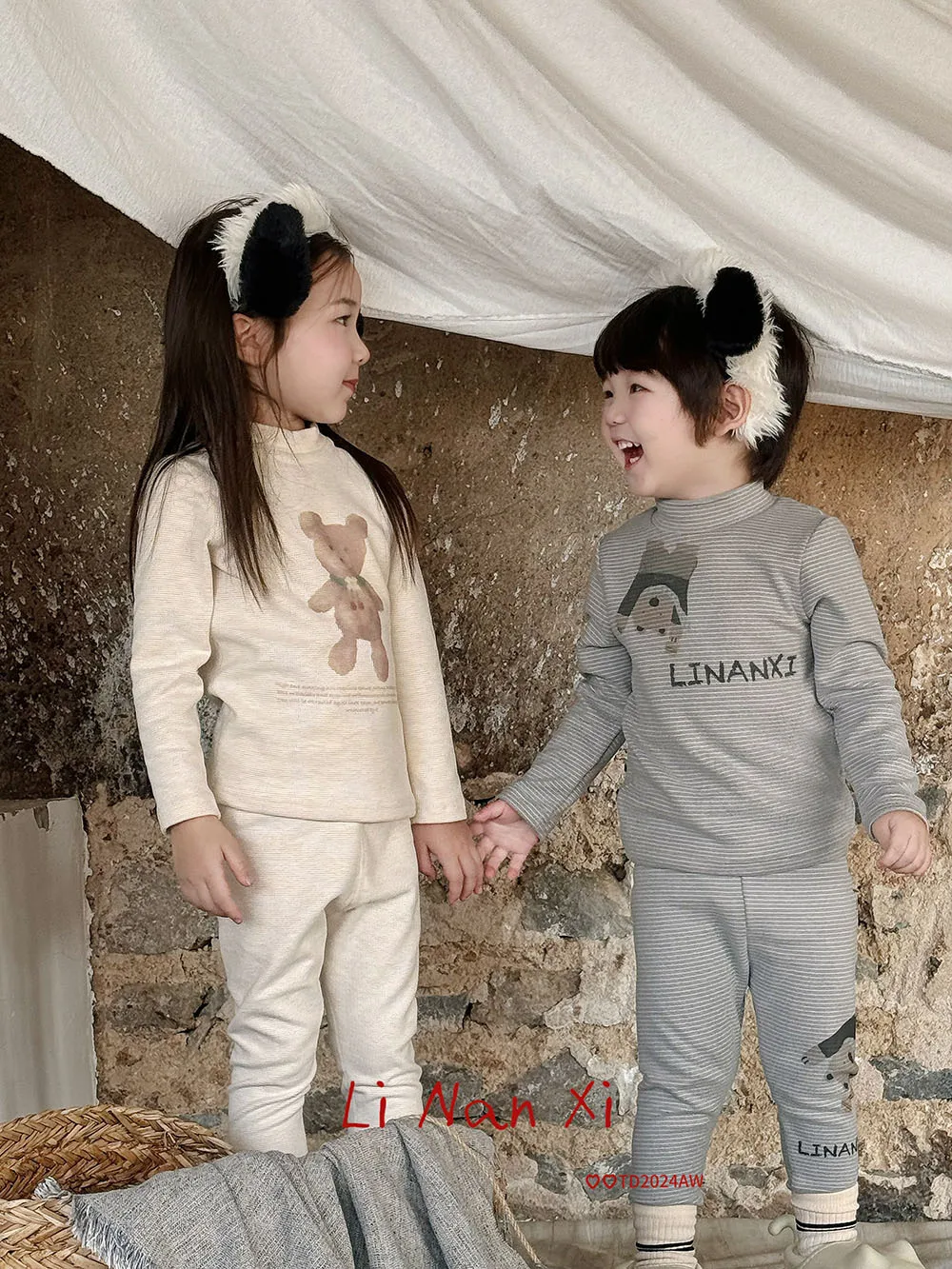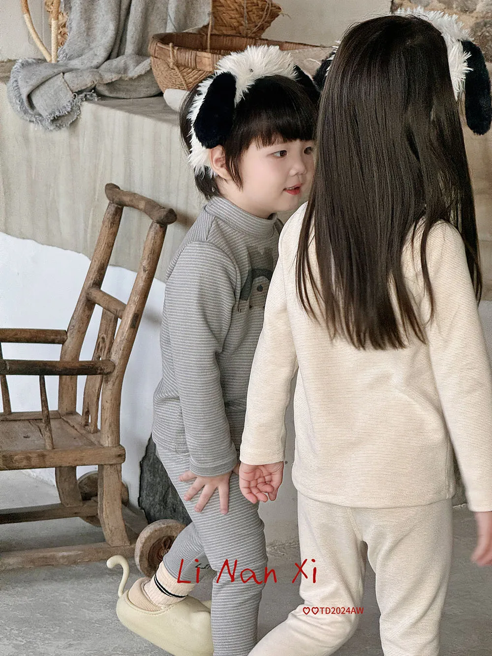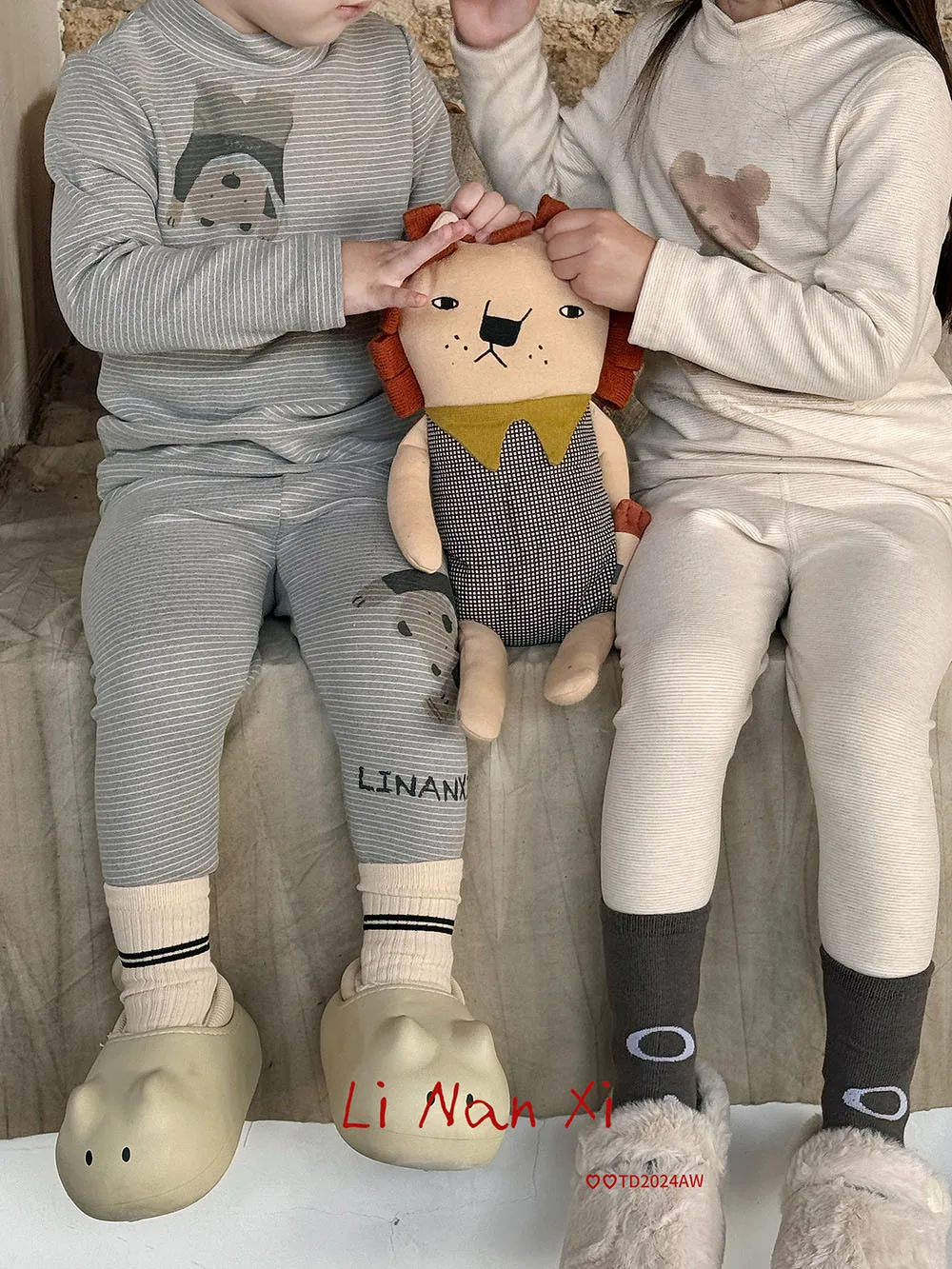 キッズセットアップ 2点セット アニマルプリントボーダー/無地長袖パジャマセット ハイネック長袖Tシャツ+ロングパンツ【mh0007851】