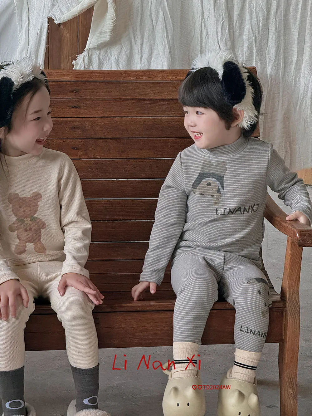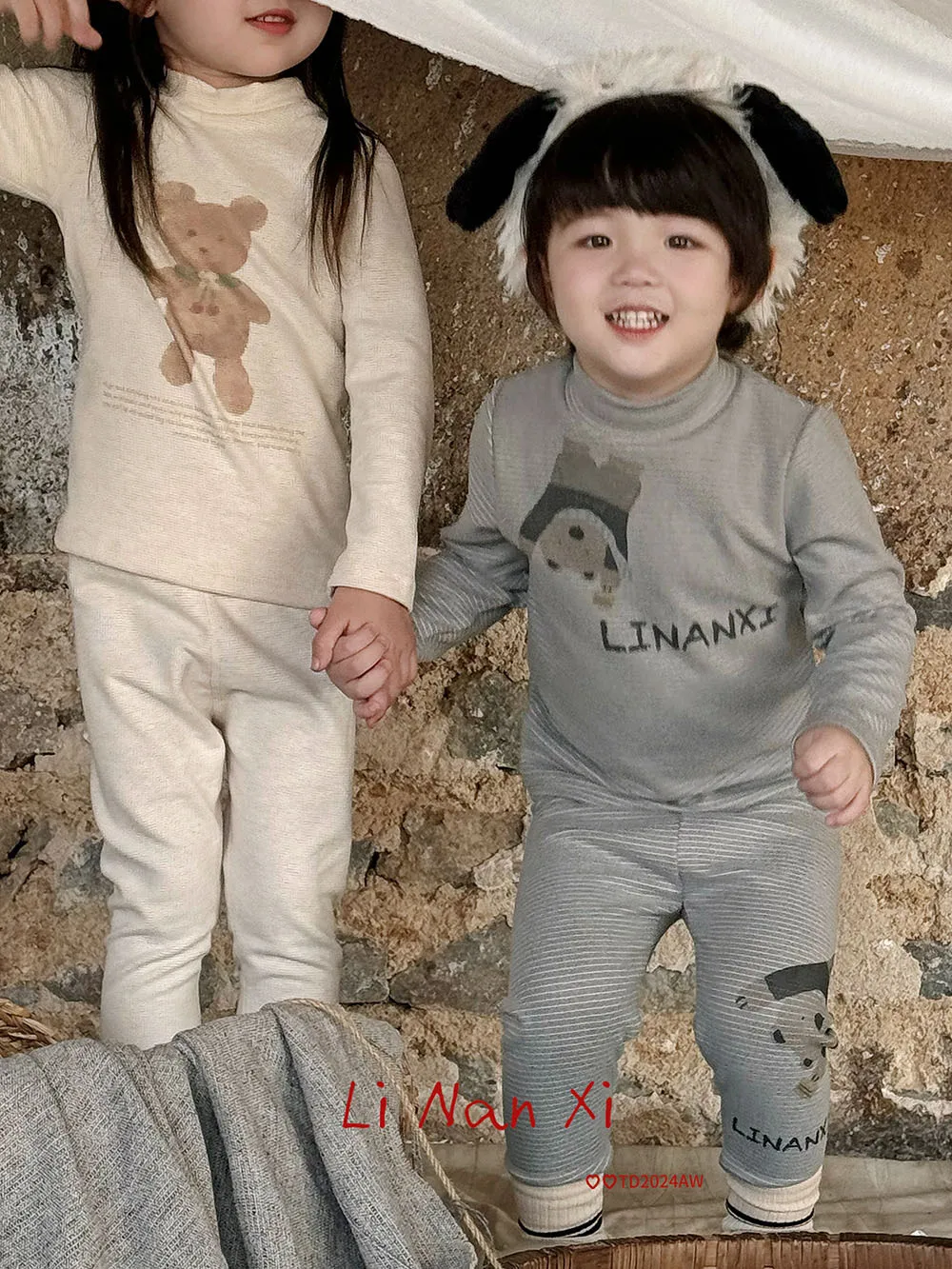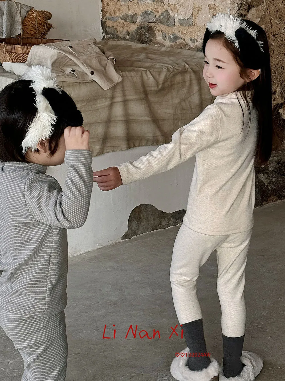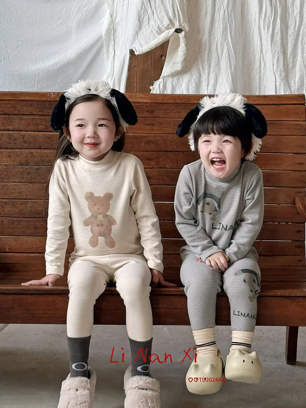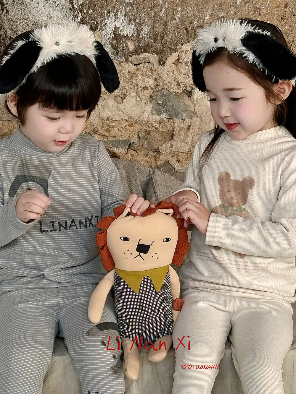 キッズセットアップ 2点セット アニマルプリントボーダー/無地長袖パジャマセット ハイネック長袖Tシャツ+ロングパンツ【mh0007851】