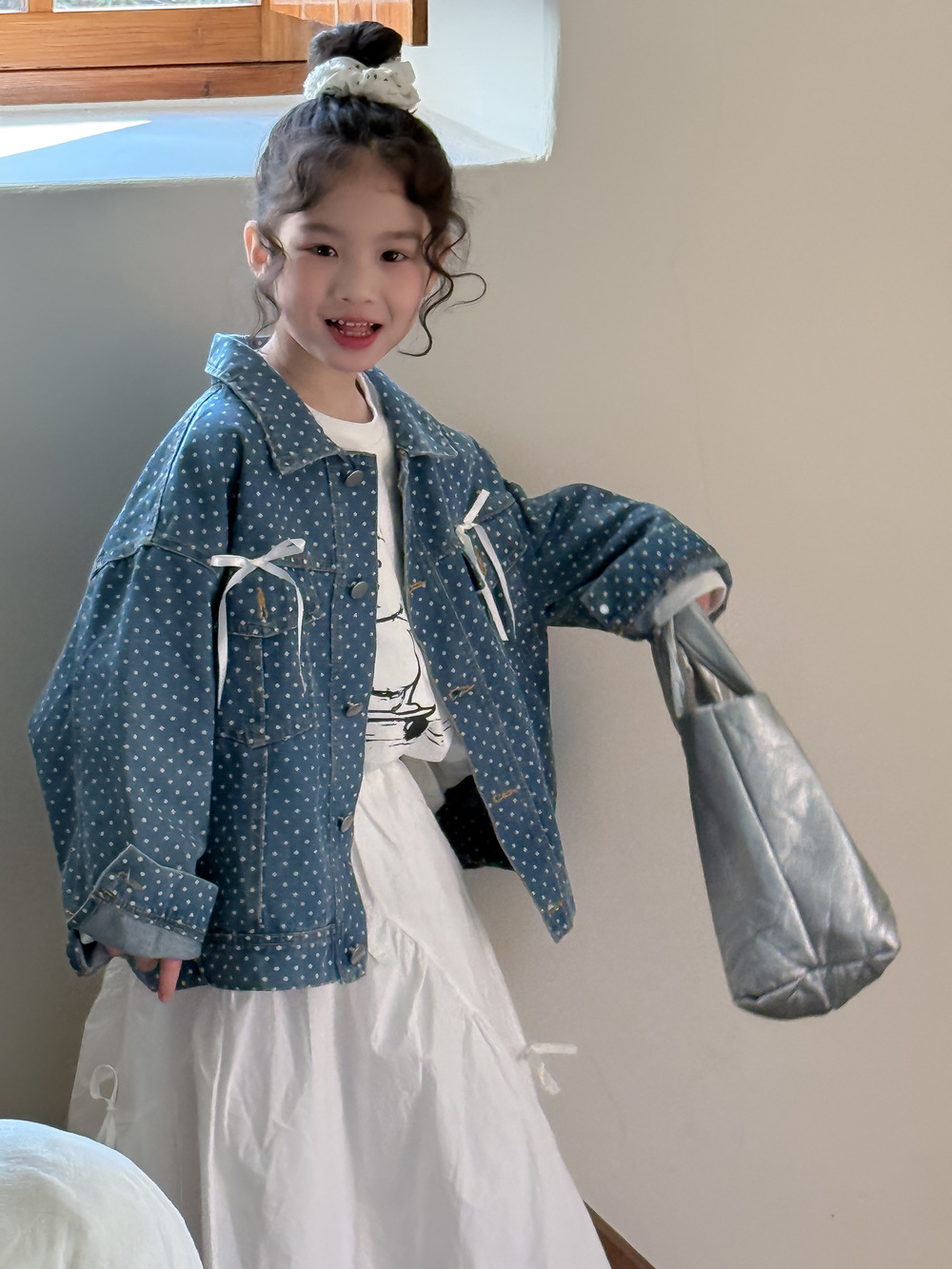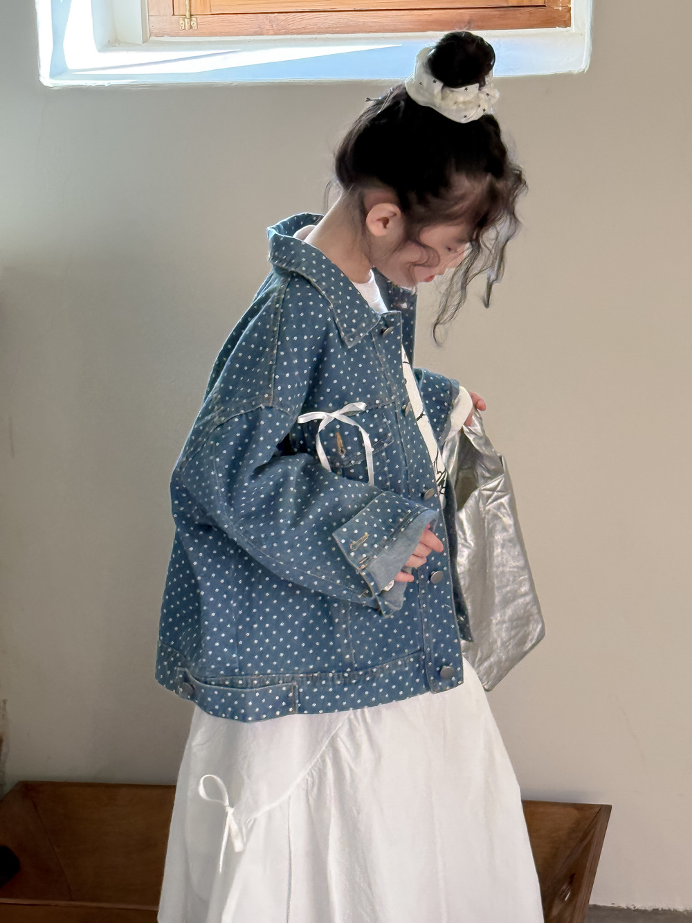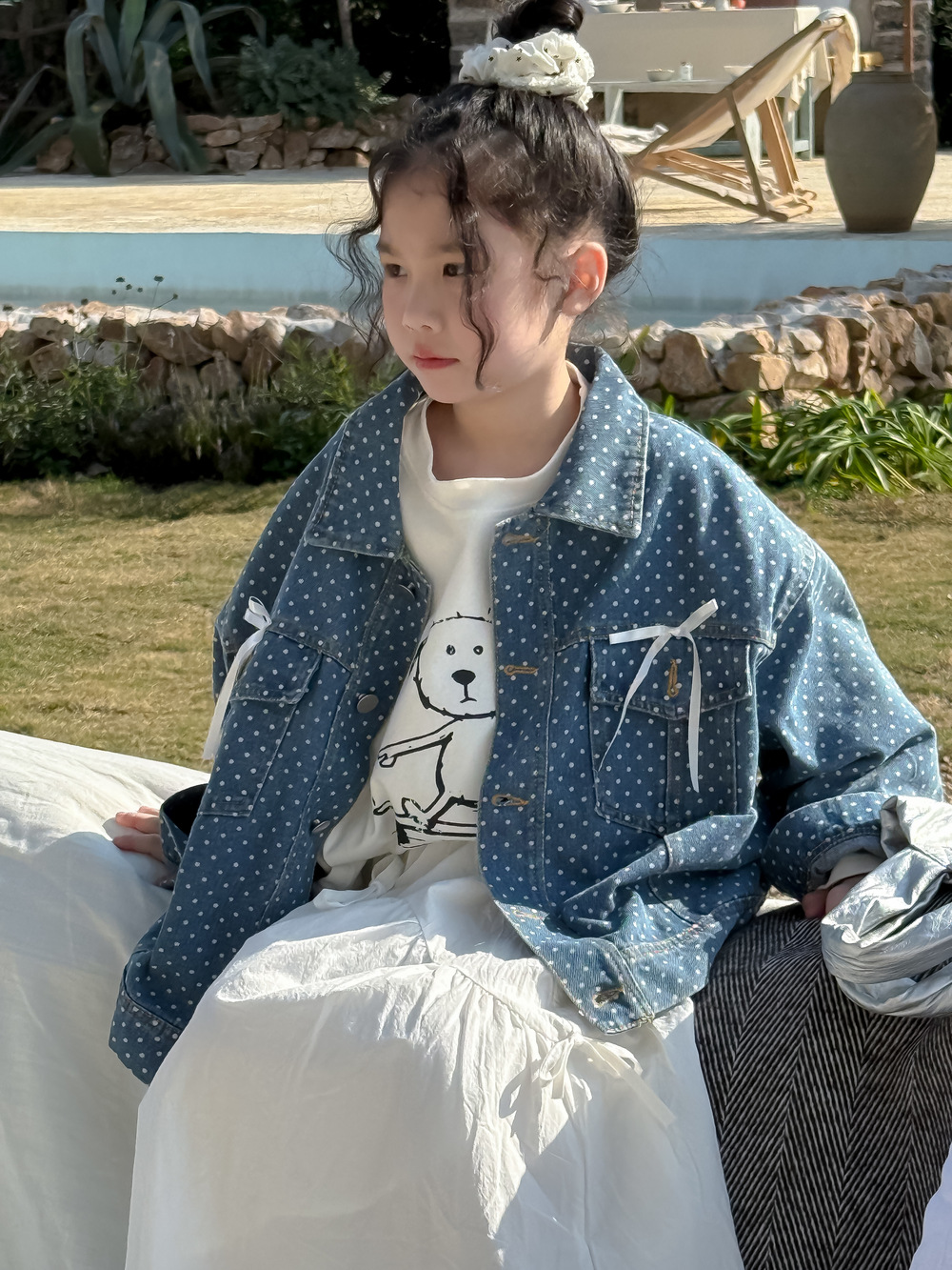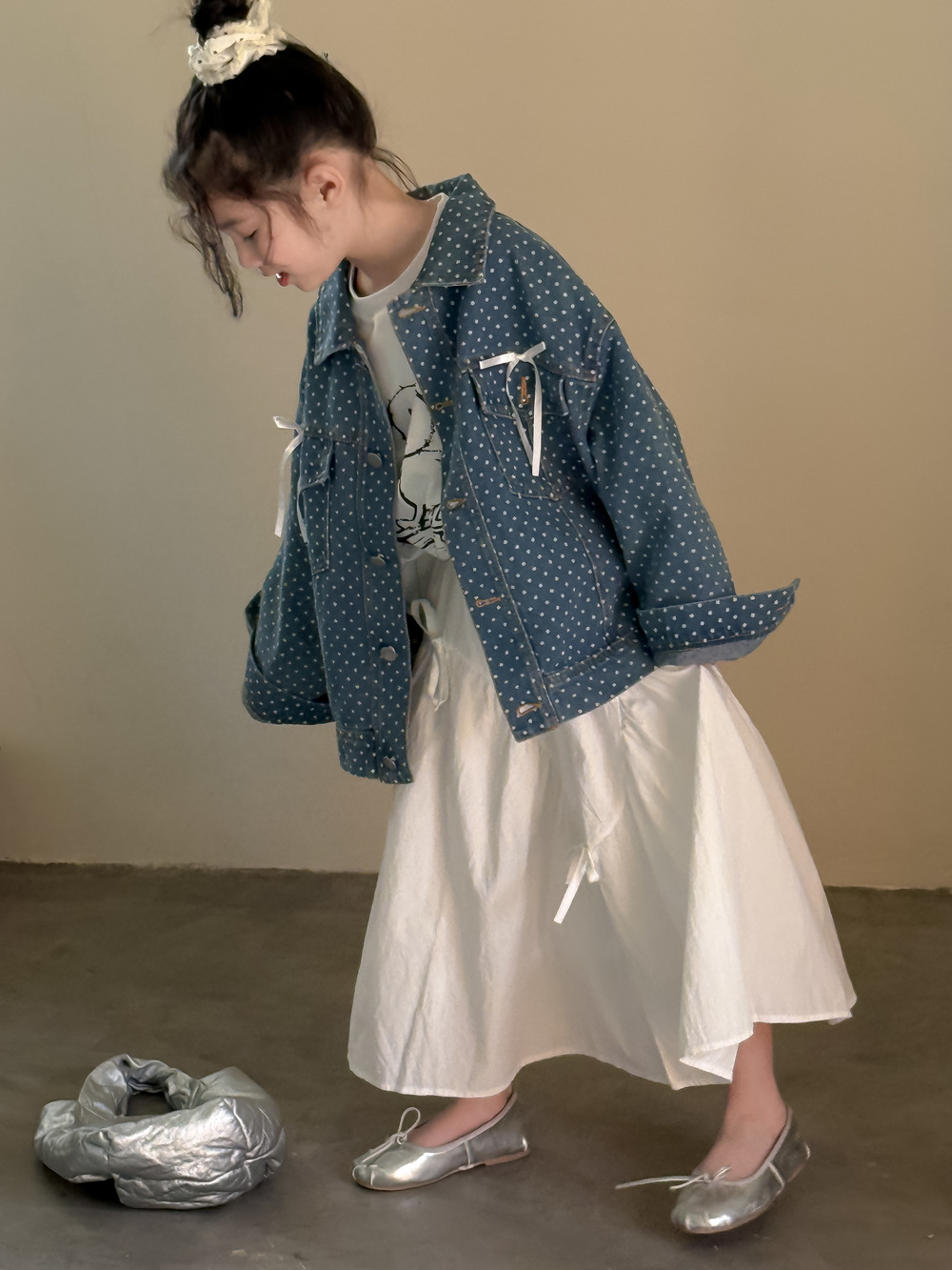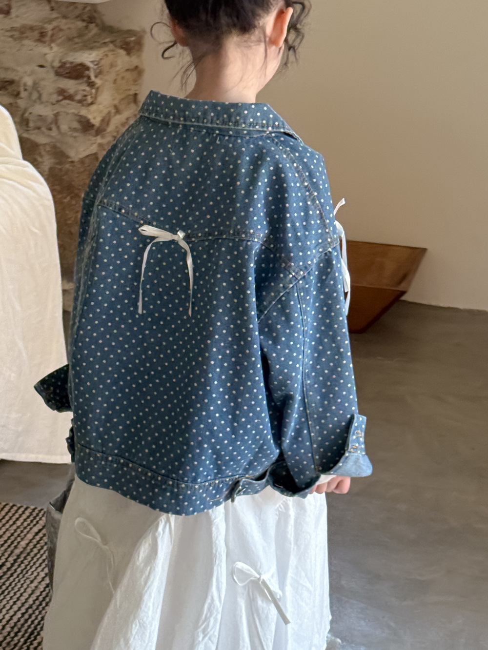 #キッズジャケット #デニムシャツ #水玉ドット #リボン #カジュアル #ガーリーコーデ #おしゃれ #普段使い
