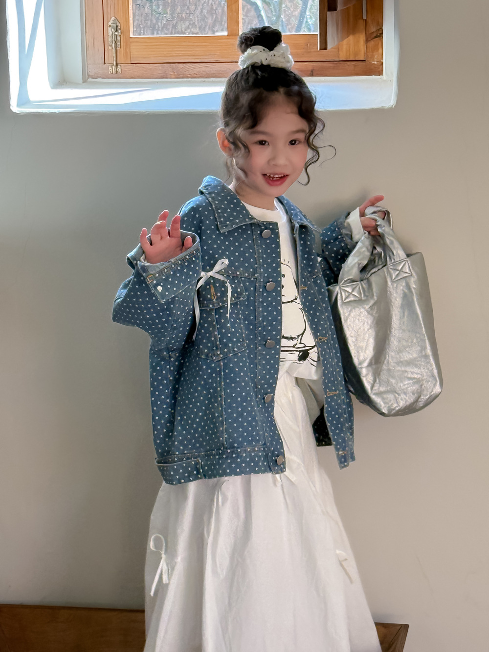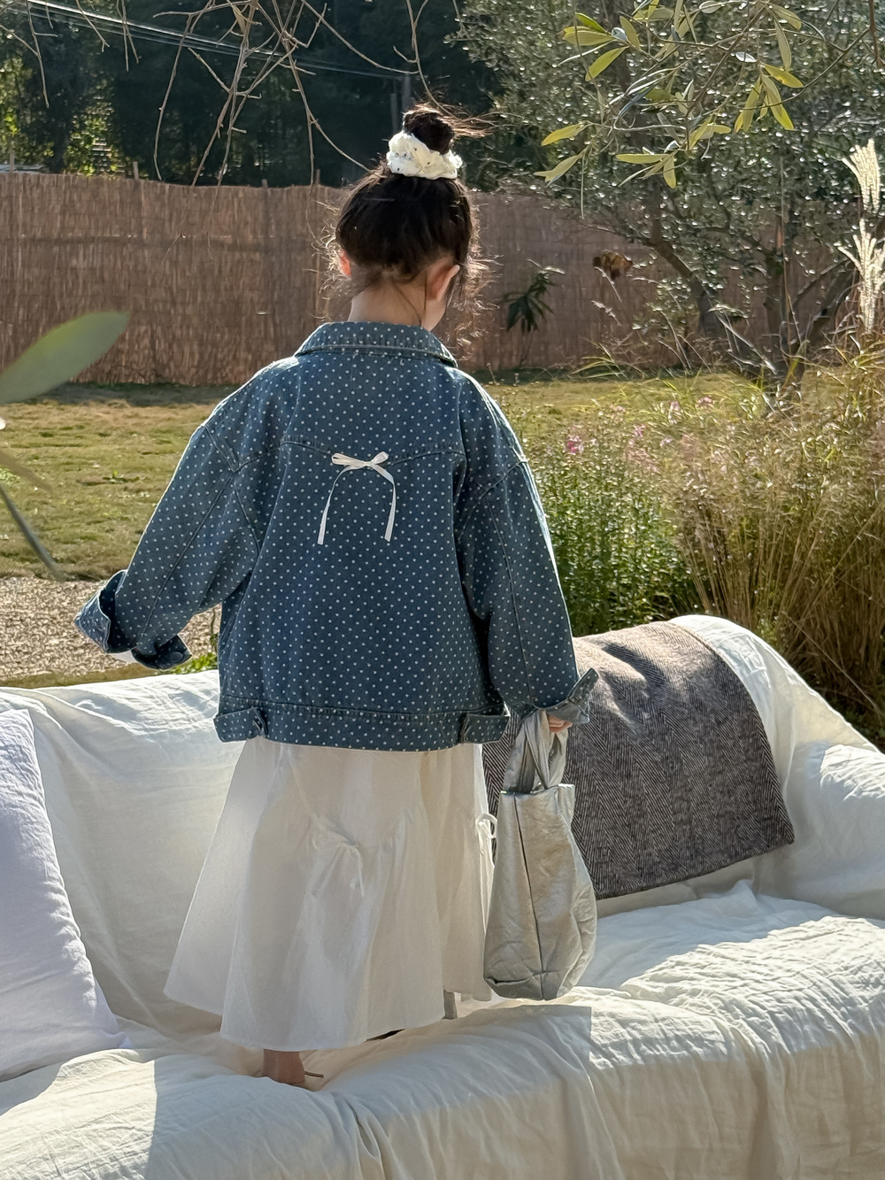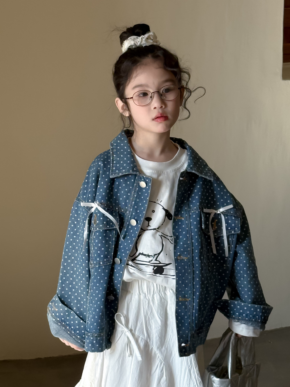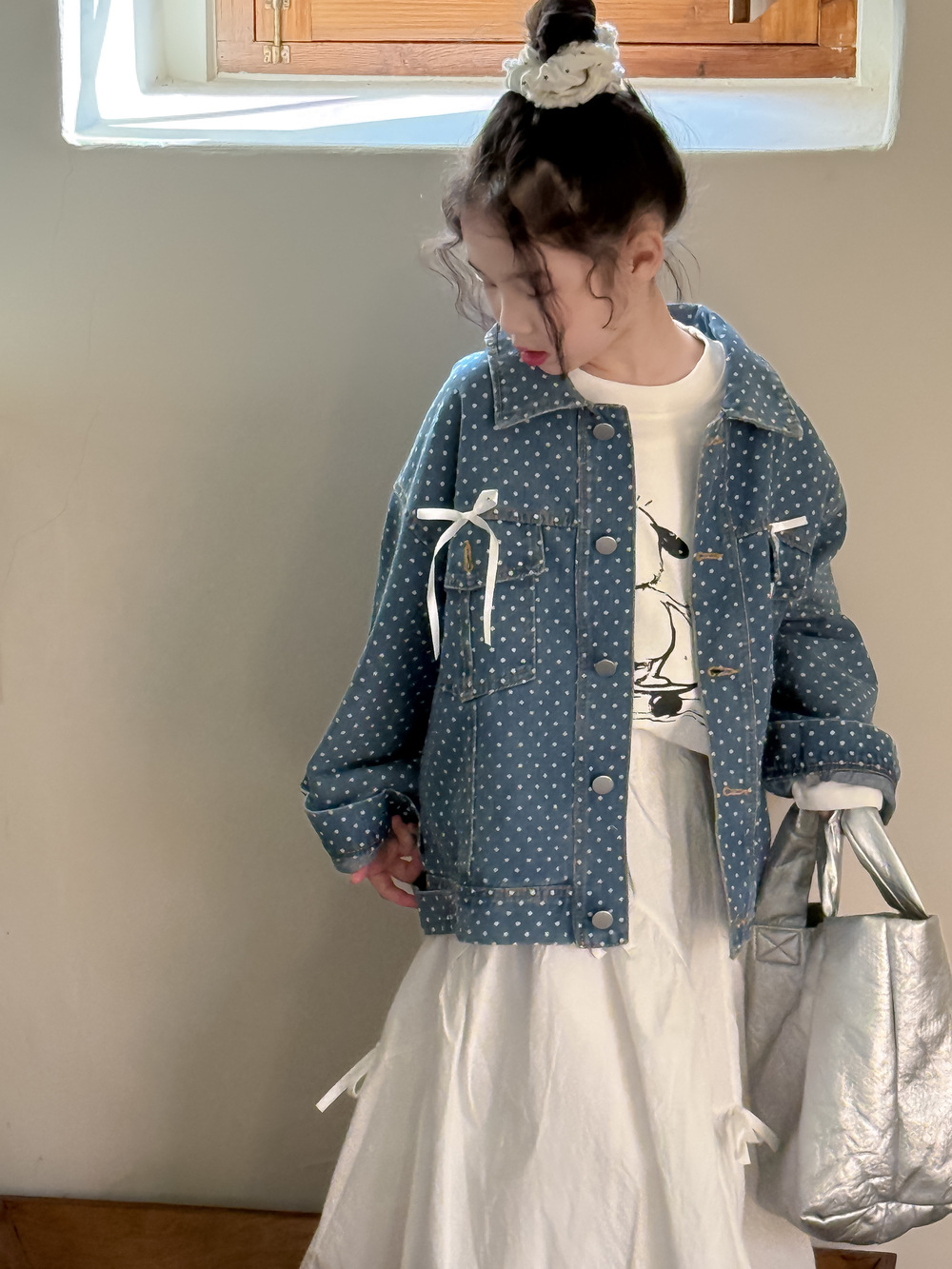 #キッズジャケット #デニムシャツ #水玉ドット #リボン #カジュアル #ガーリーコーデ #おしゃれ #普段使い
