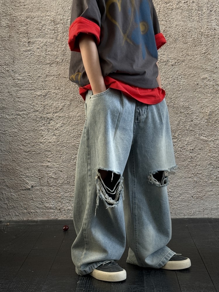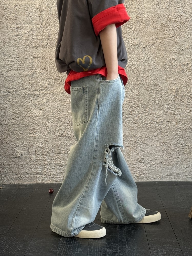 ダメージ加工ワイドルーズデニムパンツジーンズ【mh0009687】