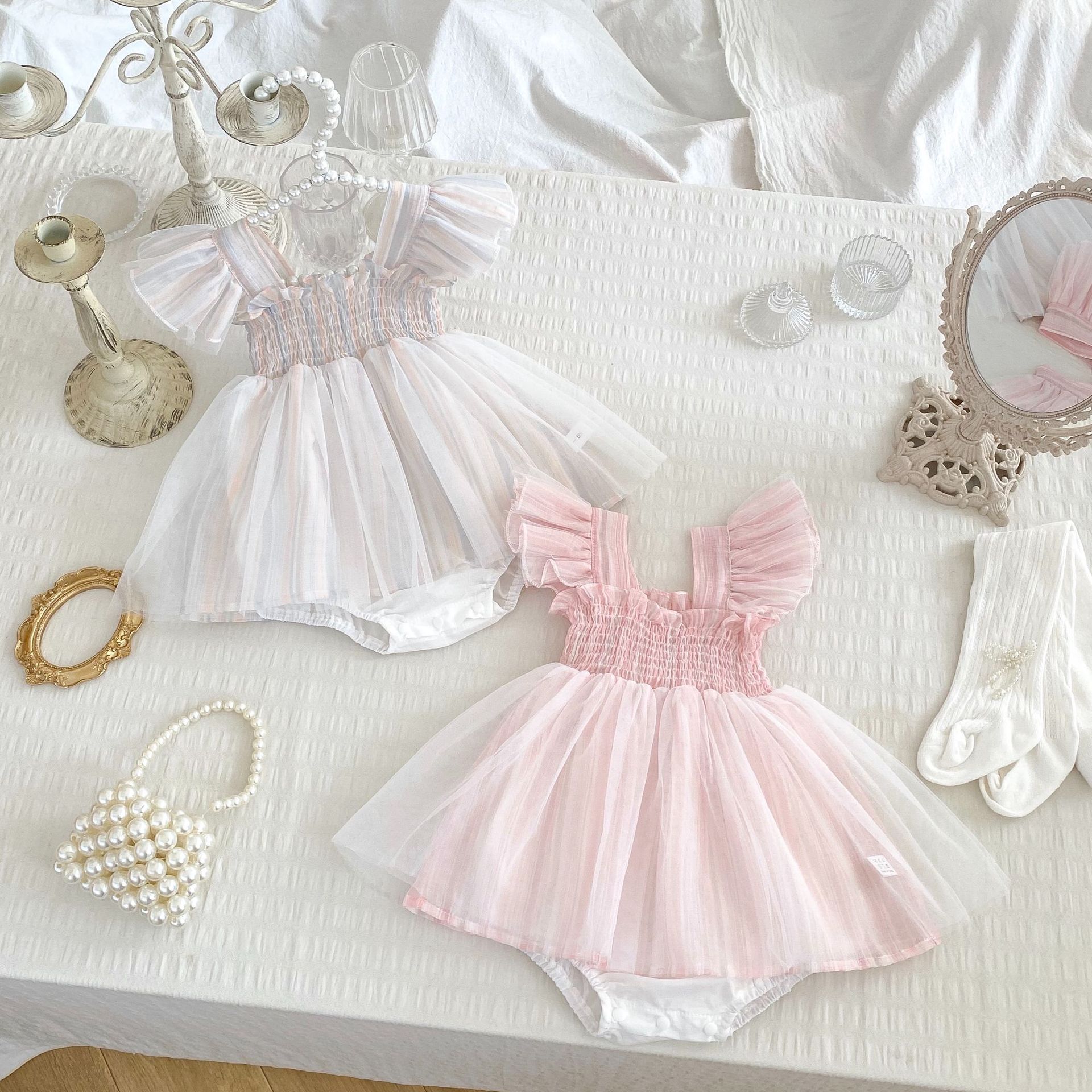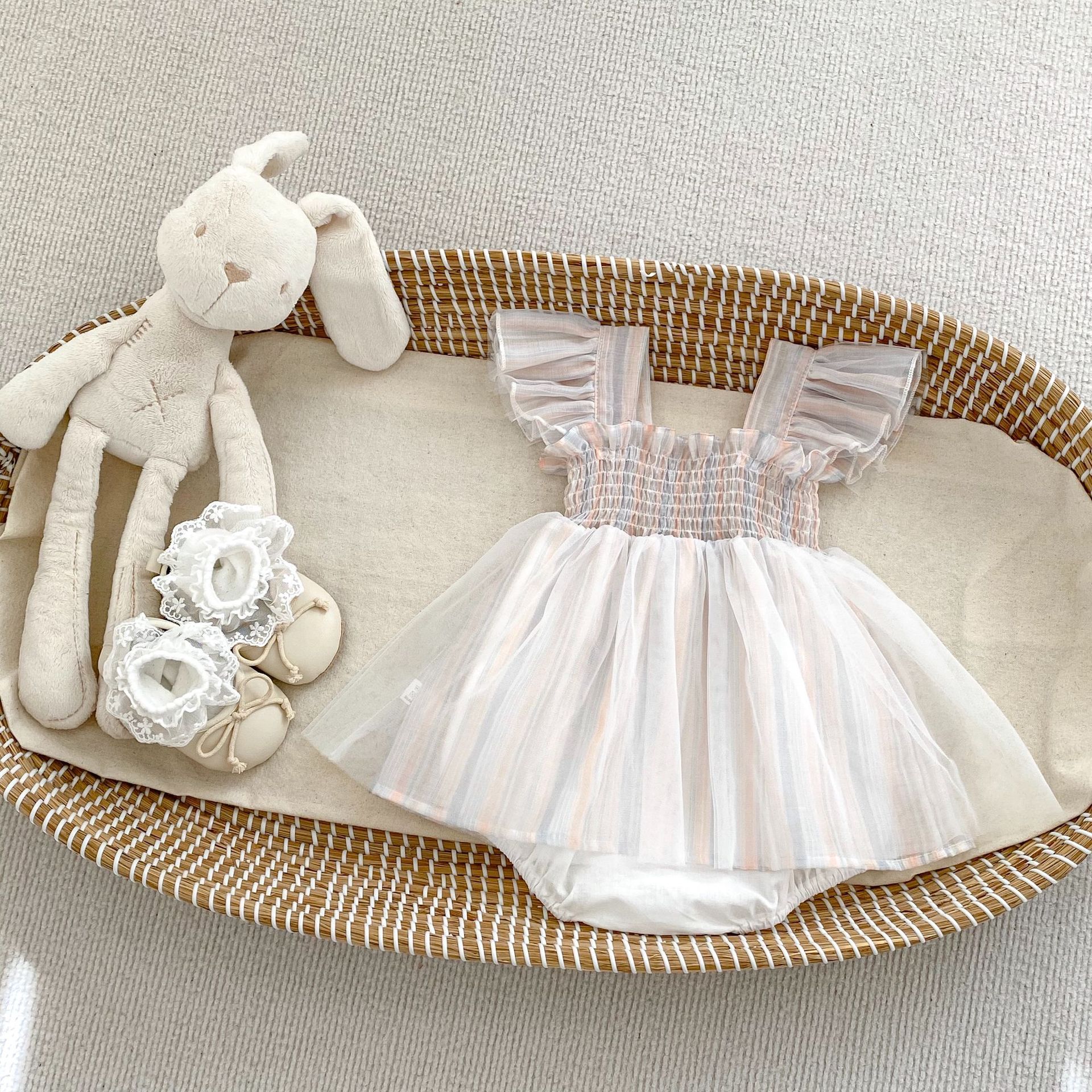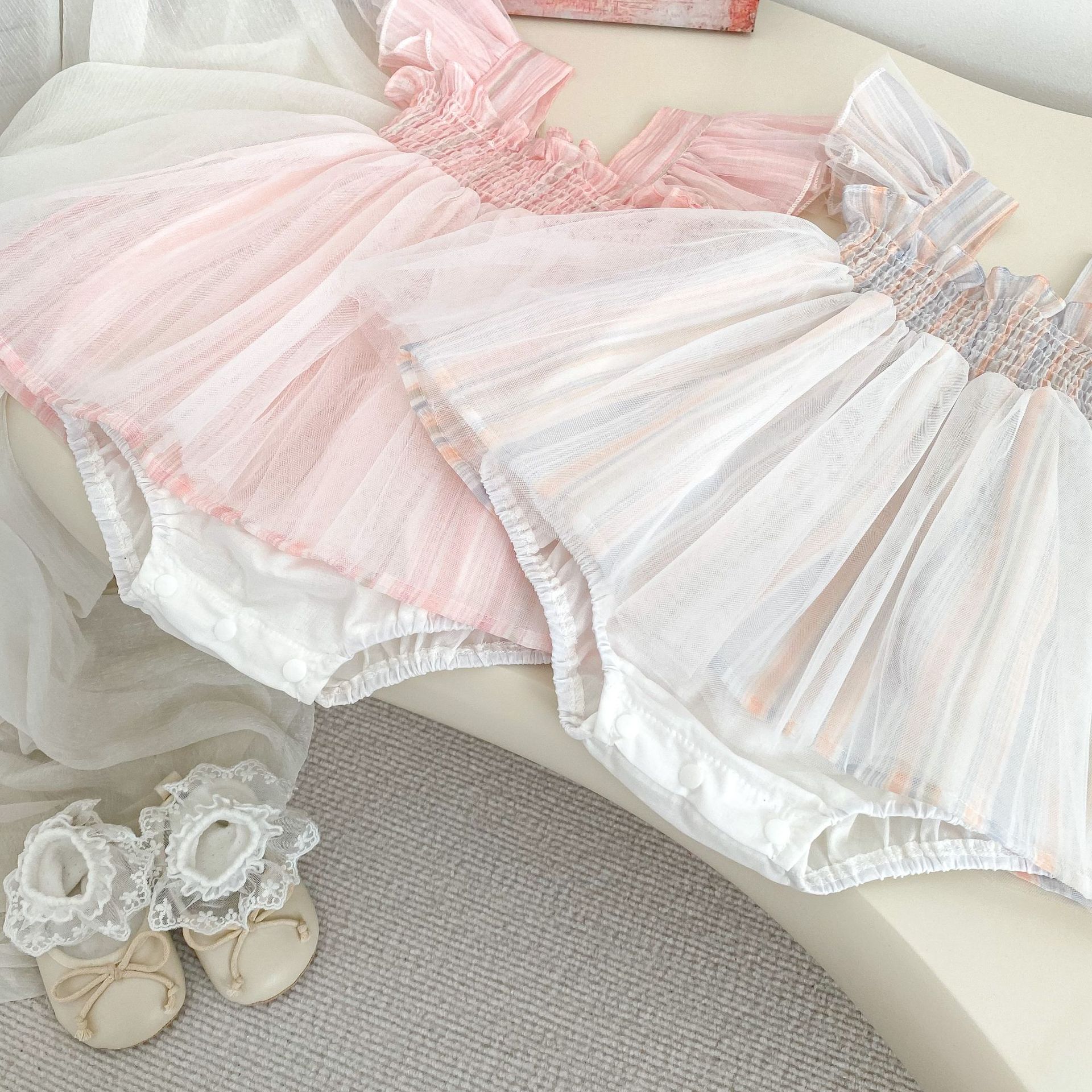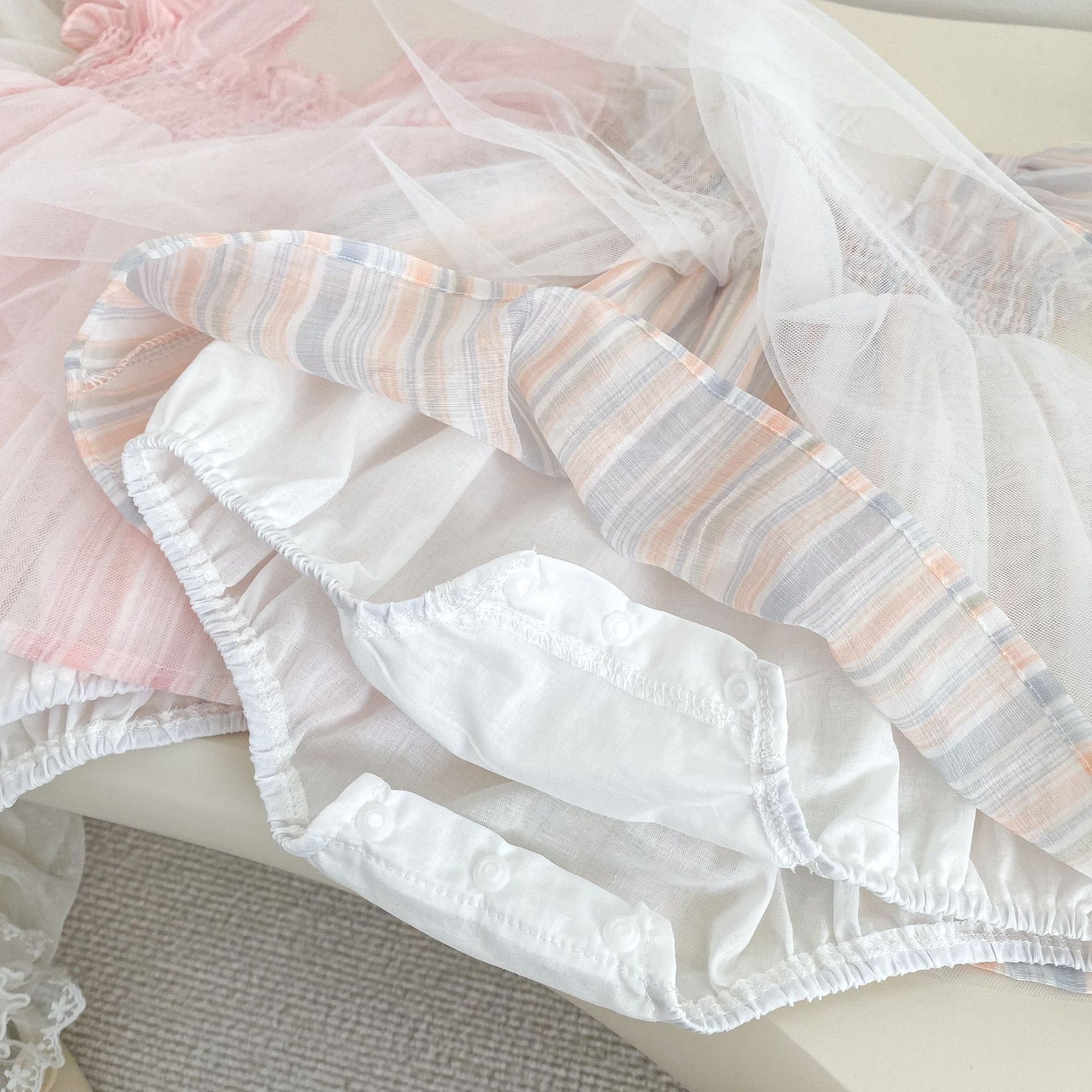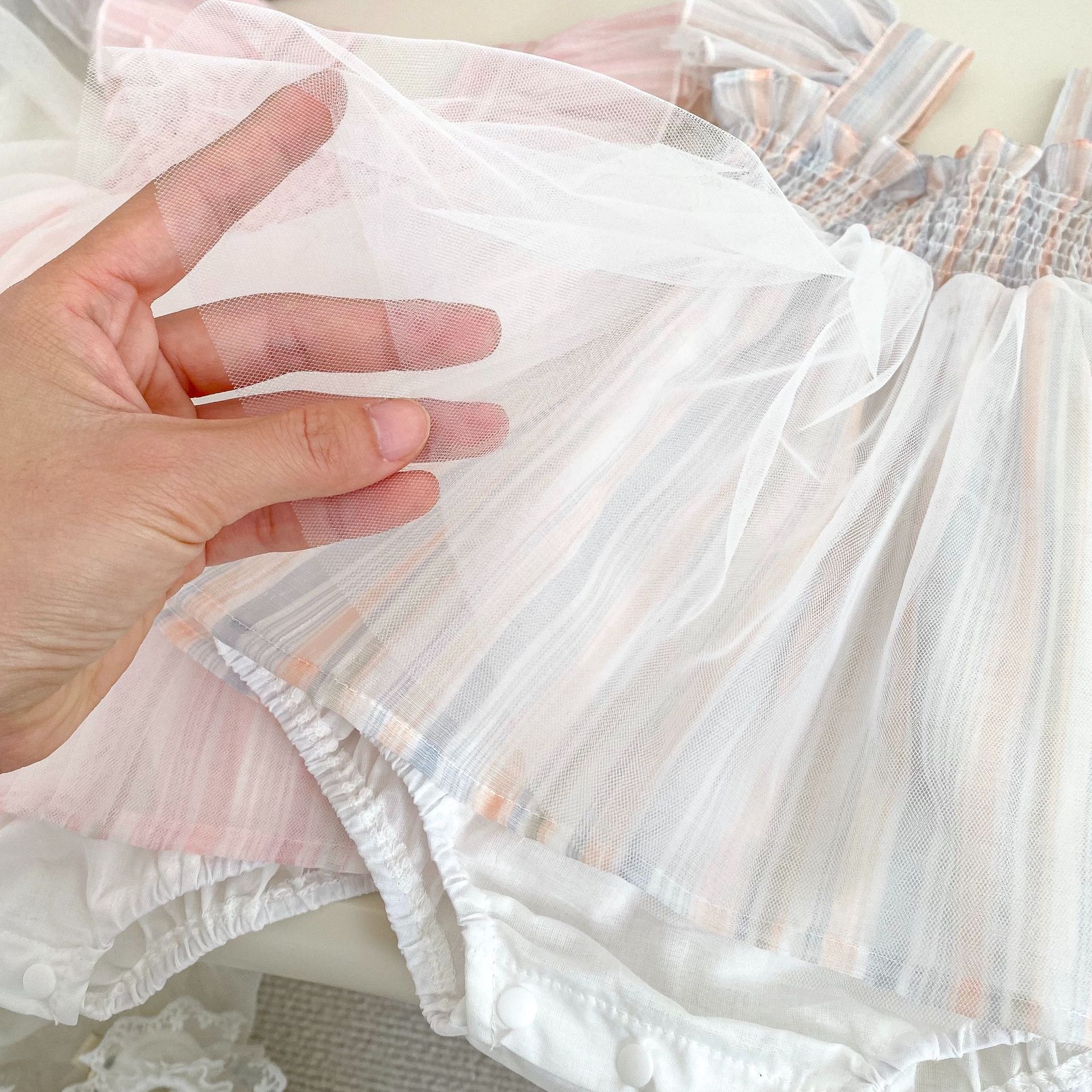 虹色のフリルショルダーと、ふんわりと広がるチュールスカートが、まるで夢のような可愛らしさのベビーガール用ロンパースです。夏のベビーにぴったりの、涼しげな素材を使用。肩のフリルが華やかさを添え、チュールスカートがロマンティックな雰囲気を演出します。股下はスナップボタン式になっているので、お着替えやおむつ替えも簡単。お宮参りや、初めてのお誕生日など、特別な日のおめかしにもぴったりです。