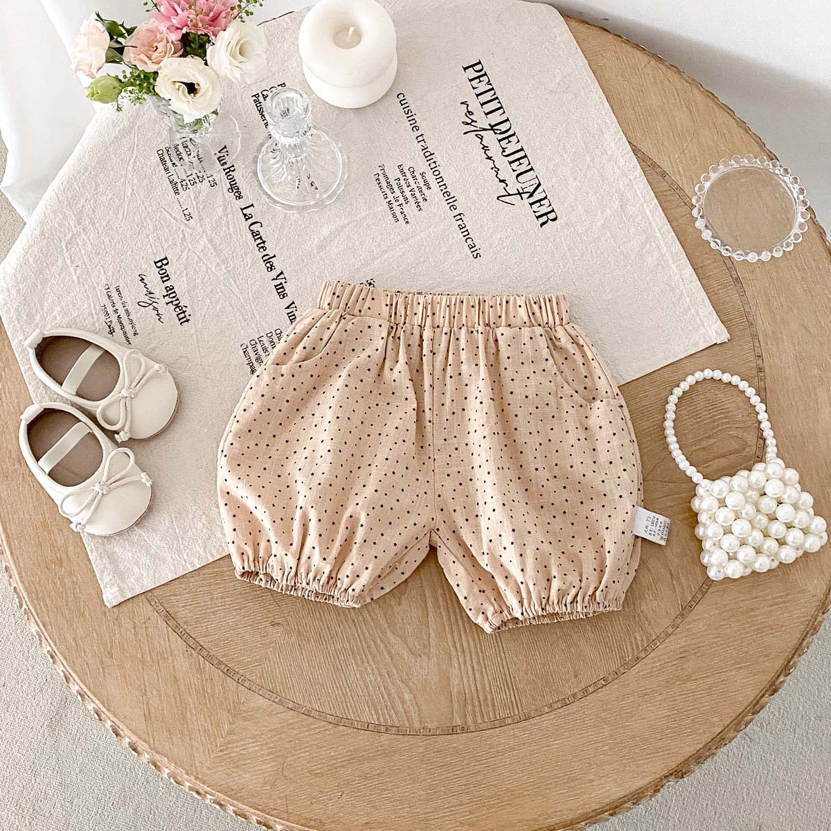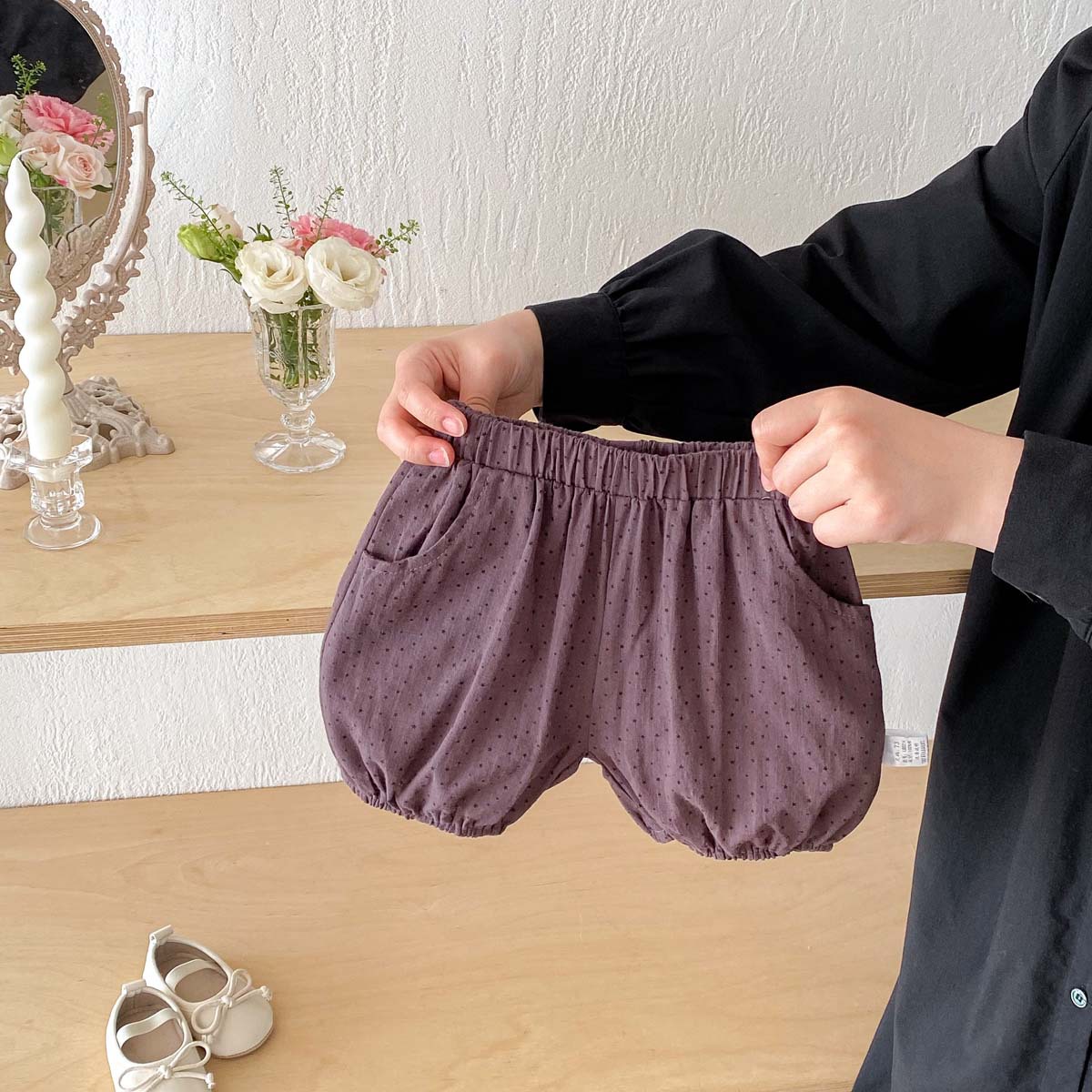 夏のベビーにぴったりの、可愛らしい水玉ピンドット柄バルーンショートパンツです。男の子にも女の子にも似合うユニセックスデザイン。ふんわりとしたバルーンシルエットで、動きやすく快適な穿き心地です。柔らかなコットン素材を使用しており、デリケートなベビーの肌にも安心。普段使いにはもちろん、ちょっとしたお出かけにもおすすめです。どんなトップスとも相性が良く、着回し力の高い一枚です。