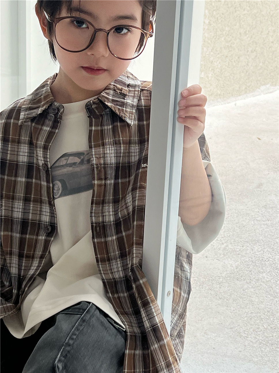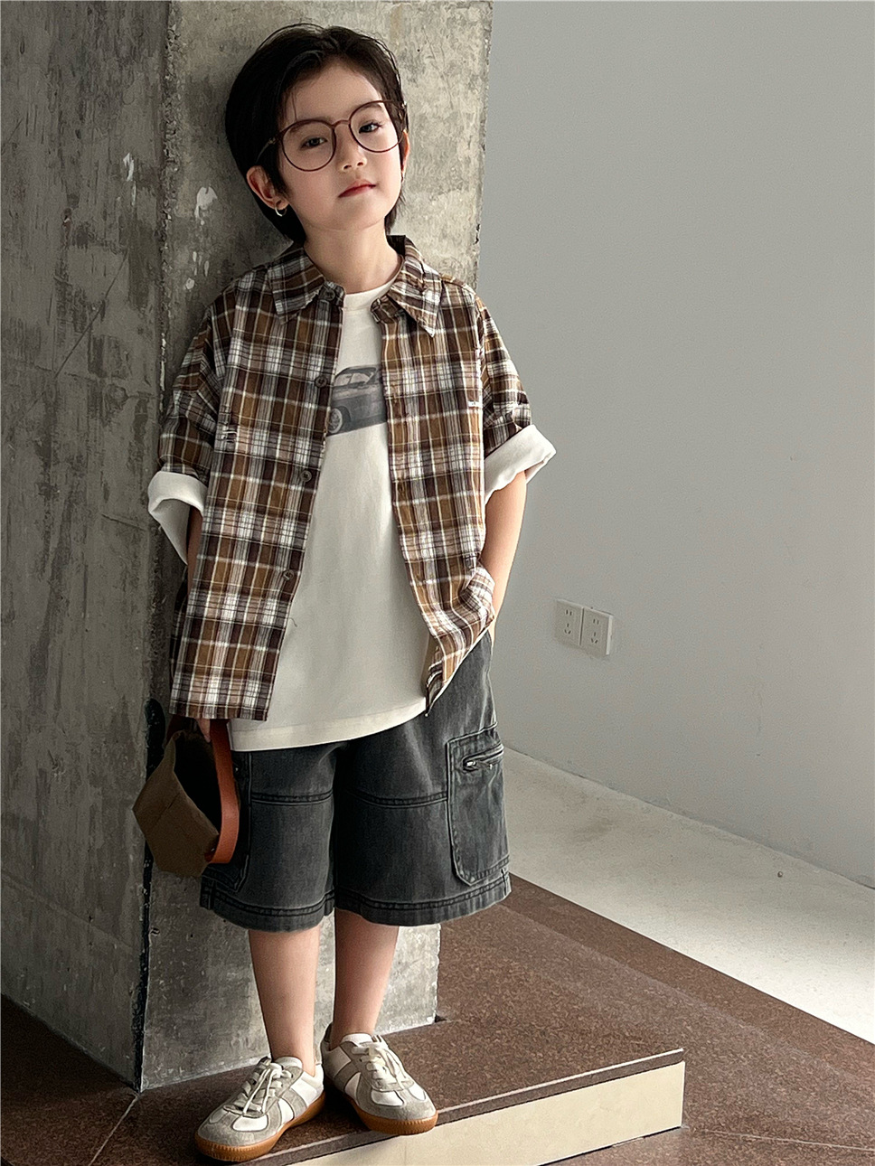レトロな雰囲気のチェック柄半袖シャツです。トレンド感のあるチェック柄が目を引き、随所に施されたダメージ加工や刺繍が、こなれたおしゃれ感を演出します。男の子にも女の子にも似合う、ユニセックスなデザインです。