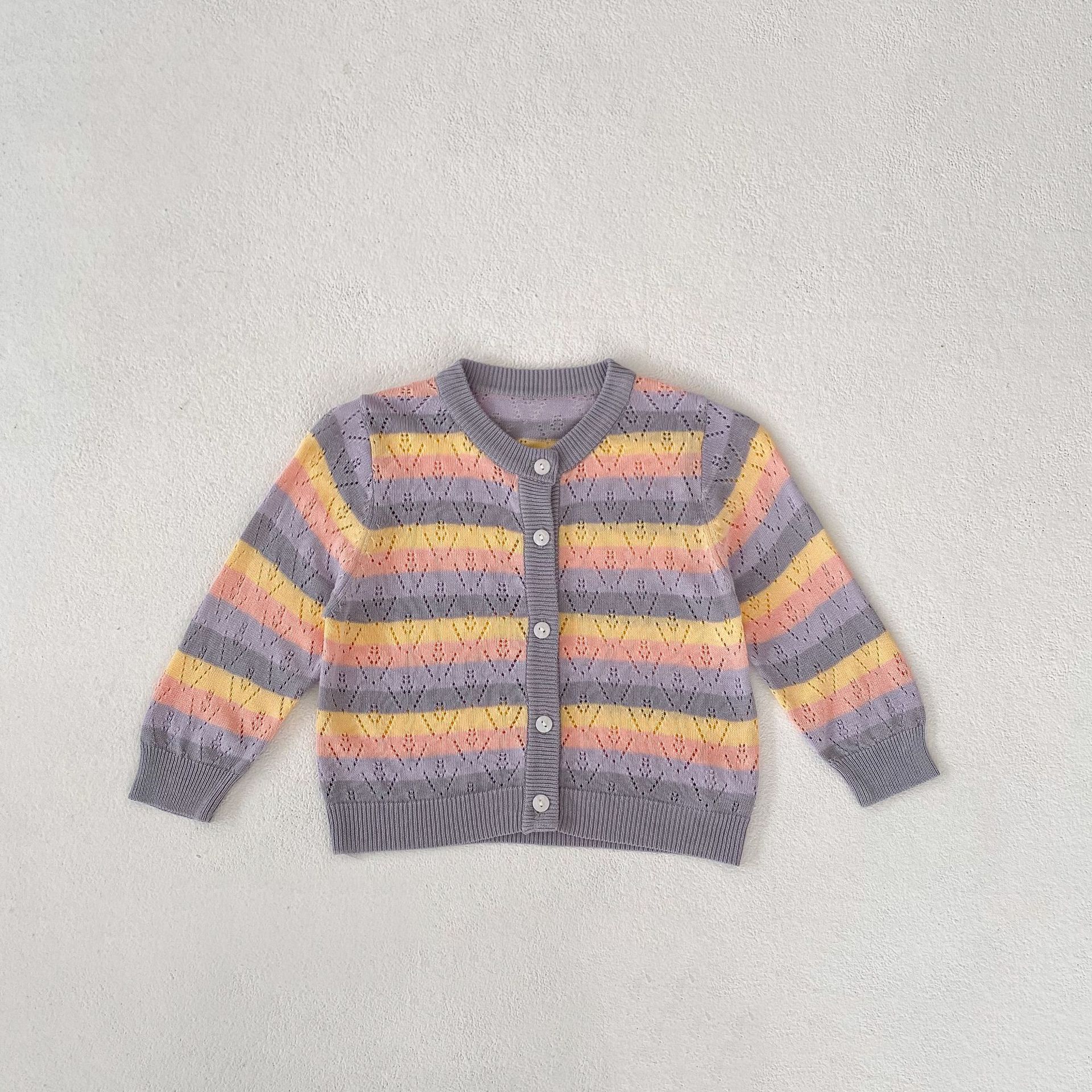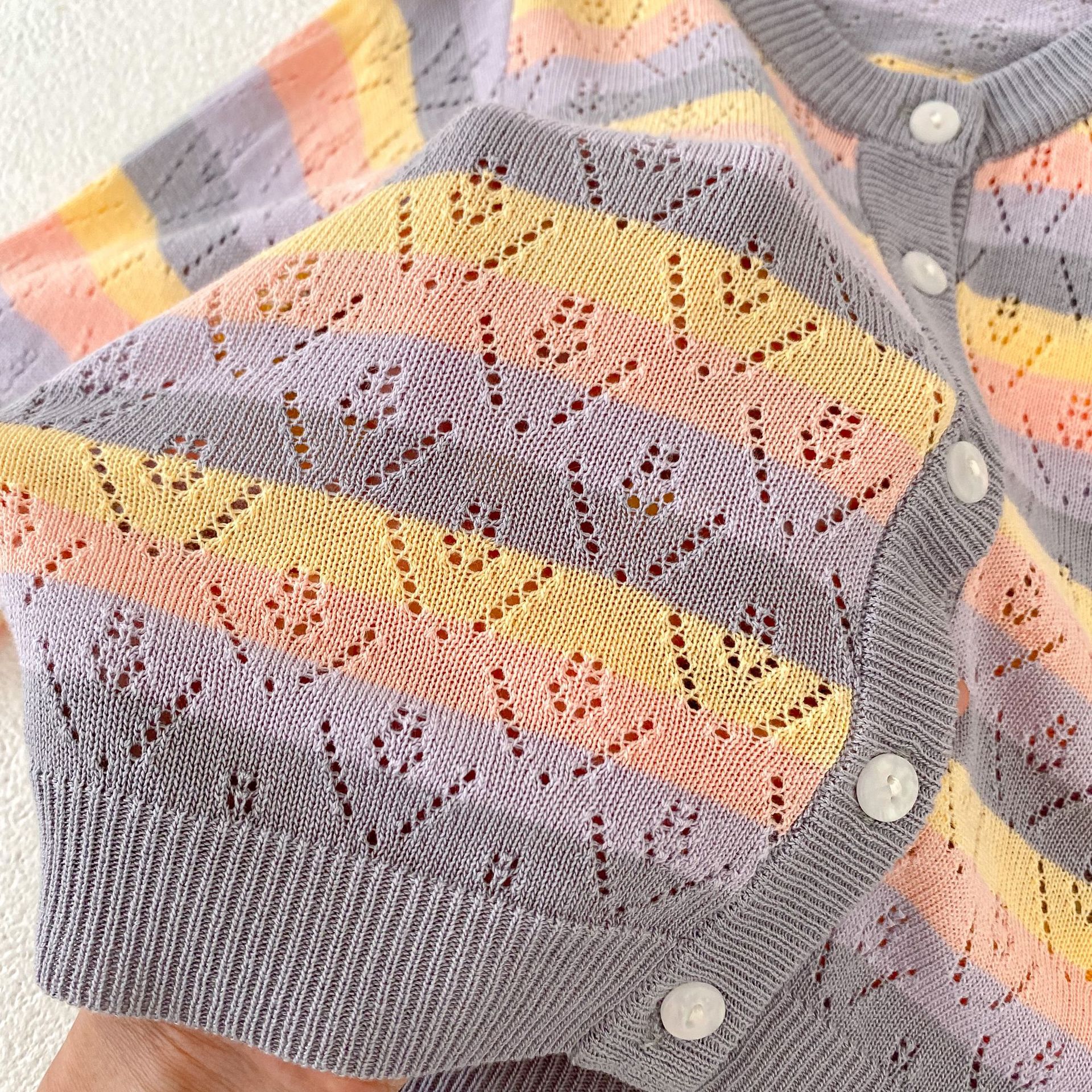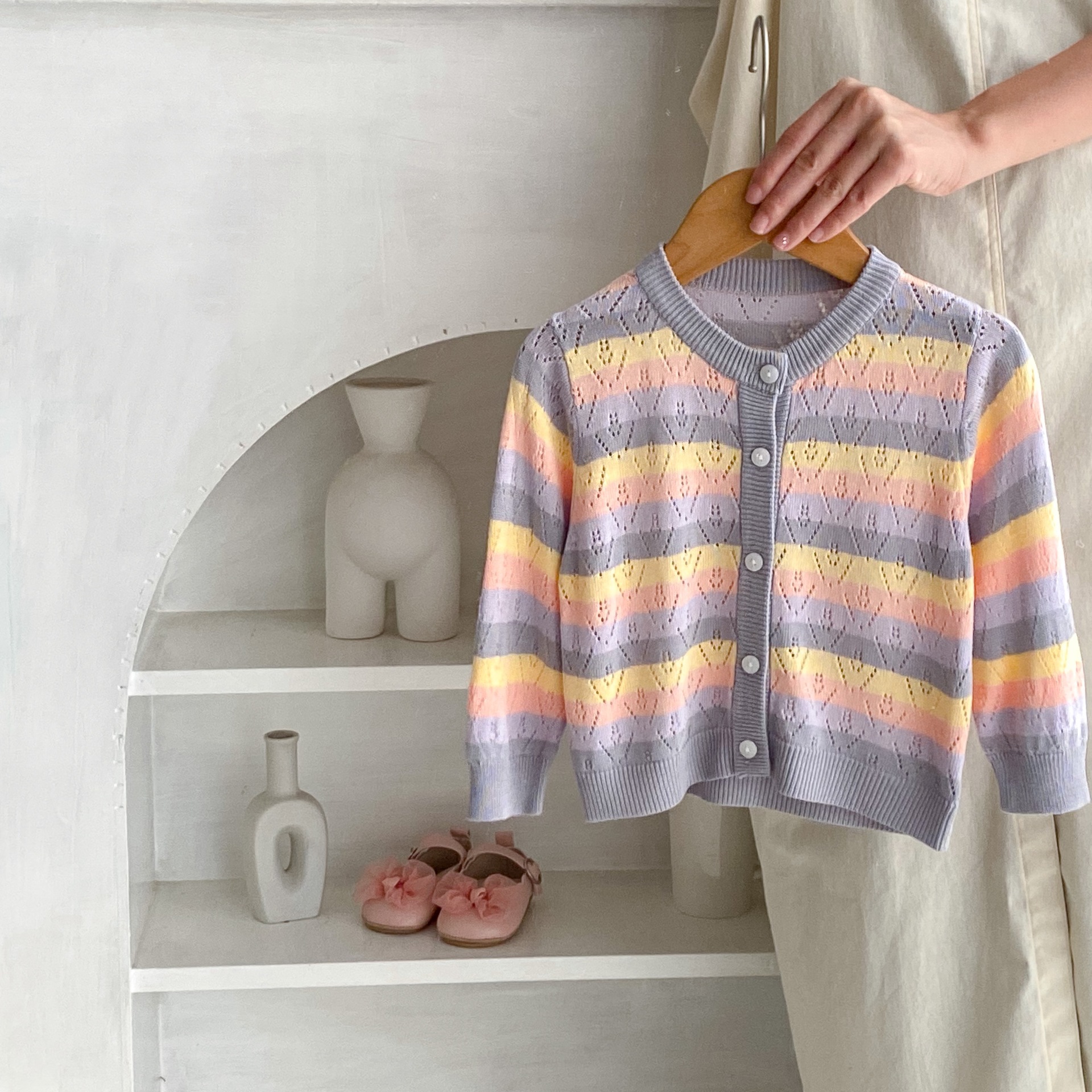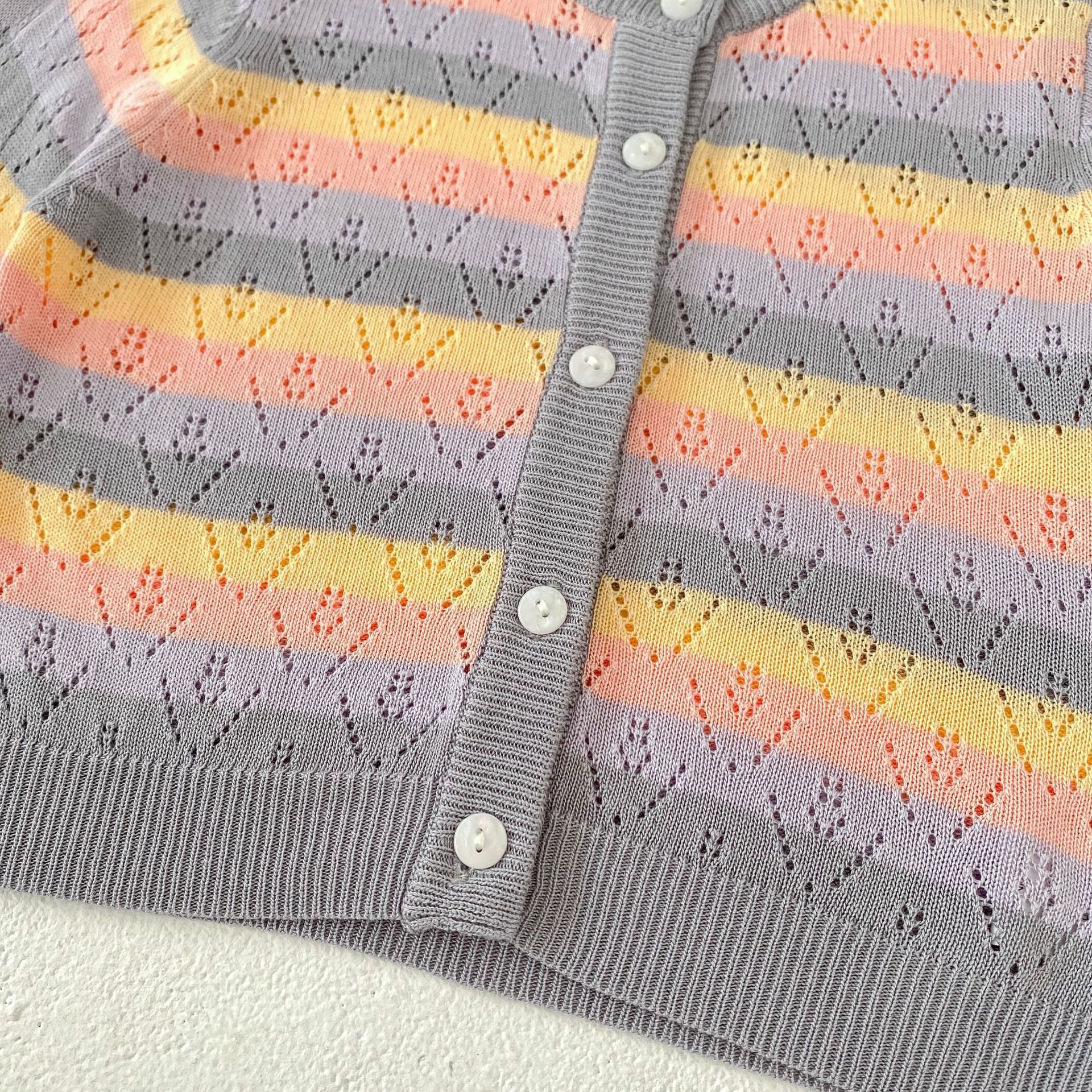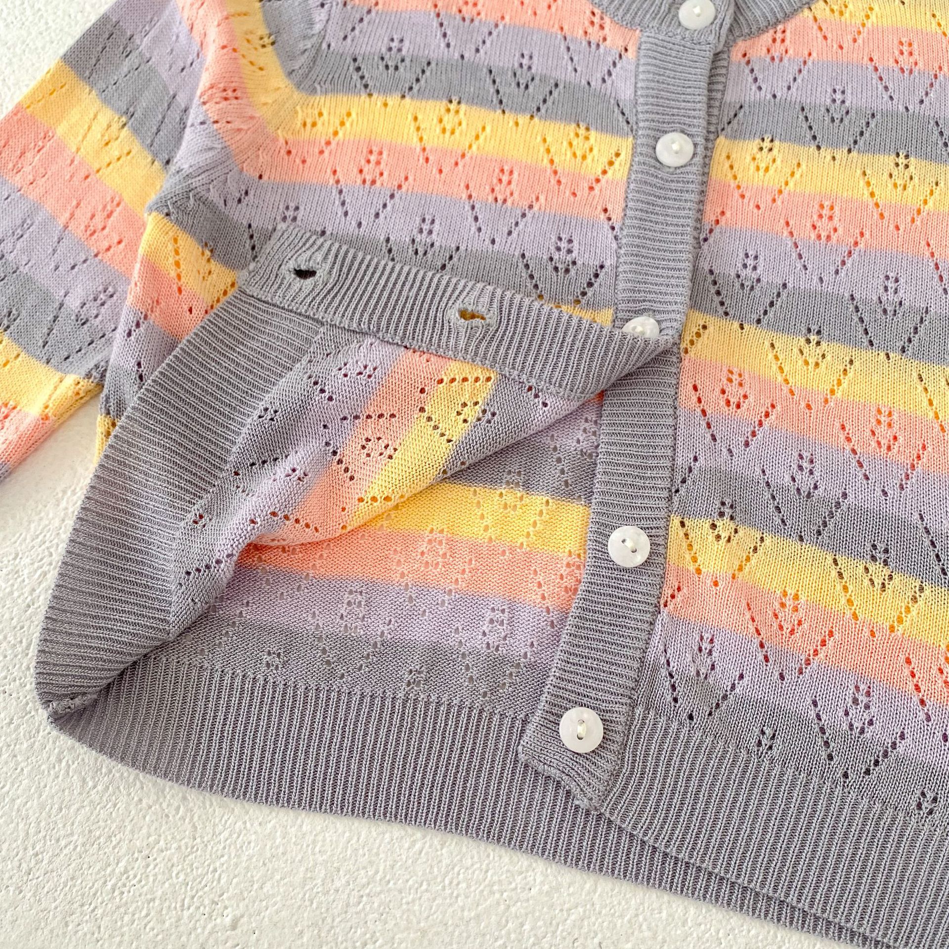 レインボーボーダーと涼しげなレースニットが魅力の、サマーカーディガンです。ベビーから男の子まで、夏の羽織りにぴったりのアイテム。