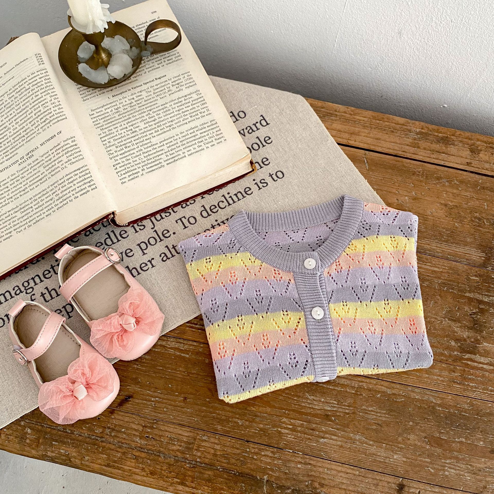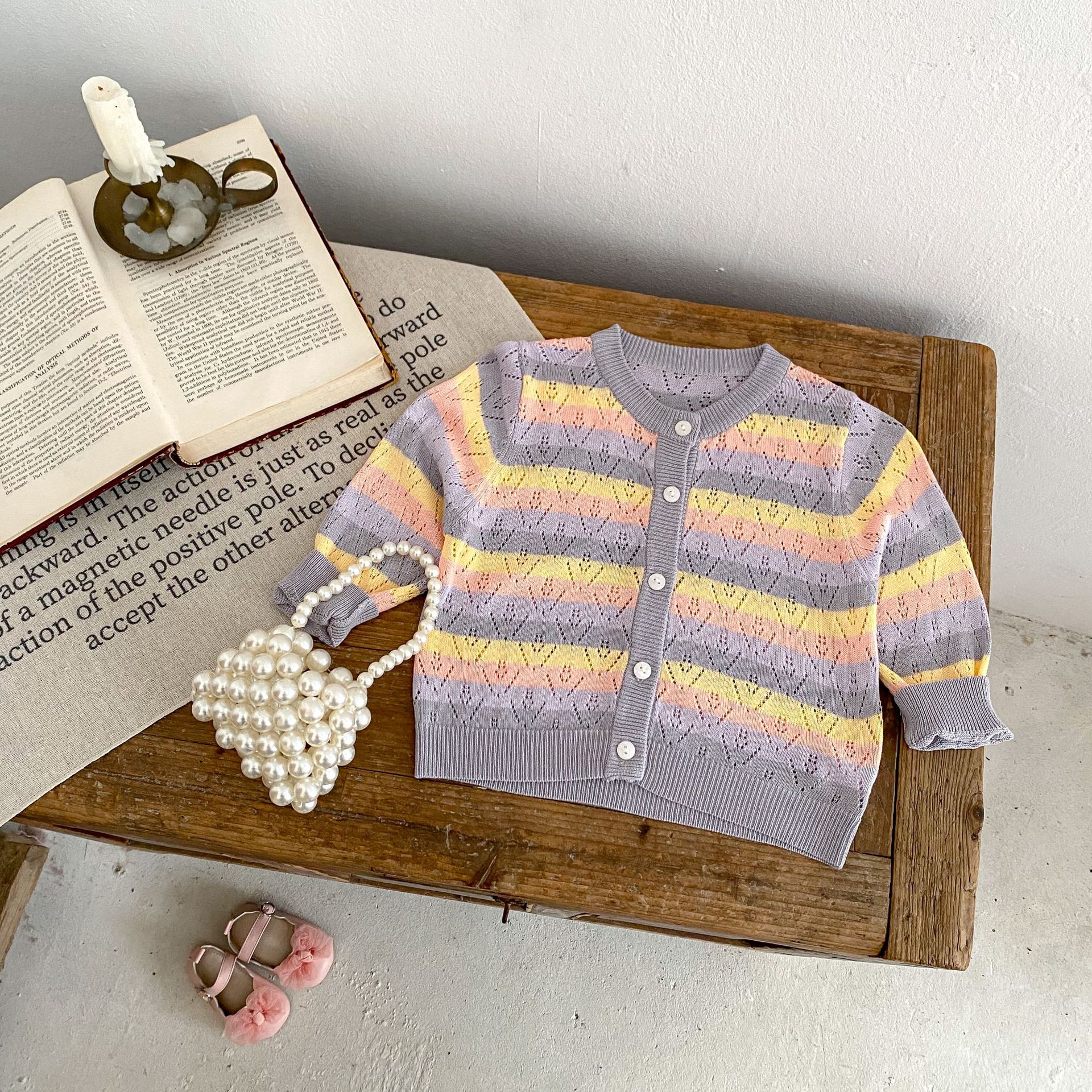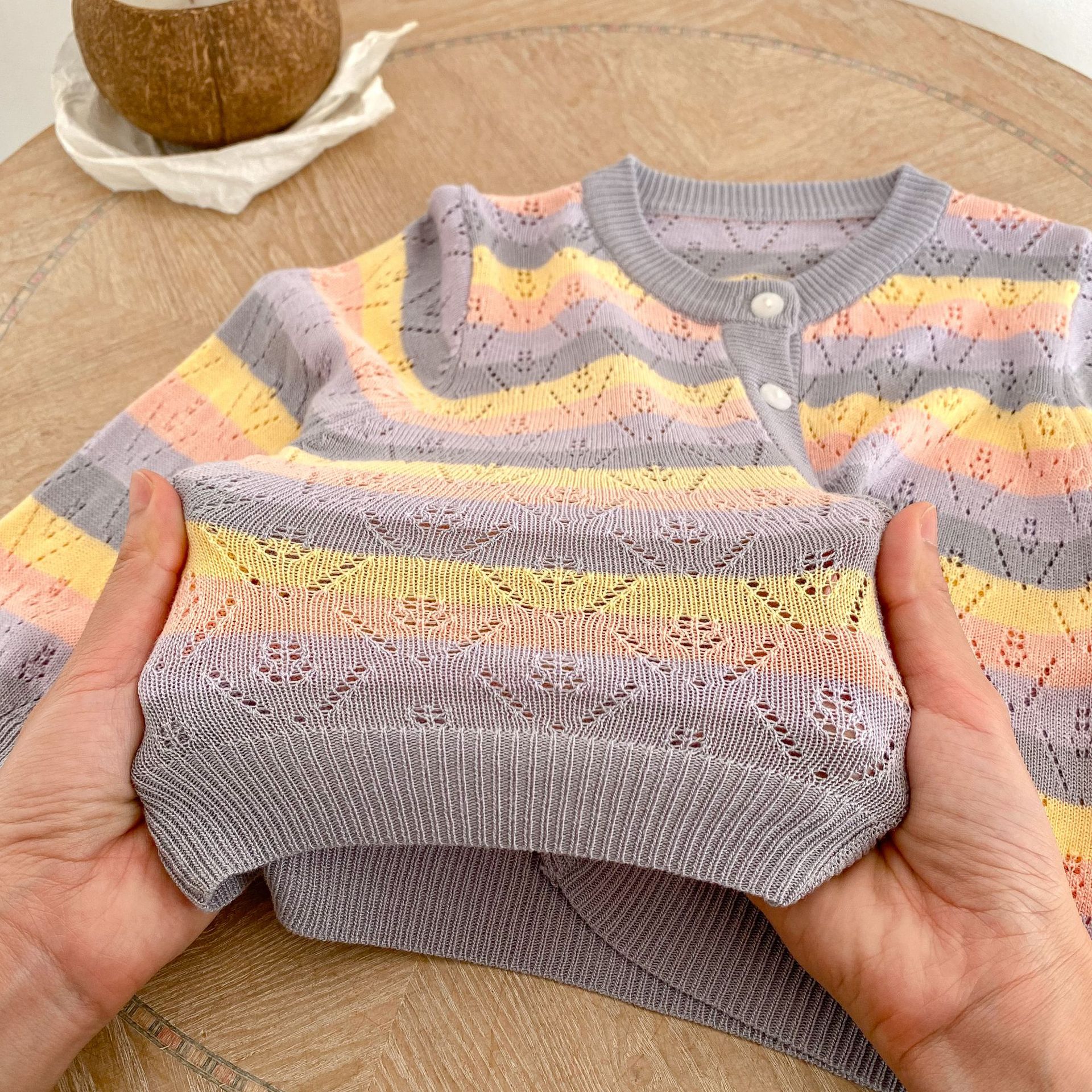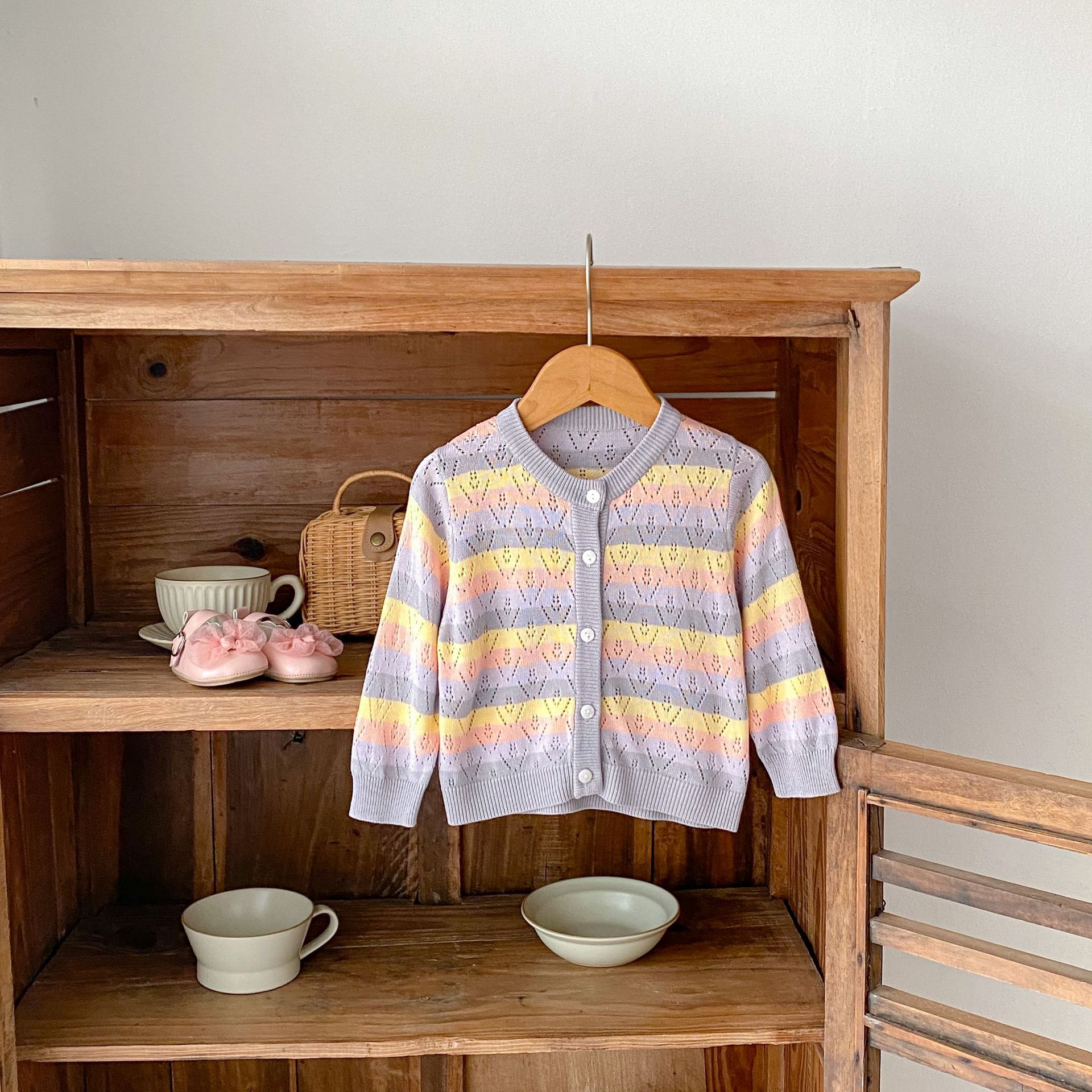 レインボーボーダーと涼しげなレースニットが魅力の、サマーカーディガンです。ベビーから男の子まで、夏の羽織りにぴったりのアイテム。