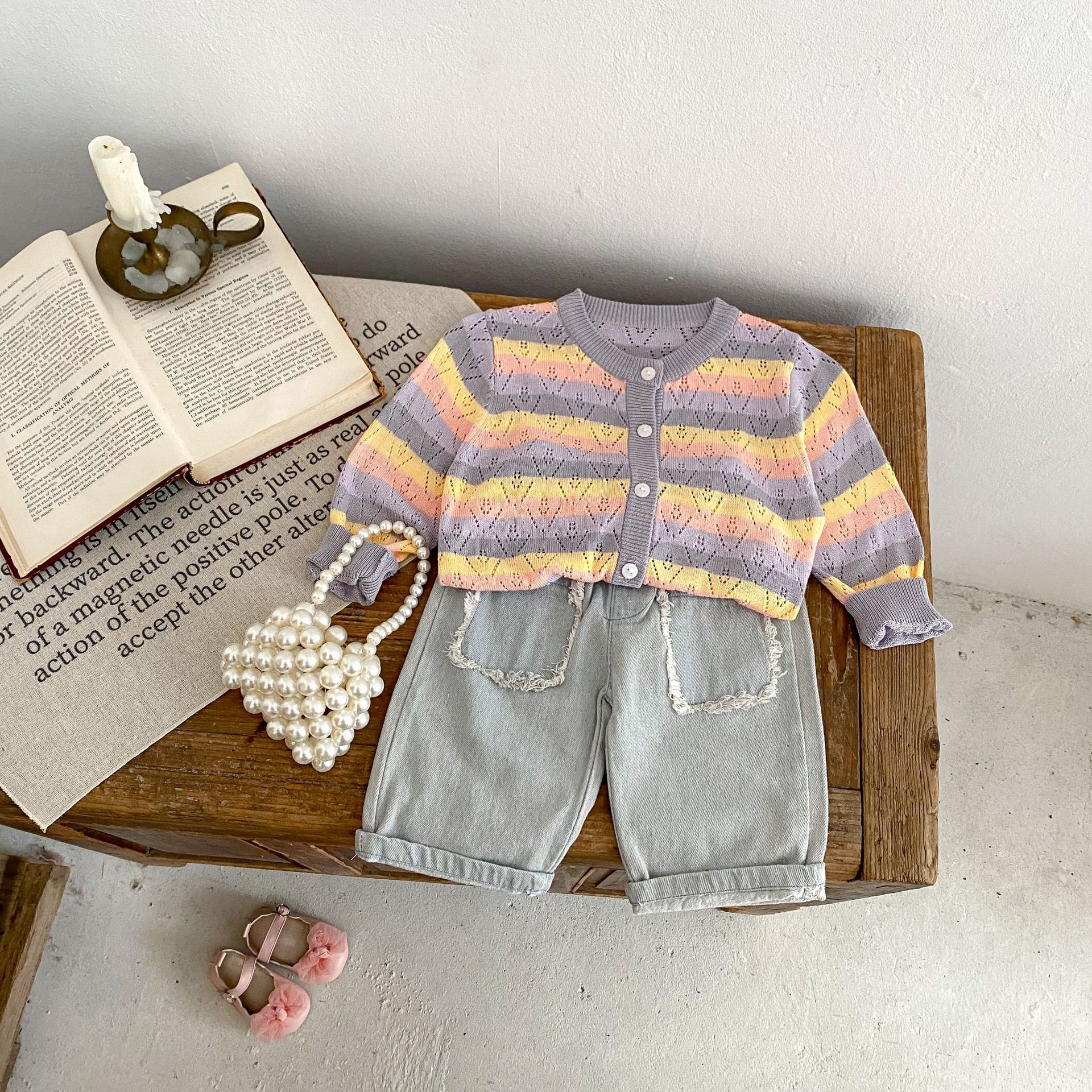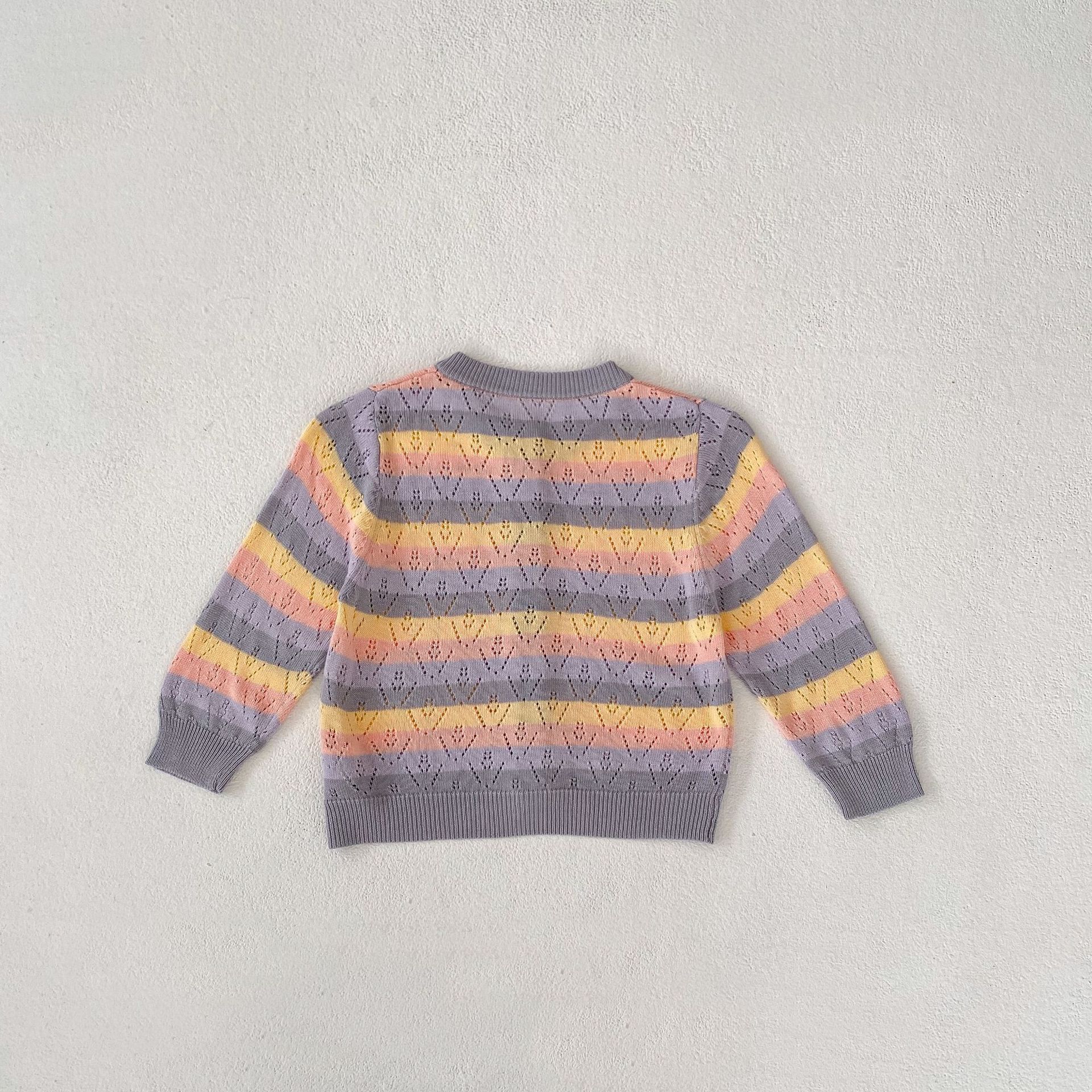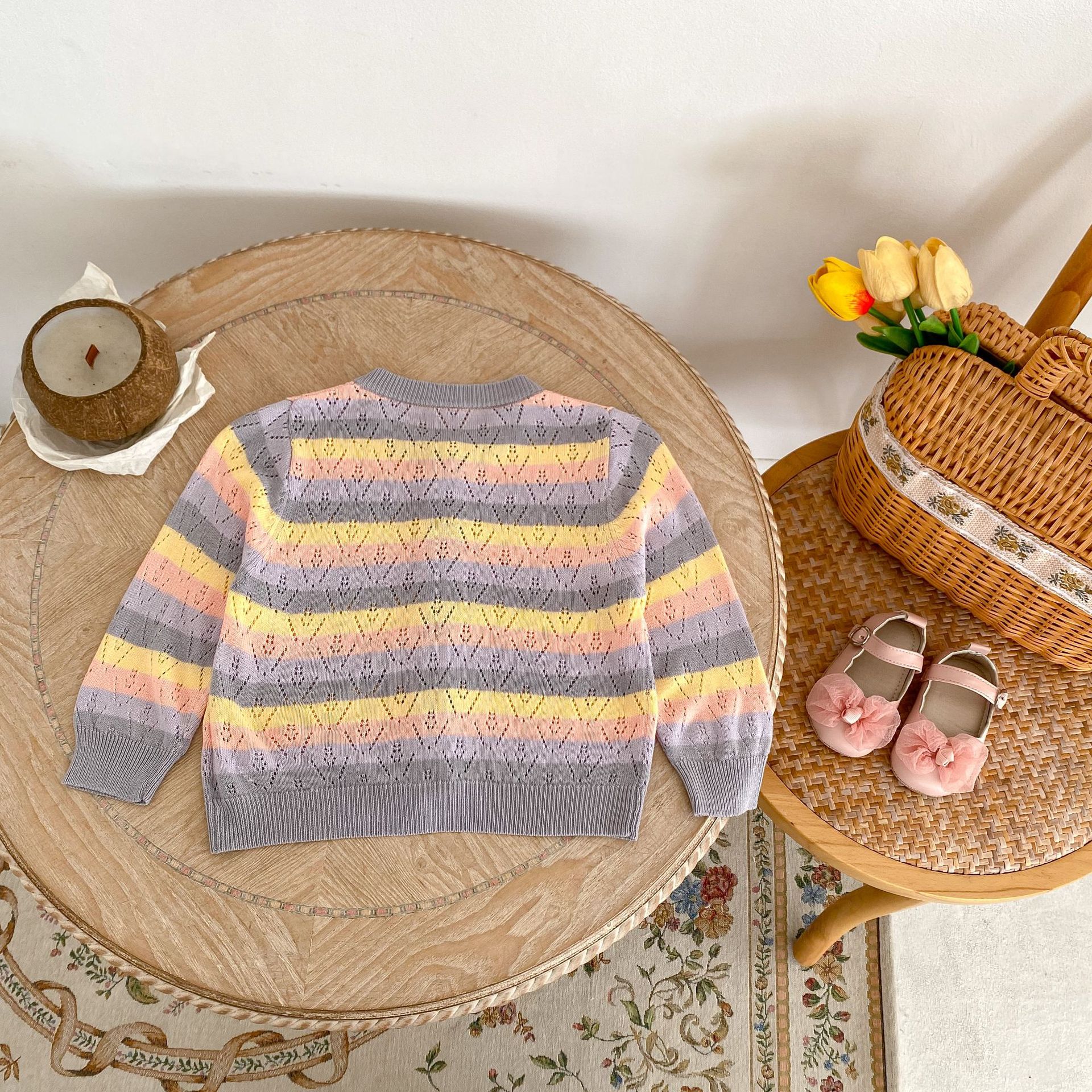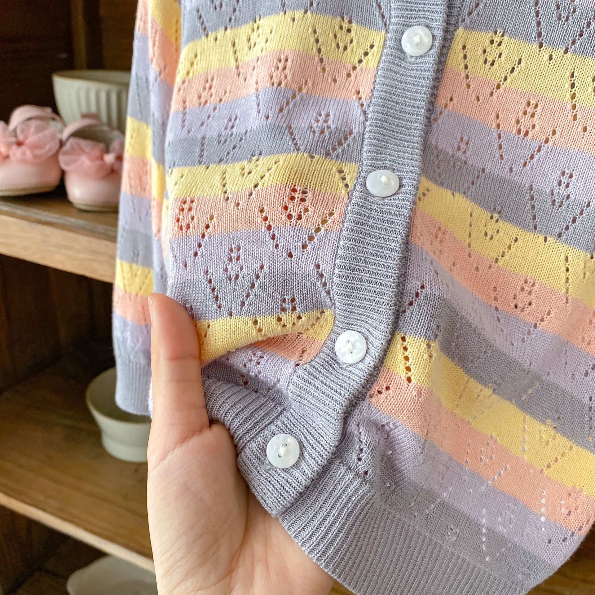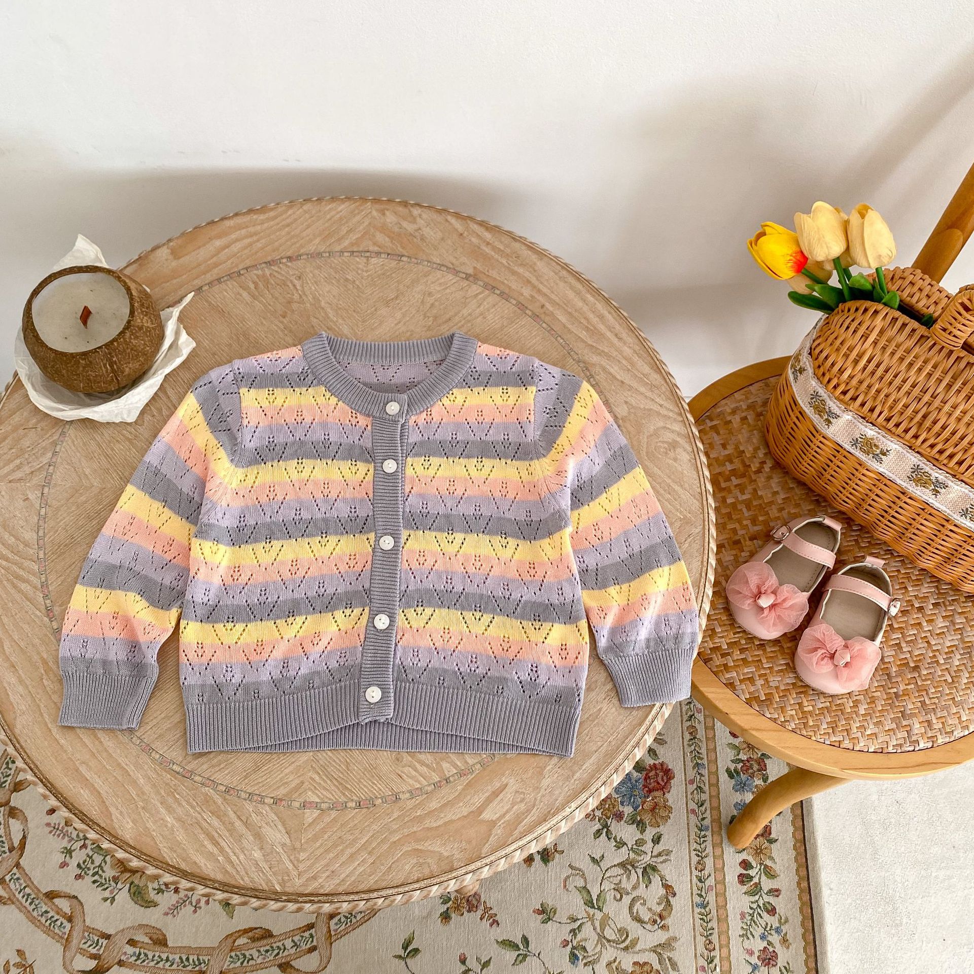 レインボーボーダーと涼しげなレースニットが魅力の、サマーカーディガンです。ベビーから男の子まで、夏の羽織りにぴったりのアイテム。