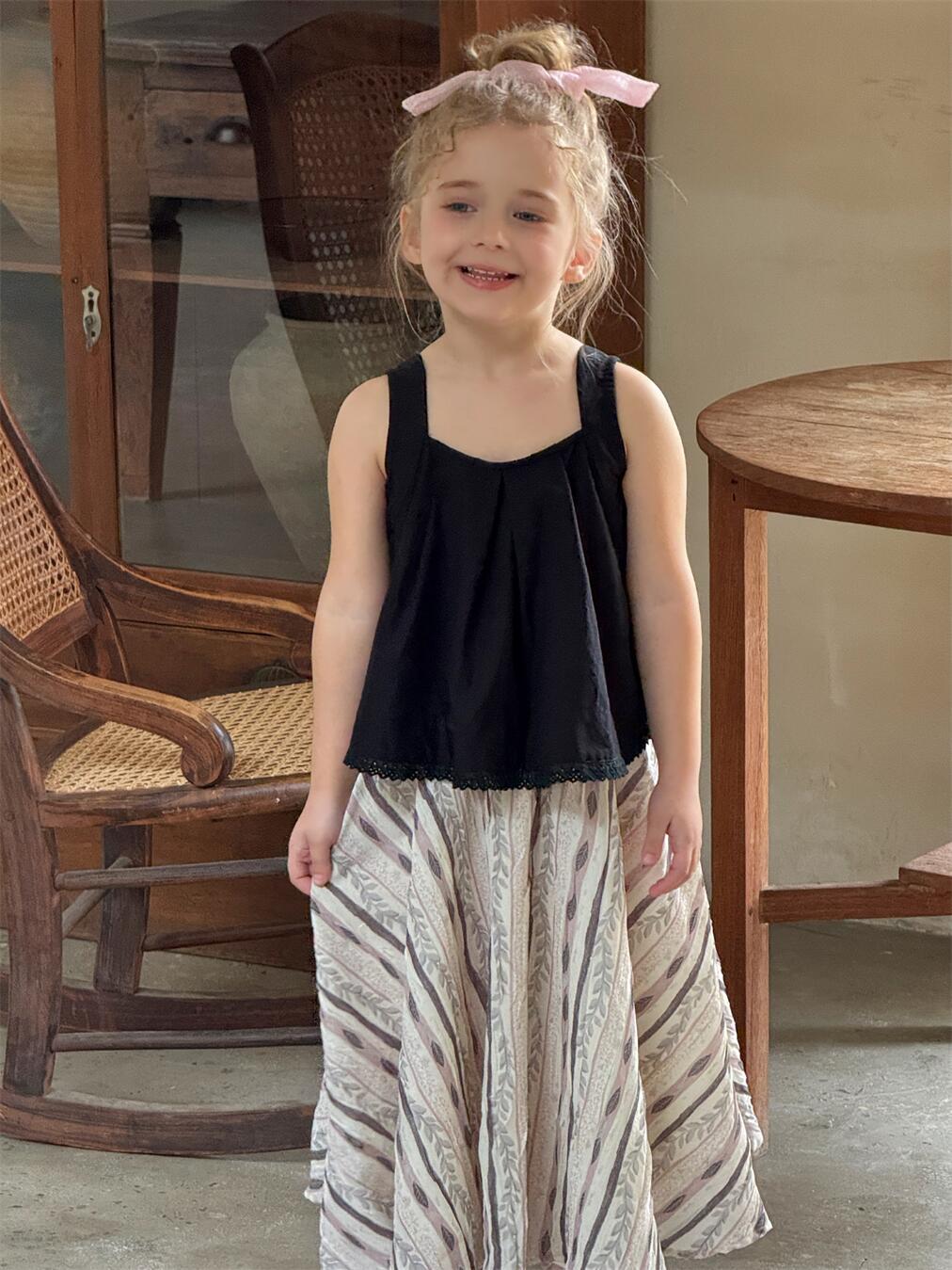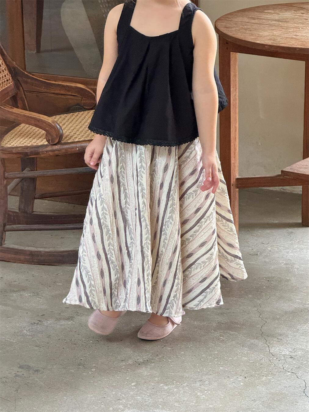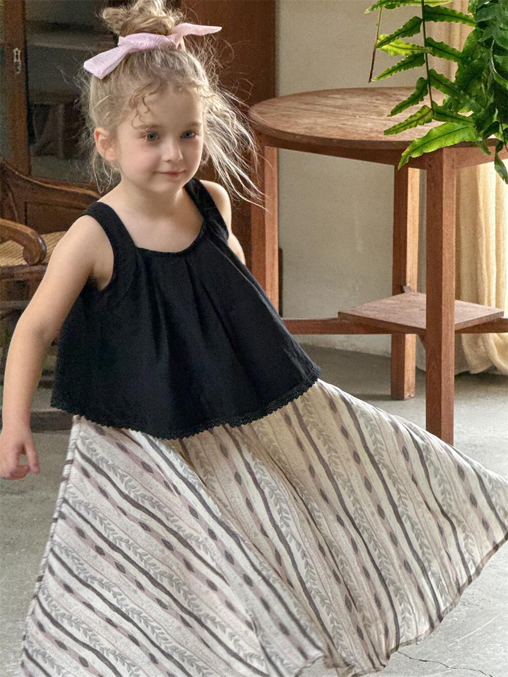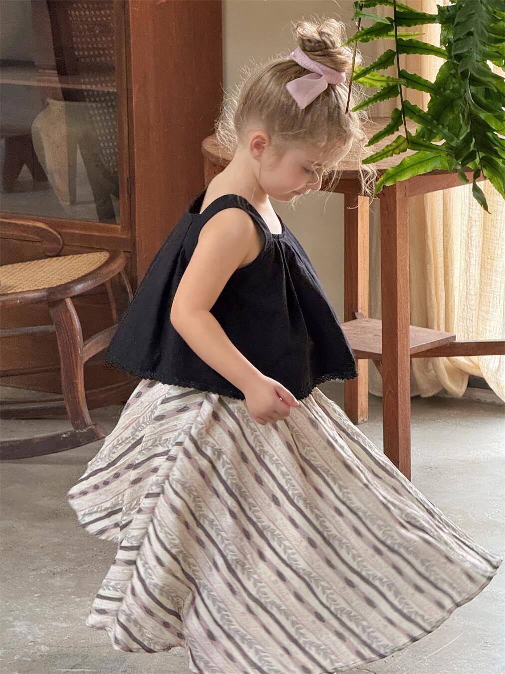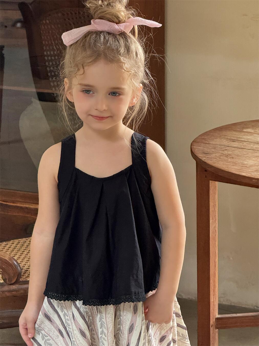 柔らかな素材で肌触りが良く、涼しげなノースリーブデザインなので、暑い夏でもお子さんが快適に過ごせます。裾にあしらわれた繊細なレースとタックが、シンプルながらも上品な雰囲気を演出します。キャミソールタイプなので、一枚でさらっと着ても、カーディガンやジャケットと合わせてもおしゃれ。夏の普段使いはもちろん、ちょっとしたお出かけにも大活躍する、着回し力の高いトップスです。