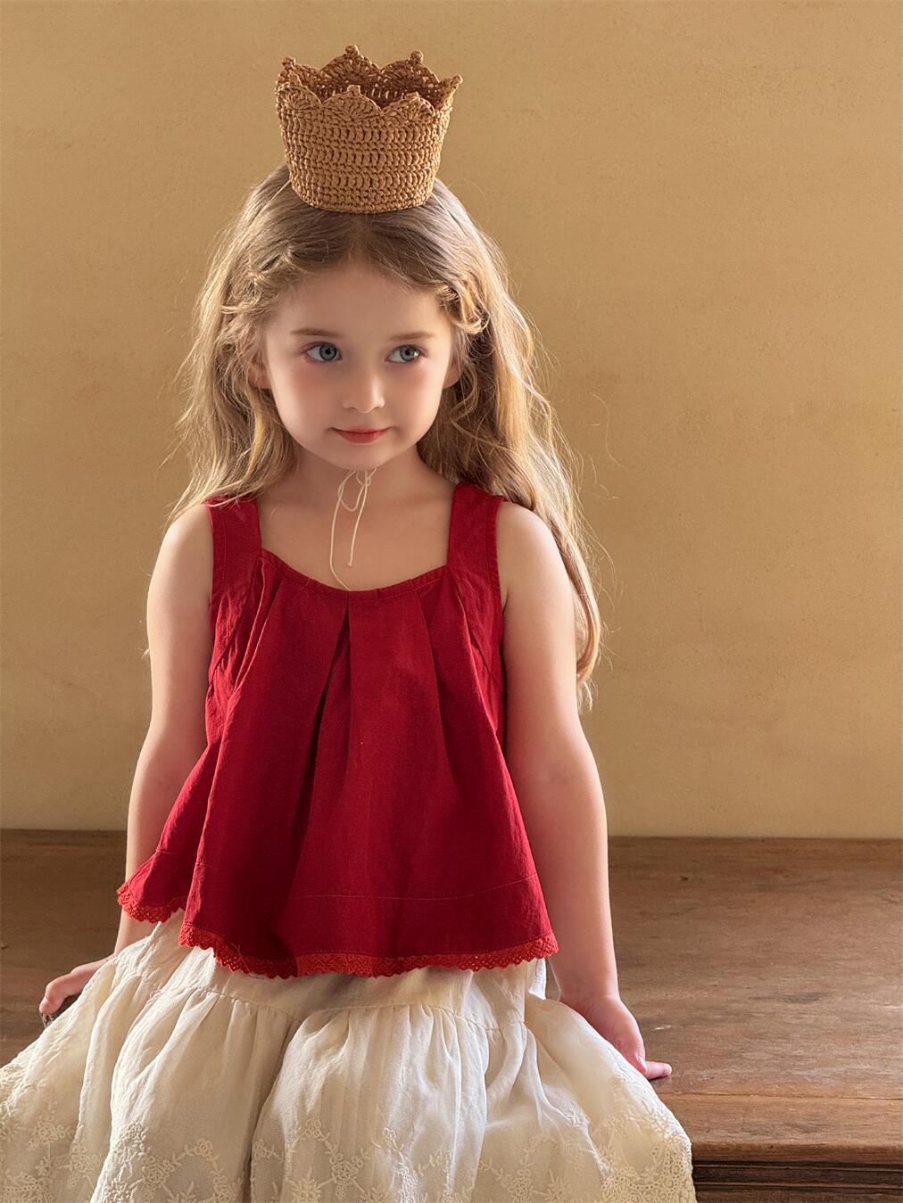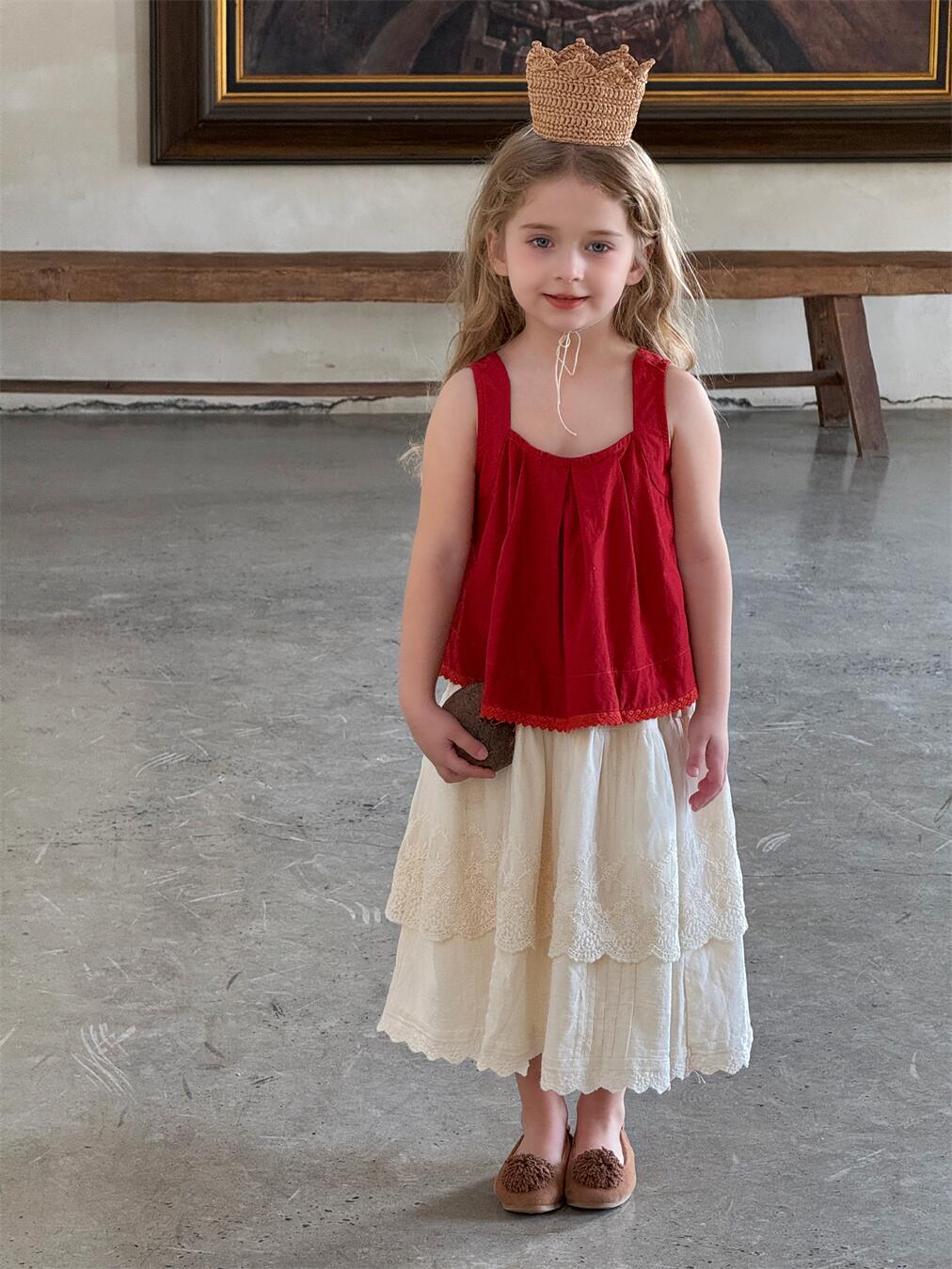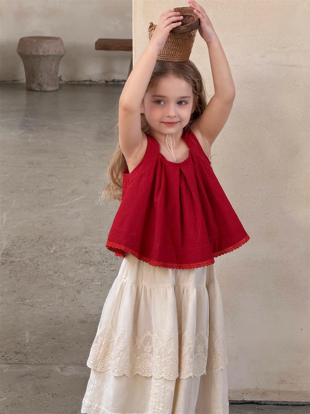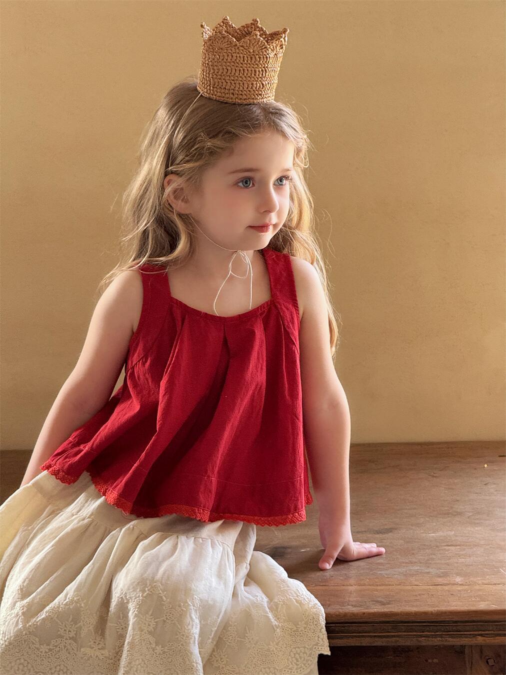 裾のレースとタックが可愛らしい、ノースリーブブラウスです。夏の女の子にぴったりの、鮮やかなレッドカラーが目を引く一枚。