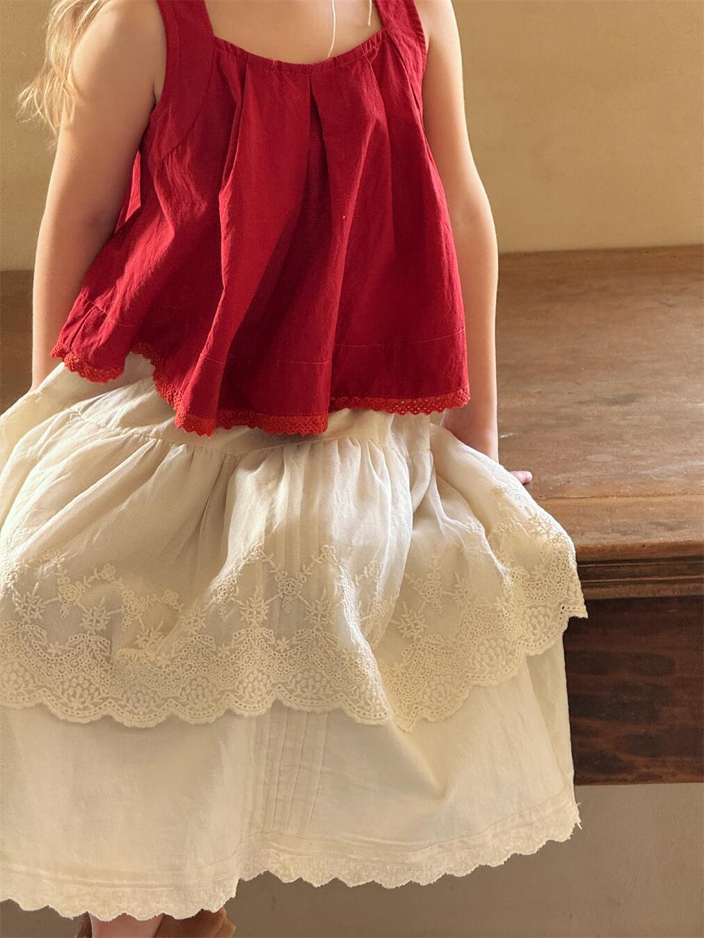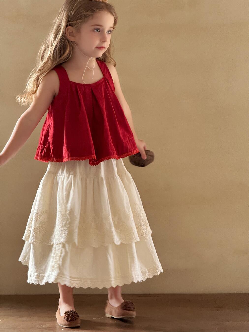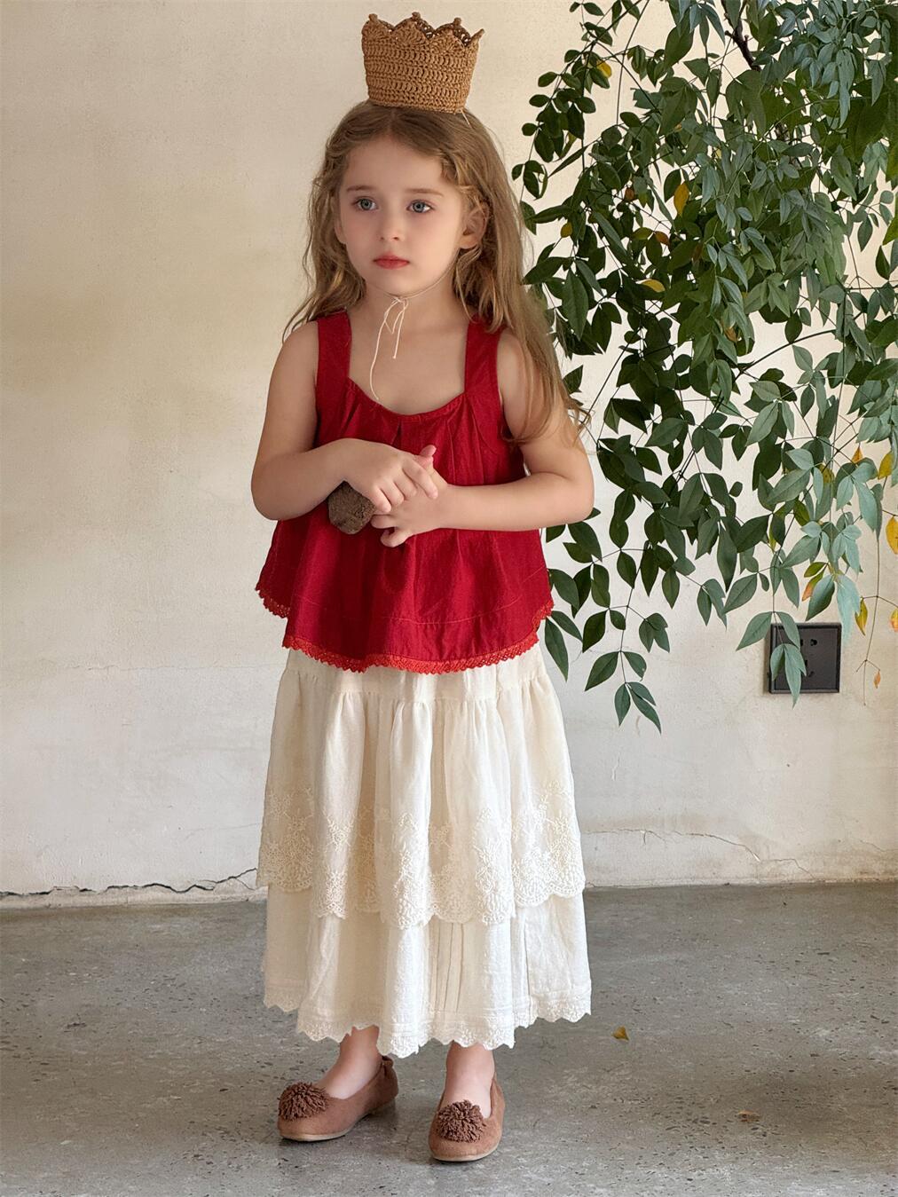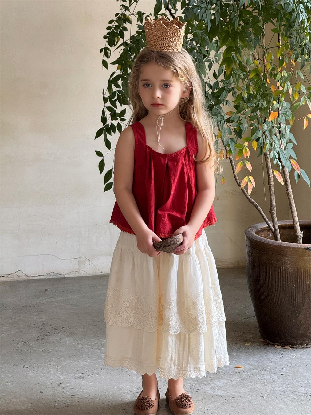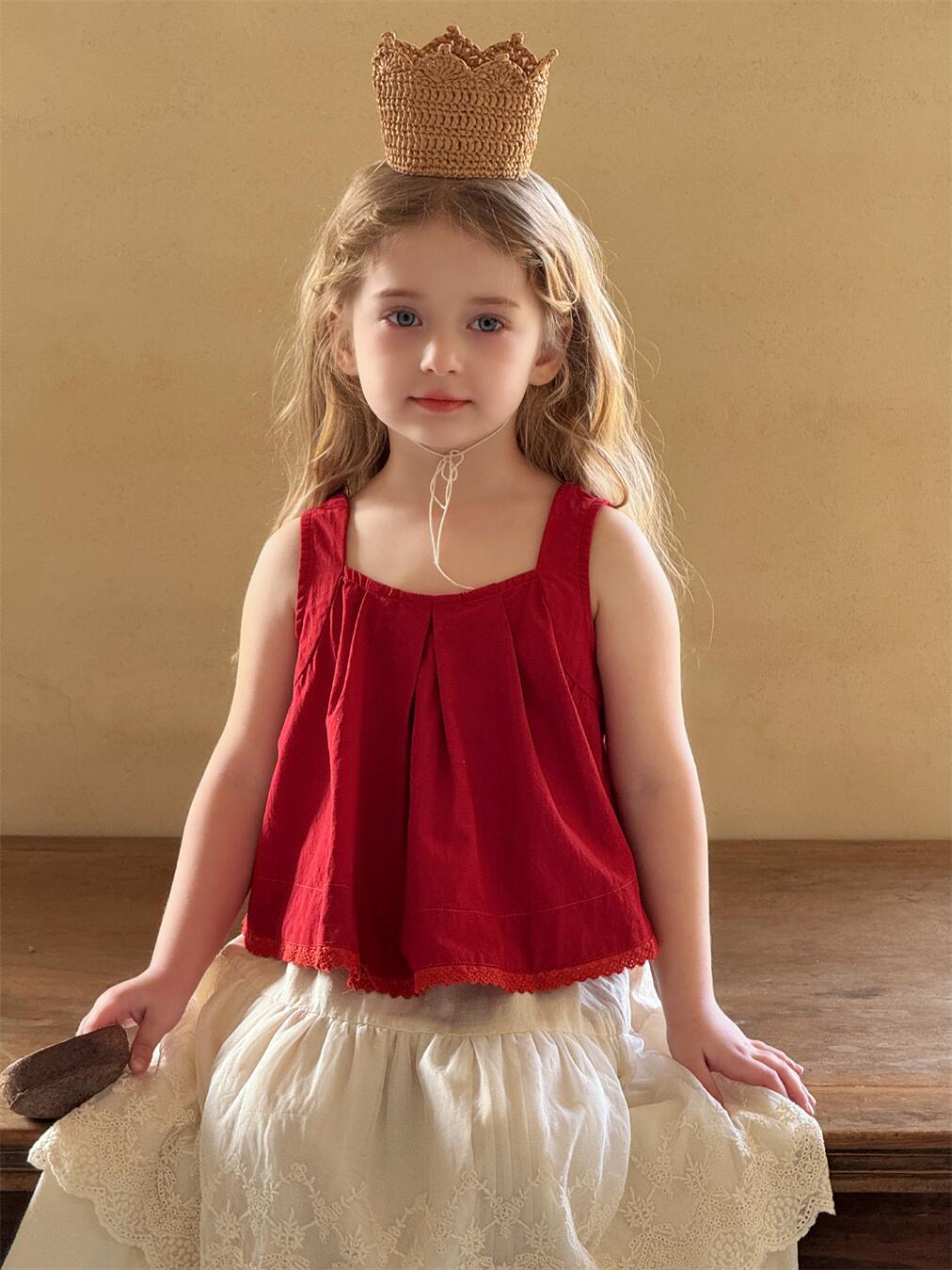 裾のレースとタックが可愛らしい、ノースリーブブラウスです。夏の女の子にぴったりの、鮮やかなレッドカラーが目を引く一枚。