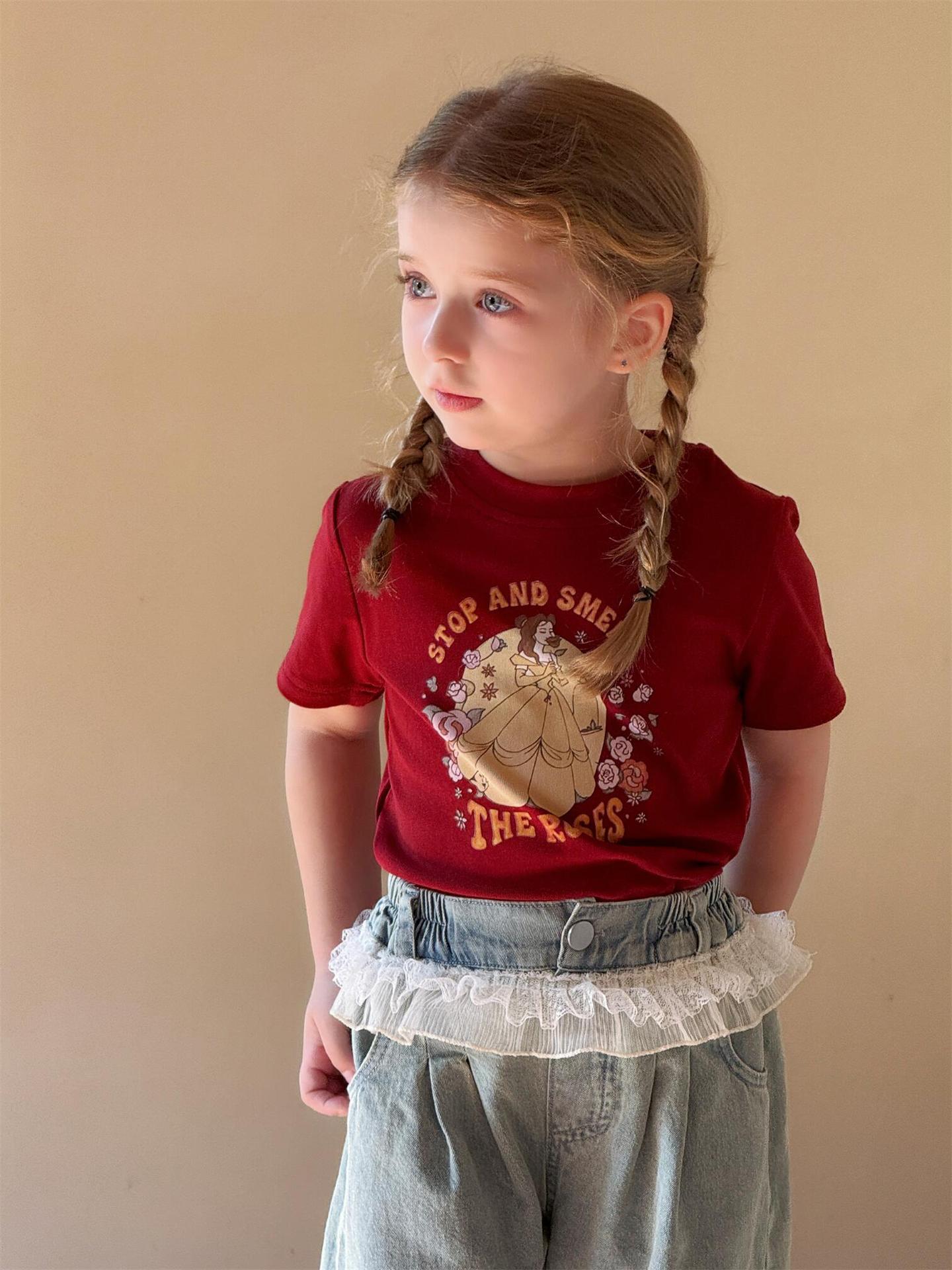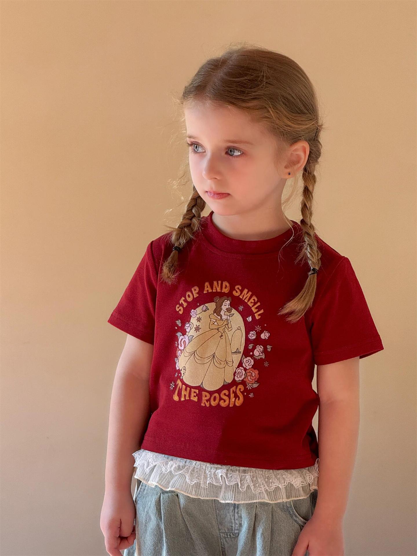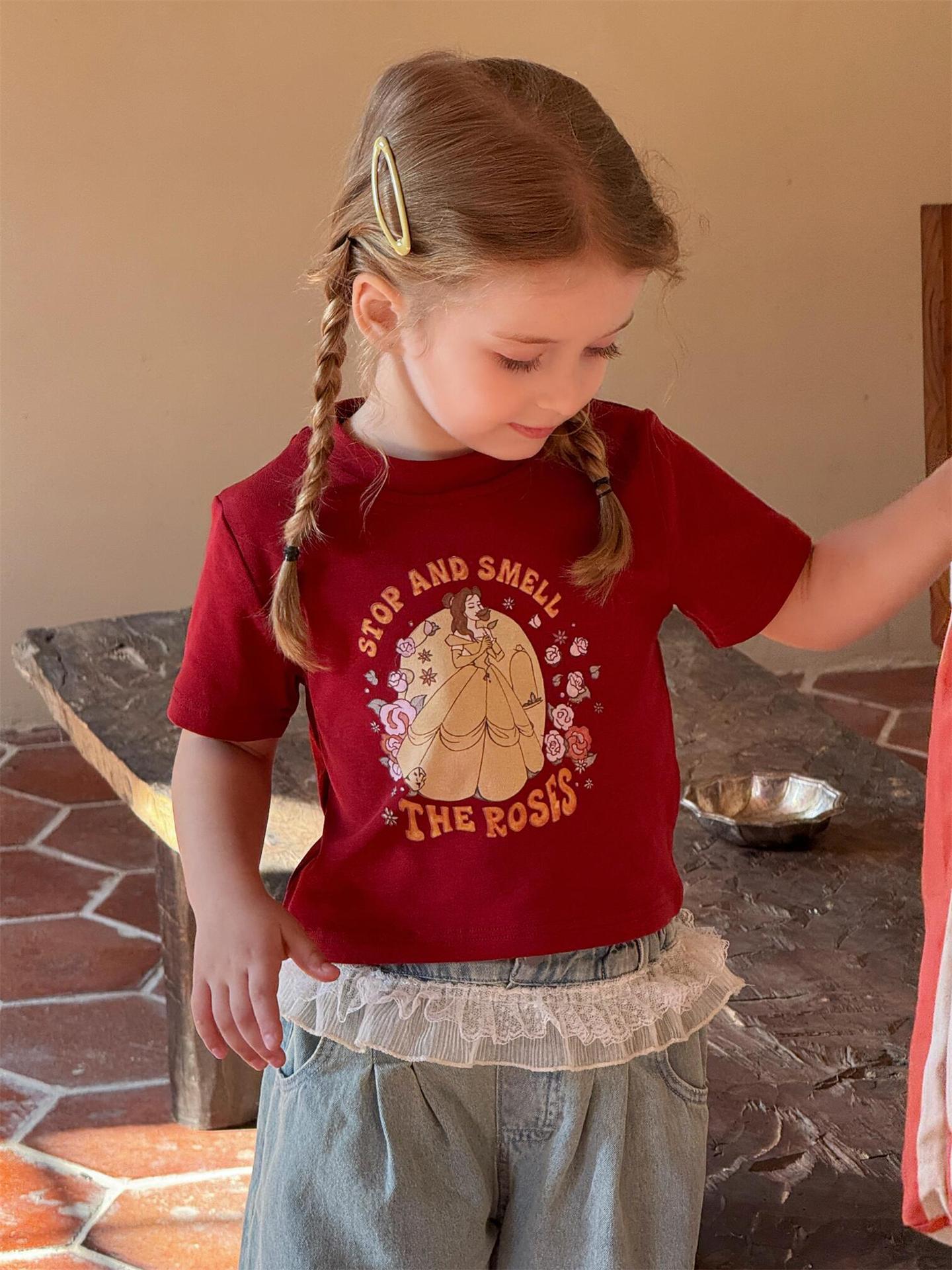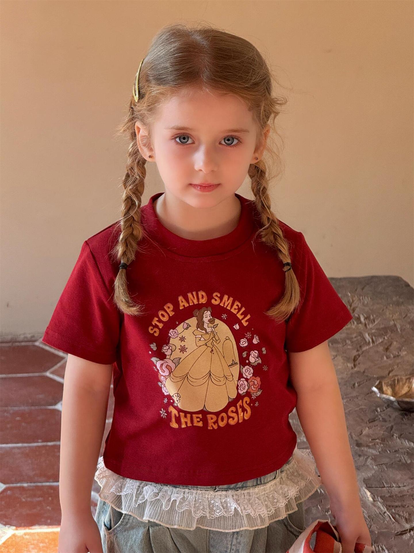 レトロで可愛いプリンセスプリント半袖Tシャツです。夏の女の子にぴったりの、カジュアルながらもキュートな一枚。柔らかなコットン素材で、暑い夏でも快適に過ごせます。クルーネックで着脱も簡単。カジュアルな普段使いはもちろん、ちょっとしたお出かけにも大活躍する、着回し力の高いトップスです。