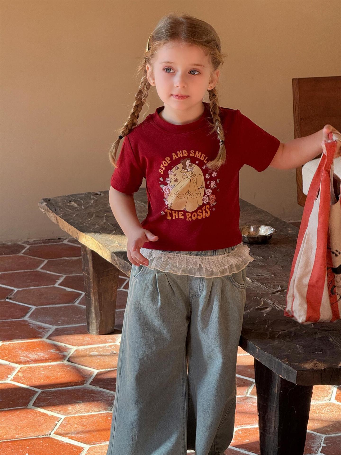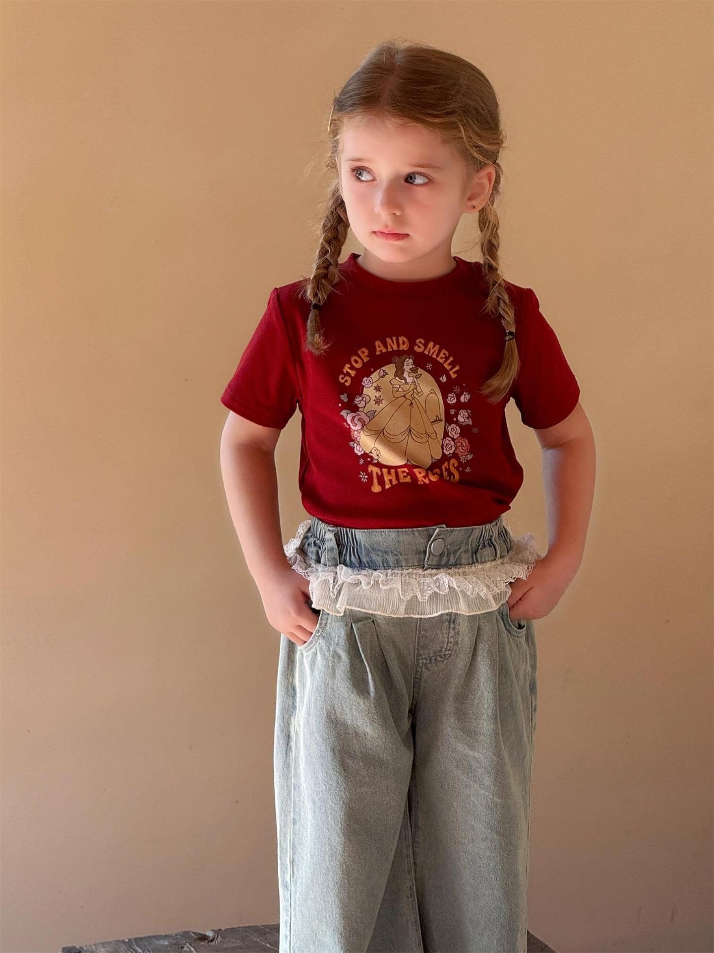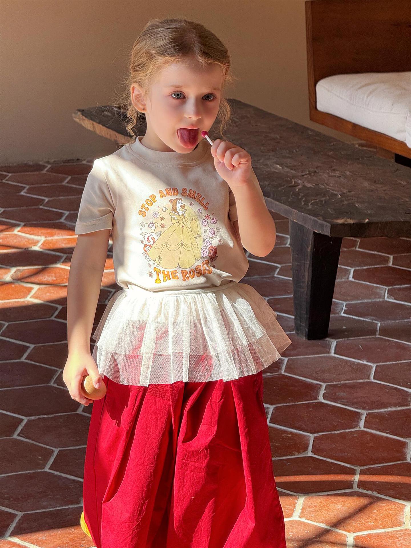 レトロで可愛いプリンセスプリント半袖Tシャツです。夏の女の子にぴったりの、カジュアルながらもキュートな一枚。柔らかなコットン素材で、暑い夏でも快適に過ごせます。クルーネックで着脱も簡単。カジュアルな普段使いはもちろん、ちょっとしたお出かけにも大活躍する、着回し力の高いトップスです。