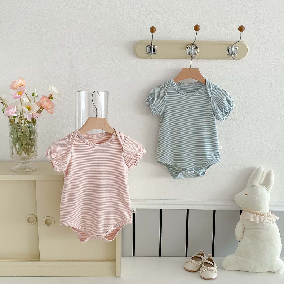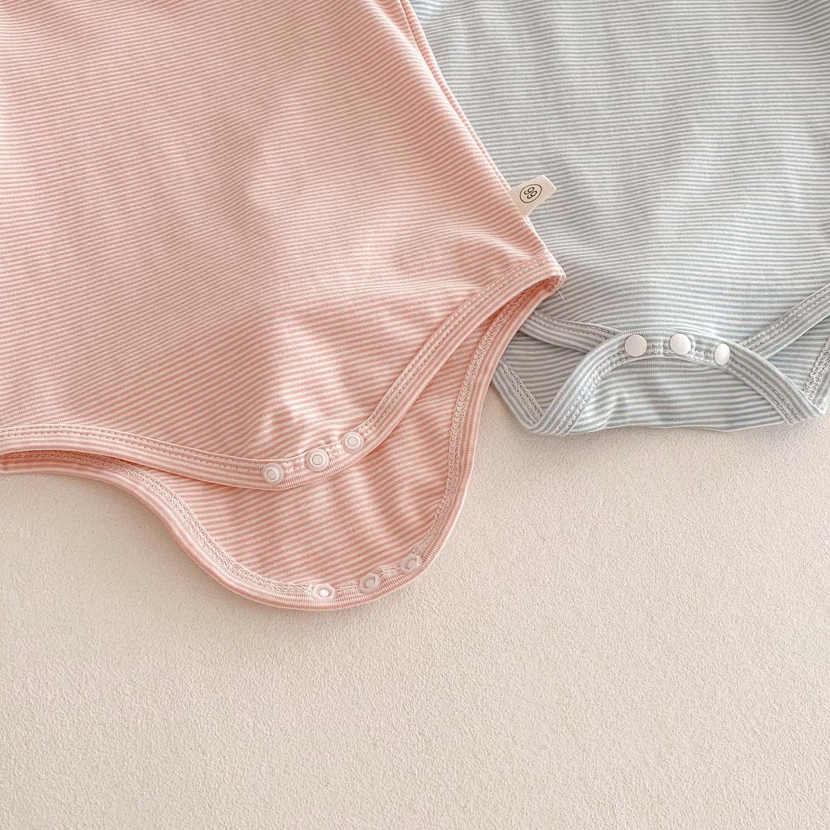 薄手で柔らかな生地なので、暑い夏でも赤ちゃんは快適に過ごせます。定番のボーダー柄に、襟元のぴょこんと飛び出すうさ耳がアクセントになっていて、とってもキュート。男の子にも女の子にも似合うデザインです。股下はスナップボタンで、おむつ替えもスムーズ。普段使いはもちろん、ちょっとしたお出かけにも活躍するでしょう。