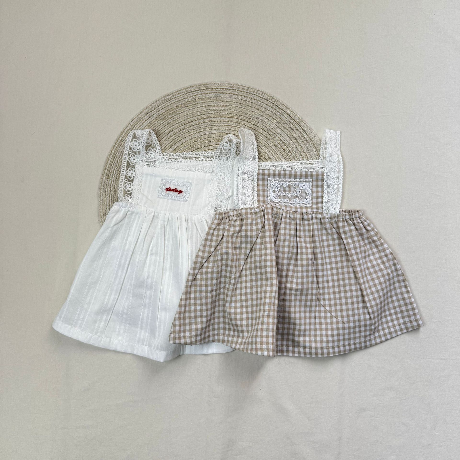 肩のストラップ部分にあしらわれた繊細なレースが特徴で、ベビーちゃんをより一層可愛らしく見せてくれます。爽やかなチェック柄と着回ししやすい無地の2種類があり、どちらもインナー次第で様々なコーディネートを楽しめます。ギャザーが施されたプリーツスカートはふんわりとしたシルエットで、普段使いはもちろん、ちょっとしたお出かけにもぴったり。重ね着でオールシーズン活躍する万能アイテムです。