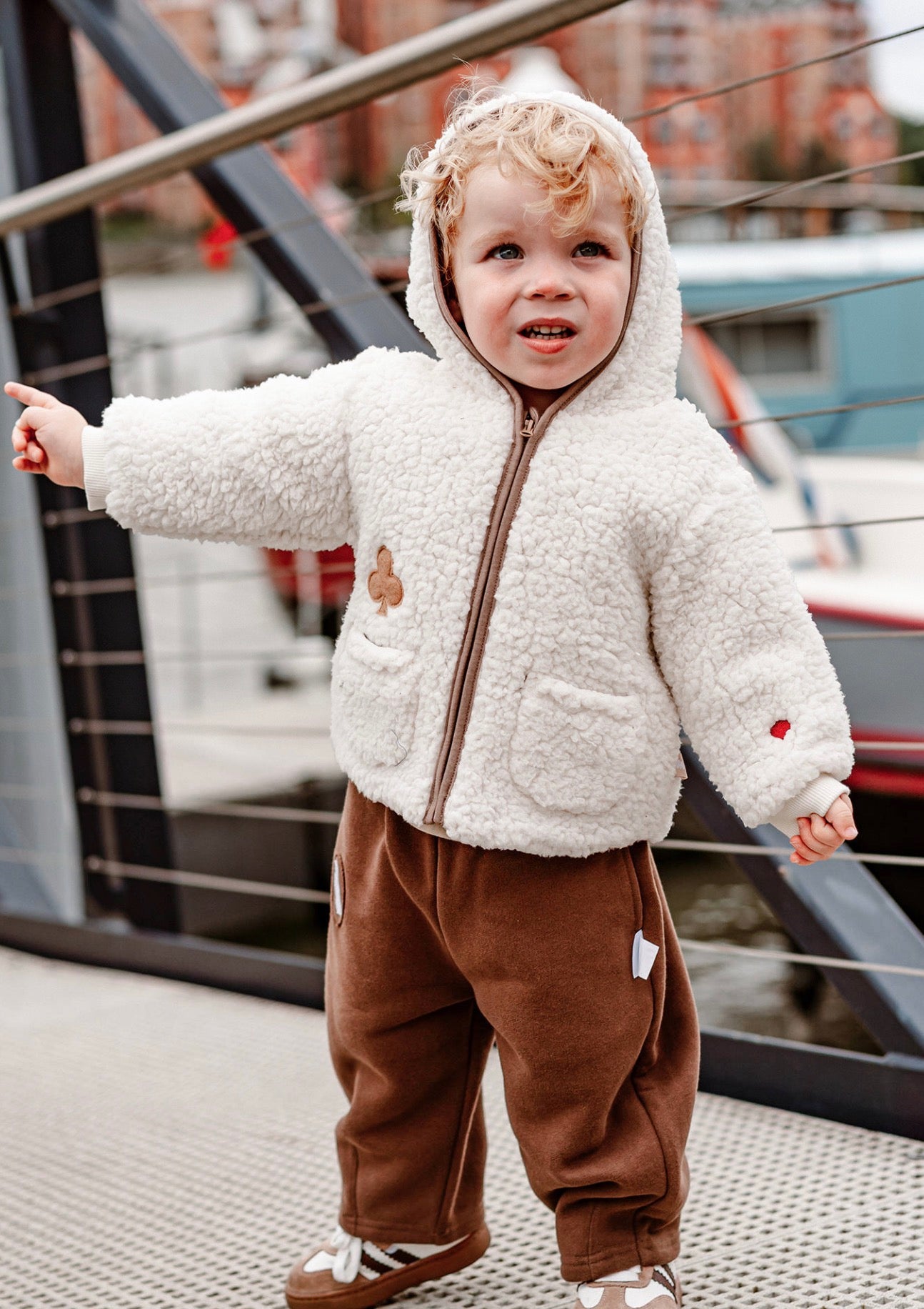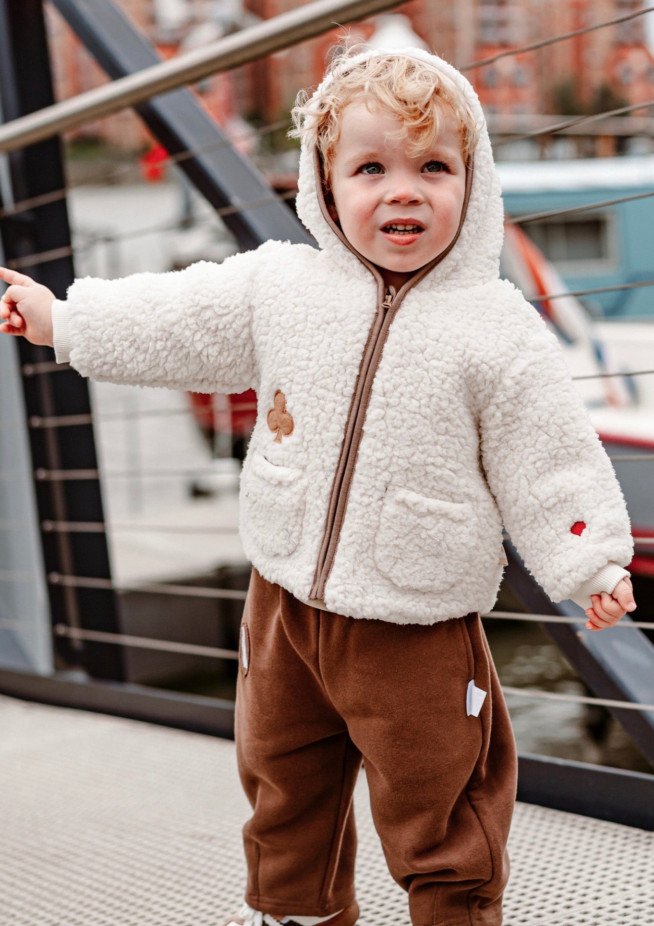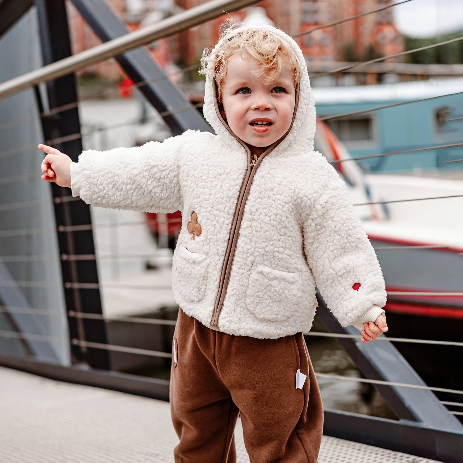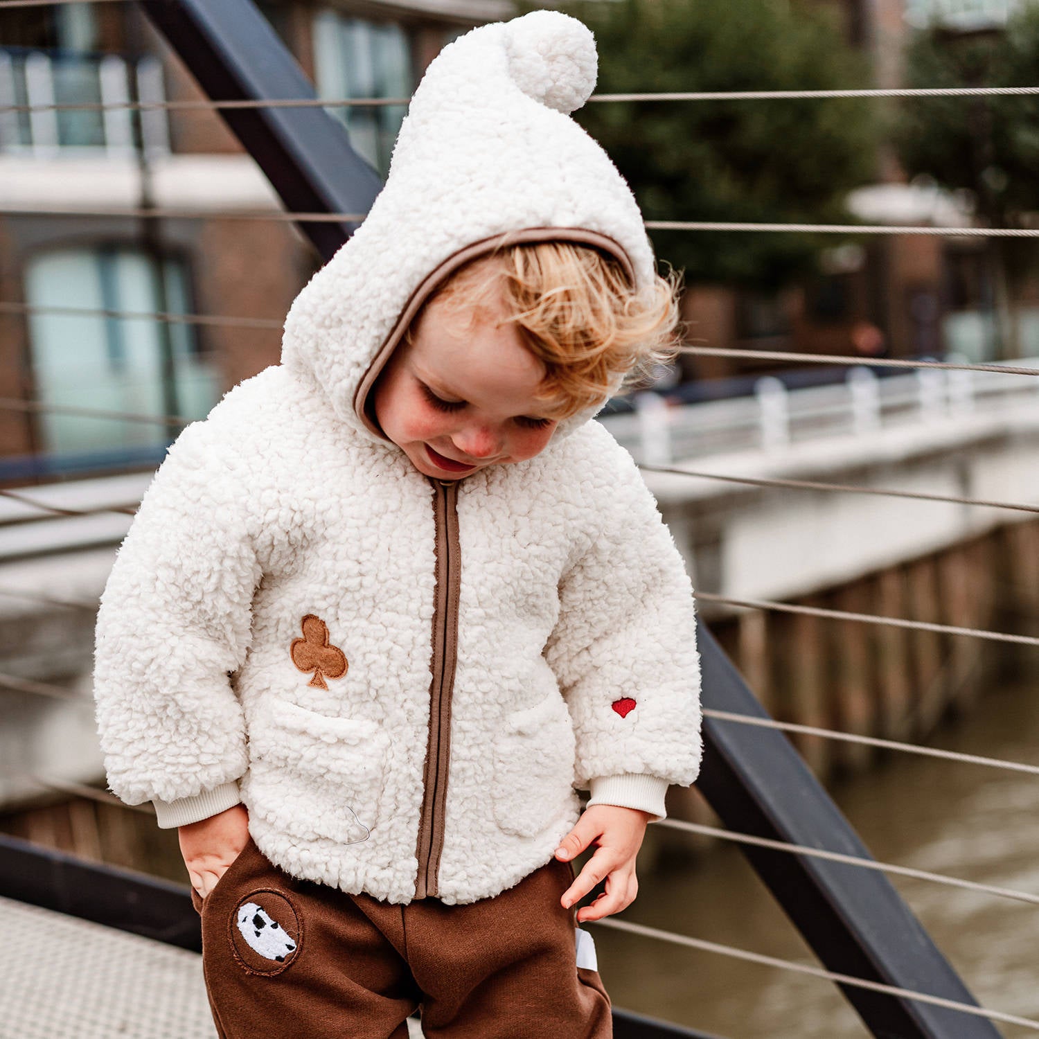 ポンポン付きのフードが遊び心を添えるボア素材のジャケットは、寒い日のおしゃれを楽しむためのアウターです。もこもことした質感が愛らしいこのジップアップは、北欧テイストを感じさせる洗練されたデザインが魅力。厚手の生地がベビーをしっかりと暖め、カジュアルな装いをセンス良く仕上げるトップスとして活躍します。