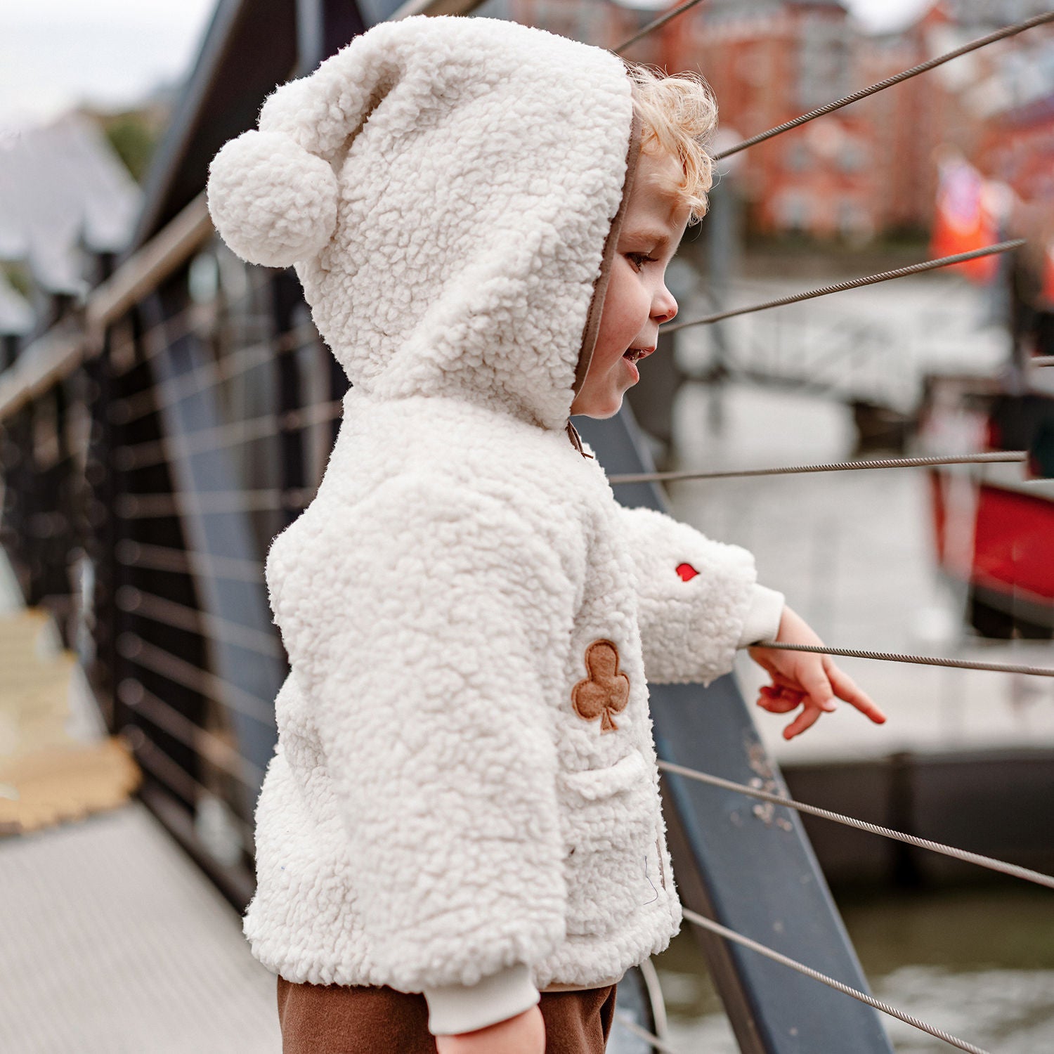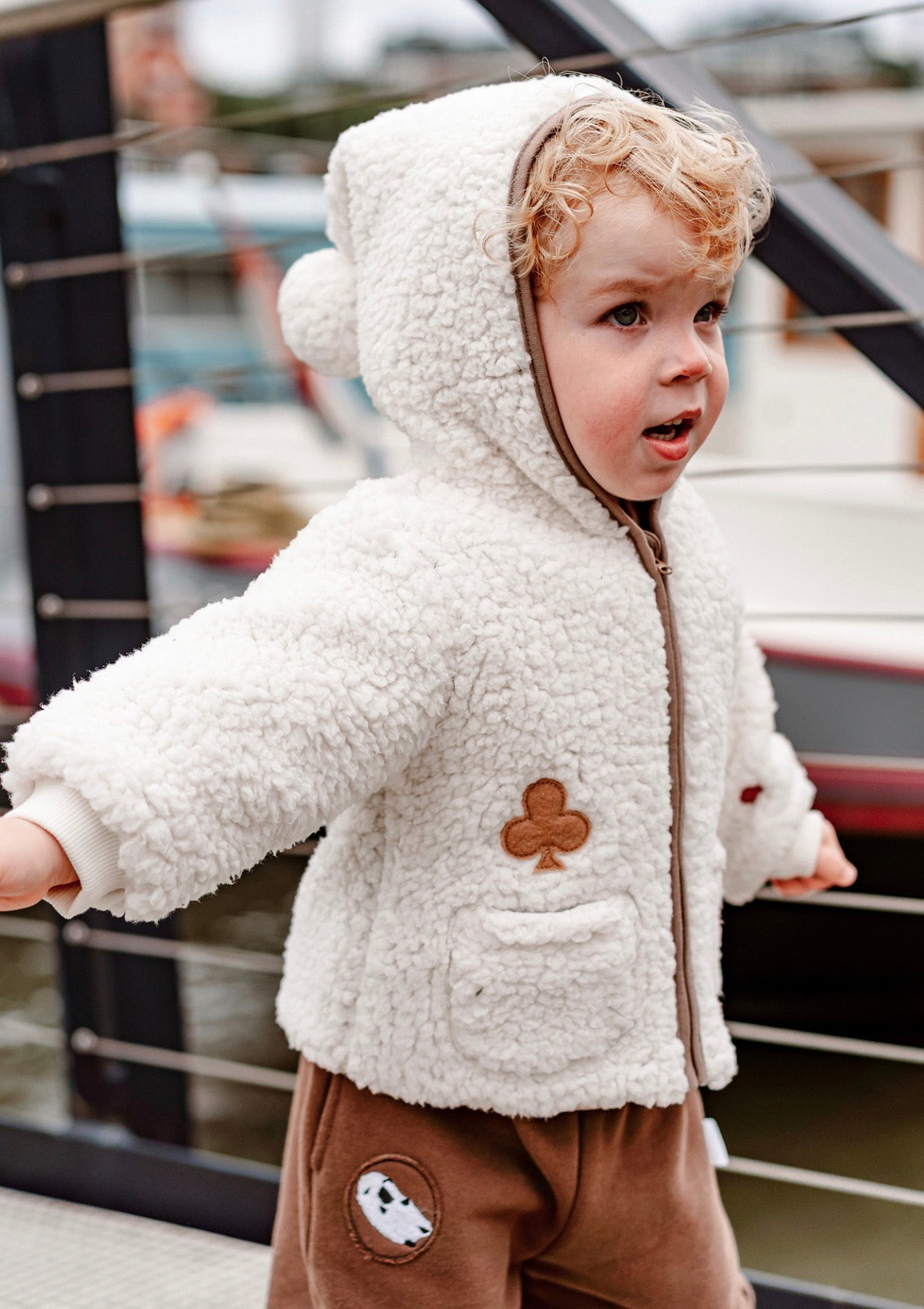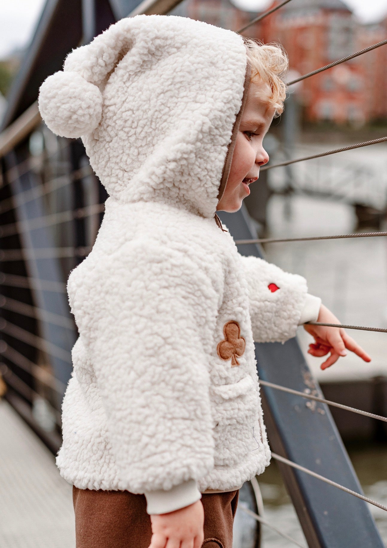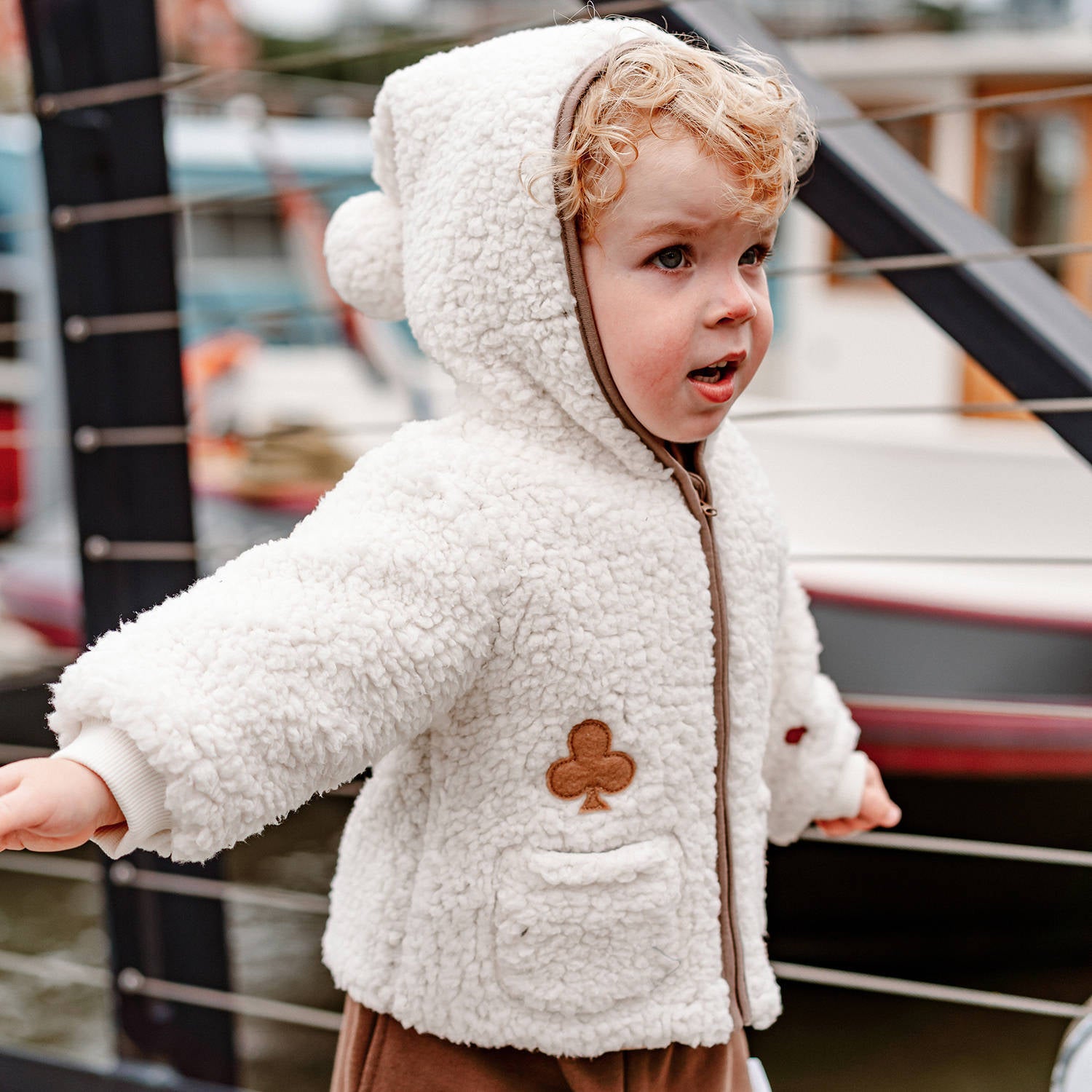 ポンポン付きのフードが遊び心を添えるボア素材のジャケットは、寒い日のおしゃれを楽しむためのアウターです。もこもことした質感が愛らしいこのジップアップは、北欧テイストを感じさせる洗練されたデザインが魅力。厚手の生地がベビーをしっかりと暖め、カジュアルな装いをセンス良く仕上げるトップスとして活躍します。