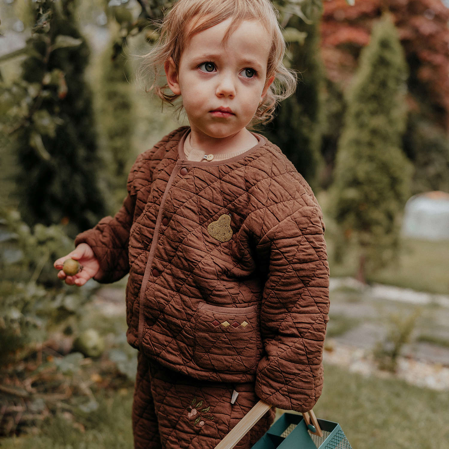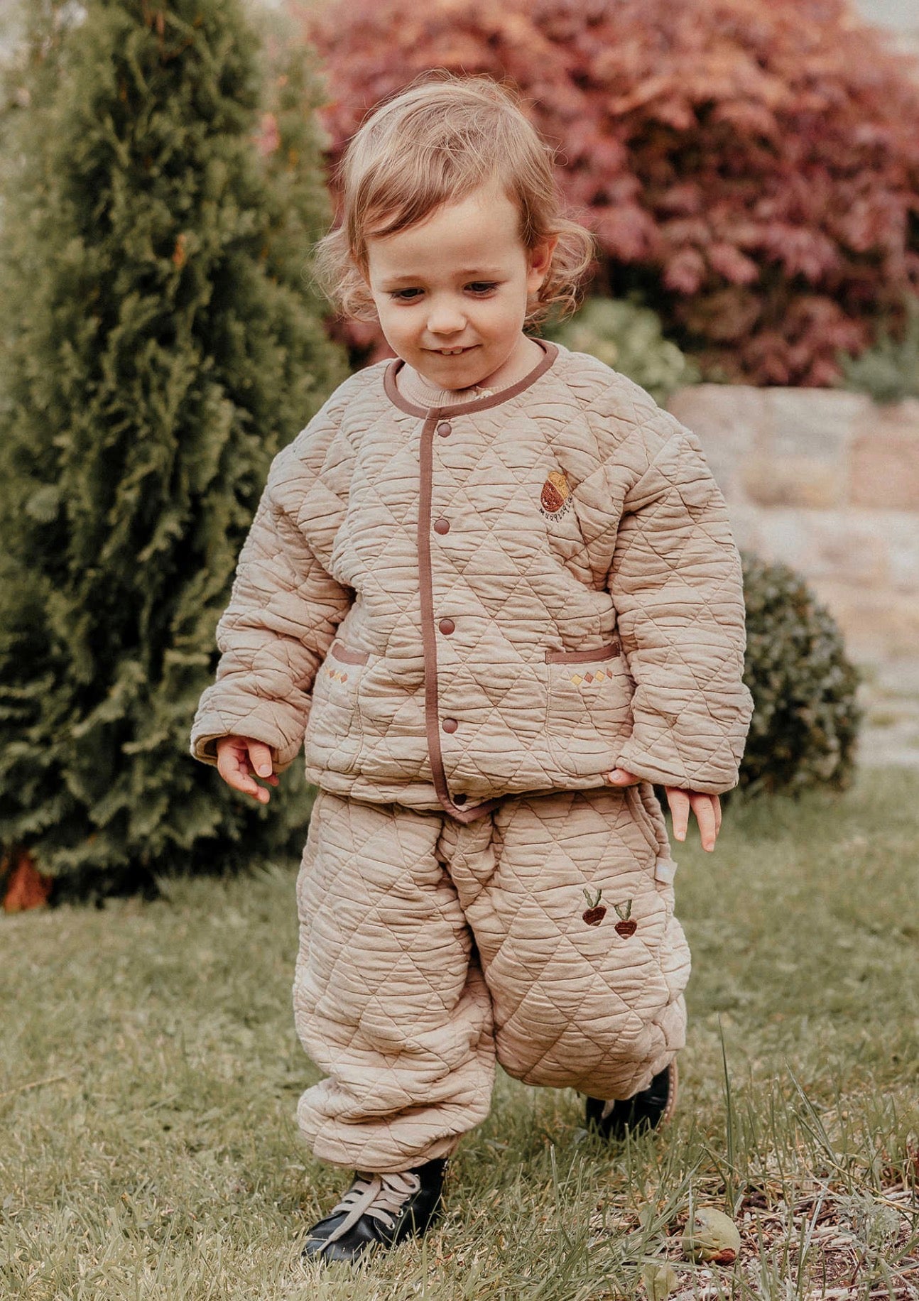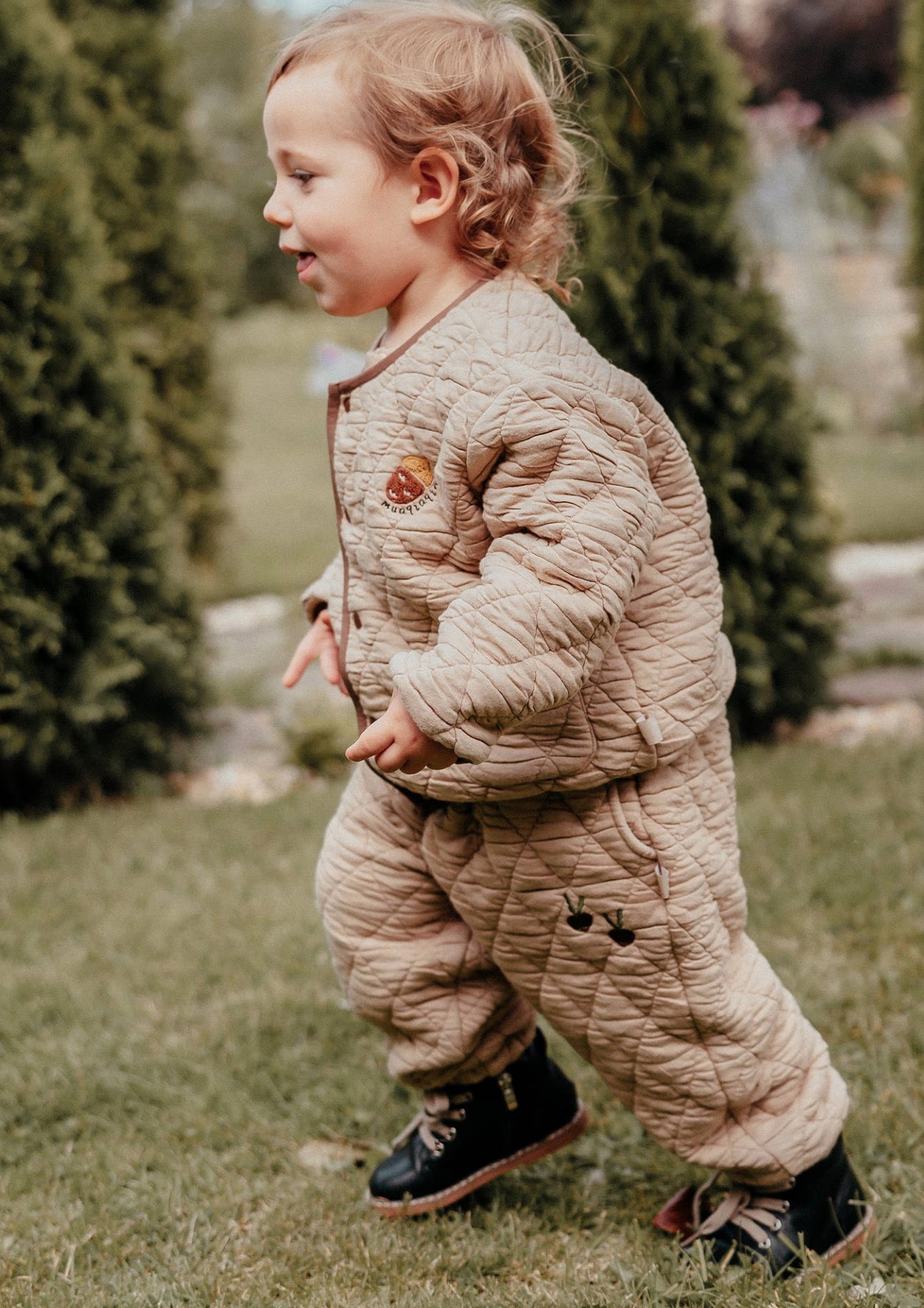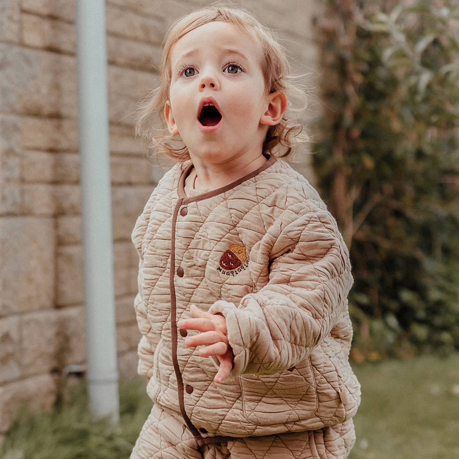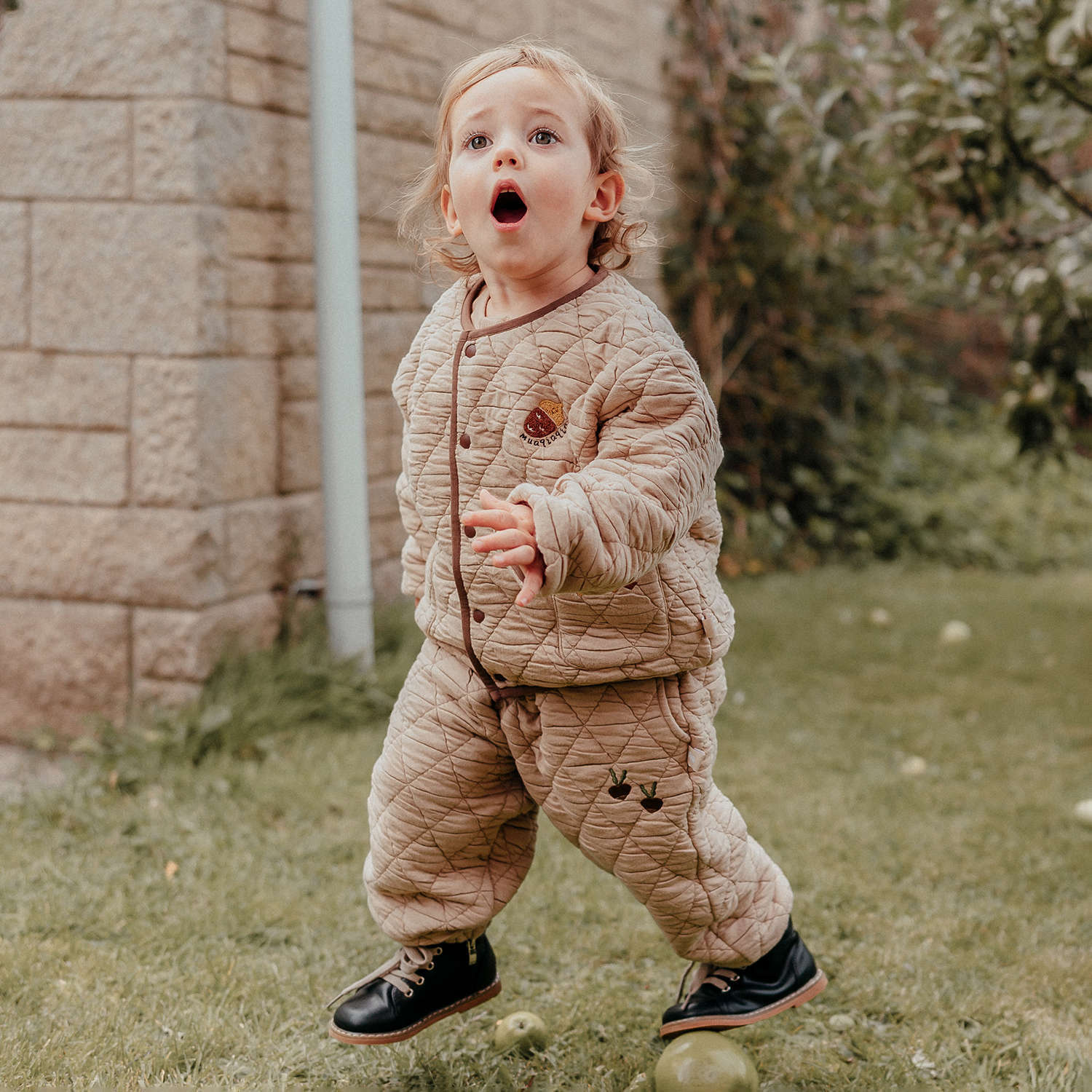 キルティングデザインにパイピングを効かせた長袖ジャケットは、洗練された印象を与えるアウターです。裏起毛素材を使用しているため、しっかりと暖かく、寒い日のお出かけに最適なブルゾン。シンプルで上品なトップスは、どんなコーディネートにも馴染みやすく、カジュアルでありながらもおしゃれなスタイルを完成させるベビー服です。