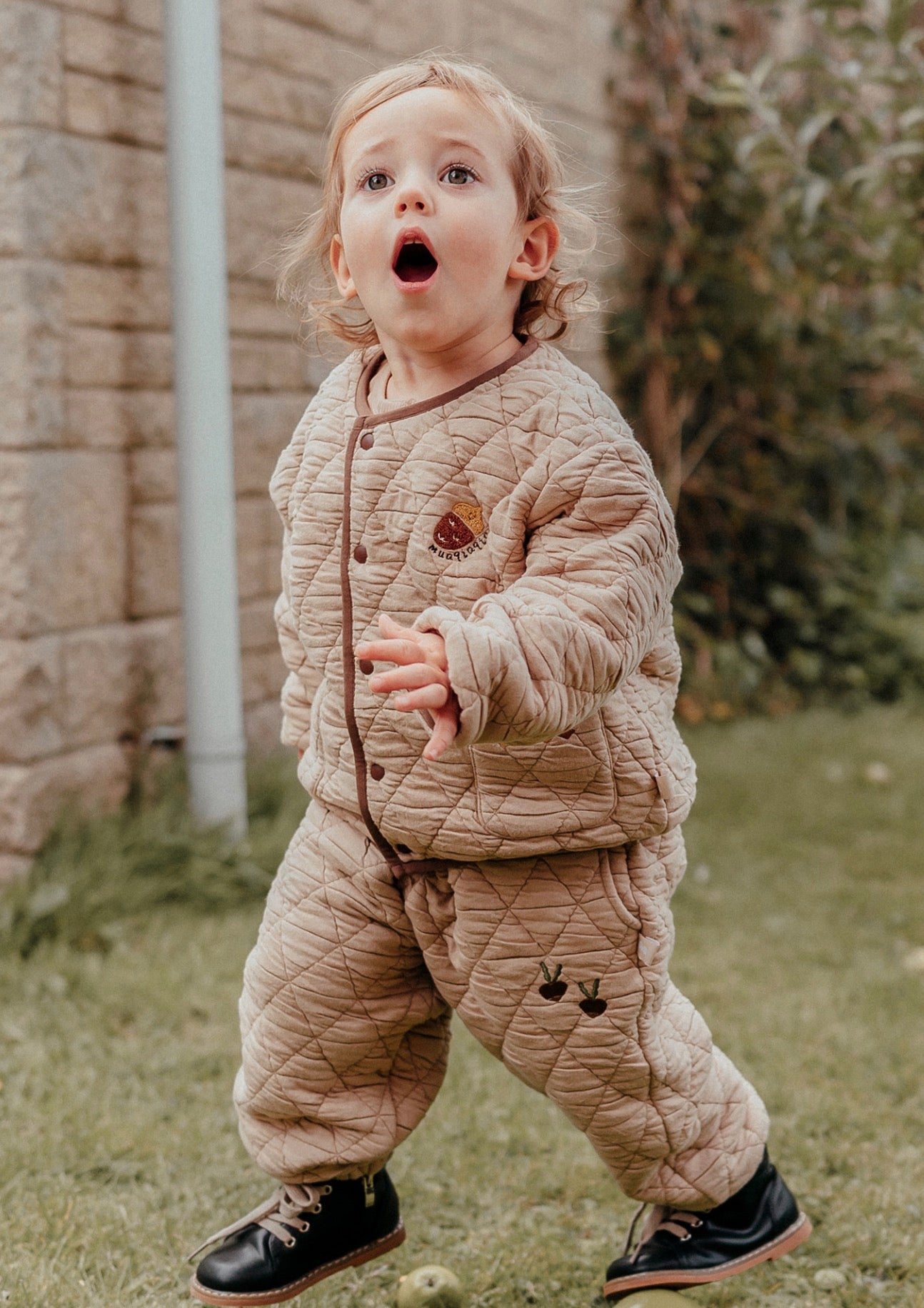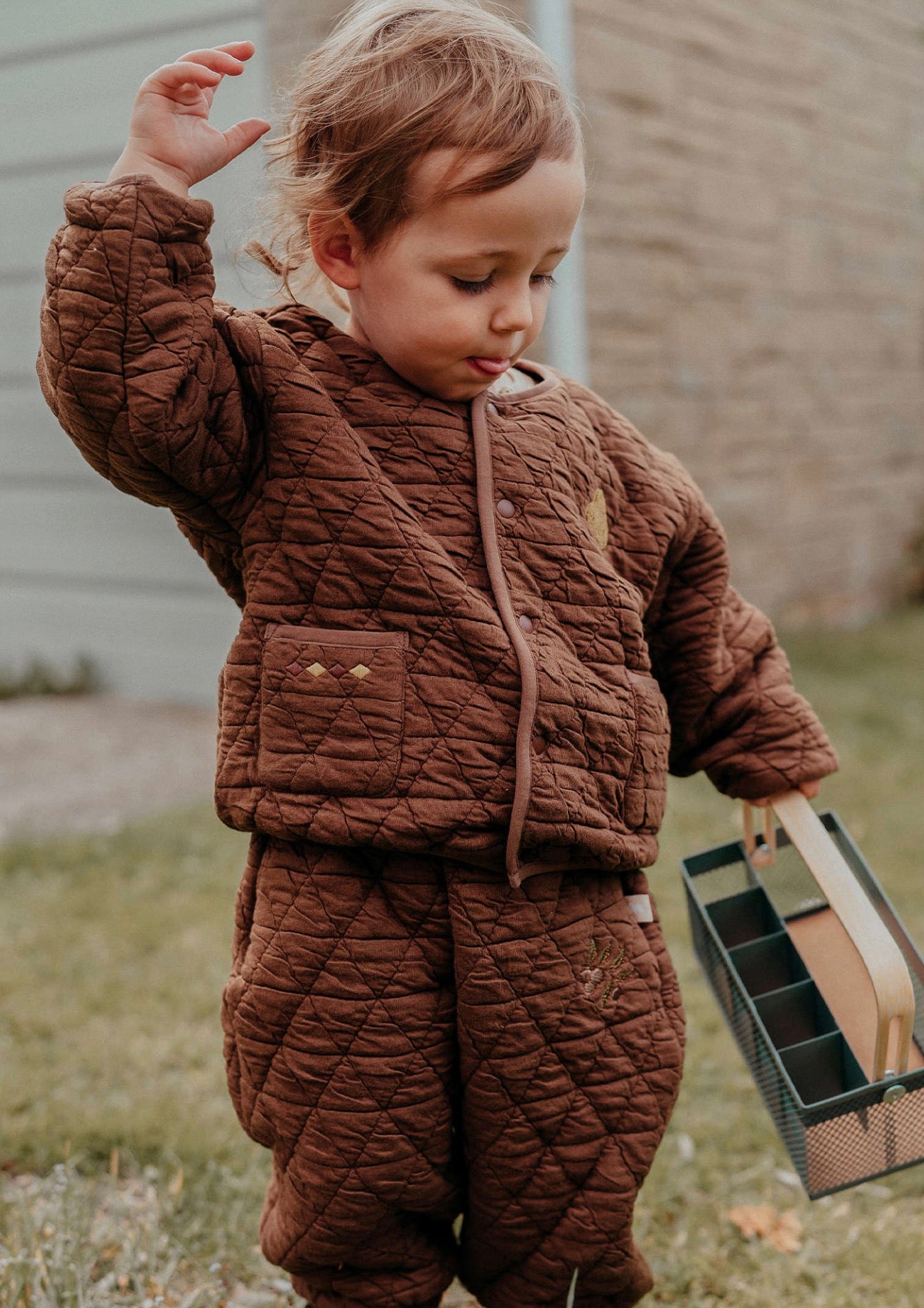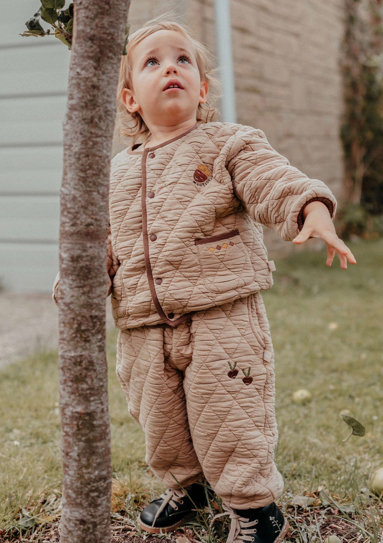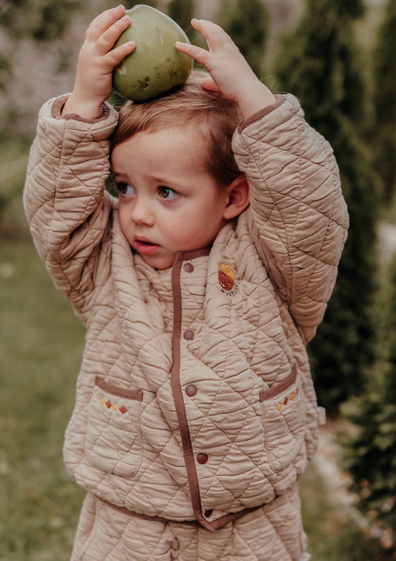 キルティングデザインにパイピングを効かせた長袖ジャケットは、洗練された印象を与えるアウターです。裏起毛素材を使用しているため、しっかりと暖かく、寒い日のお出かけに最適なブルゾン。シンプルで上品なトップスは、どんなコーディネートにも馴染みやすく、カジュアルでありながらもおしゃれなスタイルを完成させるベビー服です。