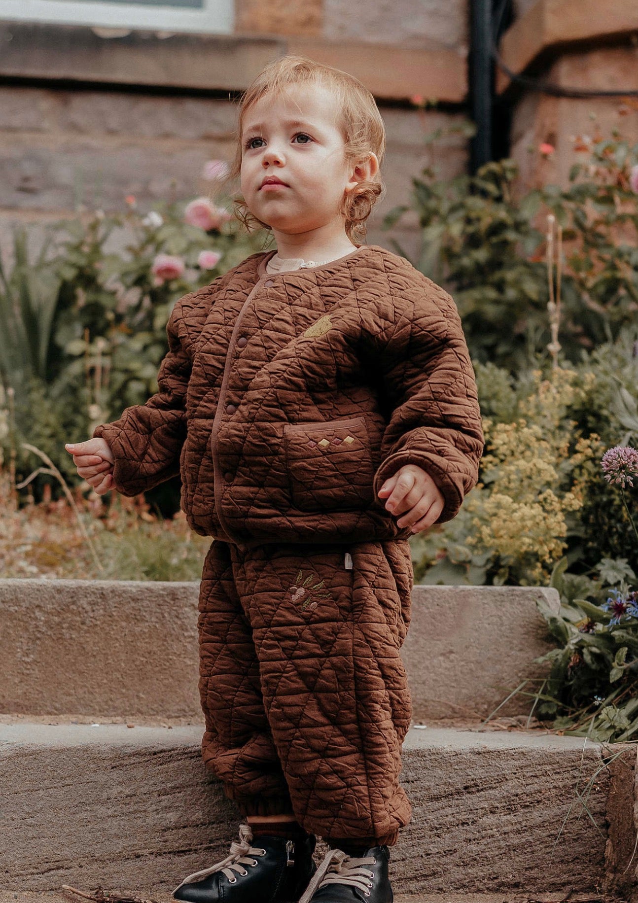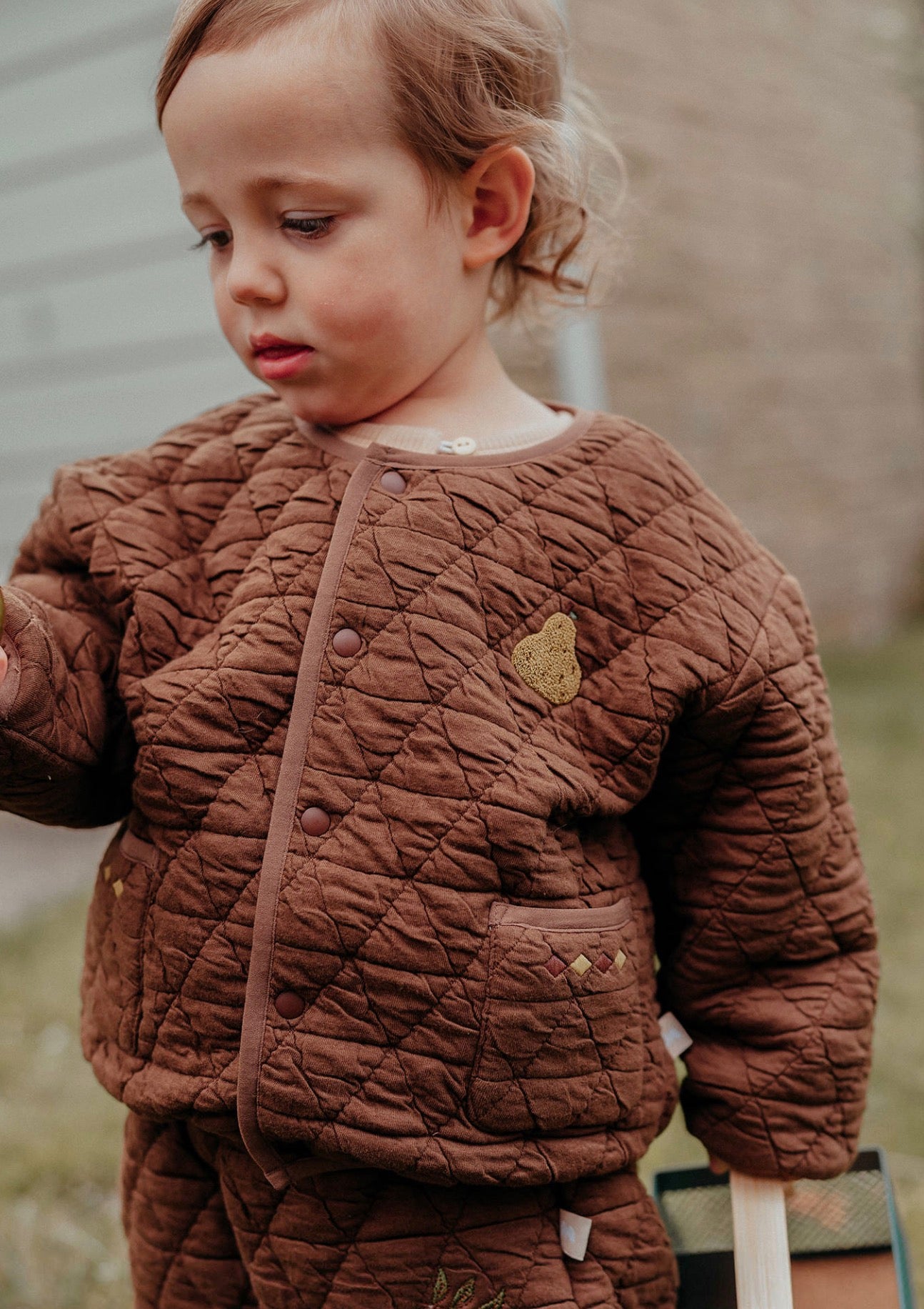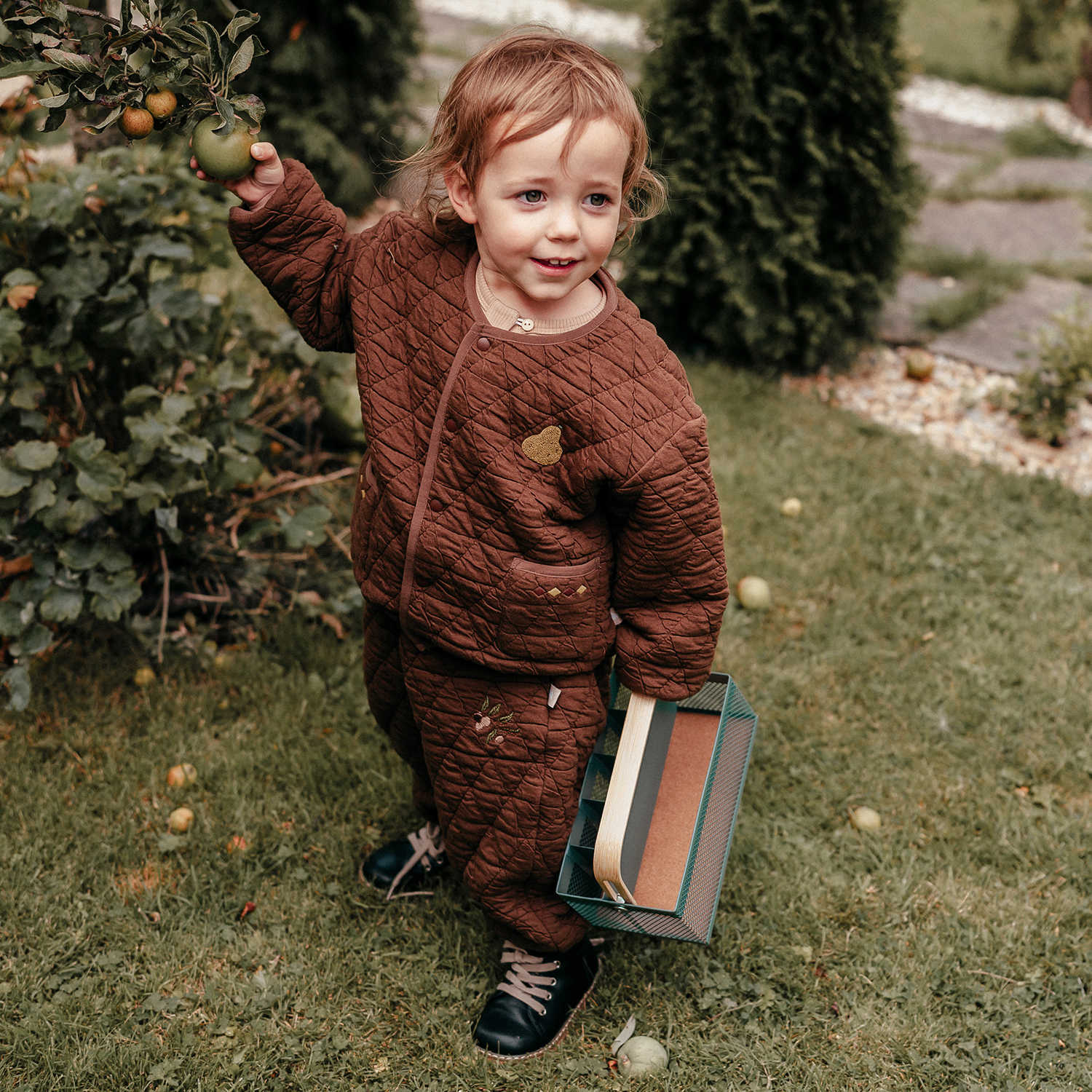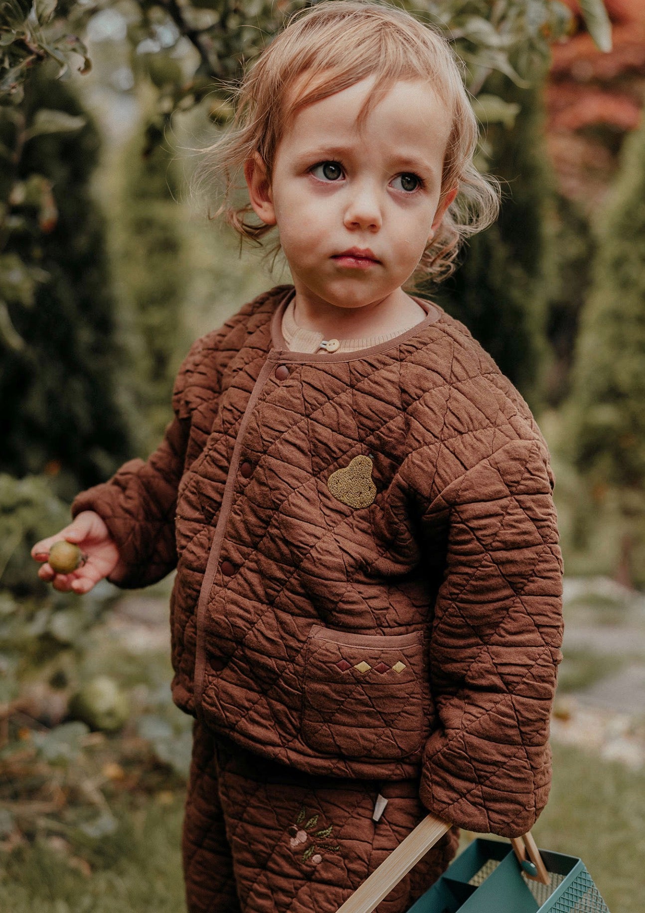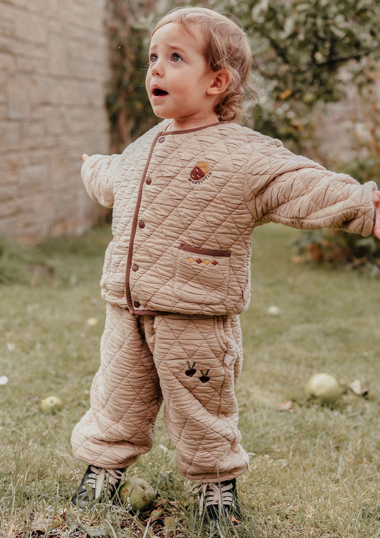 キルティングデザインにパイピングを効かせた長袖ジャケットは、洗練された印象を与えるアウターです。裏起毛素材を使用しているため、しっかりと暖かく、寒い日のお出かけに最適なブルゾン。シンプルで上品なトップスは、どんなコーディネートにも馴染みやすく、カジュアルでありながらもおしゃれなスタイルを完成させるベビー服です。