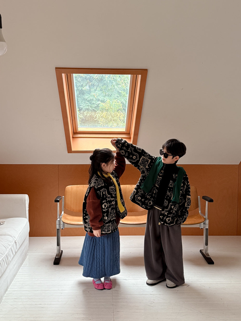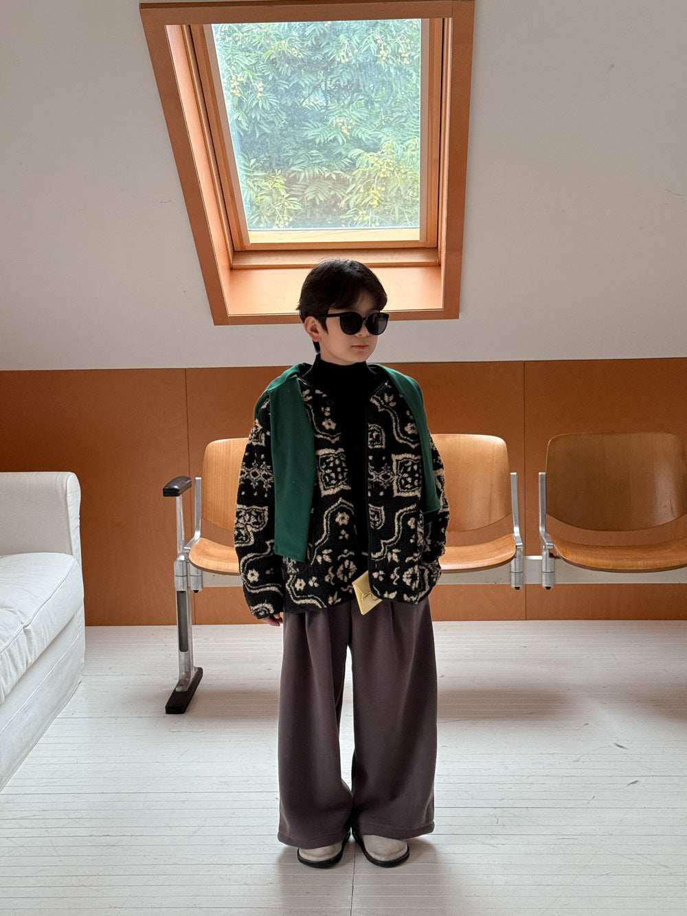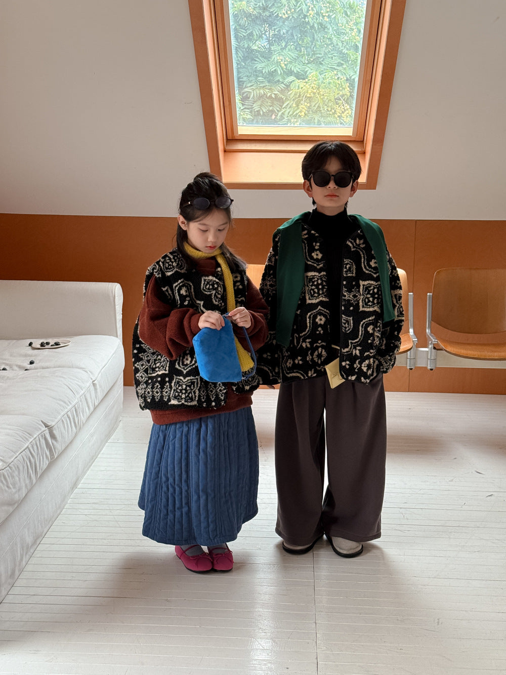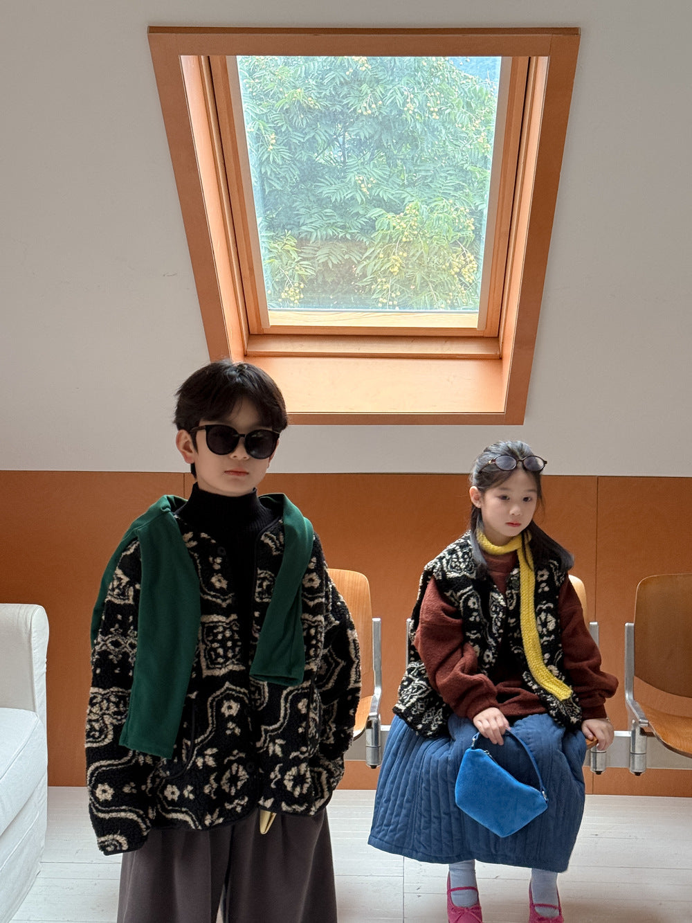 レトロな総柄が目を引くボアジャケットは、ベビーやキッズの秋冬スタイルを格上げするノーカラーのアウターです。厚手のボア素材がもこもことした心地よい肌触りで、寒い日のお出かけを暖かくサポートします。クルーネックデザインで着回しやすく、カジュアルながらも個性的な魅力を放つこの子ども服のトップスは、デイリーユースはもちろん、コーディネートの主役としても活躍します。