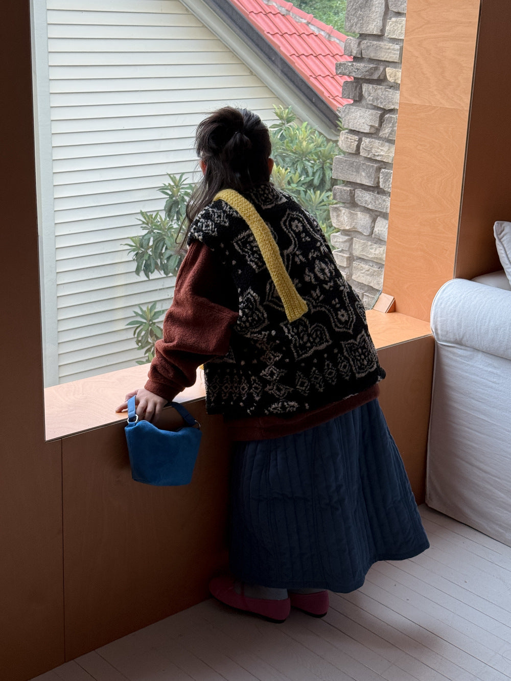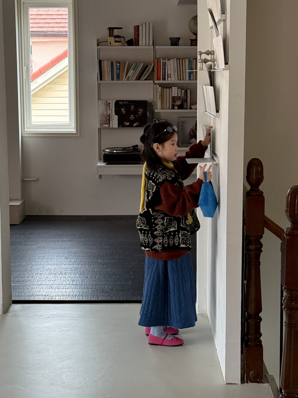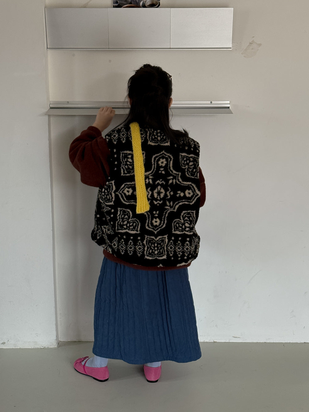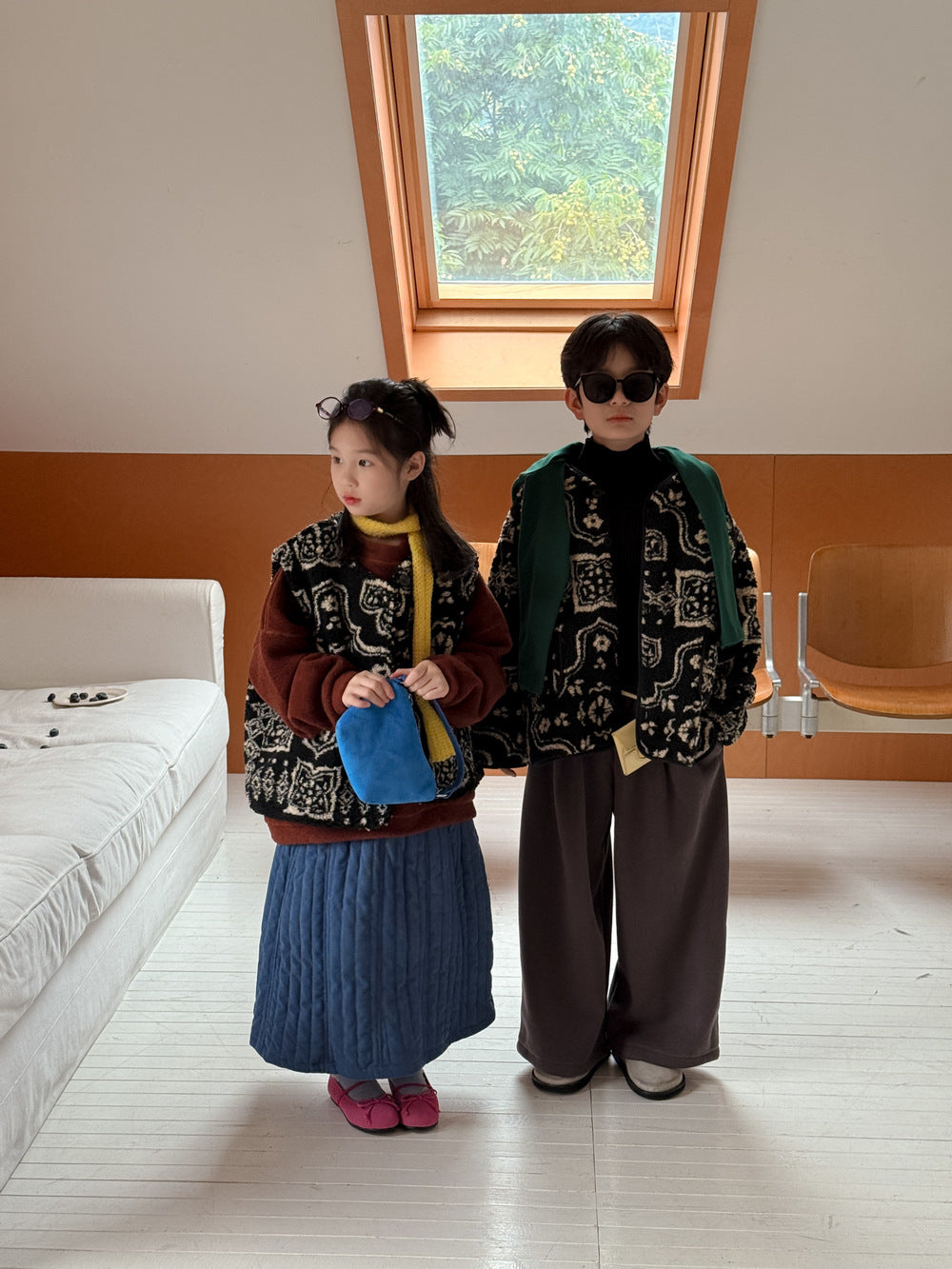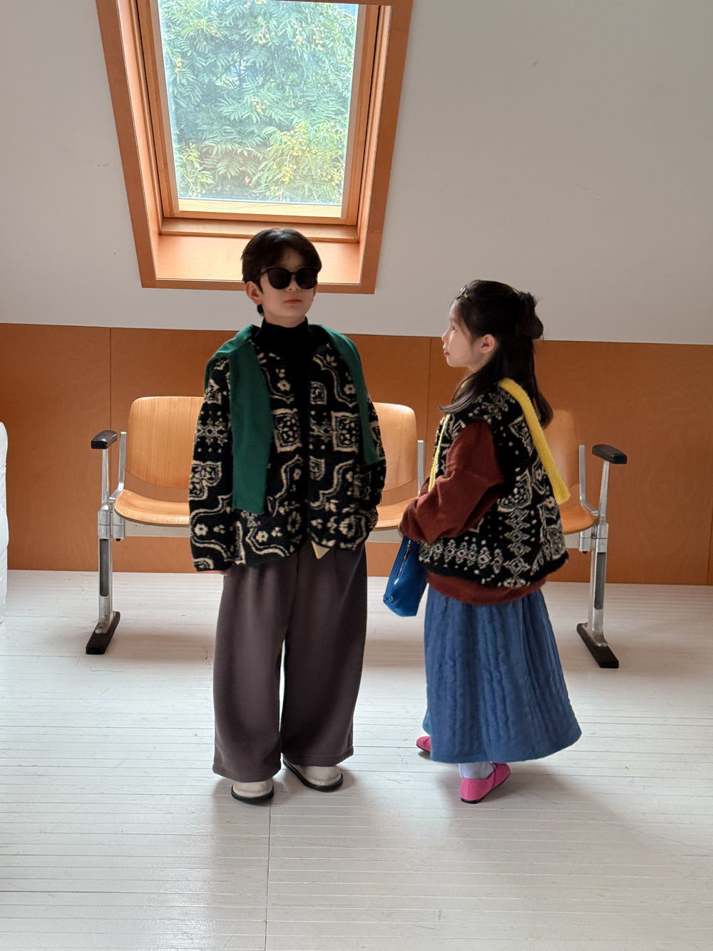 レトロな総柄が目を引くボアジャケットは、ベビーやキッズの秋冬スタイルを格上げするノーカラーのアウターです。厚手のボア素材がもこもことした心地よい肌触りで、寒い日のお出かけを暖かくサポートします。クルーネックデザインで着回しやすく、カジュアルながらも個性的な魅力を放つこの子ども服のトップスは、デイリーユースはもちろん、コーディネートの主役としても活躍します。