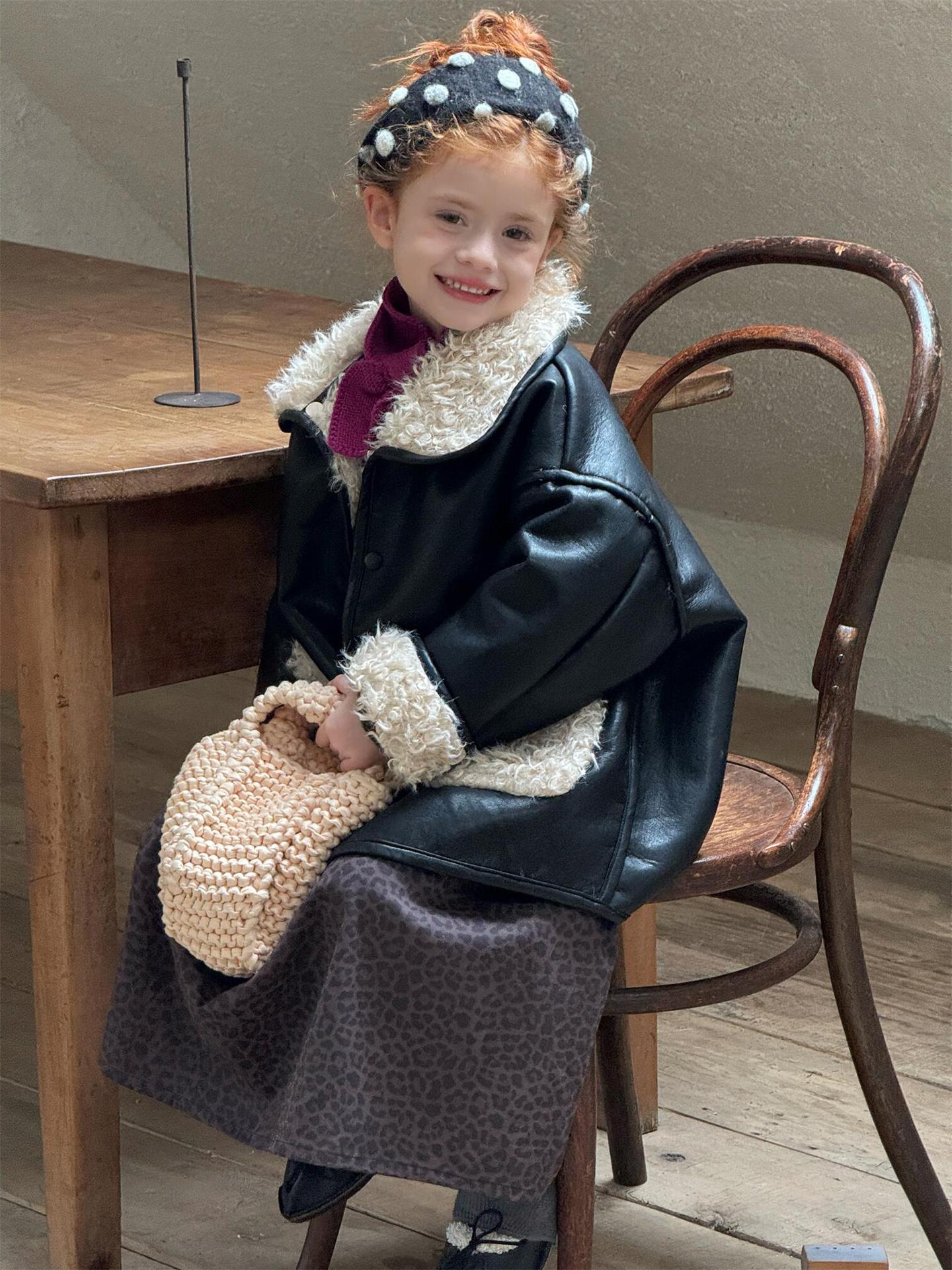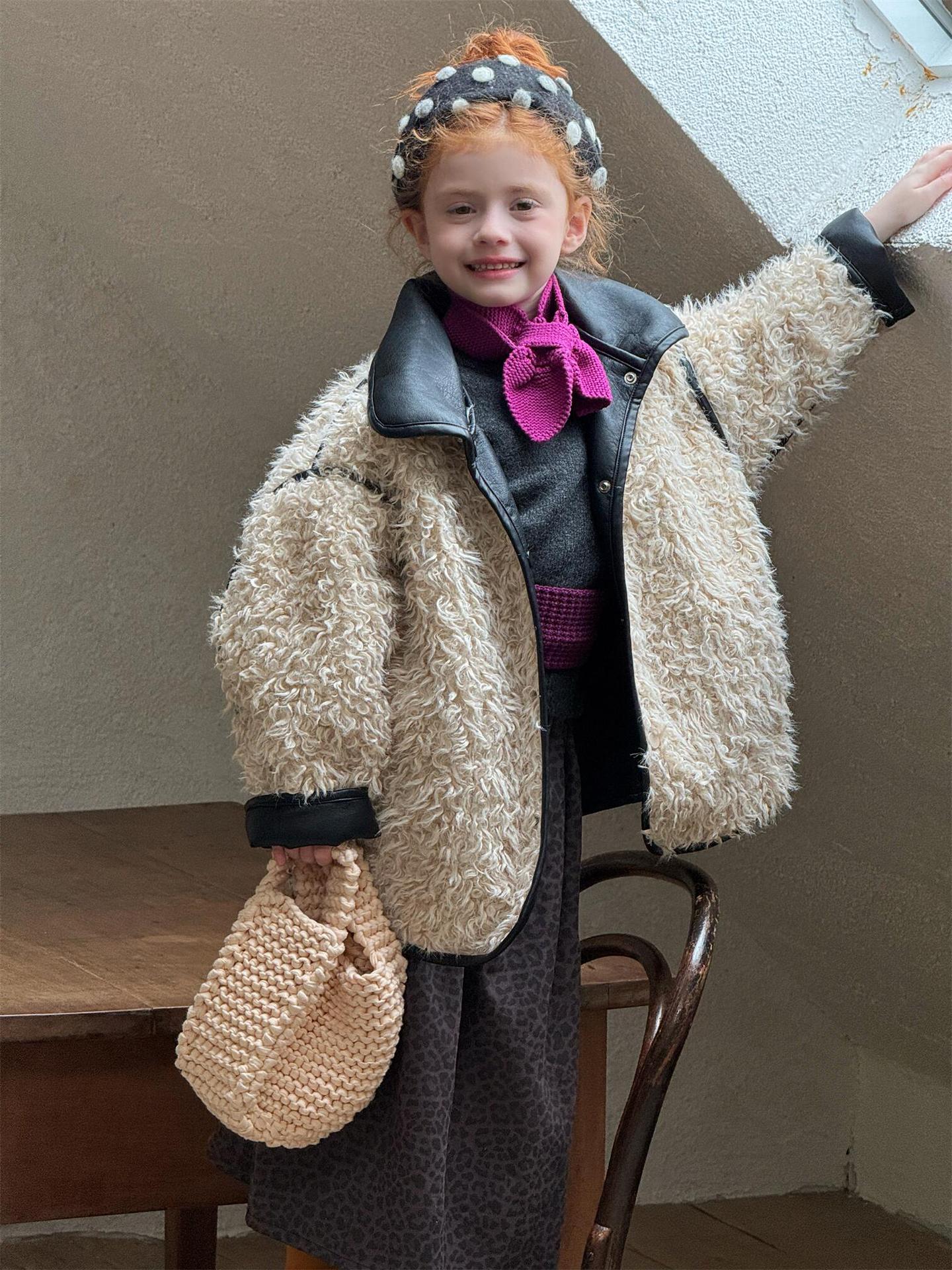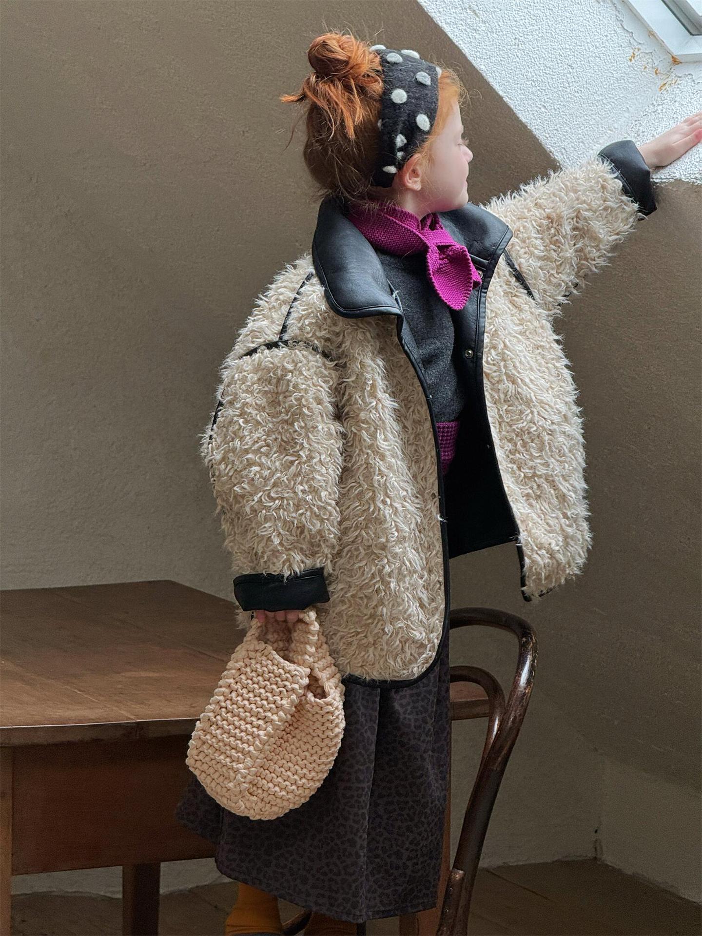 ボアとレザーライクな異素材を切り替えた、スタイリッシュなミドル丈コート。リバーシブルで着用できるため、一つのアウターで二つの雰囲気を楽しめ、デイリーコーデの幅が広がります。毛皮一体型のような温かな裏地を持つこのジャケットは、寒い季節のおしゃれを格上げする一着。女の子のワードローブに上質感をプラスする、デザイン性と機能性を兼ね備えた子ども服のアウターです。
