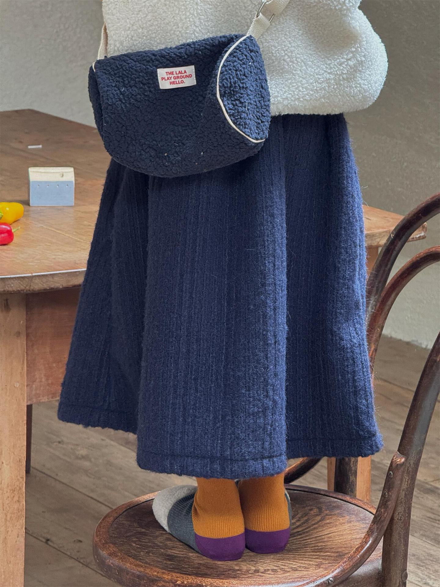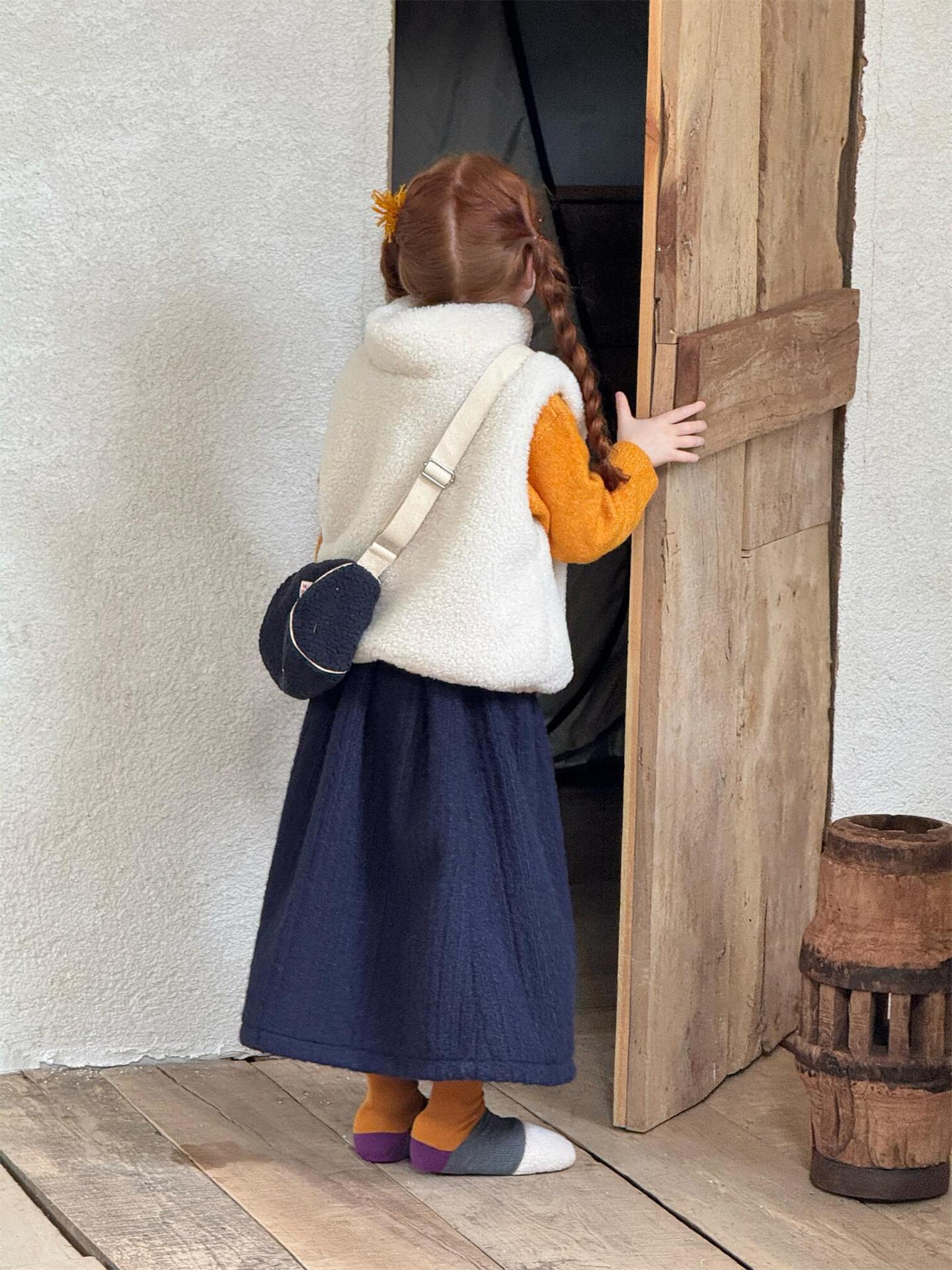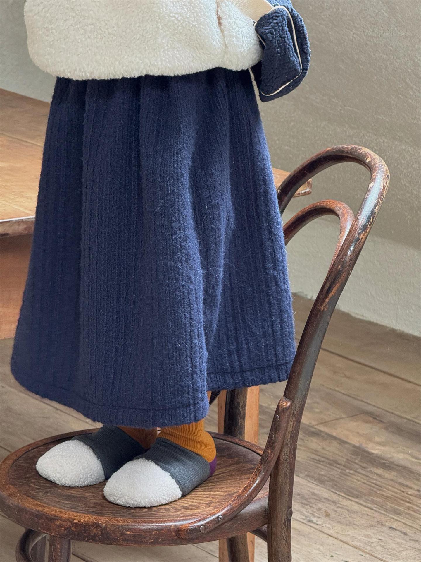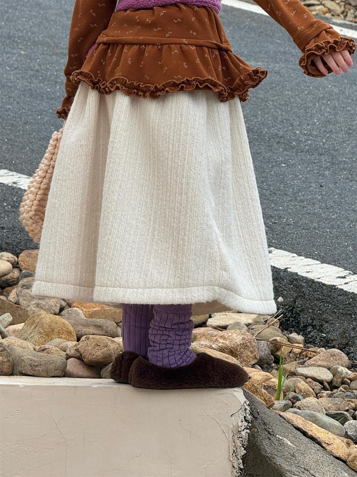ウールタッチの質感が上品な無地のミモレ丈スカート。大人可愛い雰囲気を演出するAラインのシルエットは、デイリーの着こなしを洗練された印象に仕上げます。ツイード調の素材感が暖かみと上質さをプラスし、寒い季節のおしゃれにも最適です。着回ししやすいこの子ども服のスカートは、カジュアルから少しきれいめな装いまで幅広く活躍する、女の子のワードローブに欠かせないアイテムです。