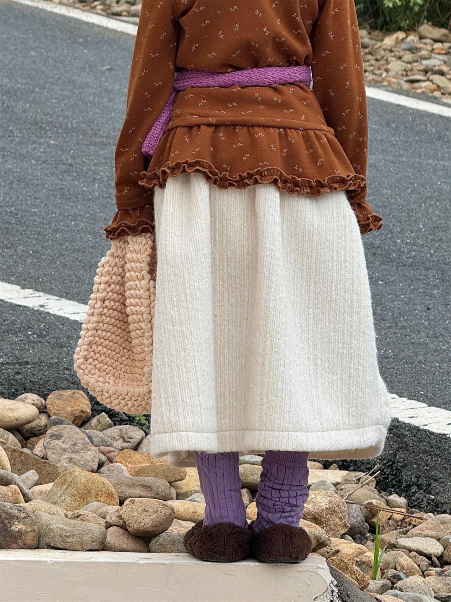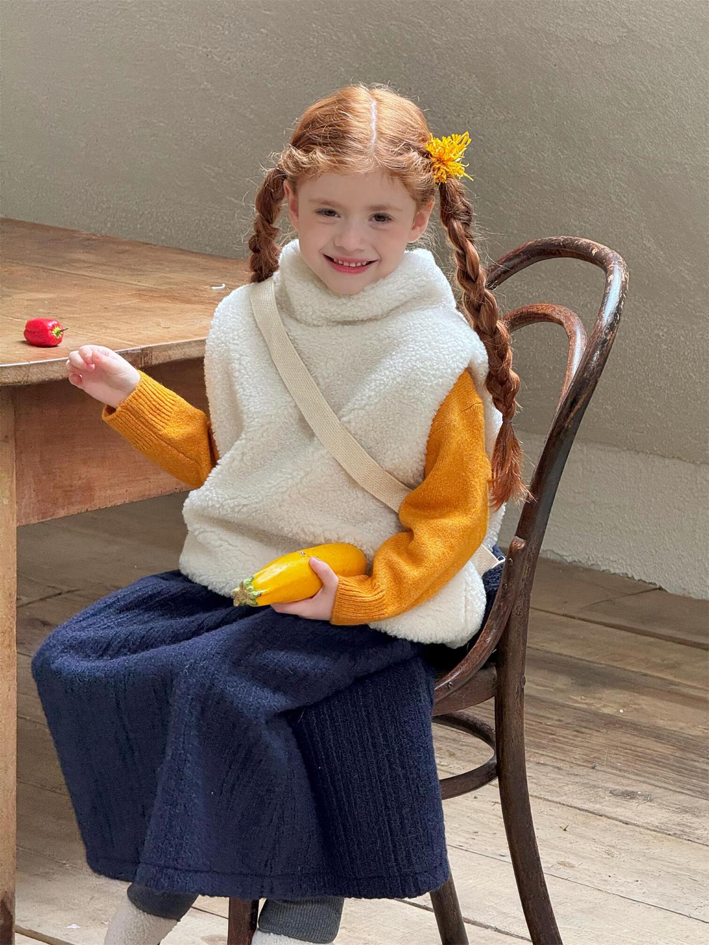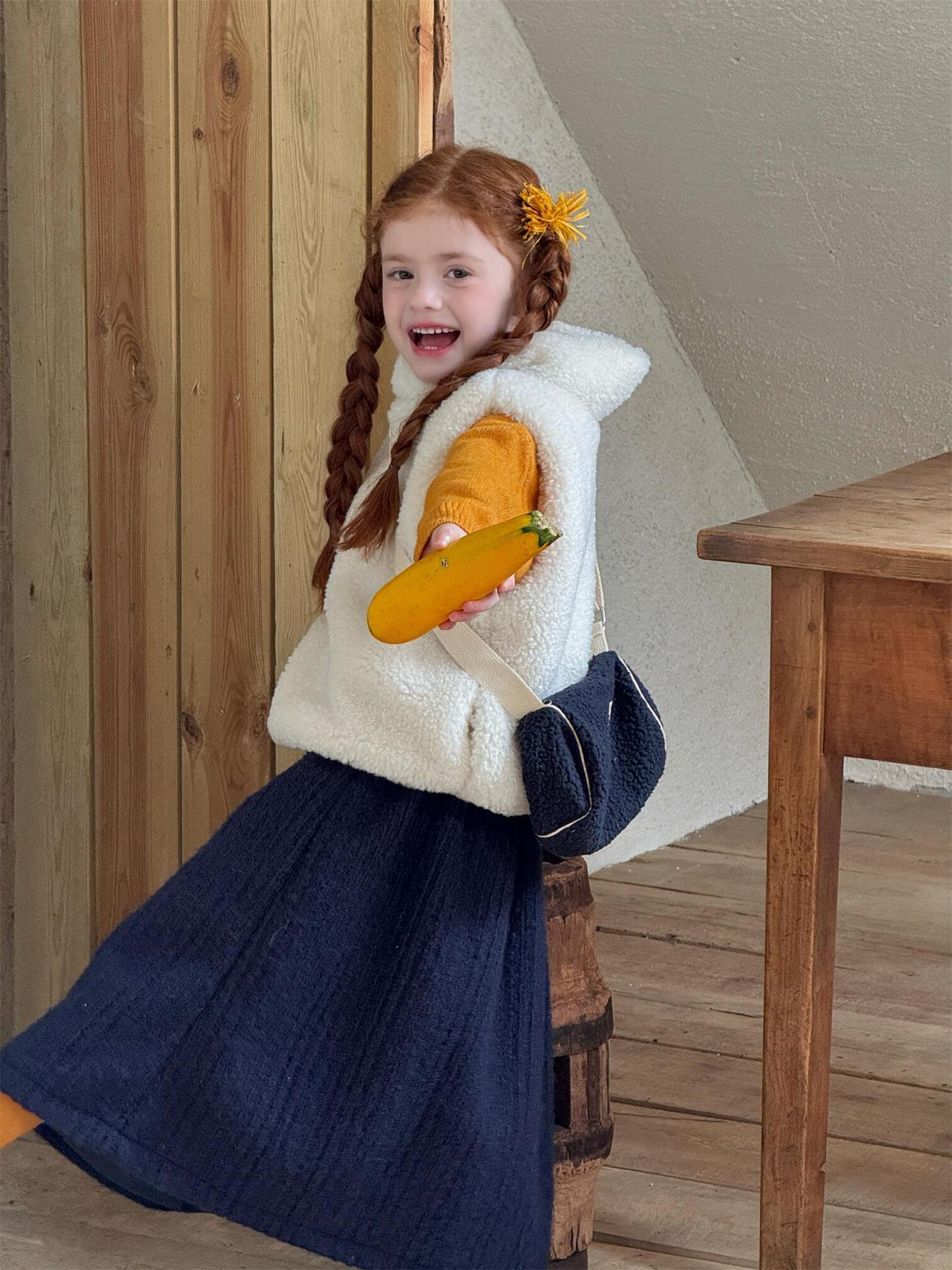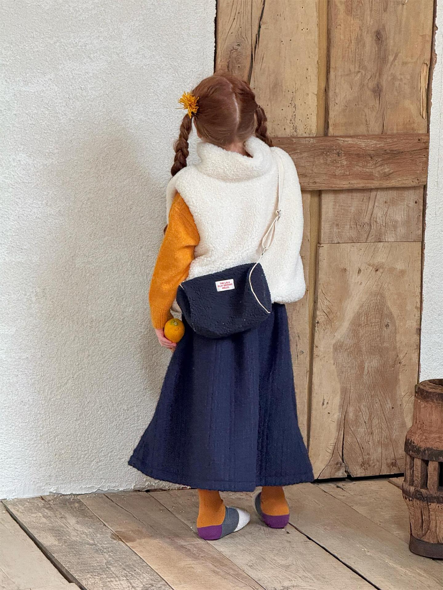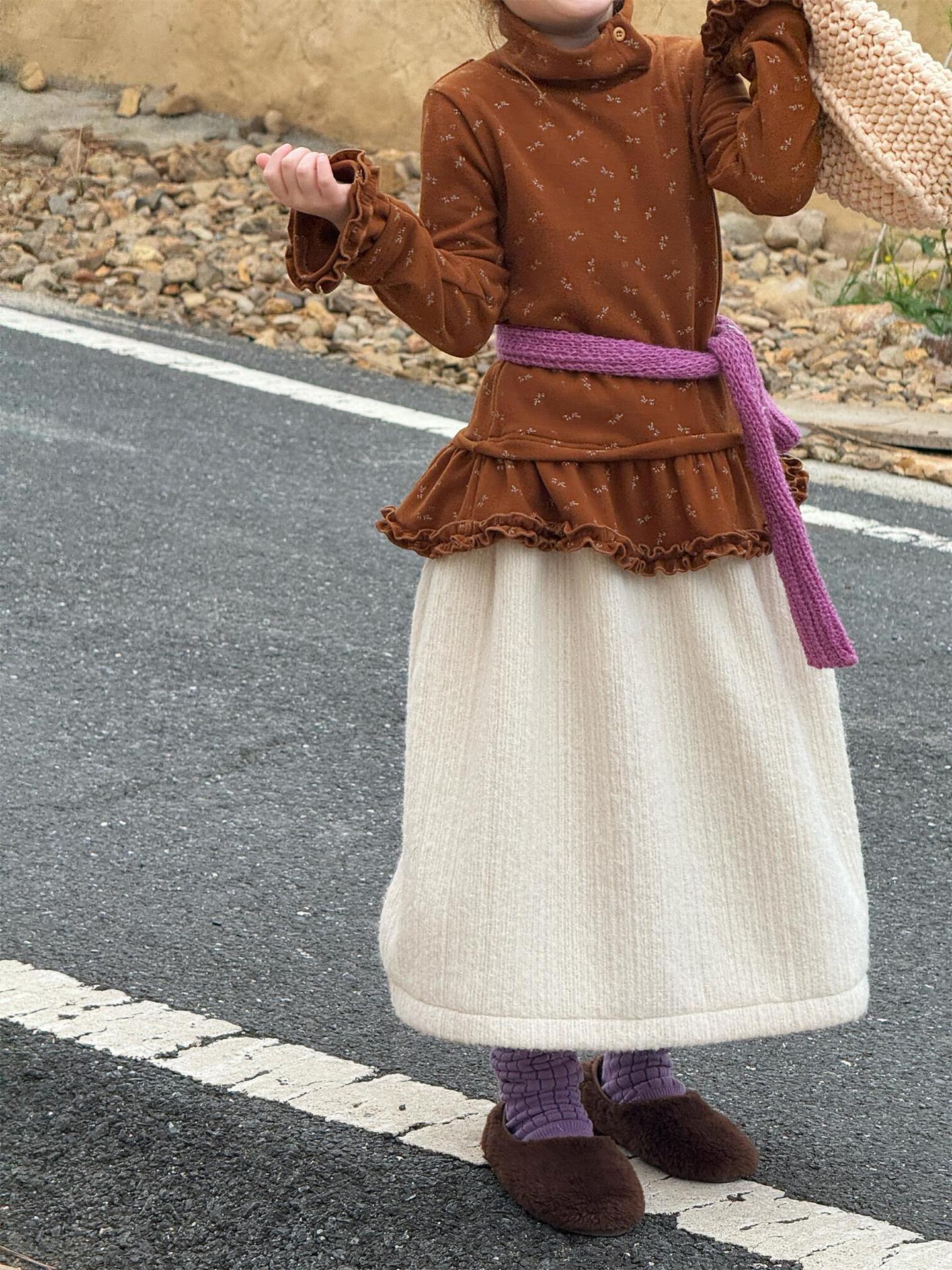 ウールタッチの質感が上品な無地のミモレ丈スカート。大人可愛い雰囲気を演出するAラインのシルエットは、デイリーの着こなしを洗練された印象に仕上げます。ツイード調の素材感が暖かみと上質さをプラスし、寒い季節のおしゃれにも最適です。着回ししやすいこの子ども服のスカートは、カジュアルから少しきれいめな装いまで幅広く活躍する、女の子のワードローブに欠かせないアイテムです。