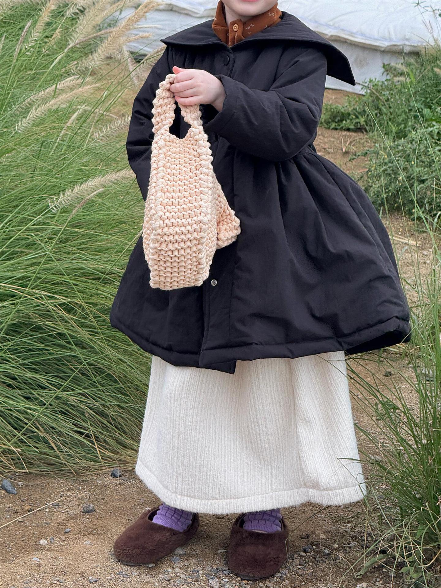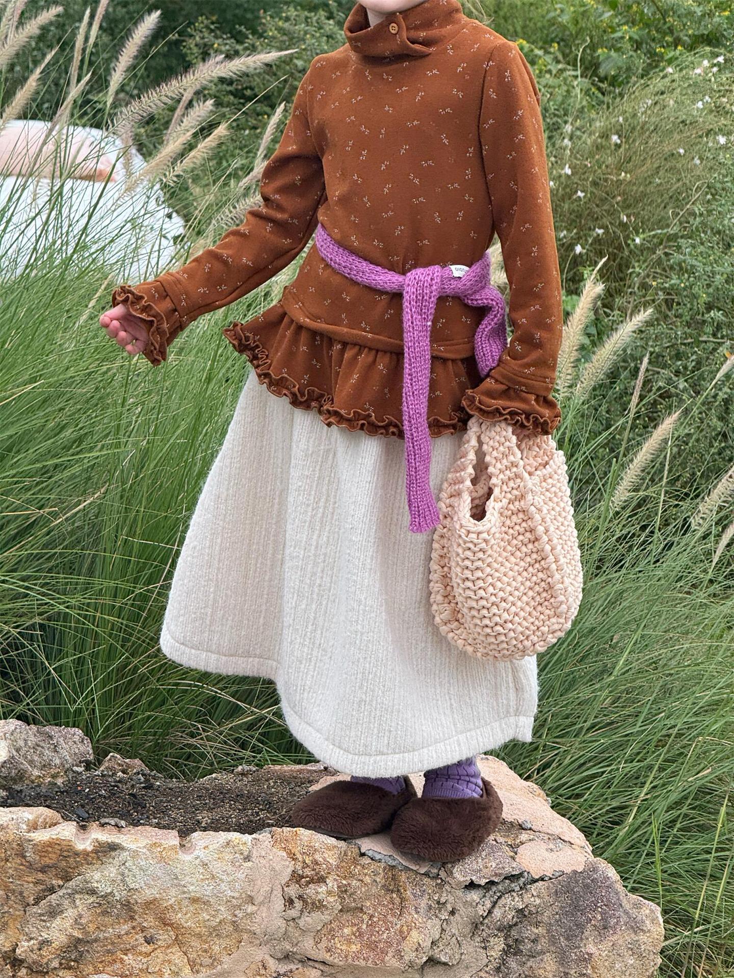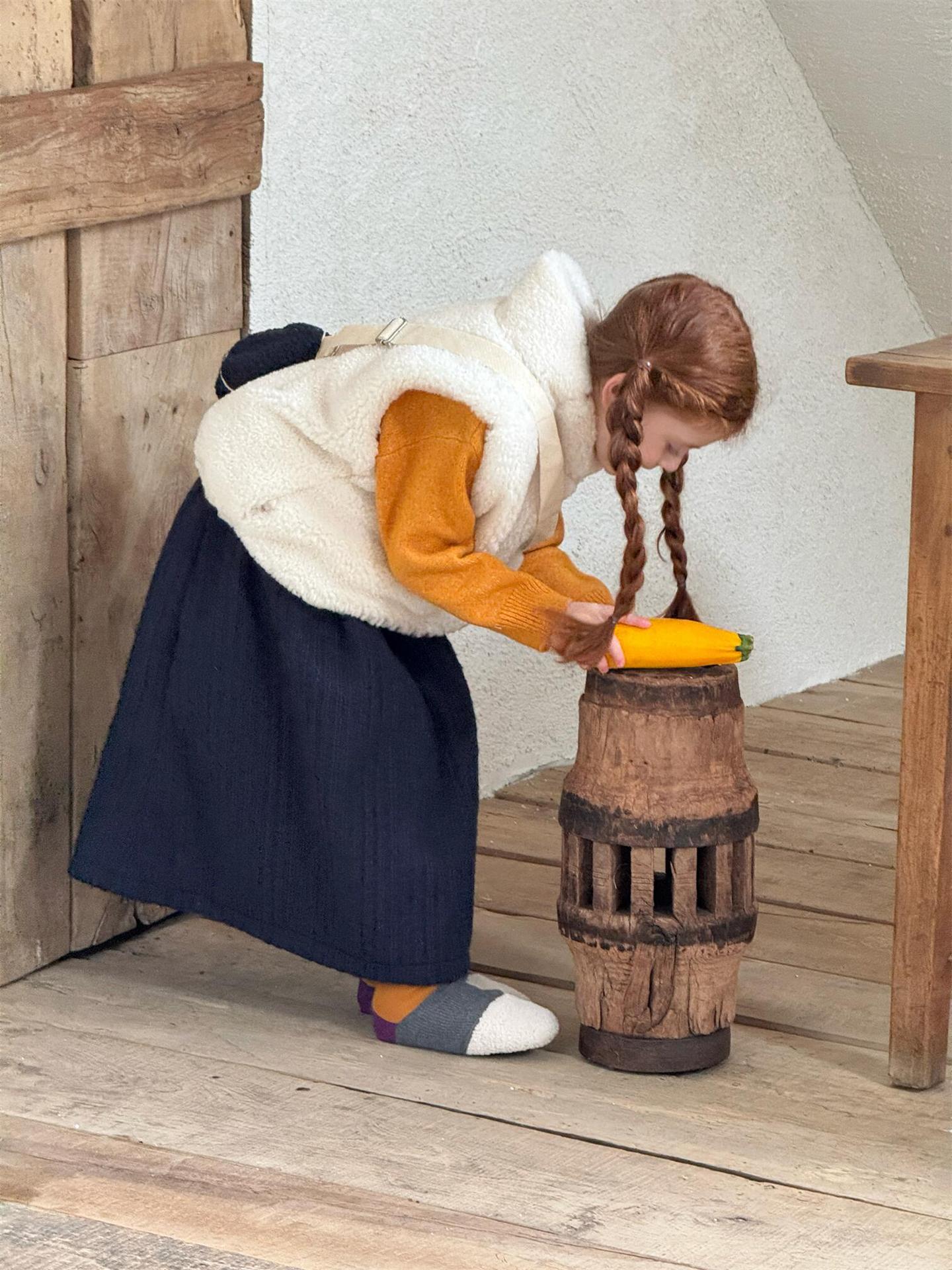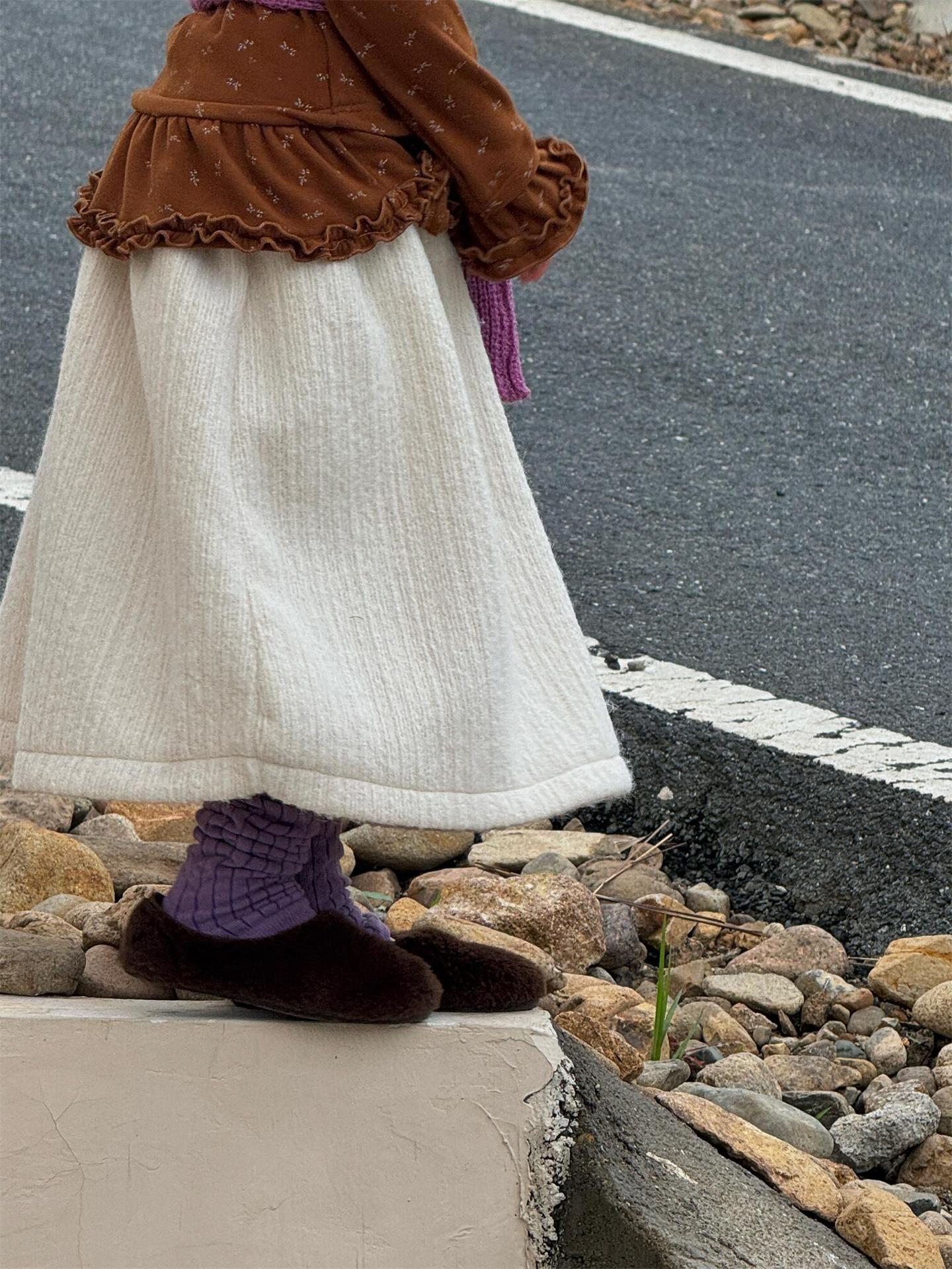 ウールタッチの質感が上品な無地のミモレ丈スカート。大人可愛い雰囲気を演出するAラインのシルエットは、デイリーの着こなしを洗練された印象に仕上げます。ツイード調の素材感が暖かみと上質さをプラスし、寒い季節のおしゃれにも最適です。着回ししやすいこの子ども服のスカートは、カジュアルから少しきれいめな装いまで幅広く活躍する、女の子のワードローブに欠かせないアイテムです。