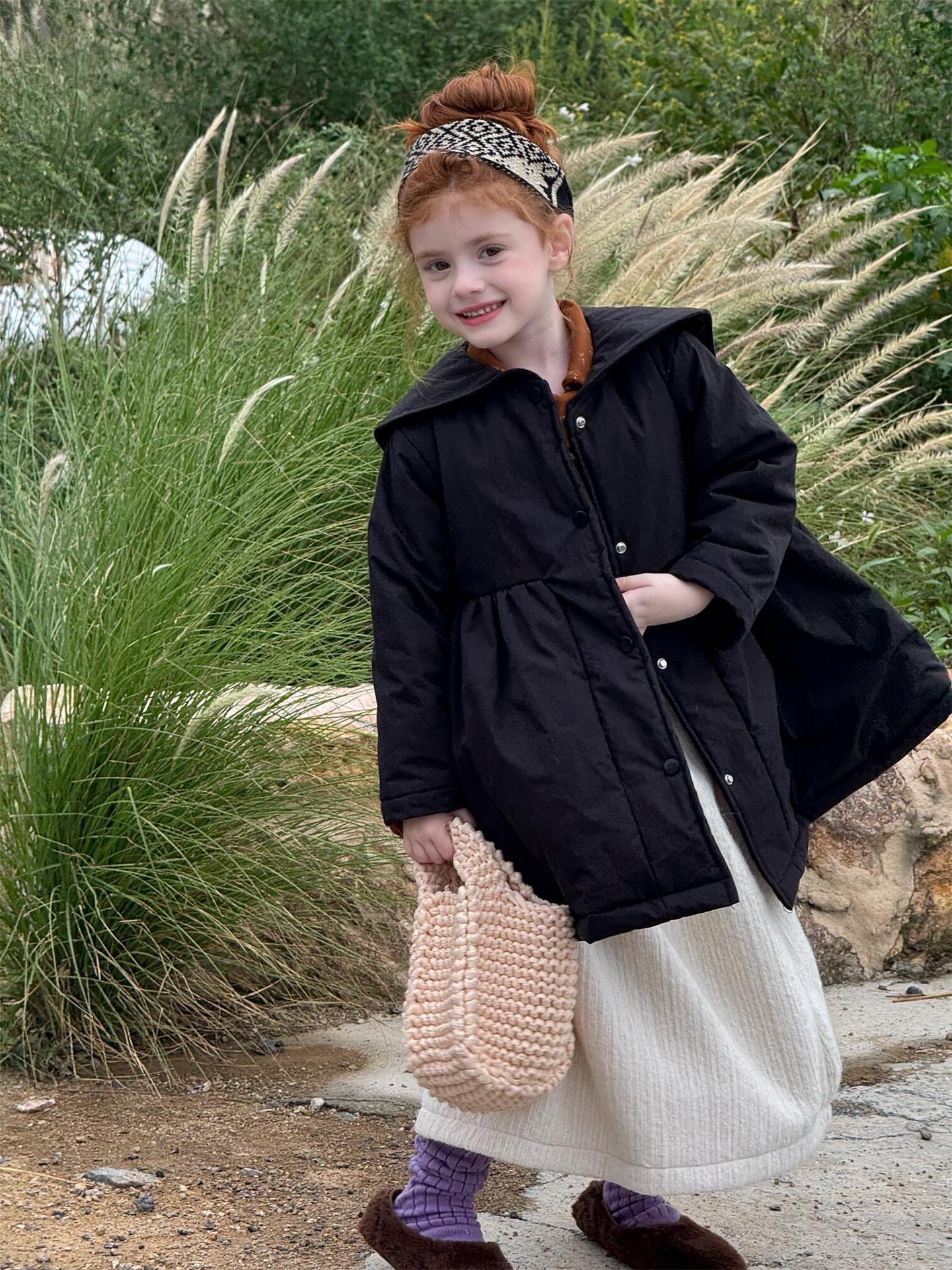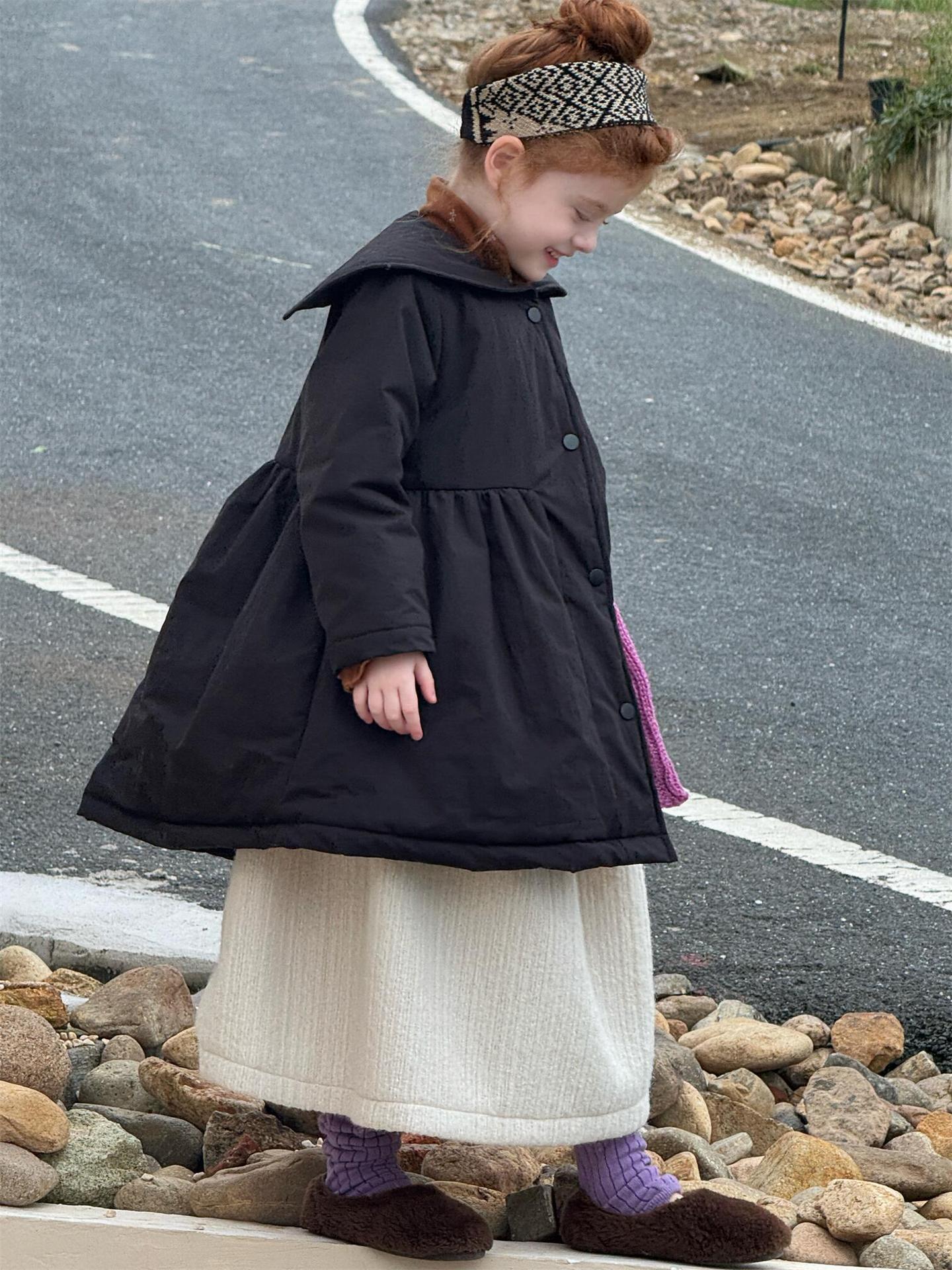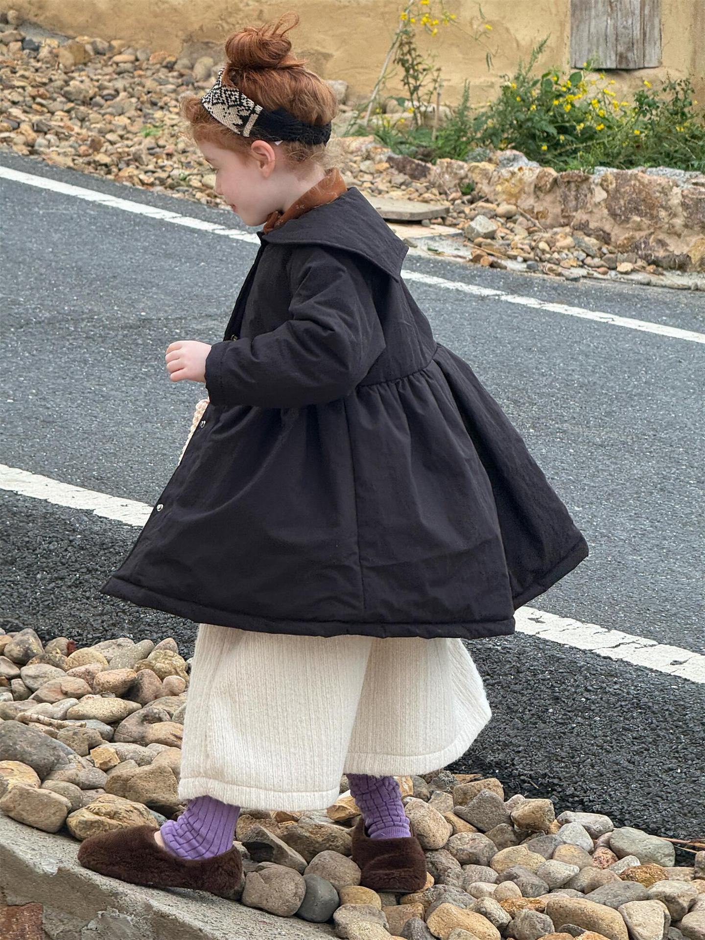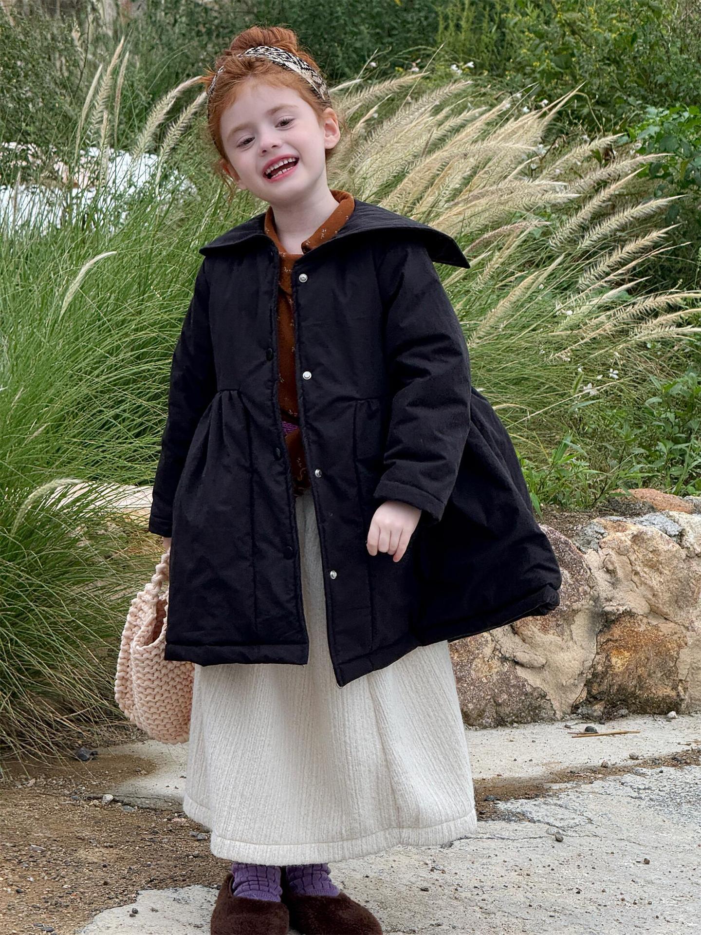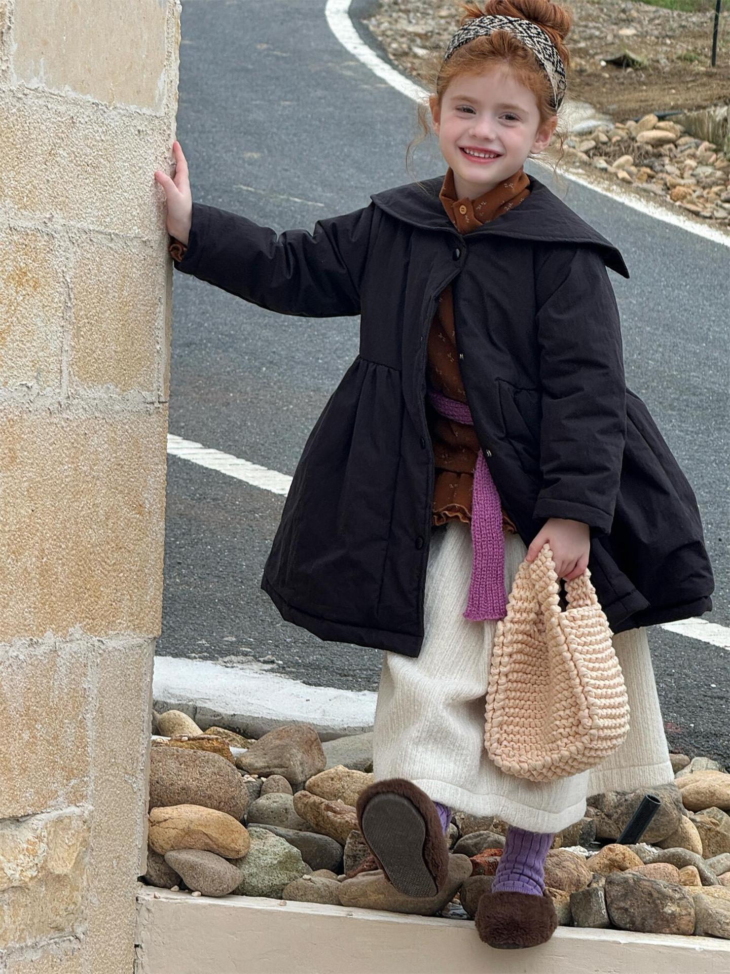 ウールタッチの質感が上品な無地のミモレ丈スカート。大人可愛い雰囲気を演出するAラインのシルエットは、デイリーの着こなしを洗練された印象に仕上げます。ツイード調の素材感が暖かみと上質さをプラスし、寒い季節のおしゃれにも最適です。着回ししやすいこの子ども服のスカートは、カジュアルから少しきれいめな装いまで幅広く活躍する、女の子のワードローブに欠かせないアイテムです。