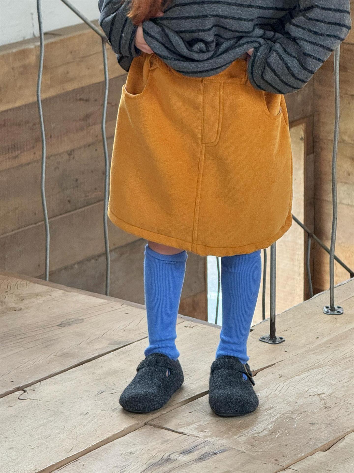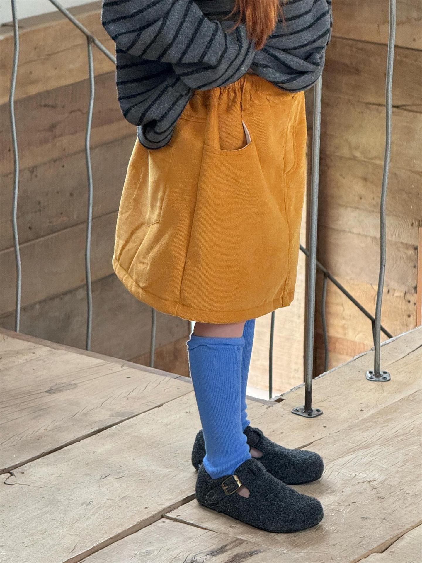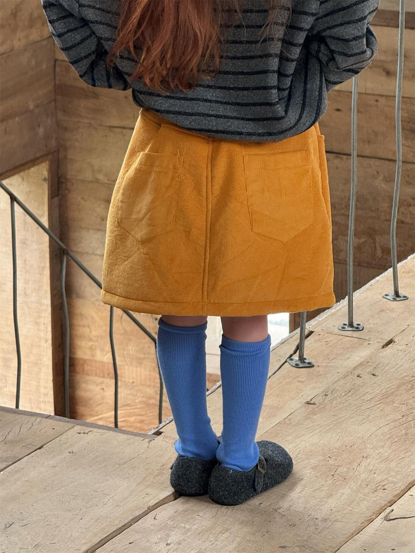 カラフルな色合いが目を引くコーデュロイのタイトスカート。裏起毛のフリース素材が一体化しており、寒い季節でも暖かく快適に過ごせる子ども服です。便利なポケット付きのデザインと、明るいショート丈のスカートは、カジュアルながらもおしゃれな雰囲気を演出。着回しやすく、デイリーのコーディネートに活発さとスタイリッシュな印象をプラスするアイテムです。