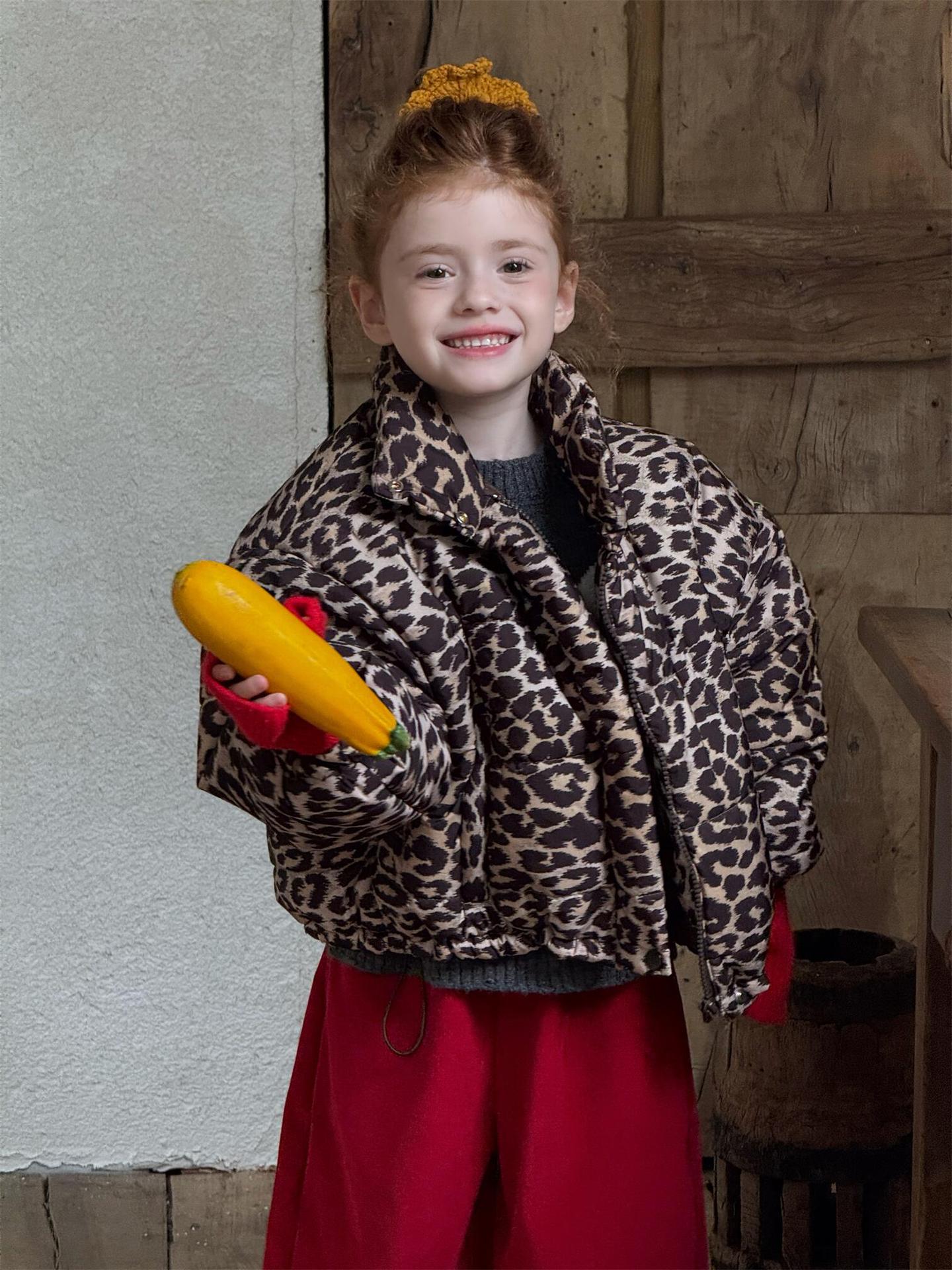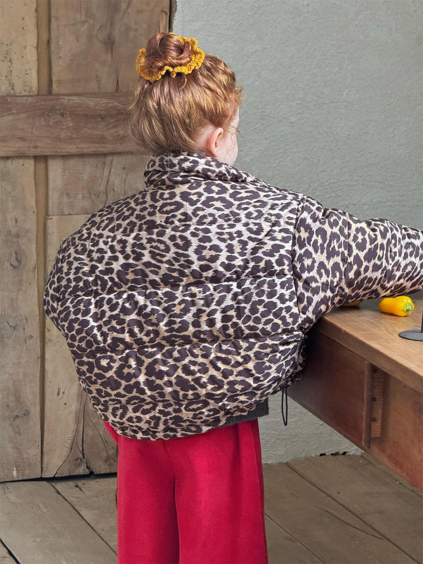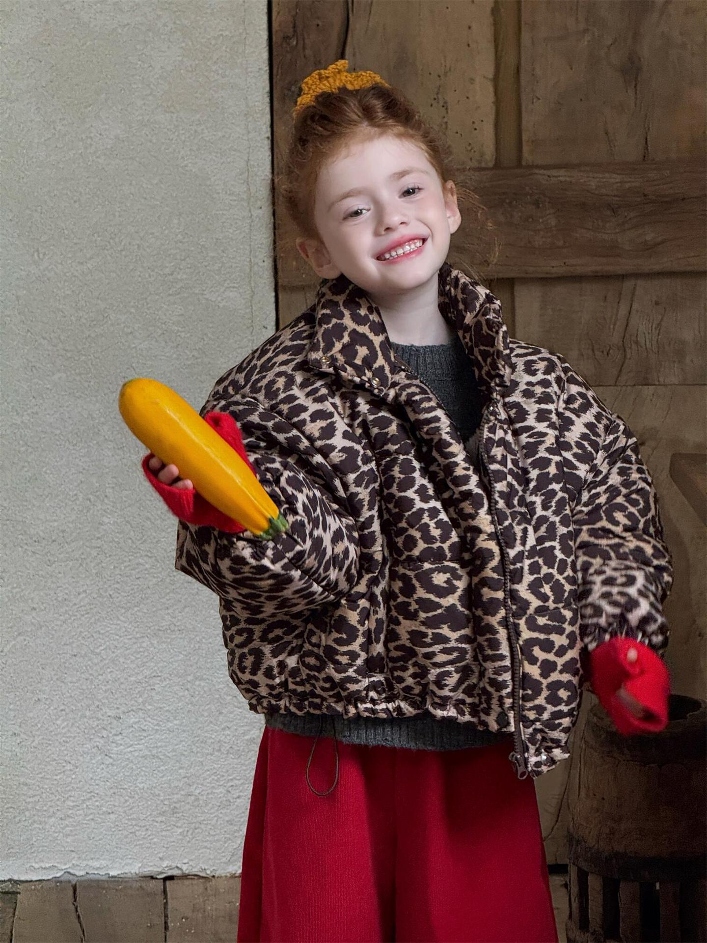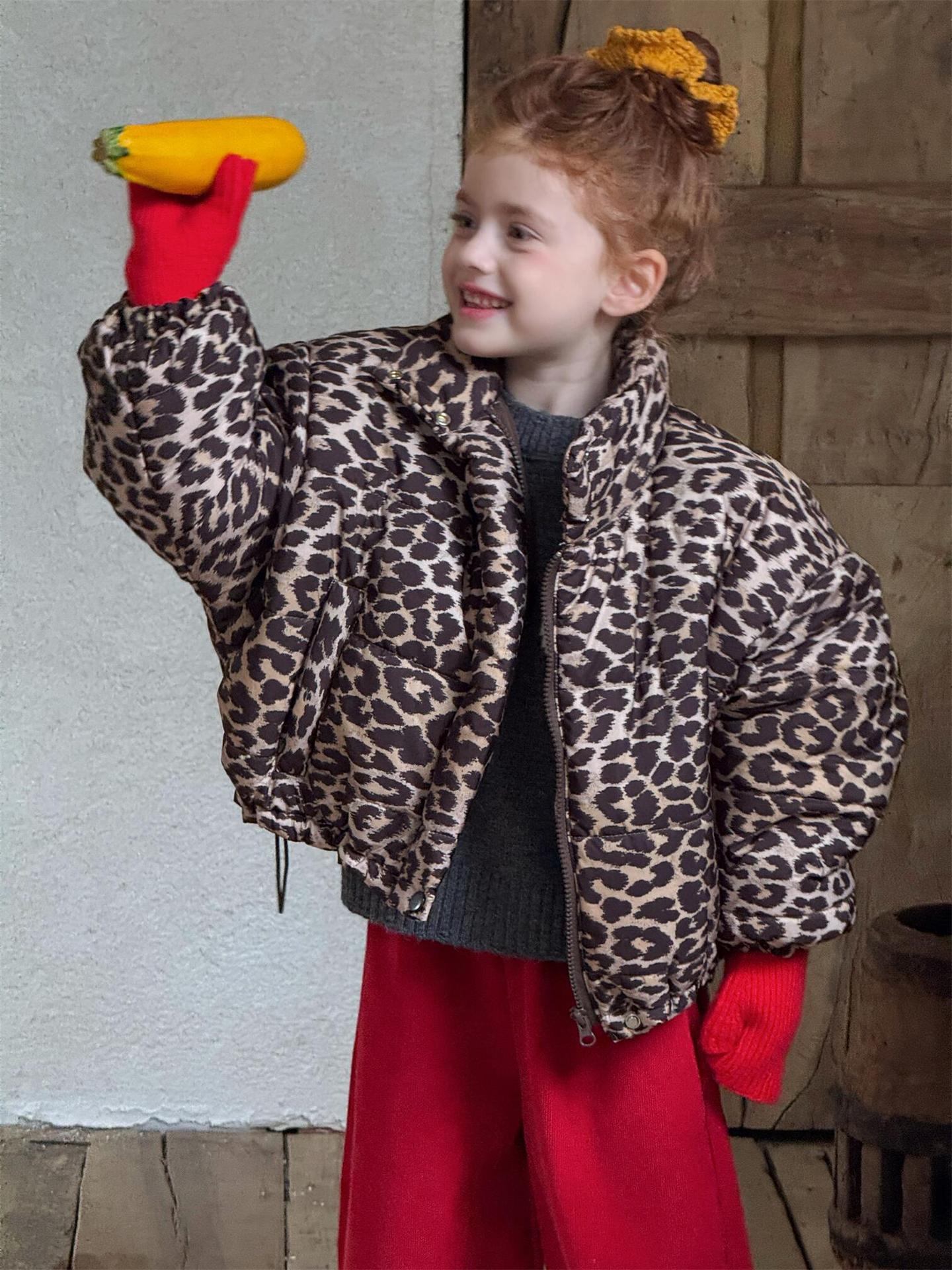 インパクトのあるレオパード柄が目を引くショート丈ブルゾン。バットウィングスリーブを取り入れたカジュアルなシルエットが、女の子の着こなしに遊び心とトレンド感をプラスします。中綿入りのバッファージャケットは、防寒性とデザイン性を兼ね備えた子ども服のアウター。羽織るだけでスタイリッシュな雰囲気が完成し、デイリーのコーディネートを大胆に彩るショートコートです。