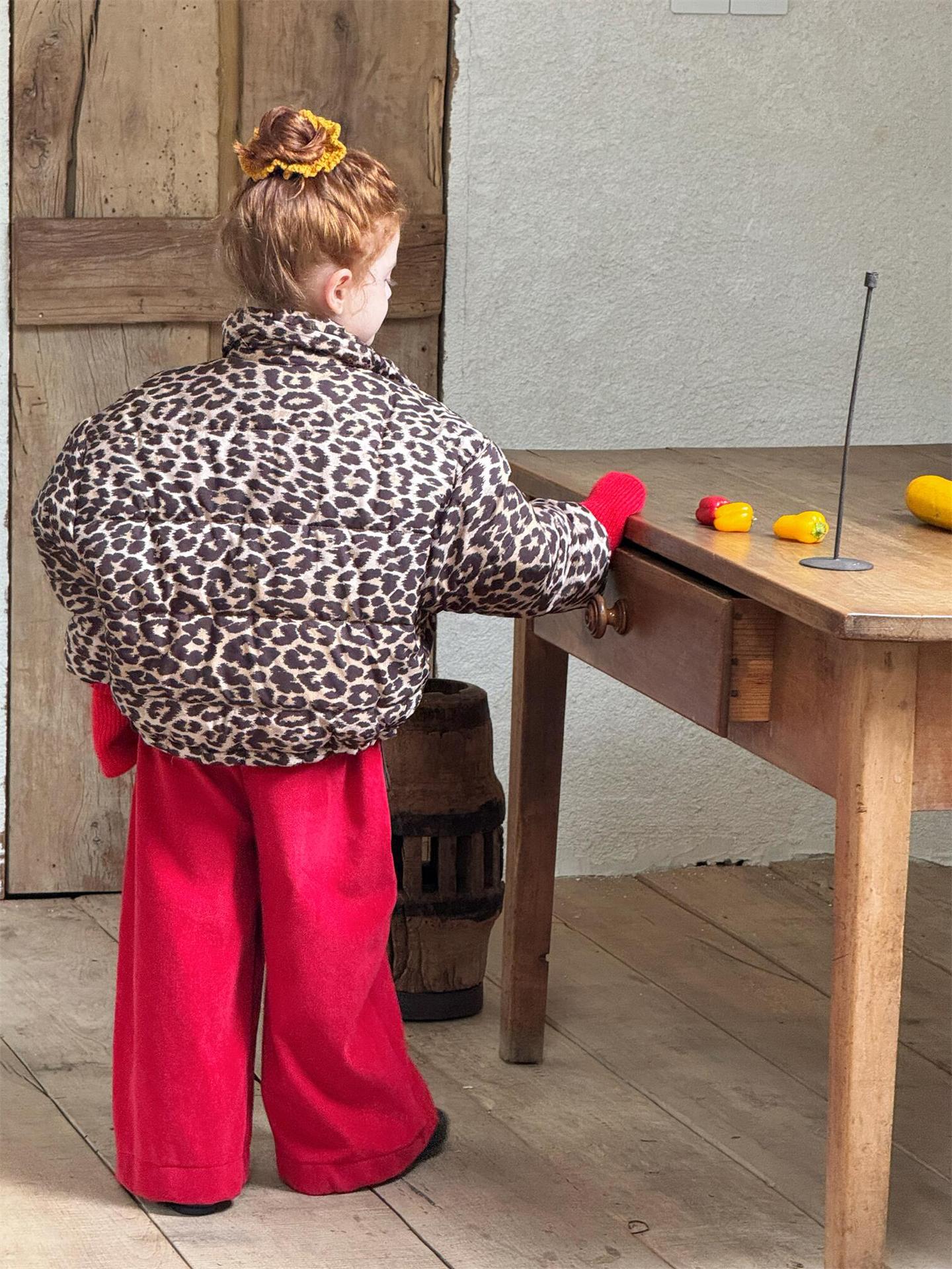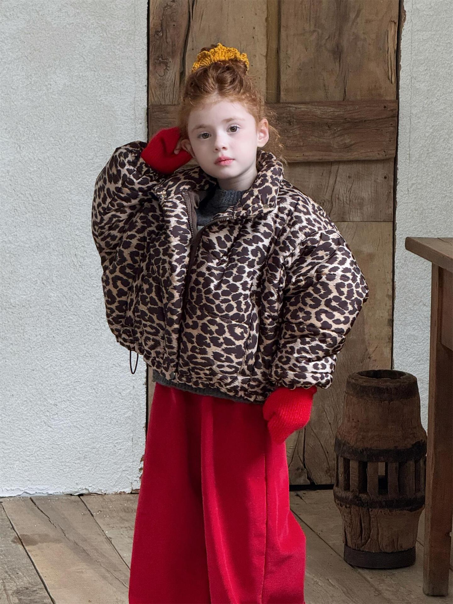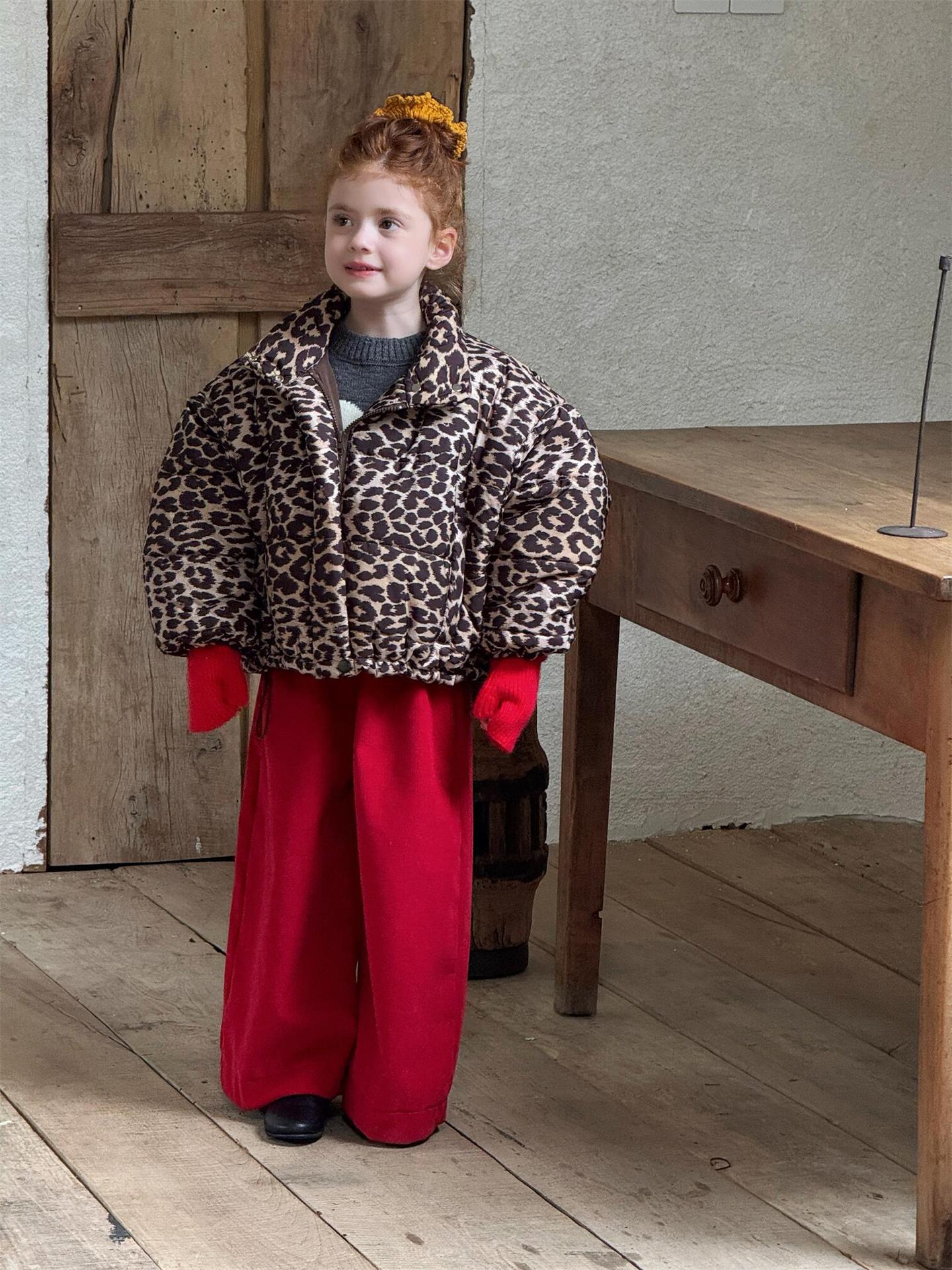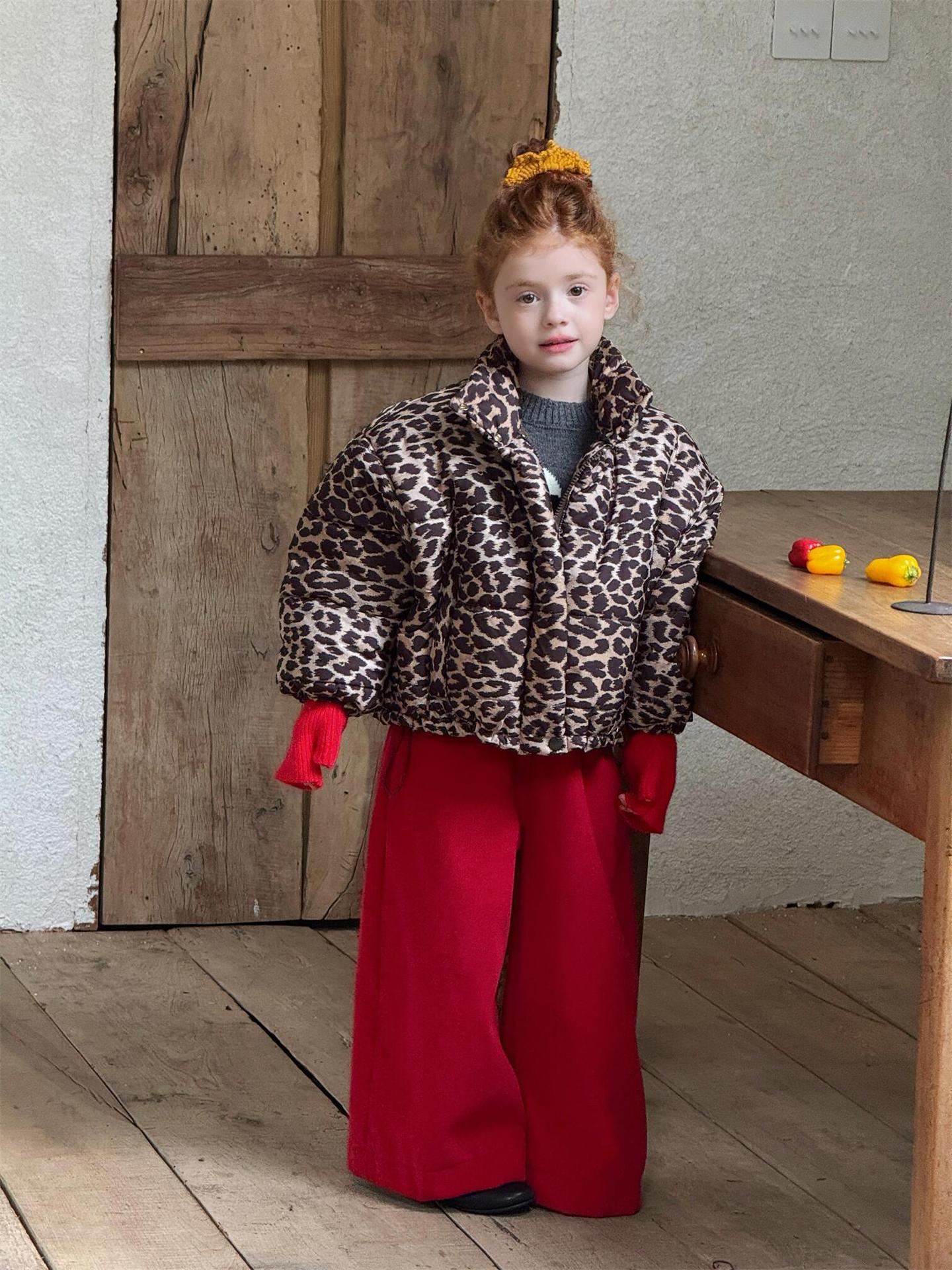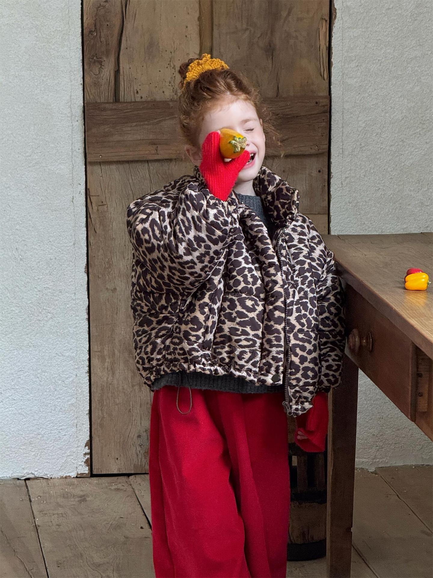 インパクトのあるレオパード柄が目を引くショート丈ブルゾン。バットウィングスリーブを取り入れたカジュアルなシルエットが、女の子の着こなしに遊び心とトレンド感をプラスします。中綿入りのバッファージャケットは、防寒性とデザイン性を兼ね備えた子ども服のアウター。羽織るだけでスタイリッシュな雰囲気が完成し、デイリーのコーディネートを大胆に彩るショートコートです。