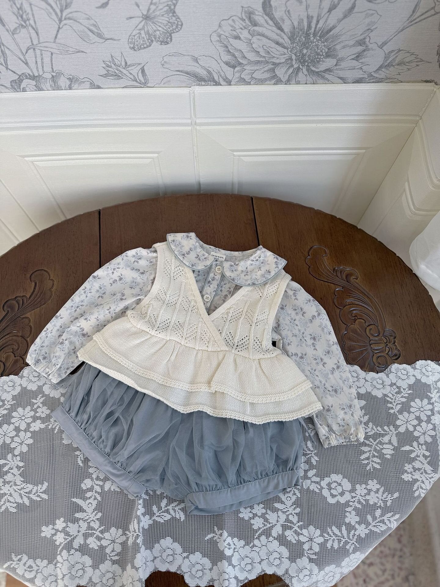 ふんわりとした柔らかいコットンを贅沢に使用した、透かし編みのニットベストです。胸元のカシュクールのような深いVラインが、お顔周りをすっきりと見せつつ、裾にかけて広がる2段のフリルが愛らしいシルエットを演出します。