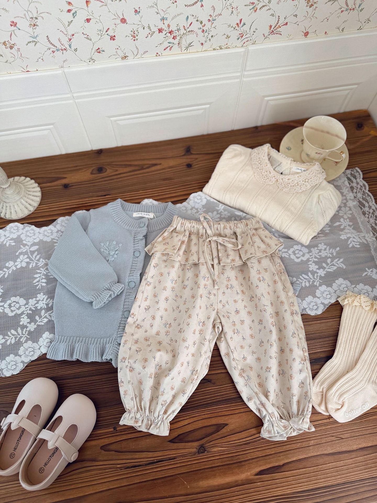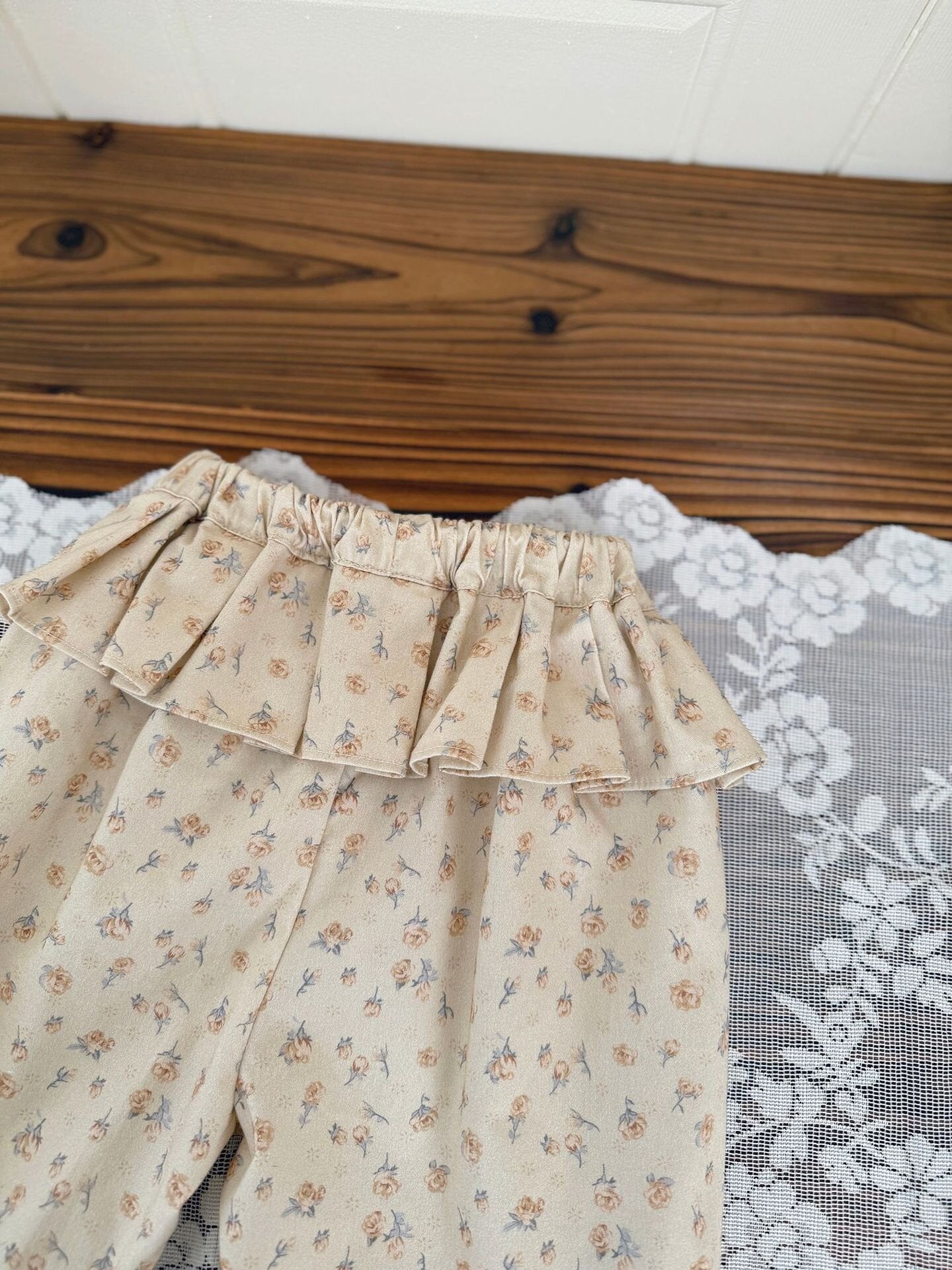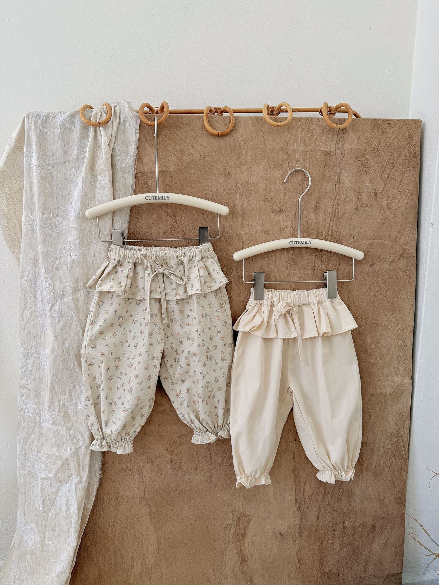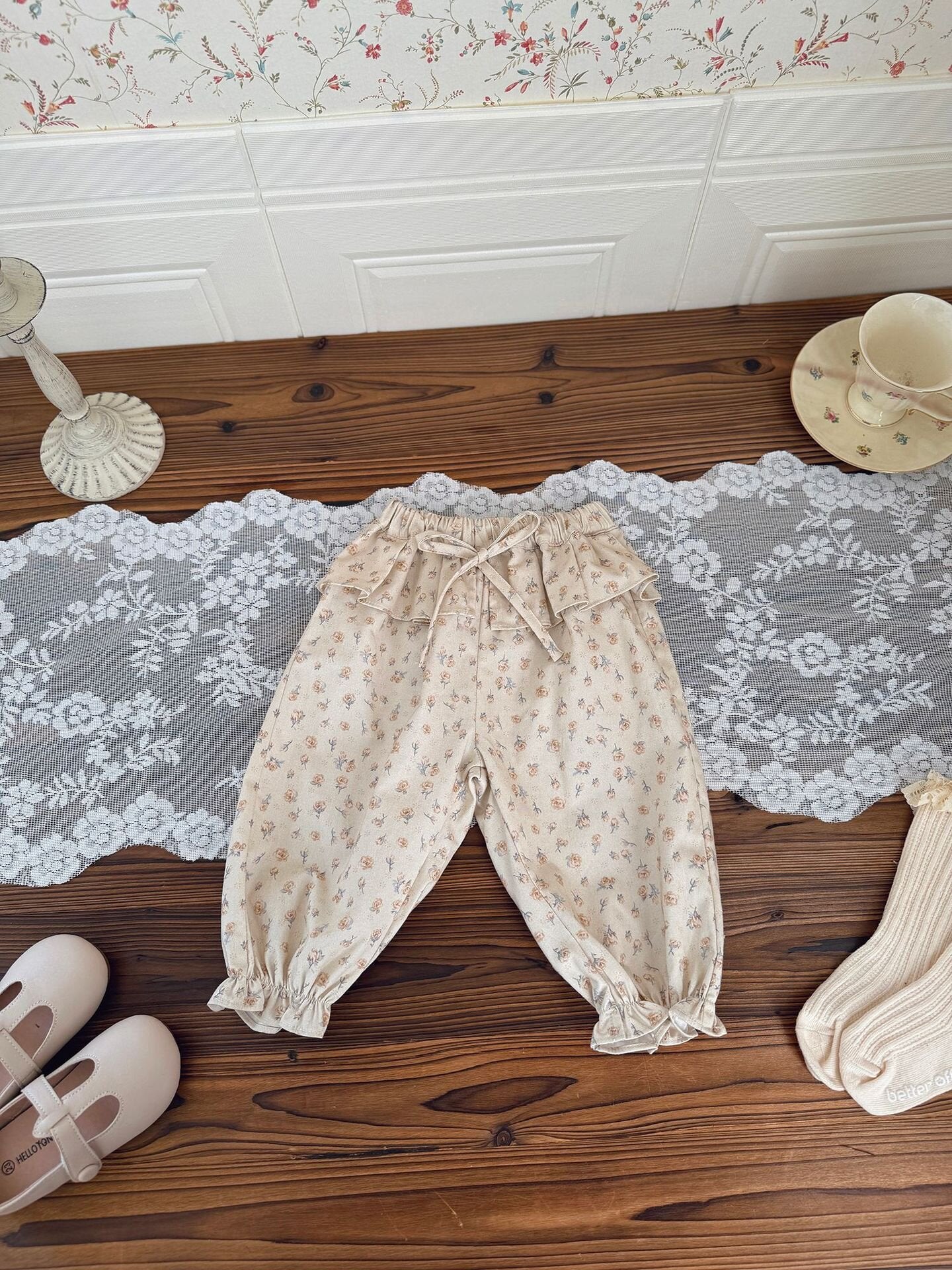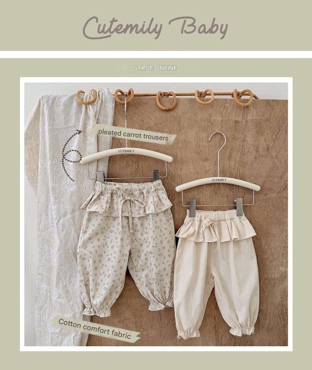 コットン100%の柔らかなツイル生地を使用し、快適な履き心地と上品な可愛さを両立させたテーパードパンツです。最大の魅力は、ウエスト周りを華やかに彩る贅沢な共生地フリル。リボンを添えたハイウエストのデザインが、小さなお子様のシルエットをより愛らしく引き立てます。