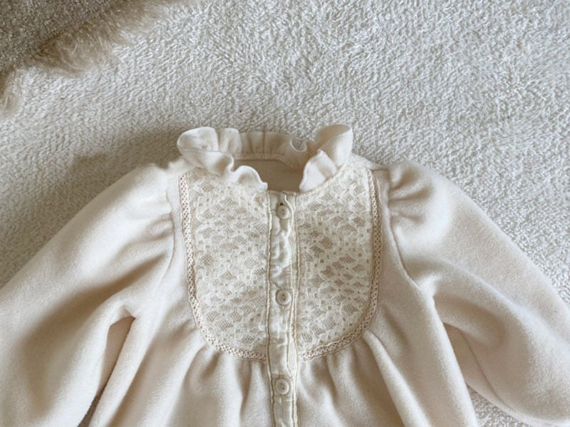 ベビーロンパース キッズワンピース 刺繍レース 長袖ドレス リンクコーデ 姉妹お揃い お出かけ ベージュ【mh0006169】