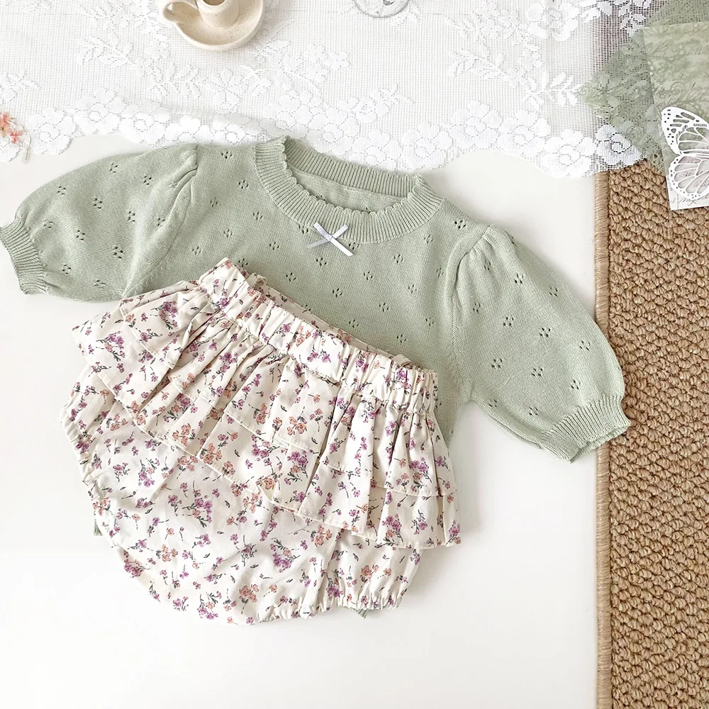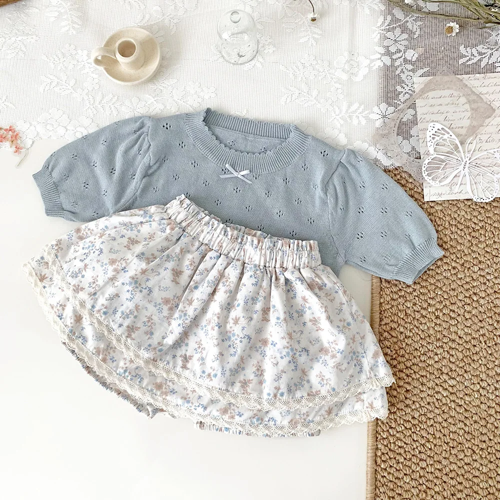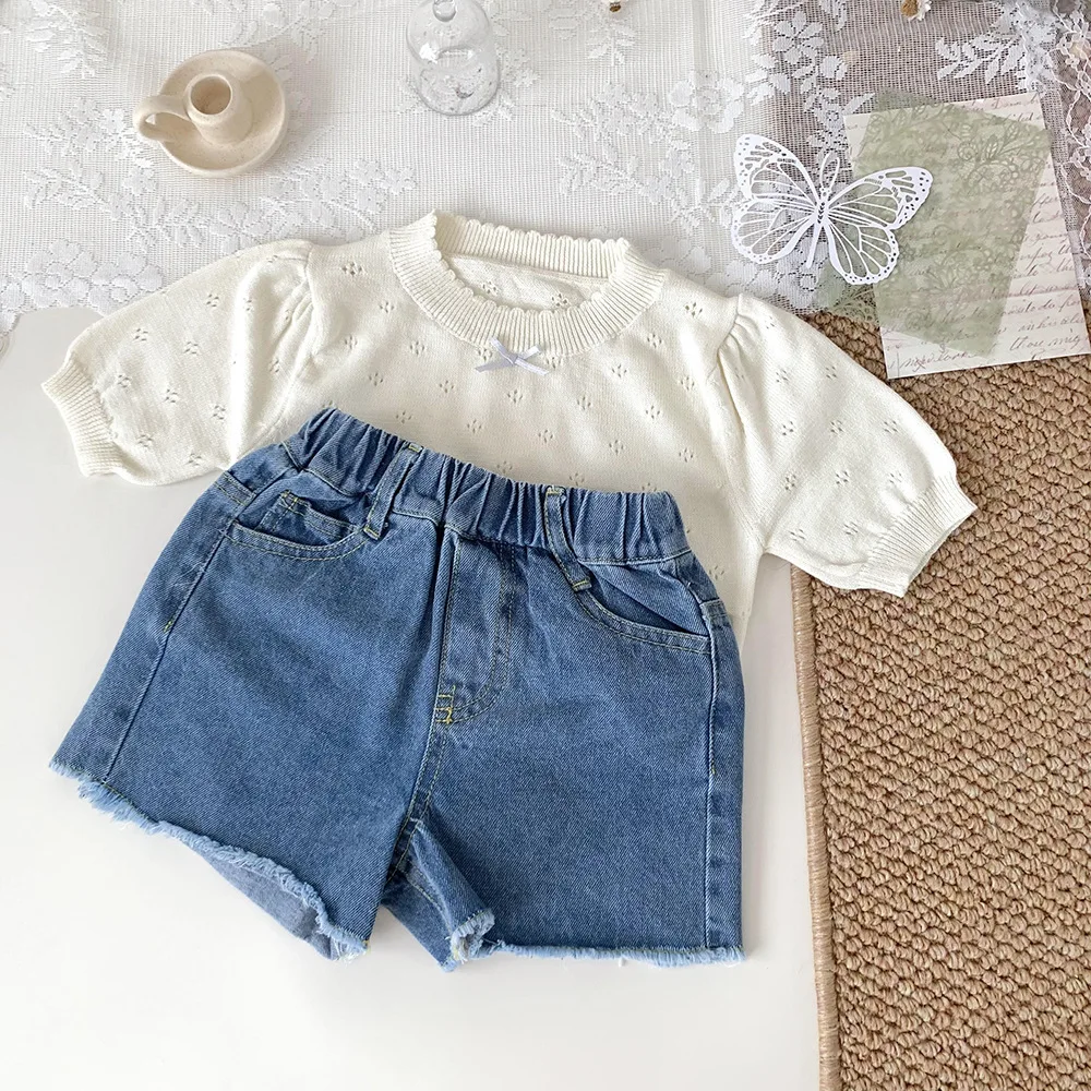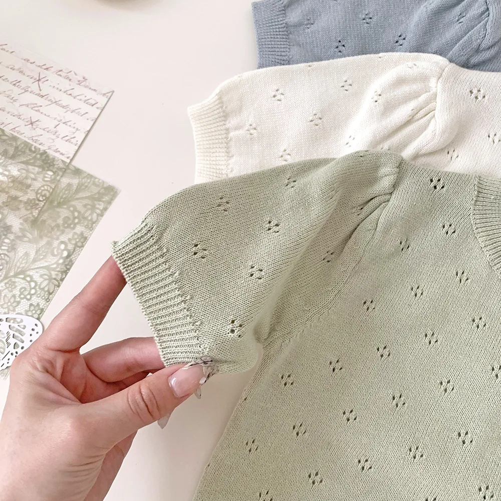 夏の季節にぴったりのベビーキッズトップスが登場しました。レースニット素材で作られた半袖パフスリーブのサマーセーターは、涼しげで軽やかな着心地を提供します。繊細なリボンデザインとホローアウトのディテールが、お子様のファッションに可愛らしさを加えます。ライトグリーン、アイボリー、グレーブルーの3カラーからお選びいただけます。夏の日差しの中で、涼やかな装いをお楽しみください。