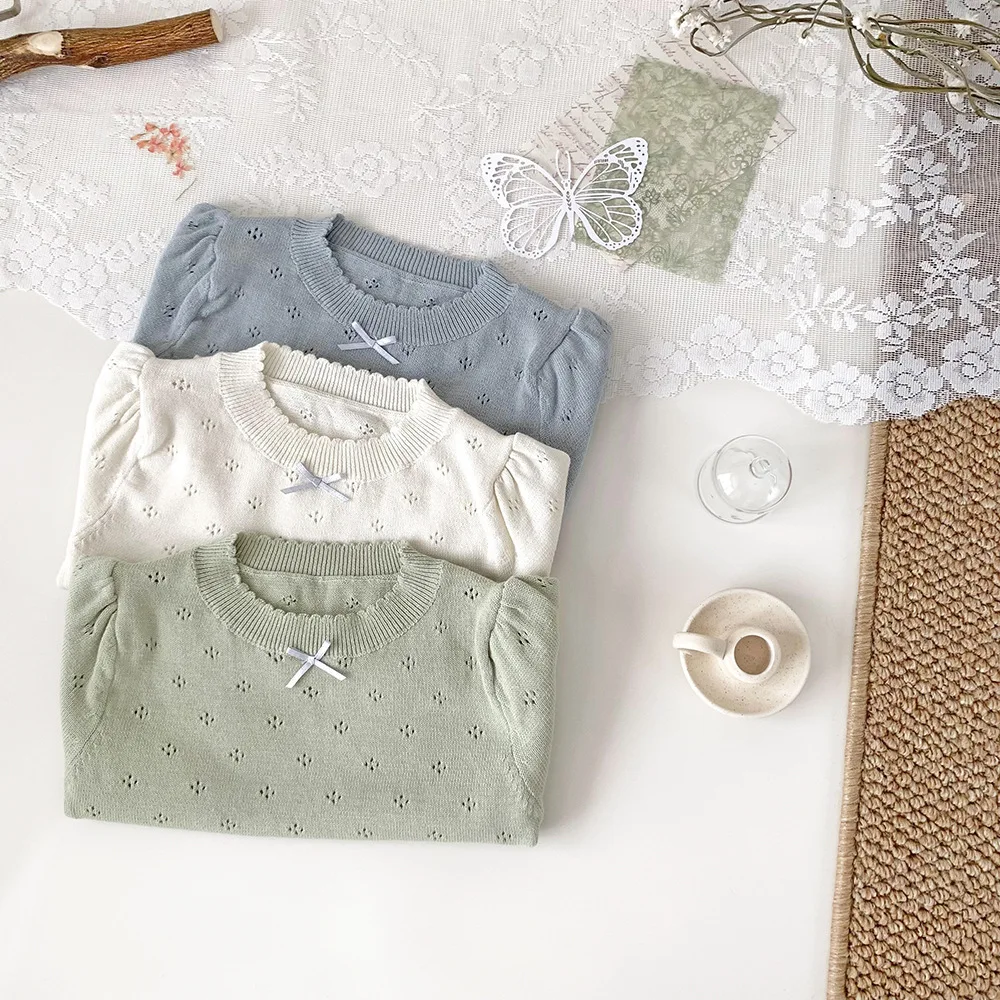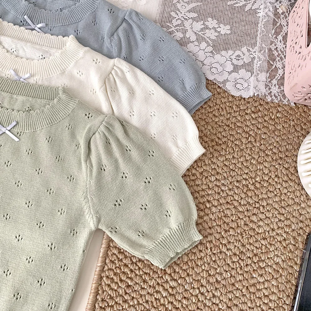 ベビーキッズトップス レースニット 半袖パフスリーブ サマーセーター リボン 3カラー