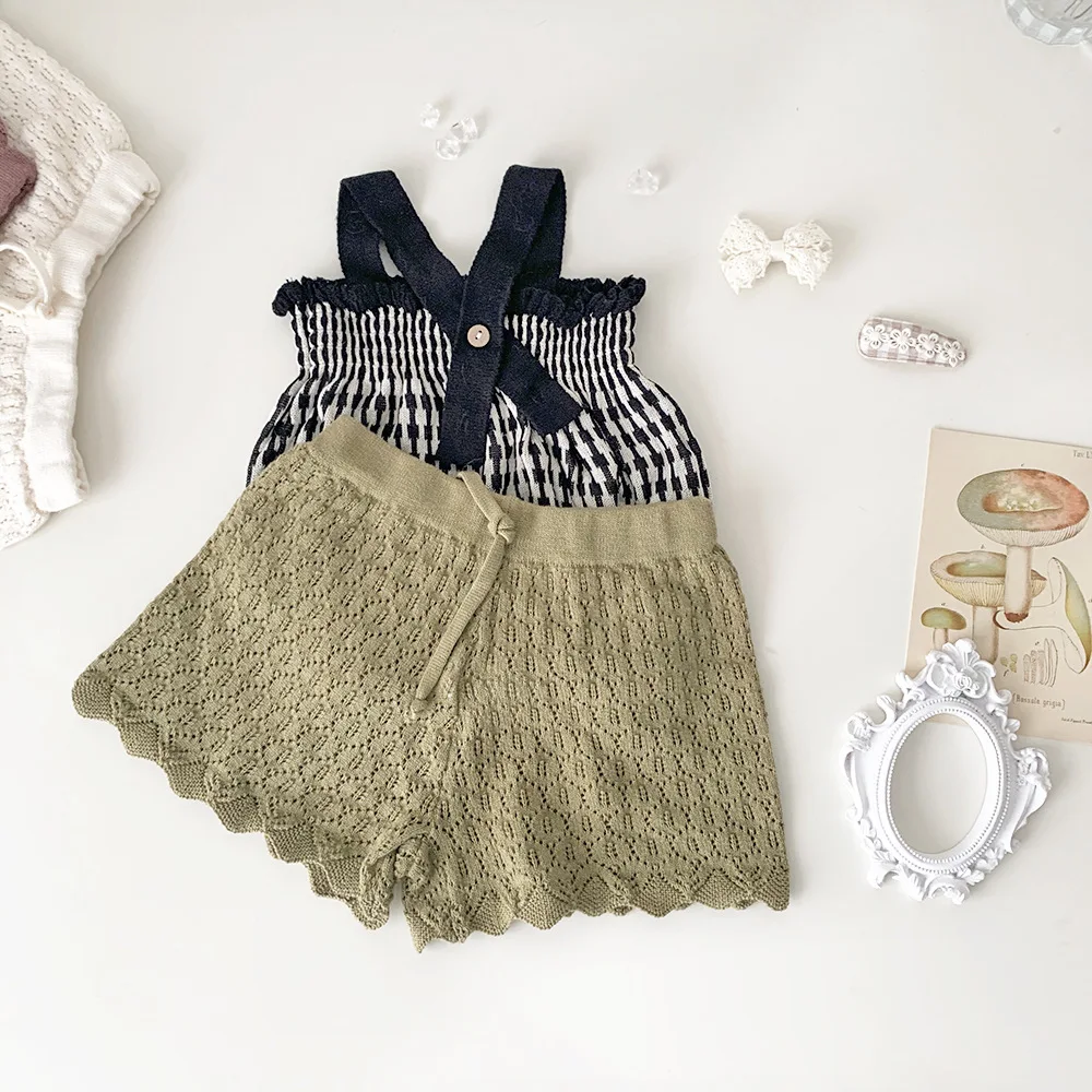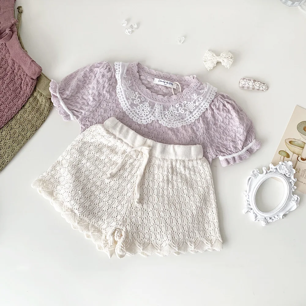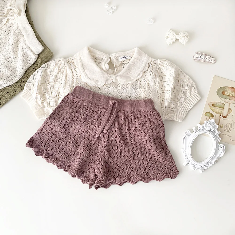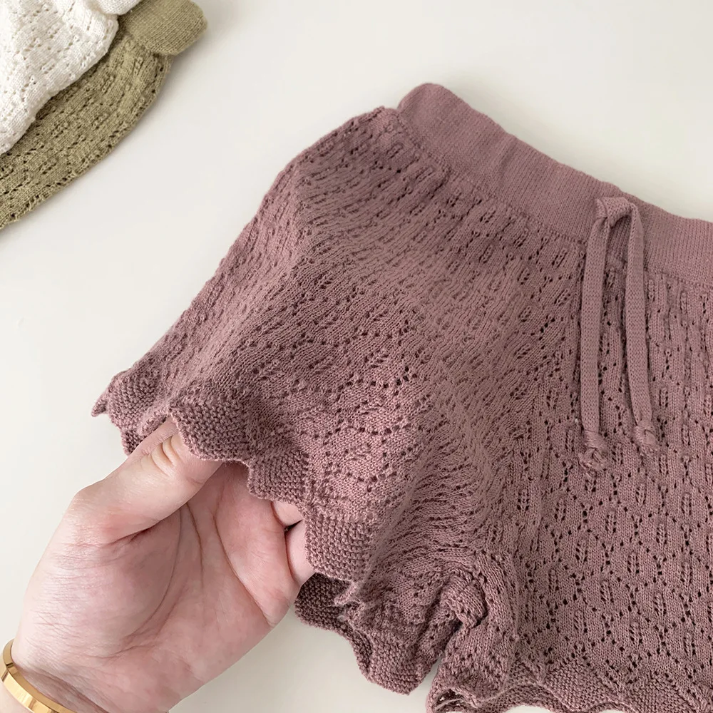この、新しい夏のスタイルのベビー・キッズ・レースニット・ショートパンツは、軽く柔らかな質感で、透け感が特徴です。アイボリーホワイト、カーキグリーン、パープルの3色の展開で、ガールズのためにお楽しみいただけます。