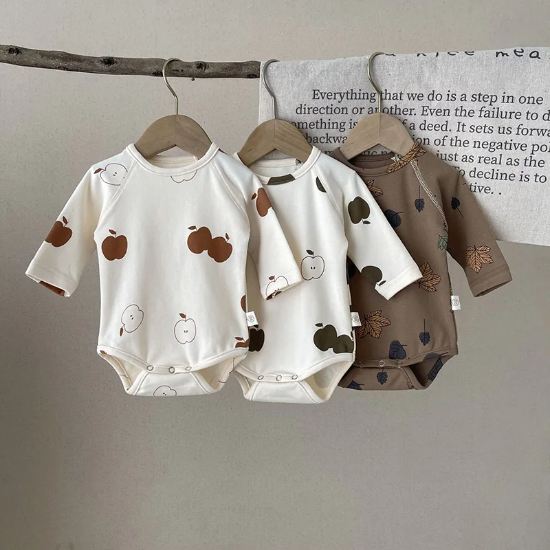 🍎 自然を感じる、りんごとリーフのプリントが素敵なベビーロンパース 🌿