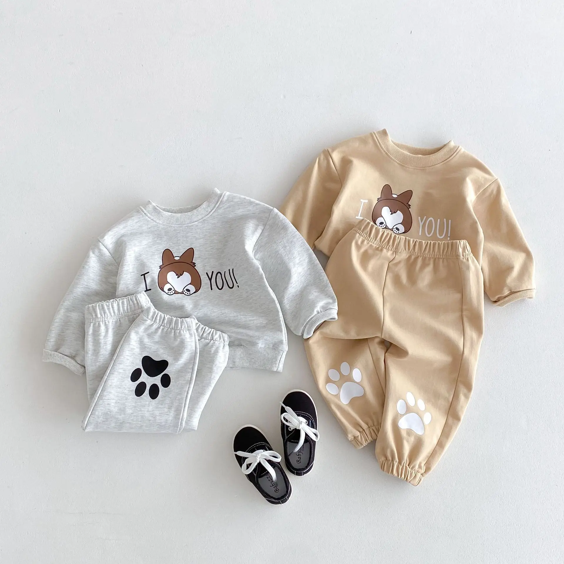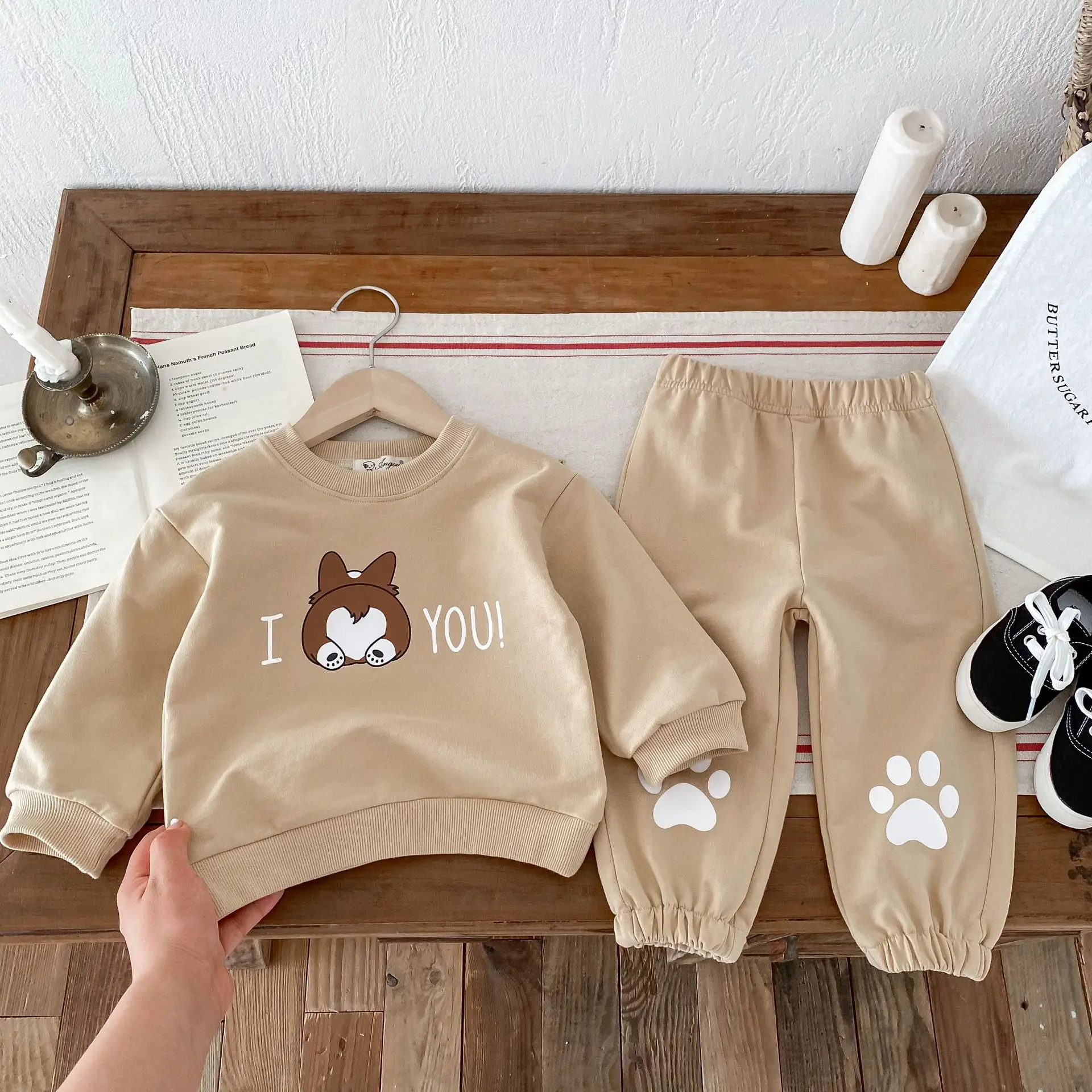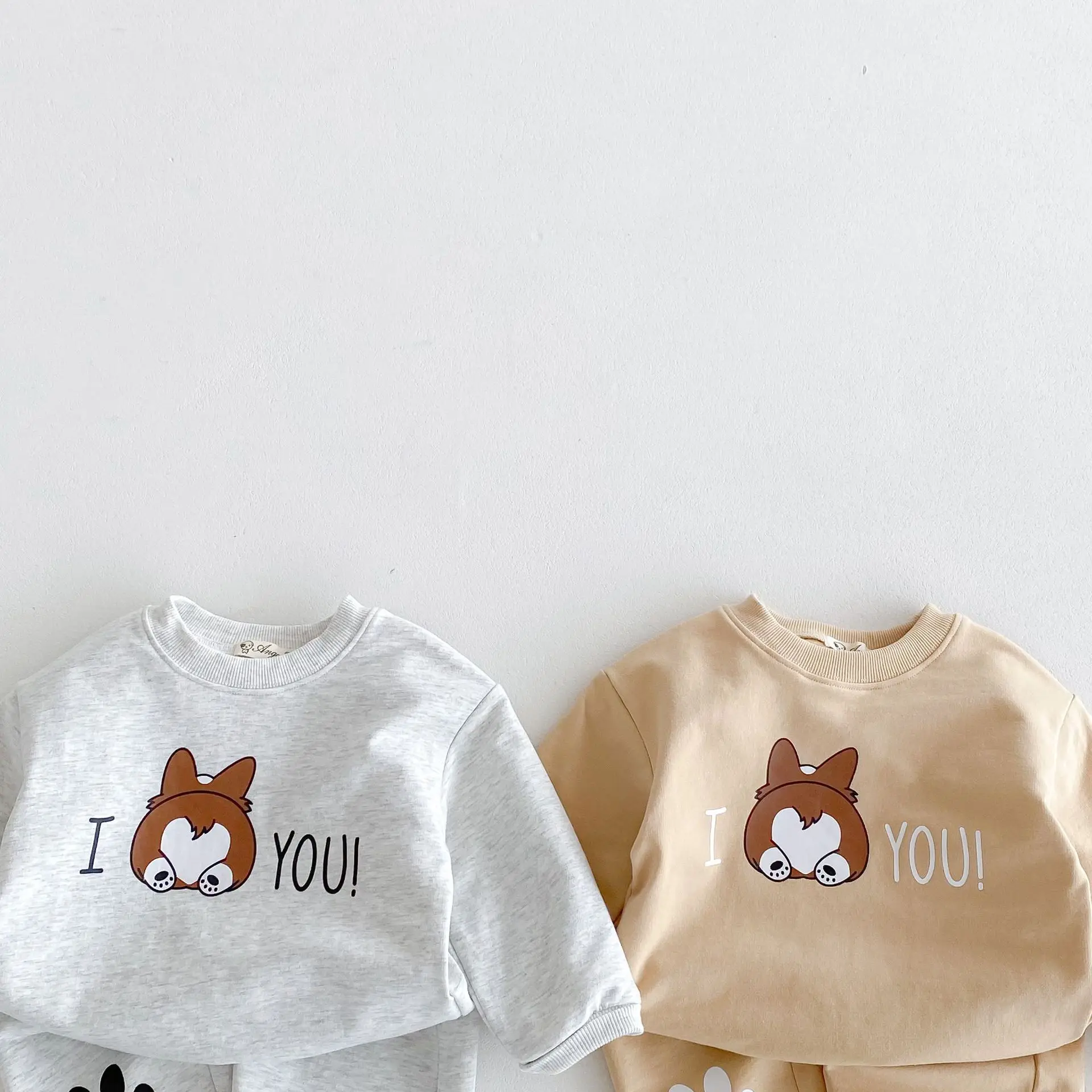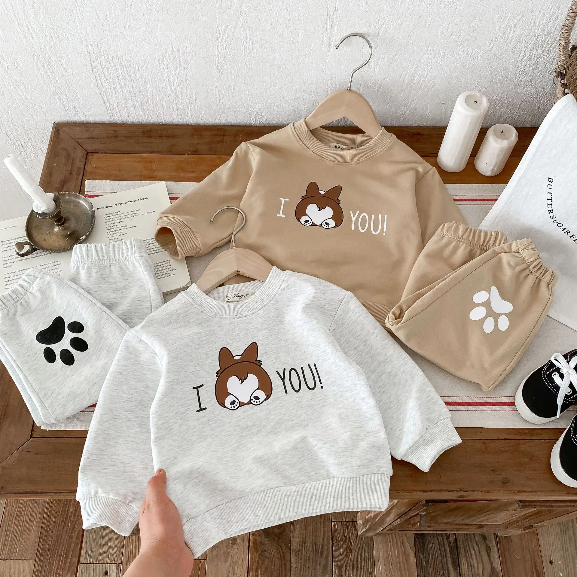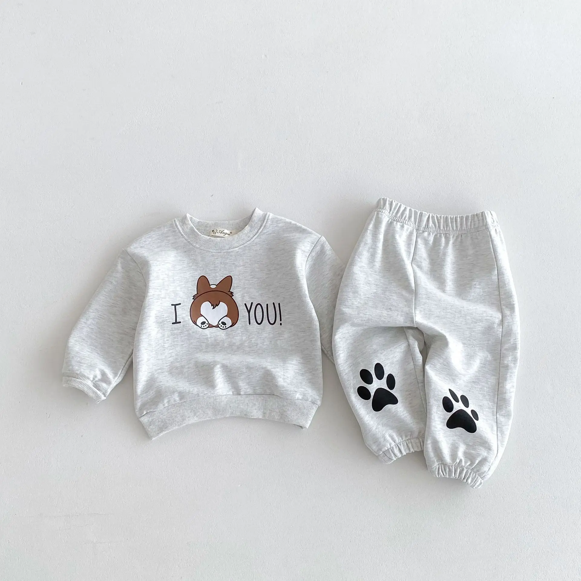 ベビーセットアップは、秋に最適な2点セットです。長袖スウェットシャツとロングパンツがセットになっており、かわいい犬のドッグレターロゴプリントが特徴的です。子供たちには遊びやすいカジュアルなデザインで、可愛さと快適さを両立します。お子様のカジュアルコーデにお勧めです。