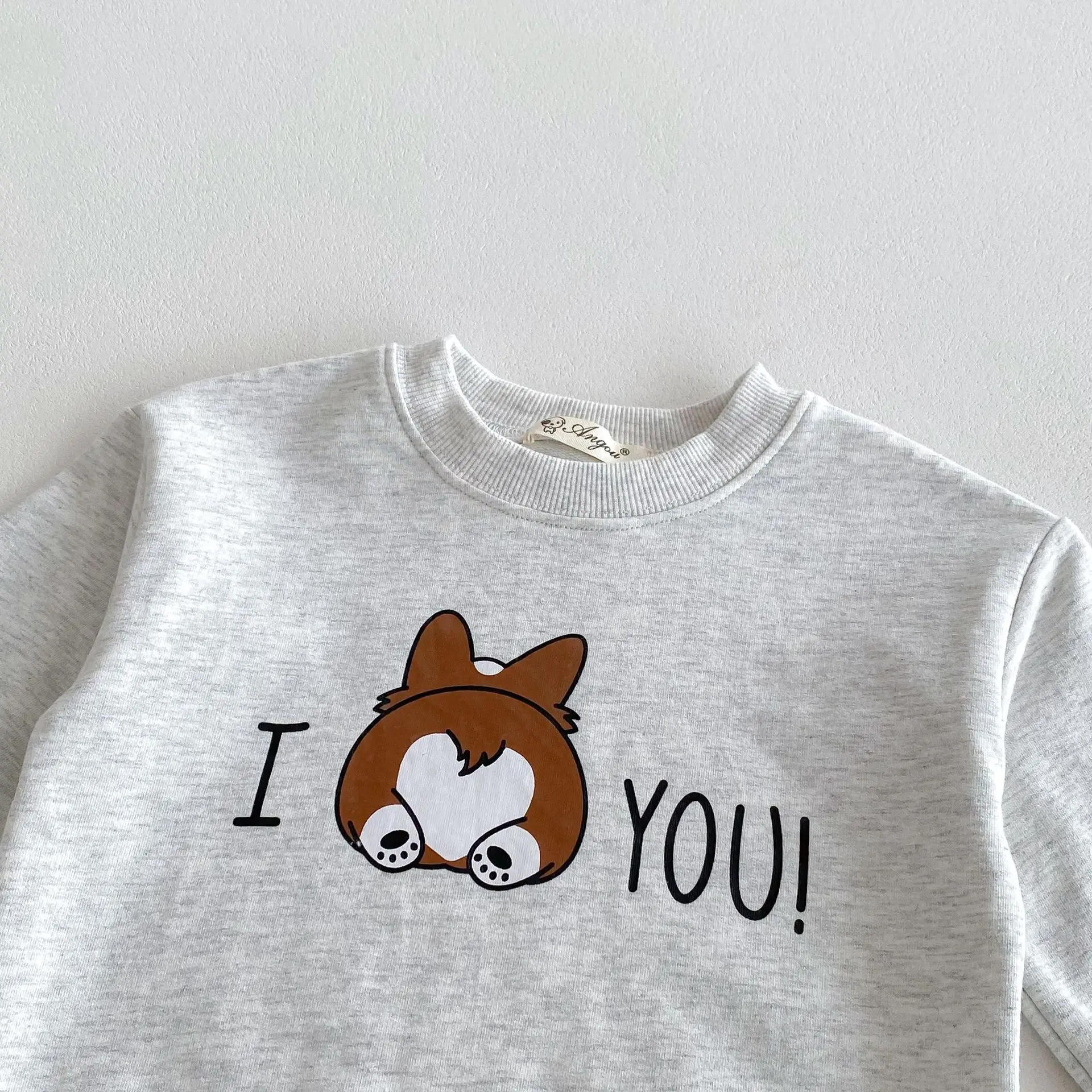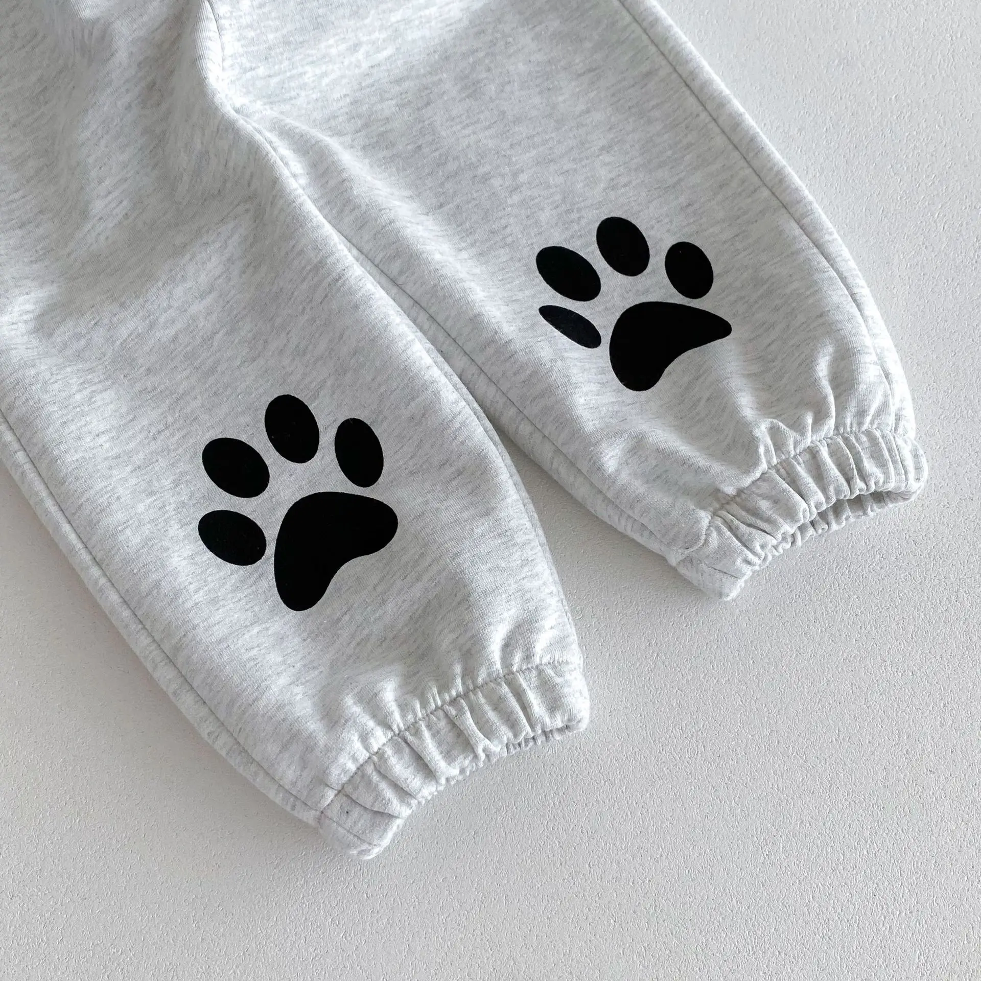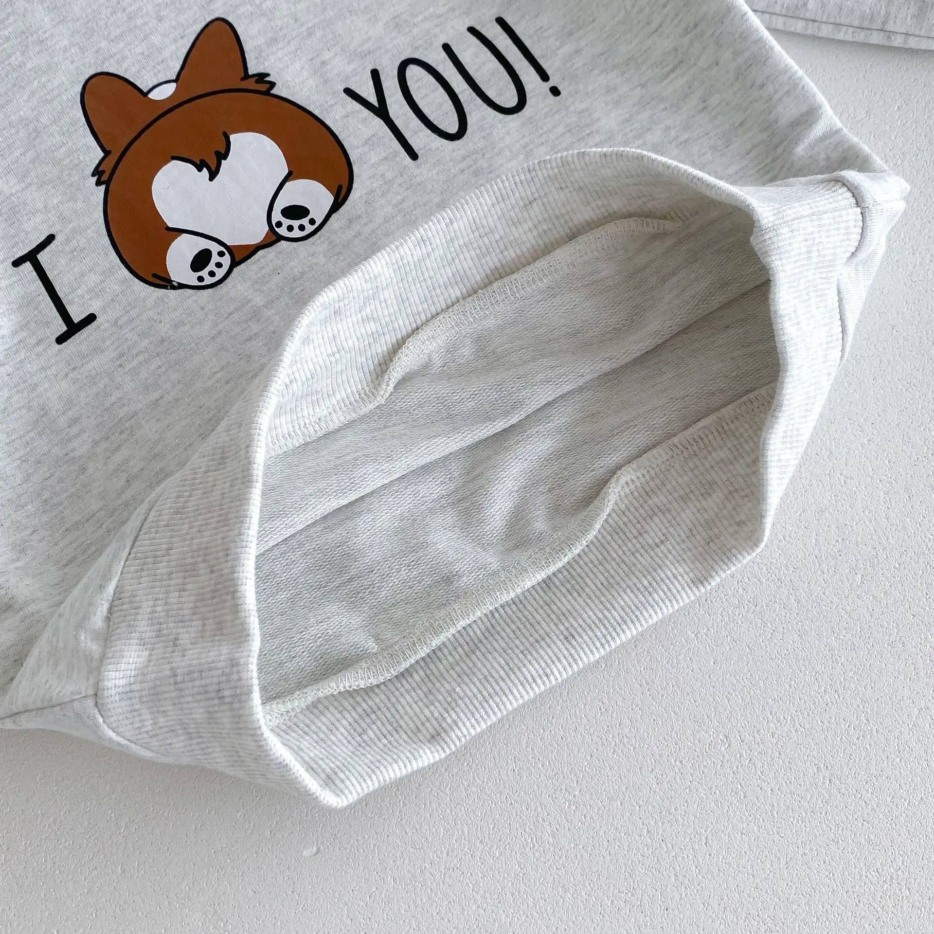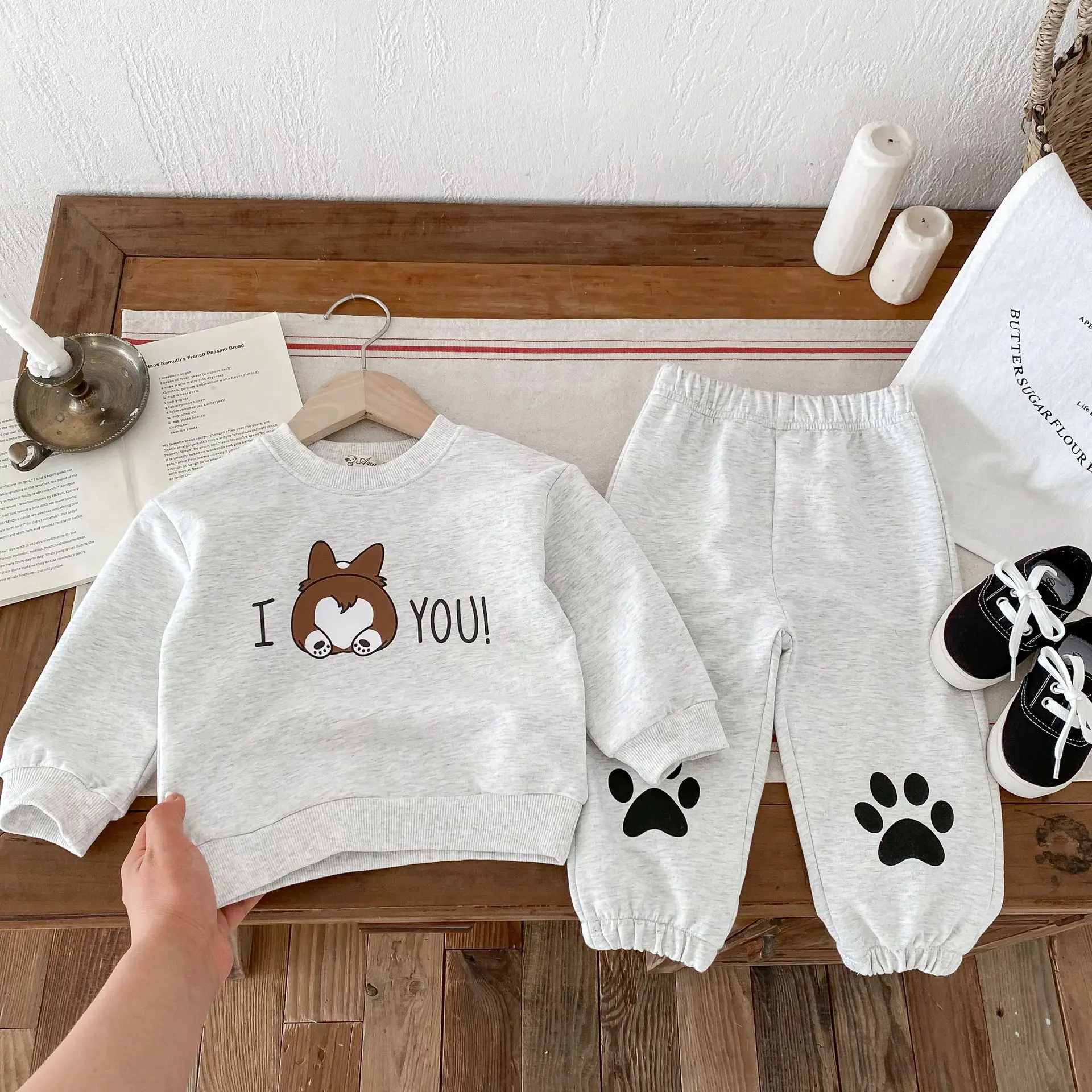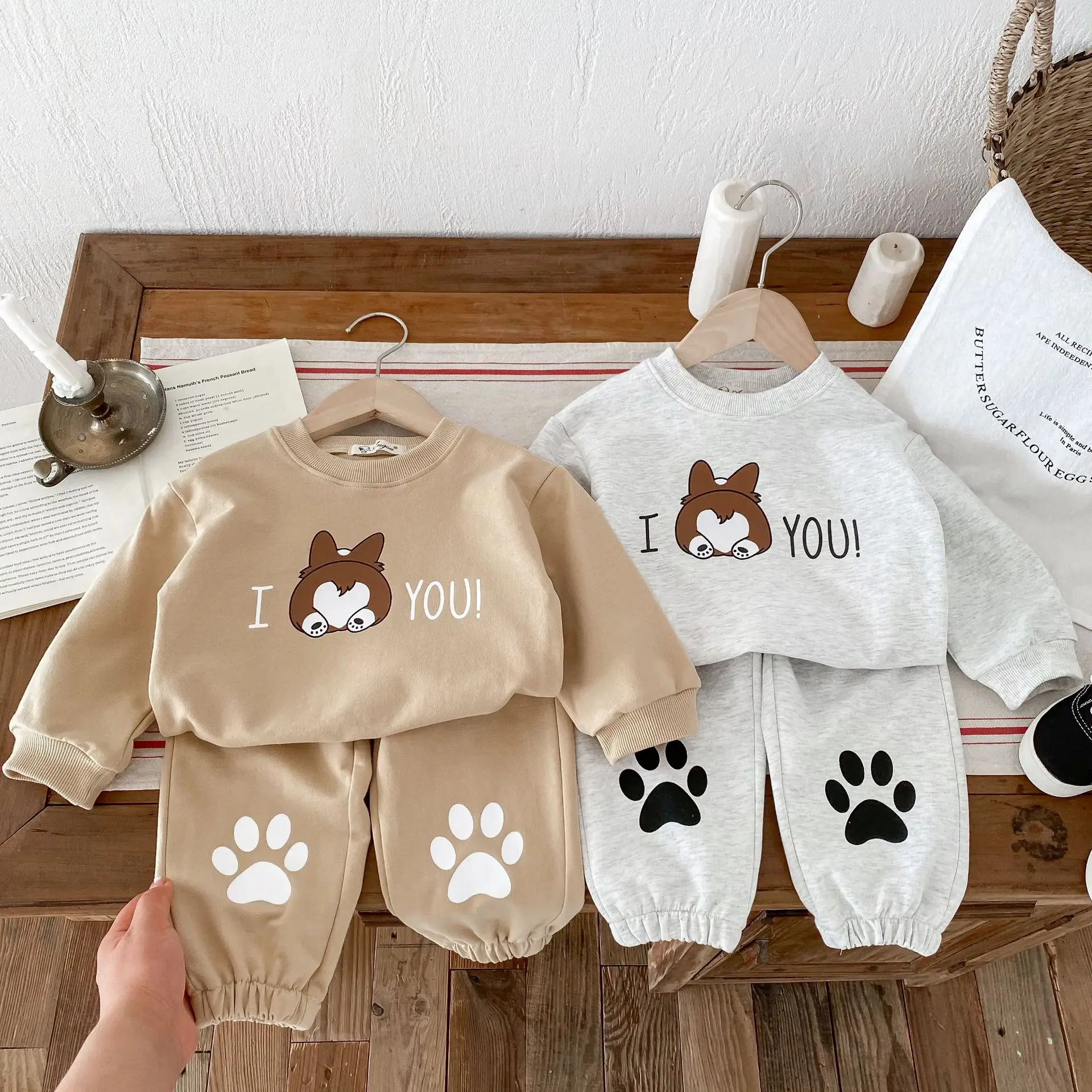ベビーセットアップは、秋に最適な2点セットです。長袖スウェットシャツとロングパンツがセットになっており、かわいい犬のドッグレターロゴプリントが特徴的です。子供たちには遊びやすいカジュアルなデザインで、可愛さと快適さを両立します。お子様のカジュアルコーデにお勧めです。