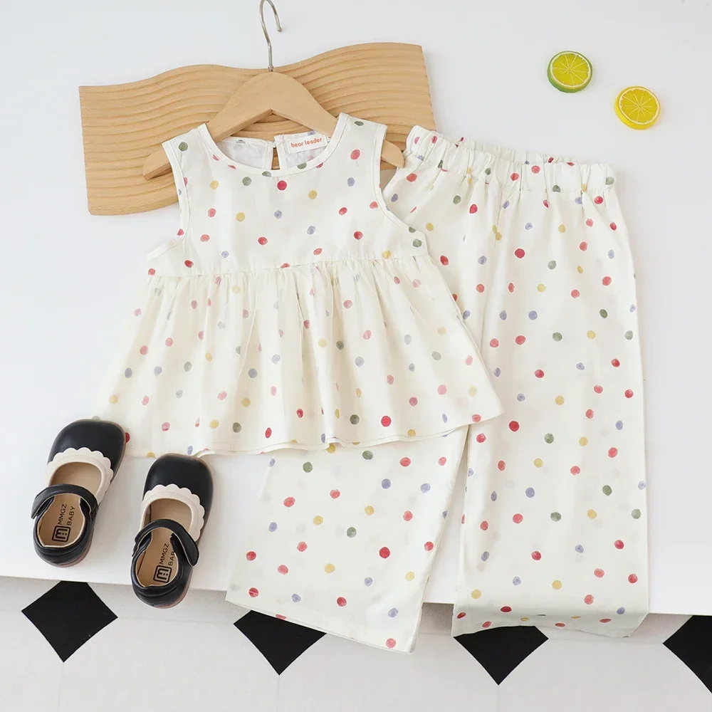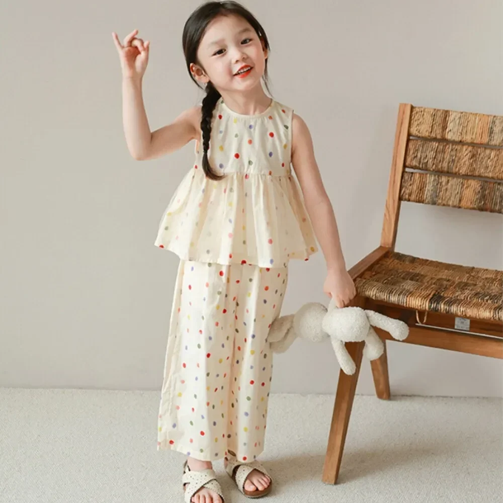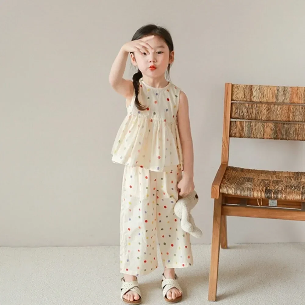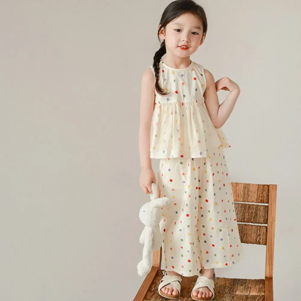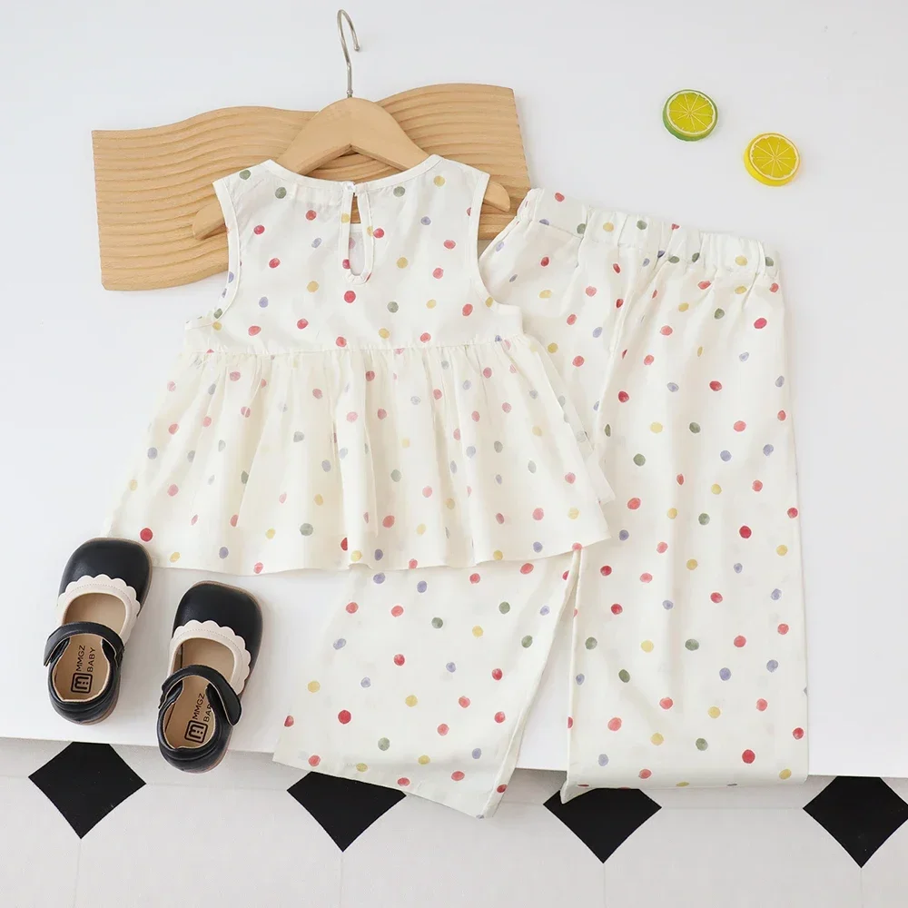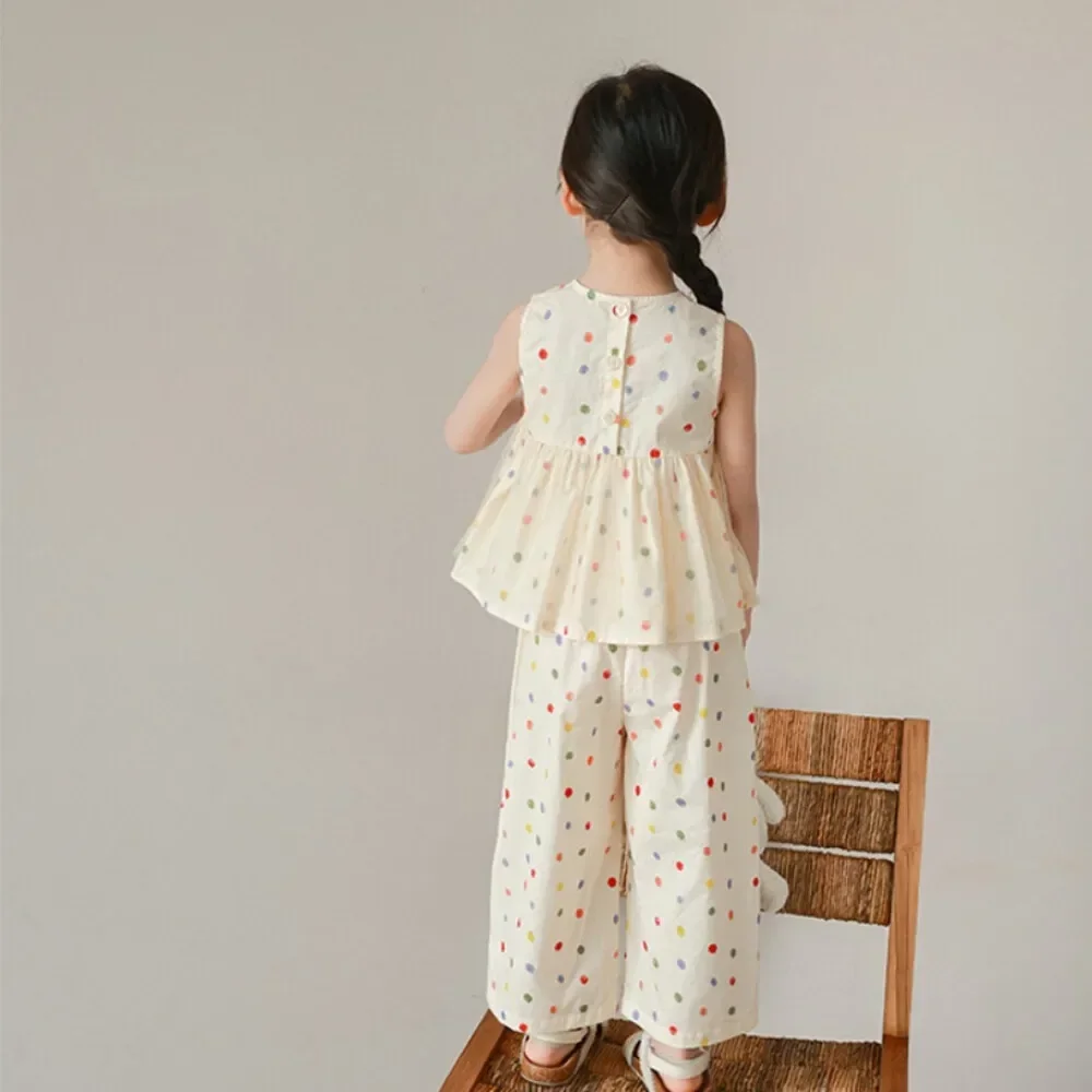 キッズセットアップ 2点セット カラフルドットプリント ノースリーブペプラムブラウス+ロングルーズパンツ【mh0006091】