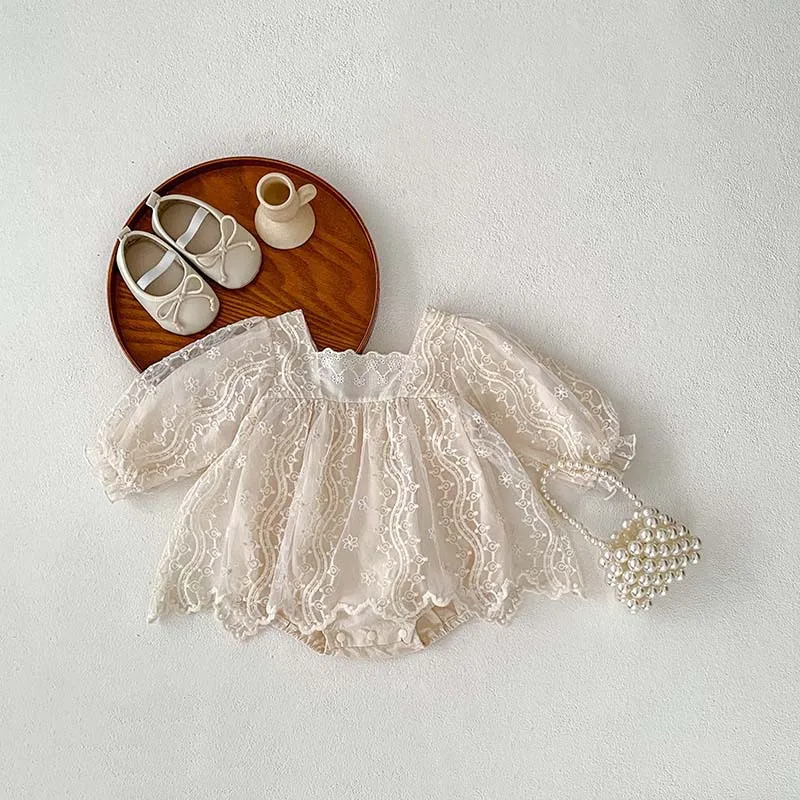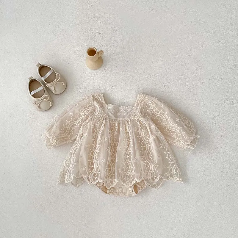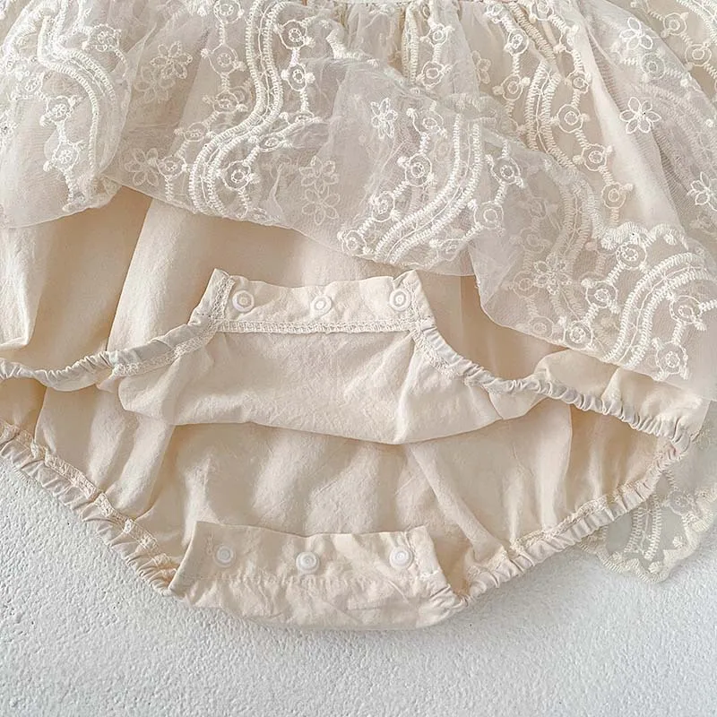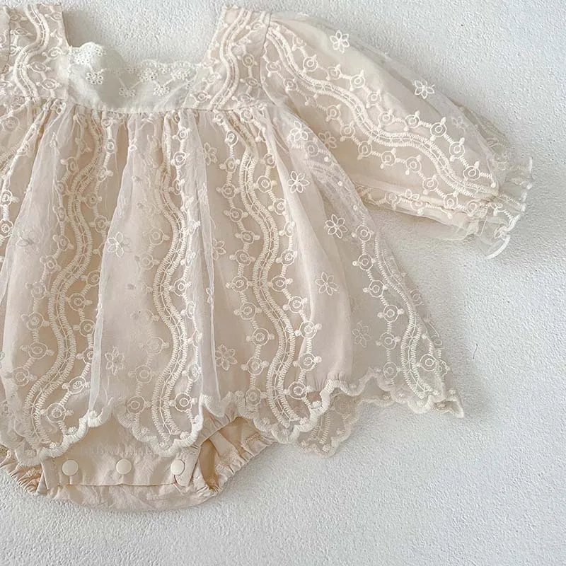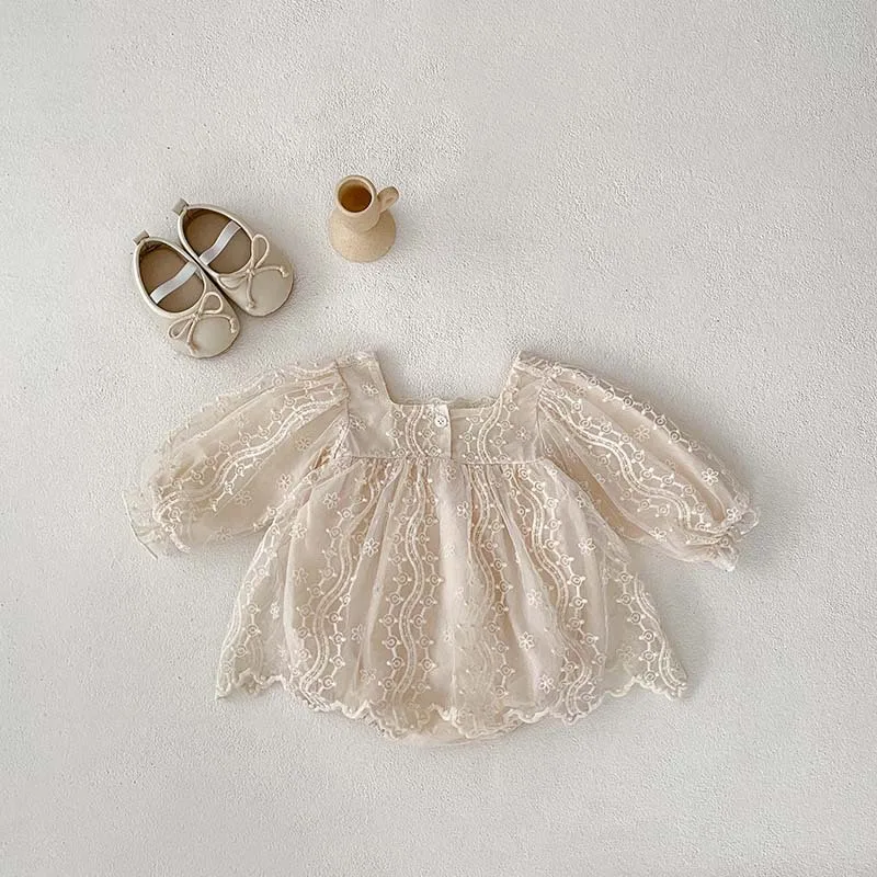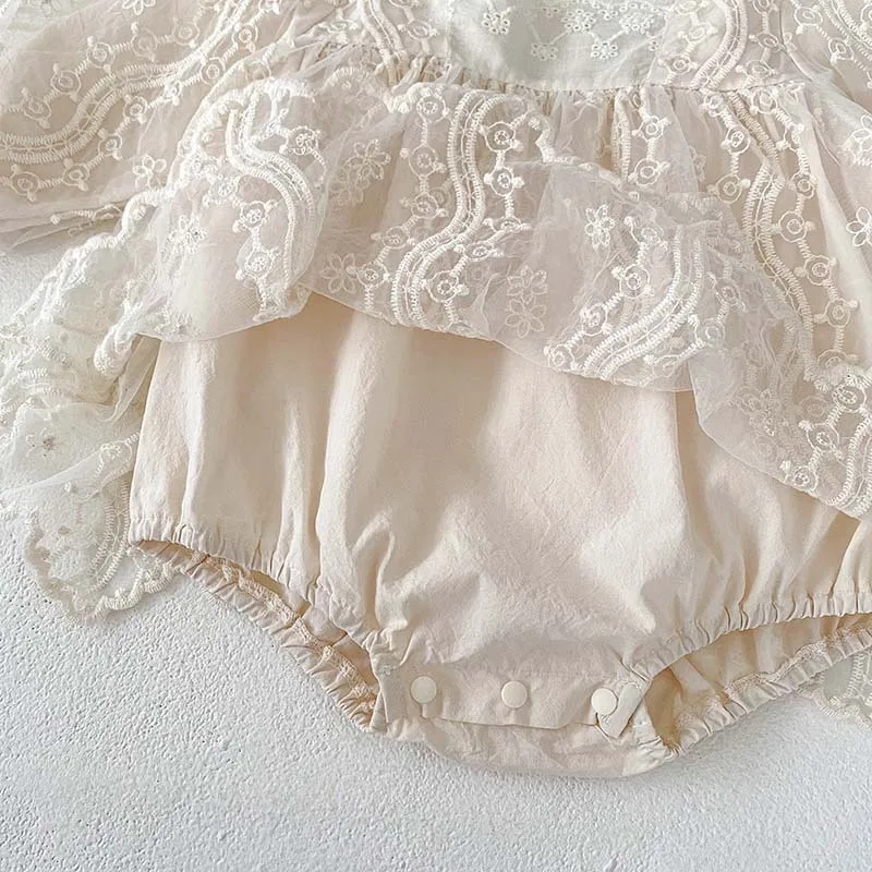 ベビーロンパース レース 長袖スカートボディスーツ ベビードレス お出かけ ベージュ【mh0006204】